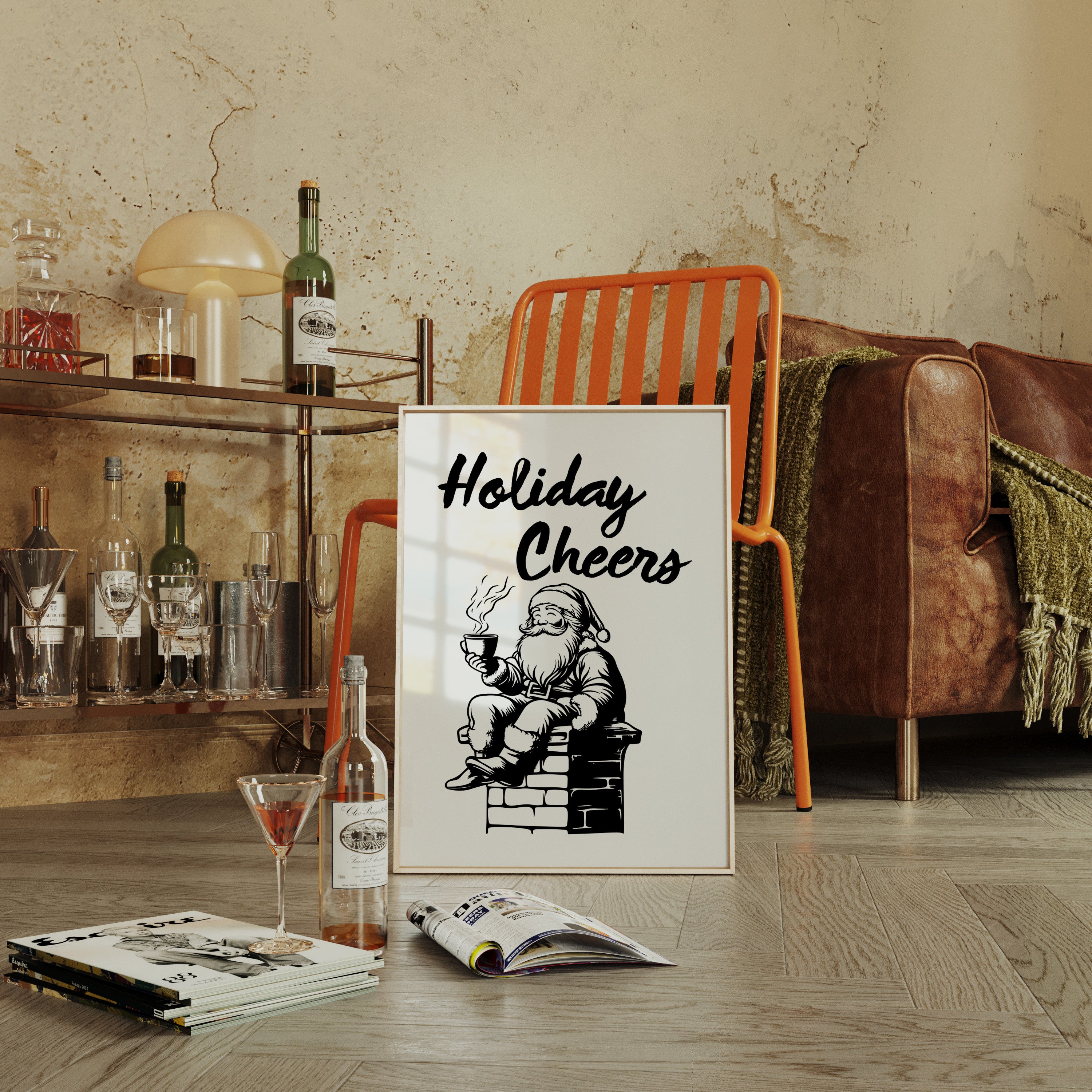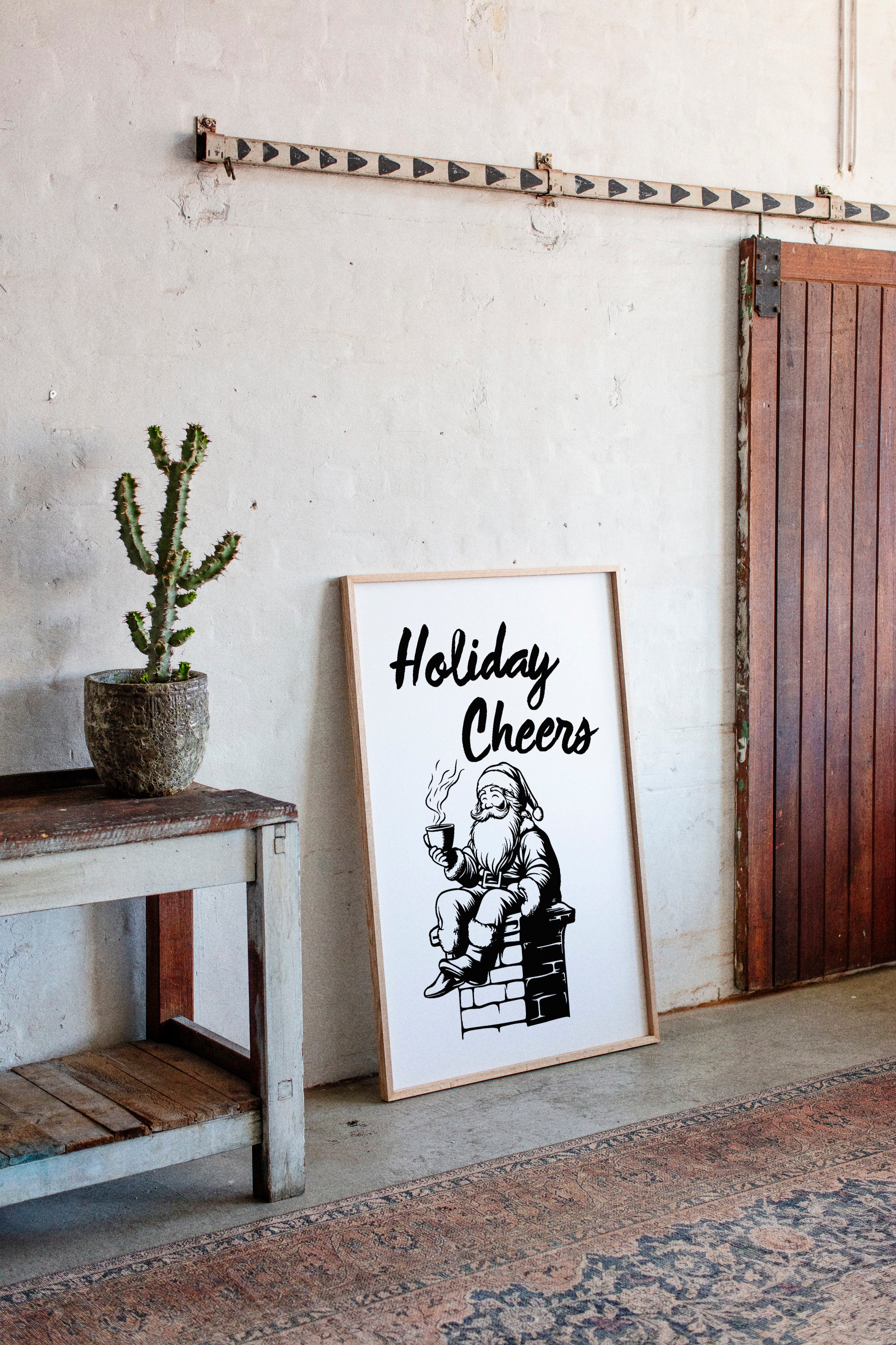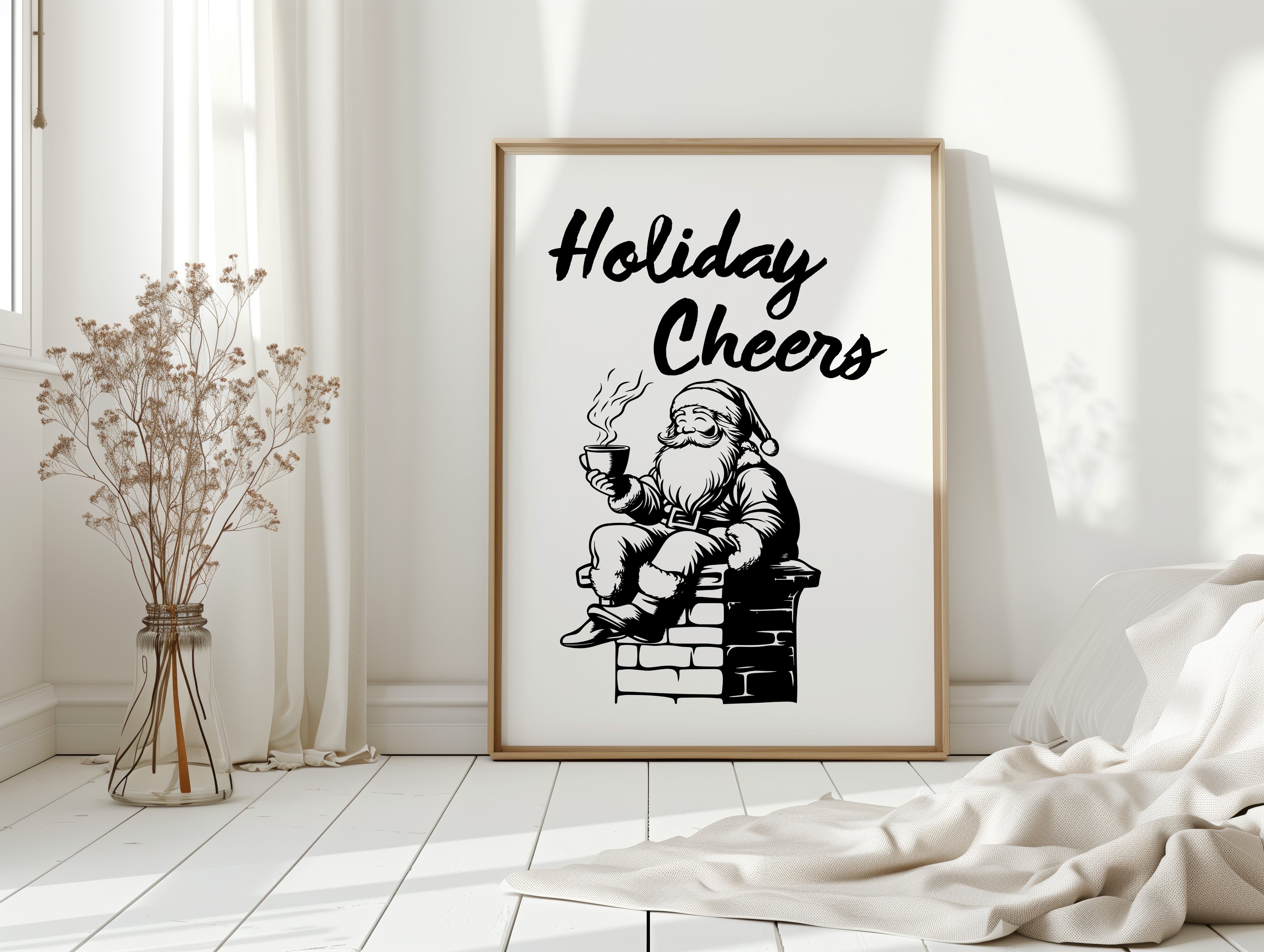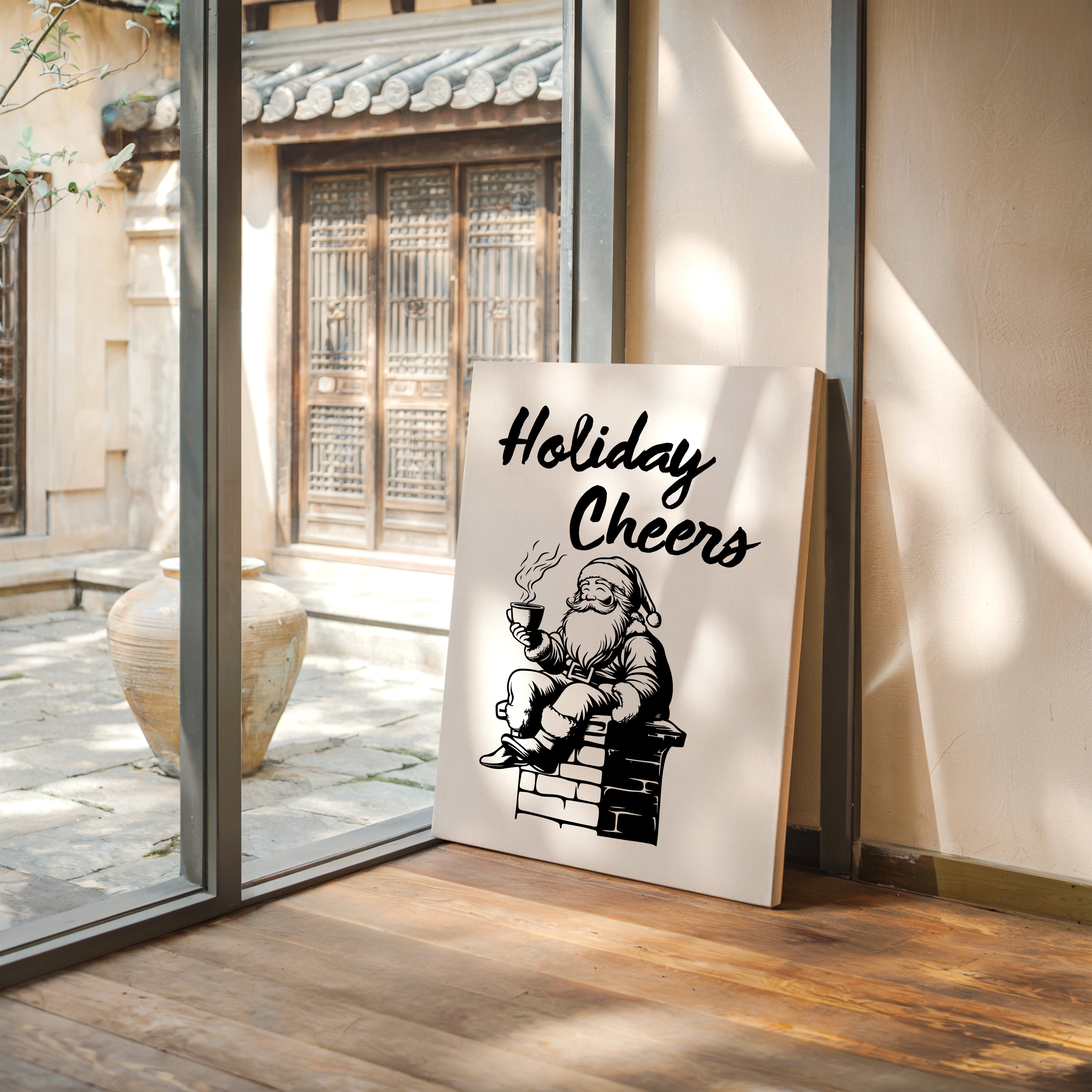 Steam rises from a warm cup, curling into the crisp December air as Santa takes a moment of peaceful solitude. This contemporary black and white illustration captures a whimsical moment of rest during the busiest night of the year. Perched atop a chimney, the jolly figure radiates contentment, his expression a perfect blend of mischief and serenity beneath his flowing beard. The bold typography and clean lines create a modern twist on a classic holiday scene, while the contrast between light and shadow adds depth to every detail. Perfect for adding a touch of sophisticated holiday charm to a kitchen, coffee nook, or casual dining space. The piece invites viewers to slow down and savor their own moments of quiet celebration during the festive season.