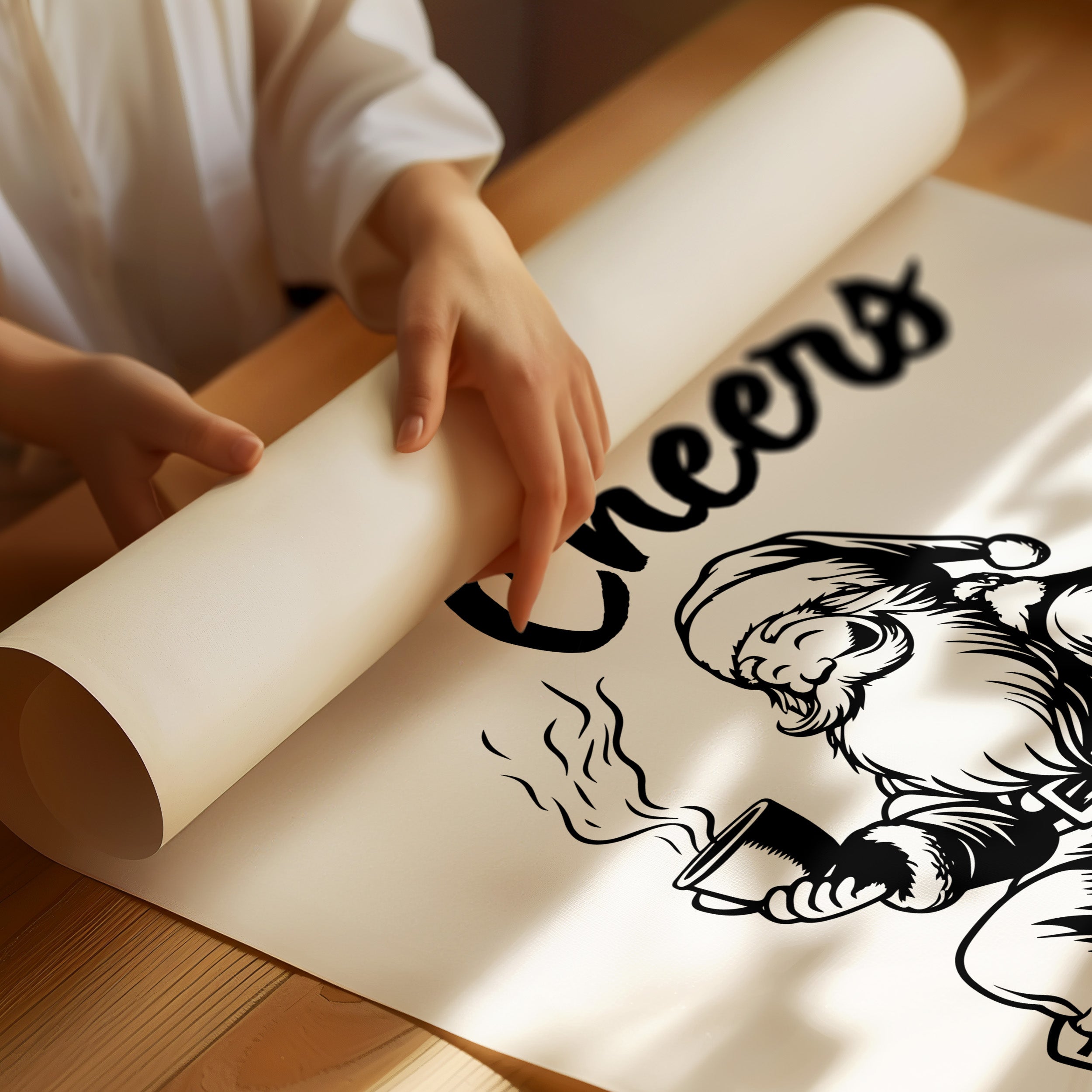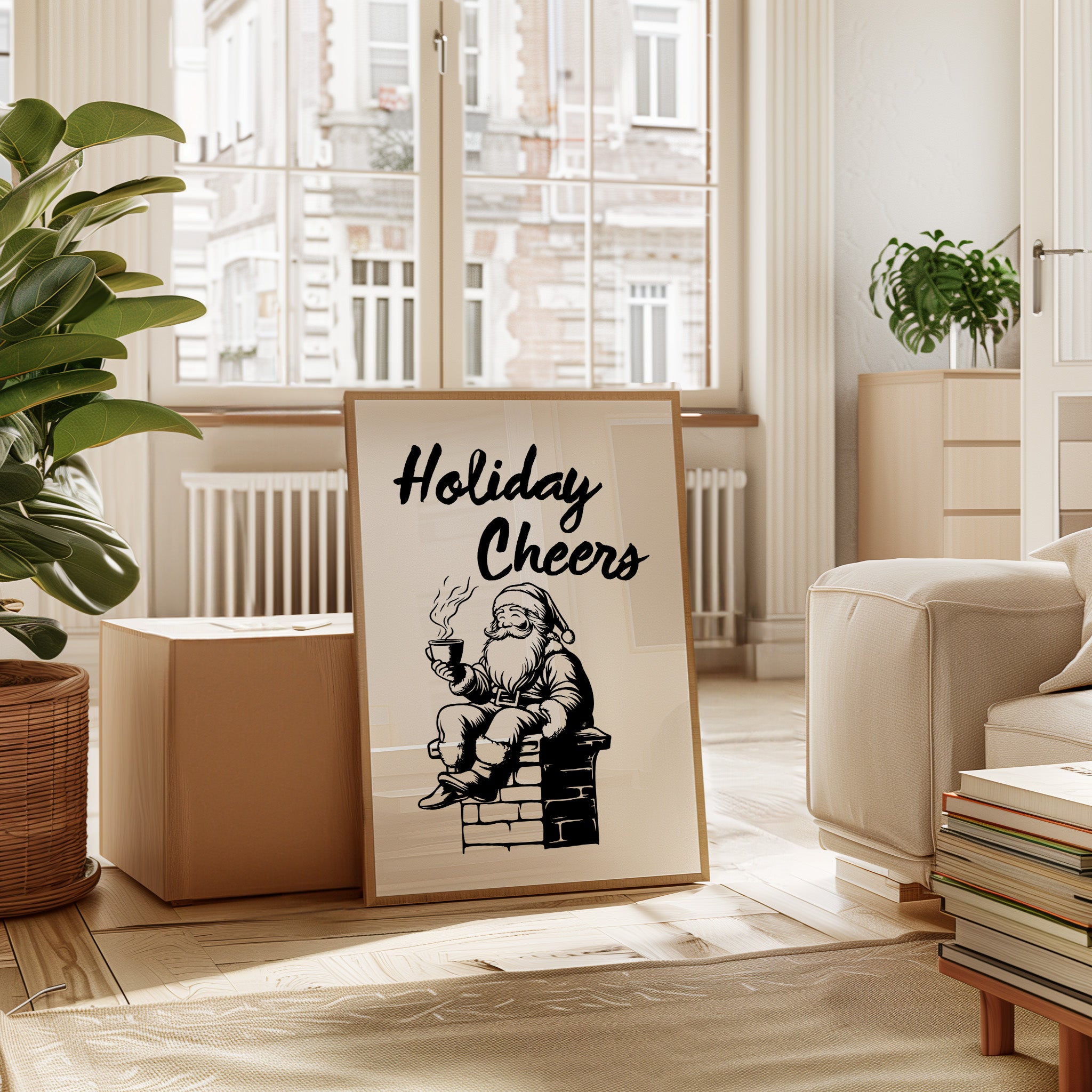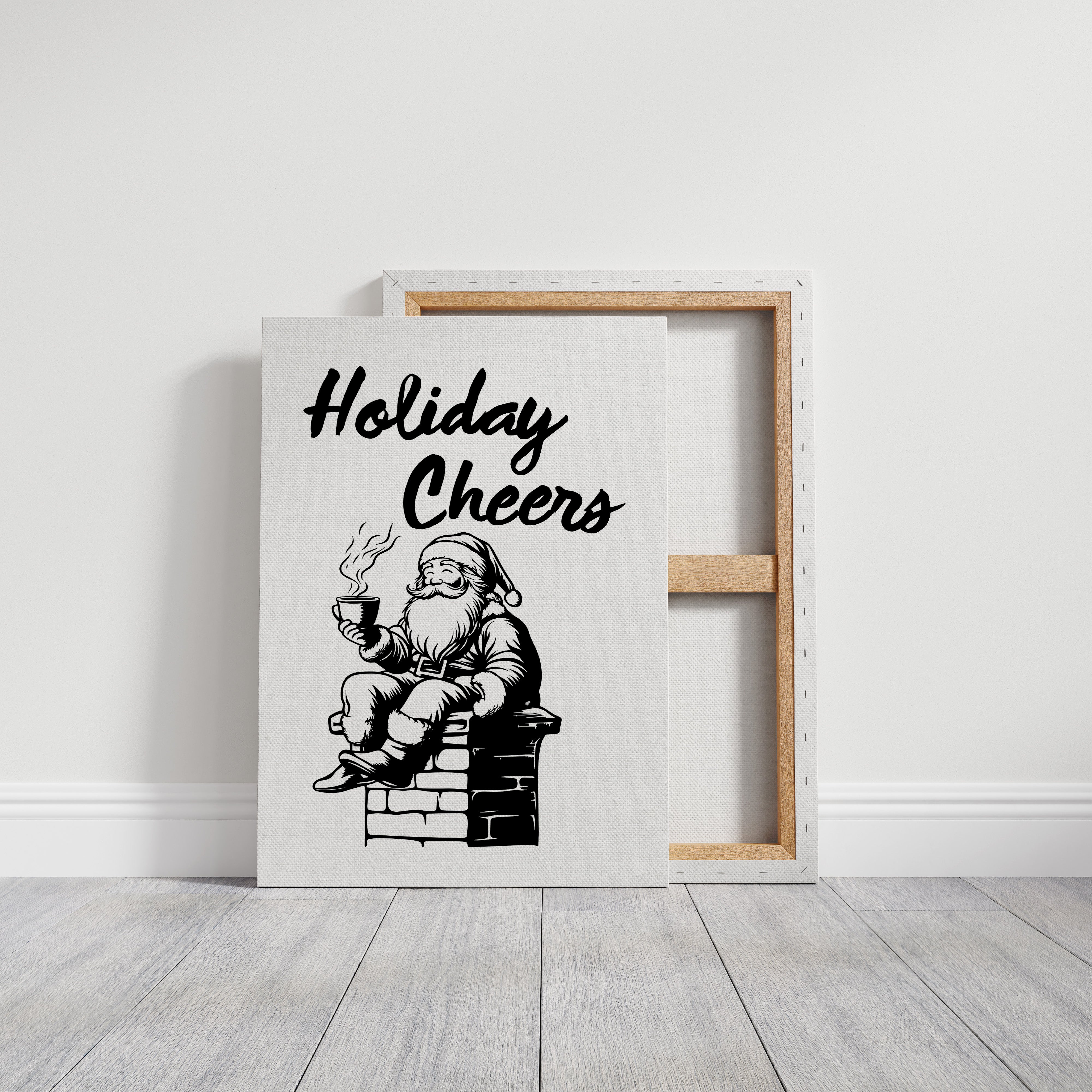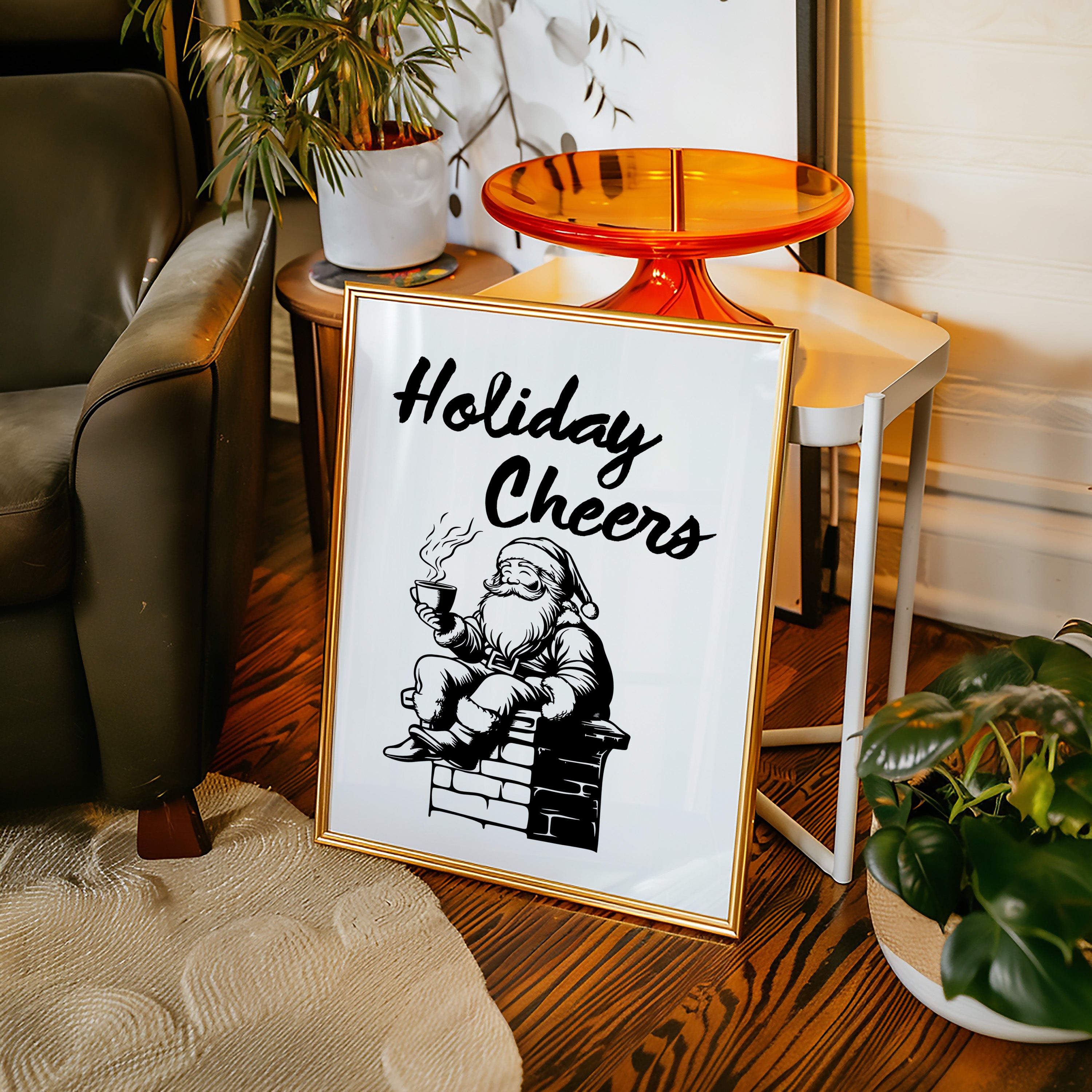 Steam rises from a warm cup, curling into the crisp December air as Santa takes a moment of peaceful solitude. This contemporary black and white illustration captures a whimsical moment of rest during the busiest night of the year. Perched atop a chimney, the jolly figure radiates contentment, his expression a perfect blend of mischief and serenity beneath his flowing beard. The bold typography and clean lines create a modern twist on a classic holiday scene, while the contrast between light and shadow adds depth to every detail. Perfect for adding a touch of sophisticated holiday charm to a kitchen, coffee nook, or casual dining space. The piece invites viewers to slow down and savor their own moments of quiet celebration during the festive season.