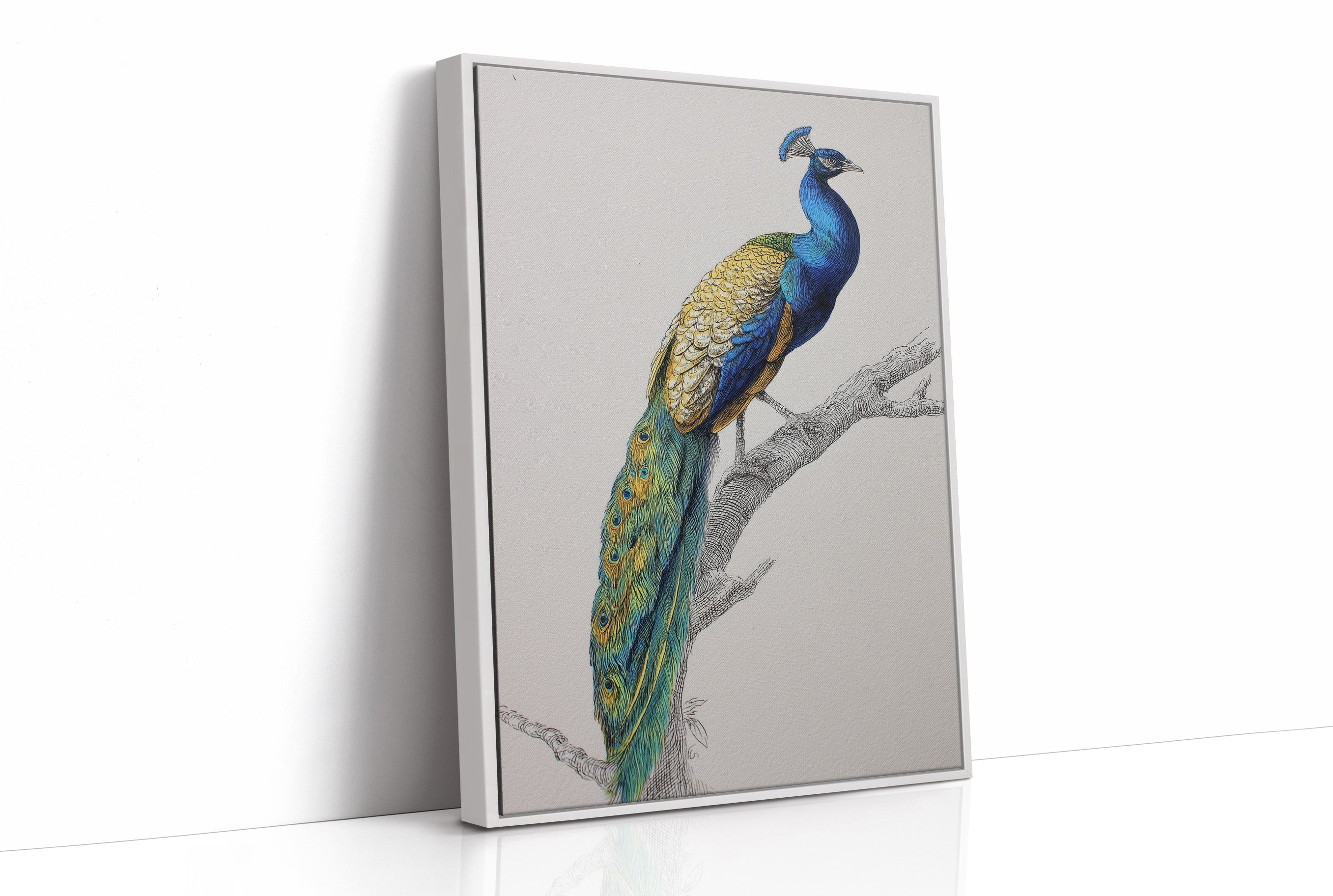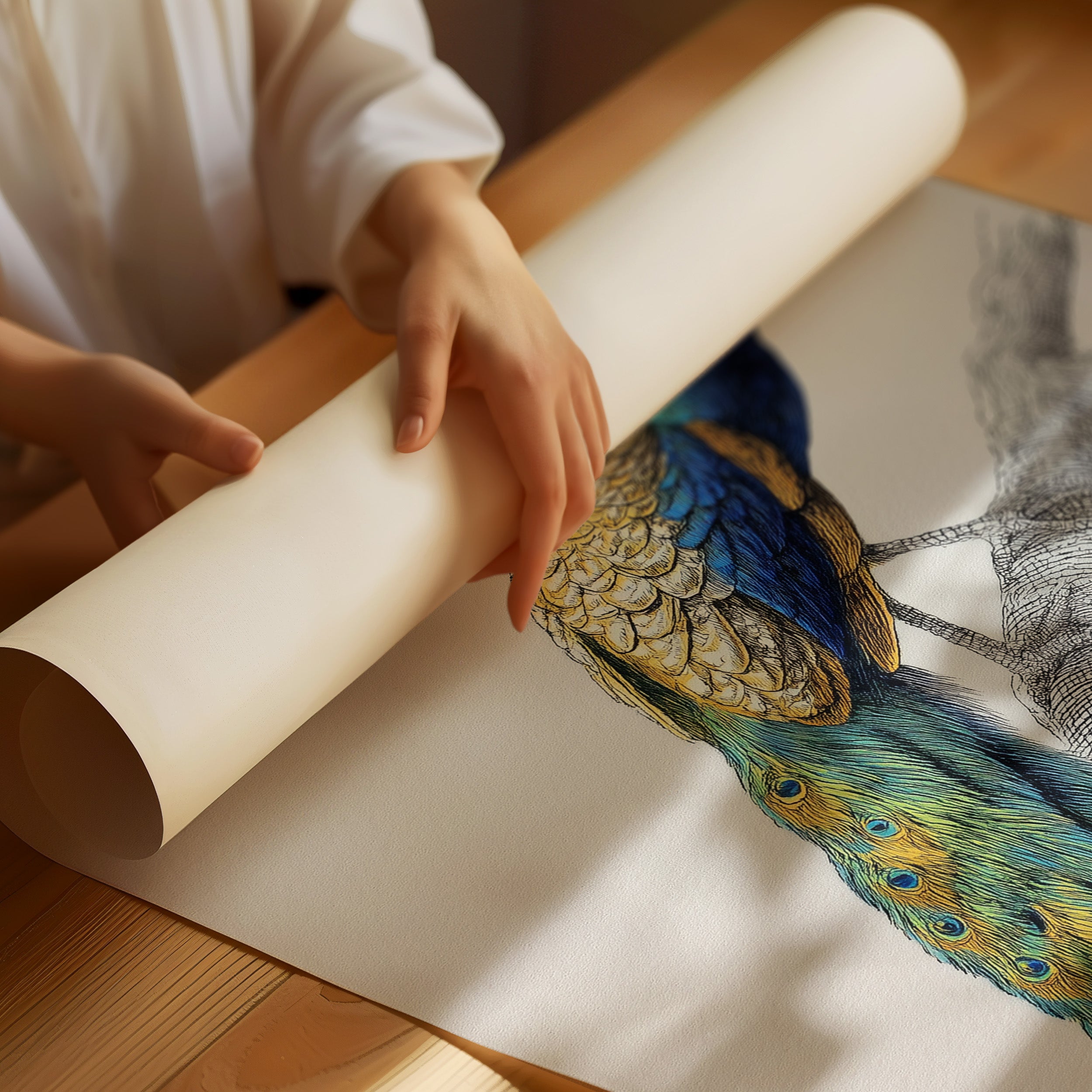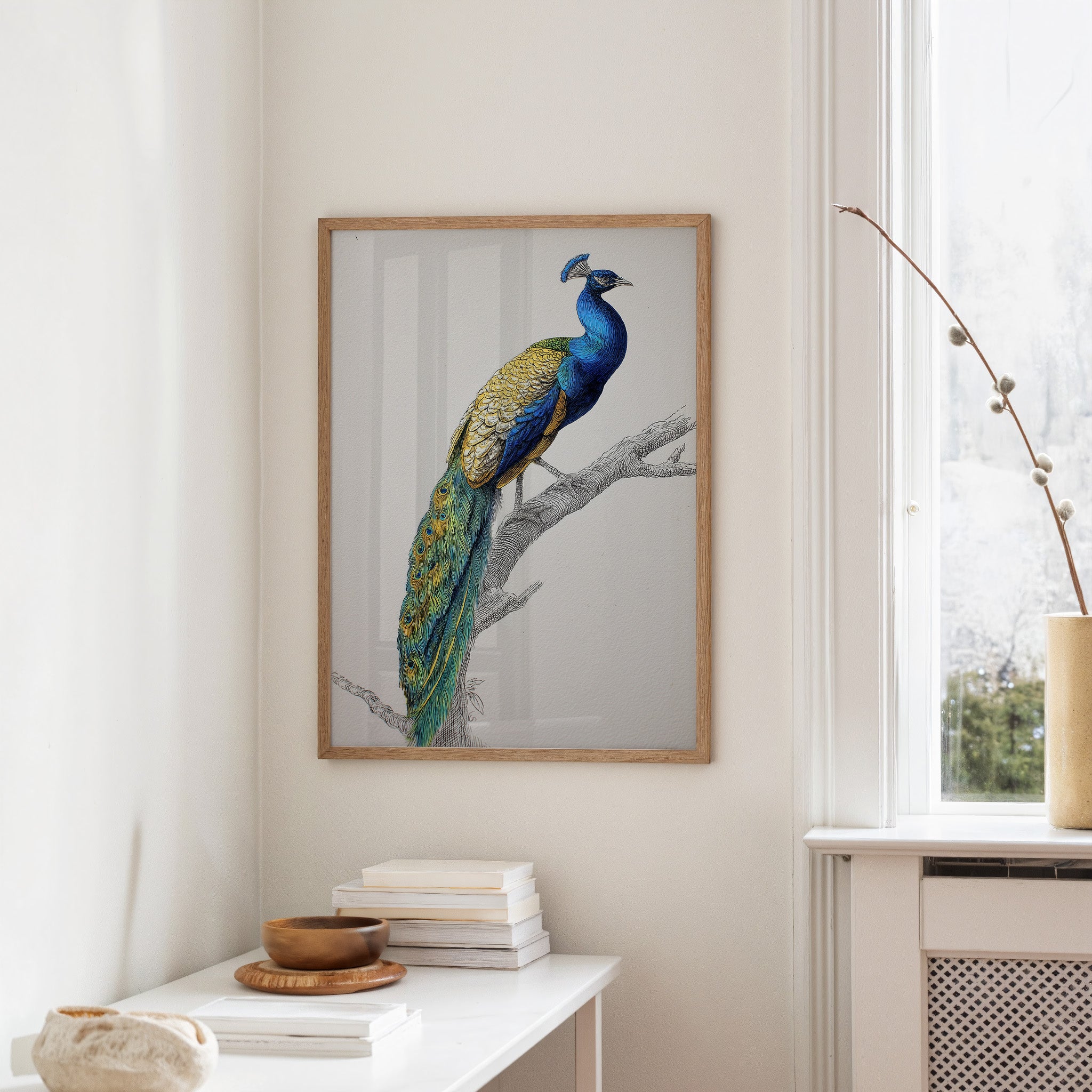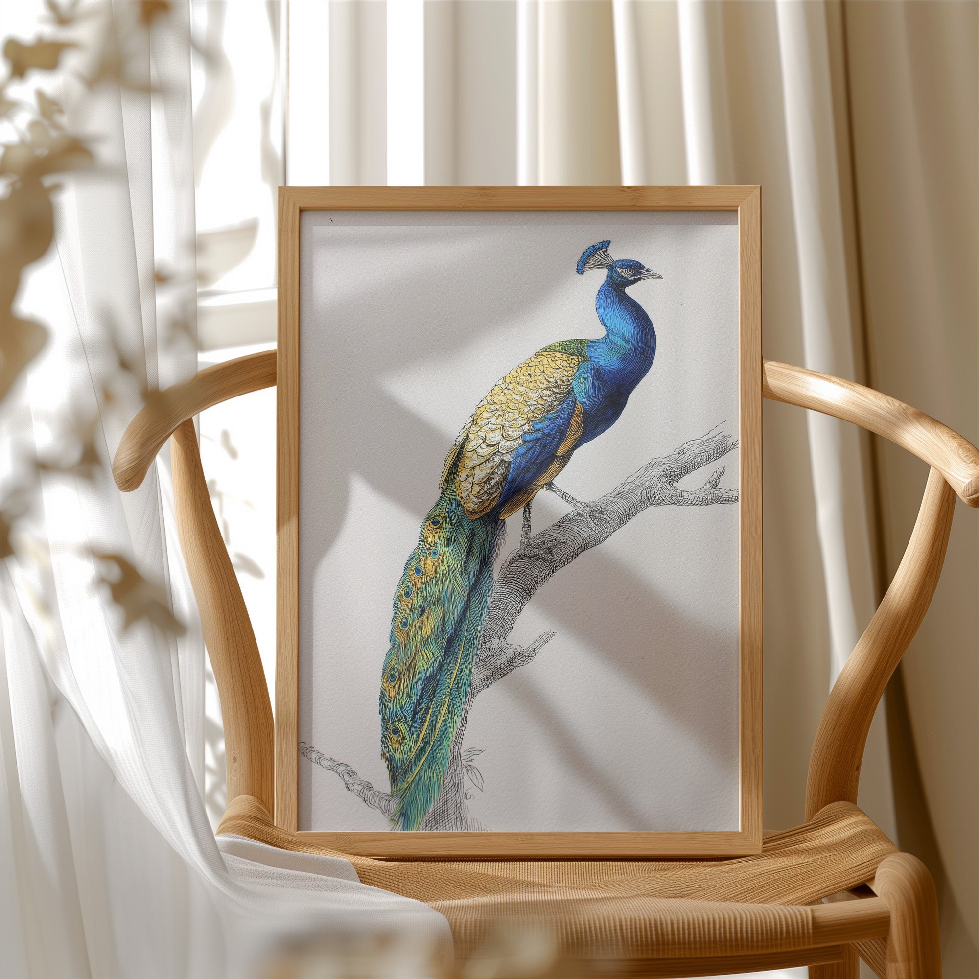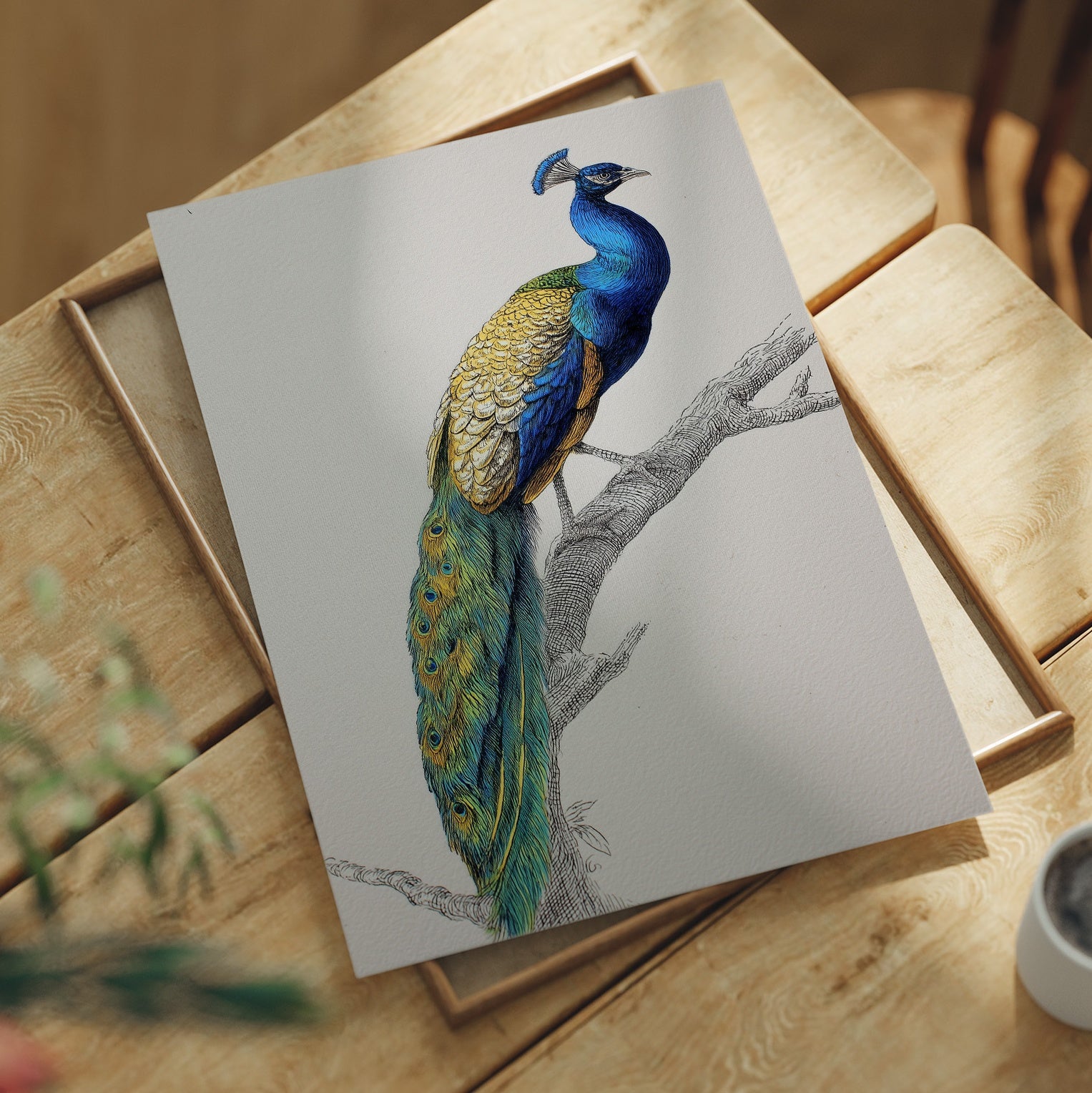 Morning light spills across a rustic wooden table, illuminating a delicate illustration of a peacock in vibrant blues and golds. The bird's regal posture and intricate feather details stand in elegant contrast to the simple pencil-sketched branch it perches upon. Sunlight catches the iridescent hues of the plumage, bringing to life the meticulous artistry against the cream background, while the warm tones of the wooden surface below create a perfect natural frame. This piece would bring a touch of refined natural beauty to a reading nook, studio space, or anywhere needing a splash of color with classical botanical illustration charm.