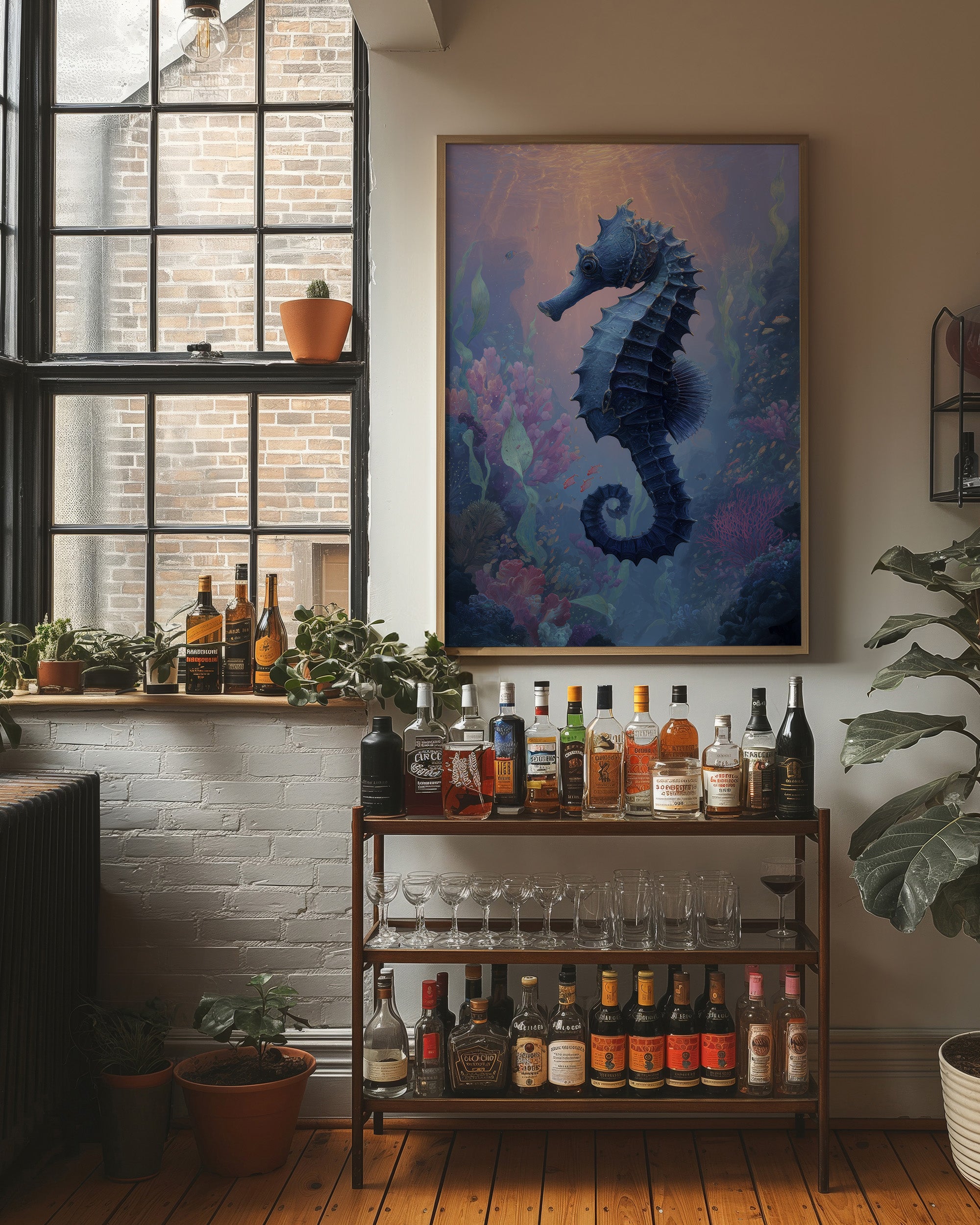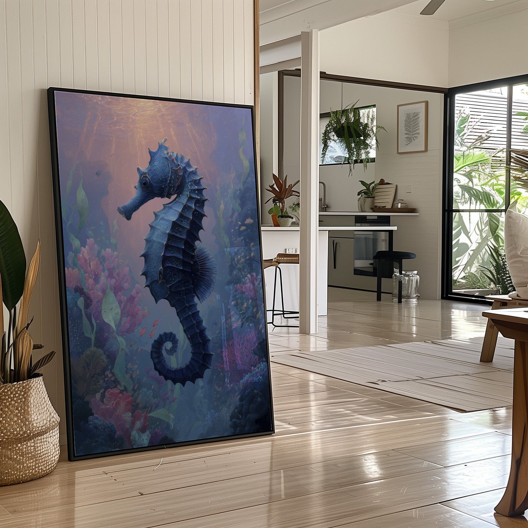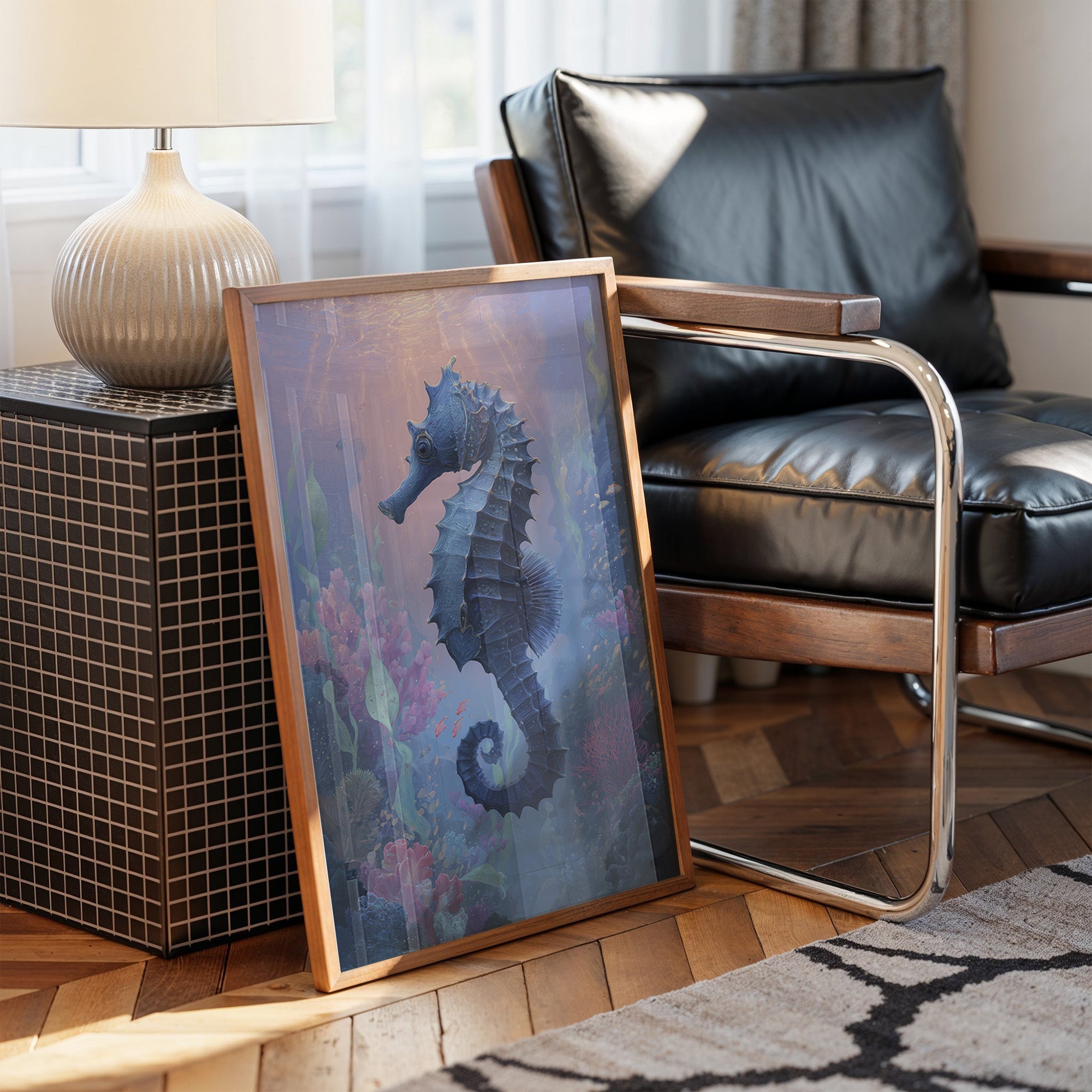 Sunlight drifts across hardwood floors, illuminating a framed seahorse suspended in an ethereal underwater ballet. The delicate creature's blue-gray form curves gracefully against a backdrop of soft purples and dreamy aquatic hues, its textured spine creating a mesmerizing silhouette. Coral formations in gentle pinks and teals create a mysterious underwater garden, inviting viewers to imagine the silent, slow-motion dance of ocean life. This piece brings coastal serenity to modern interiors, perfect for adding a touch of sophisticated whimsy to living rooms or studies where contemplative moments unfold.