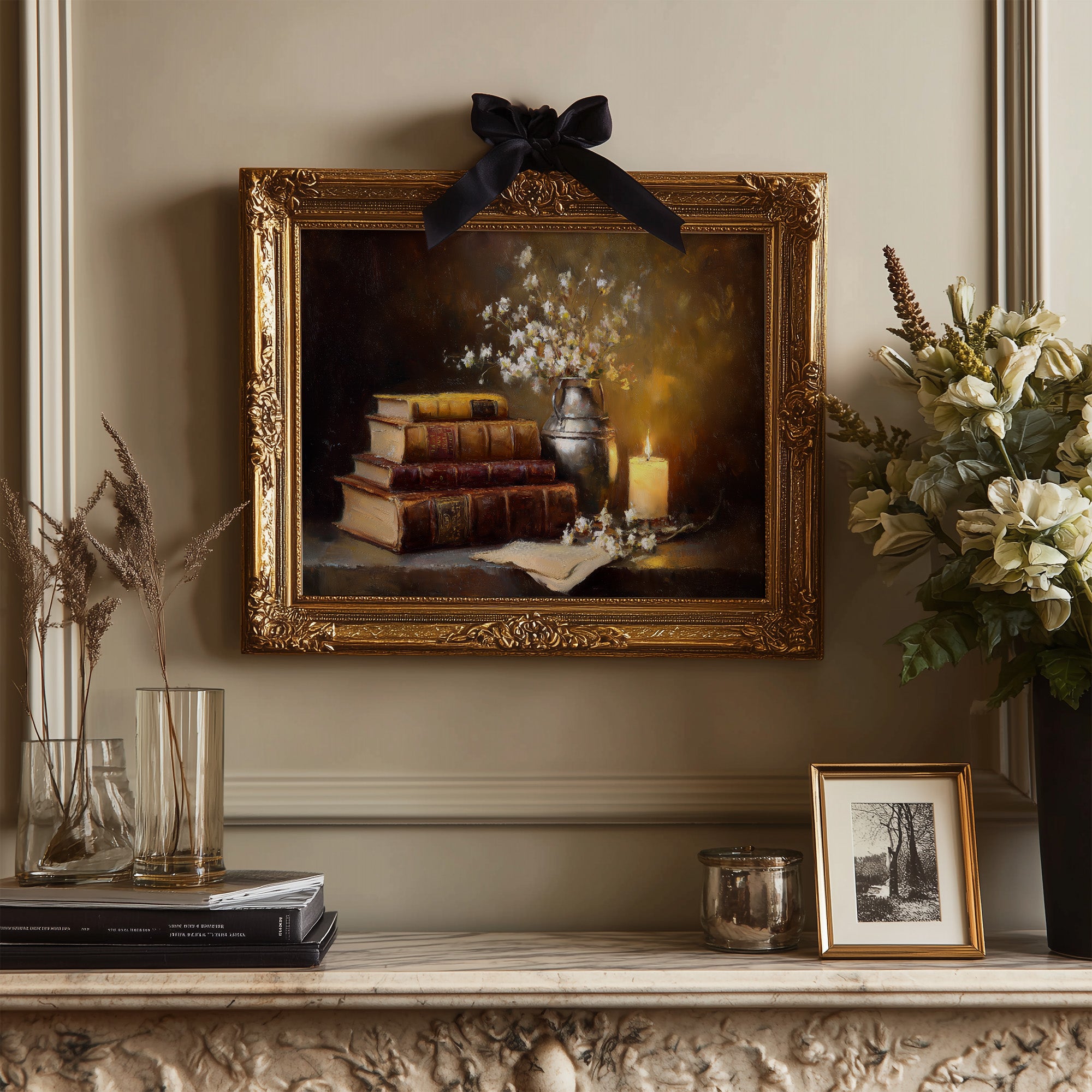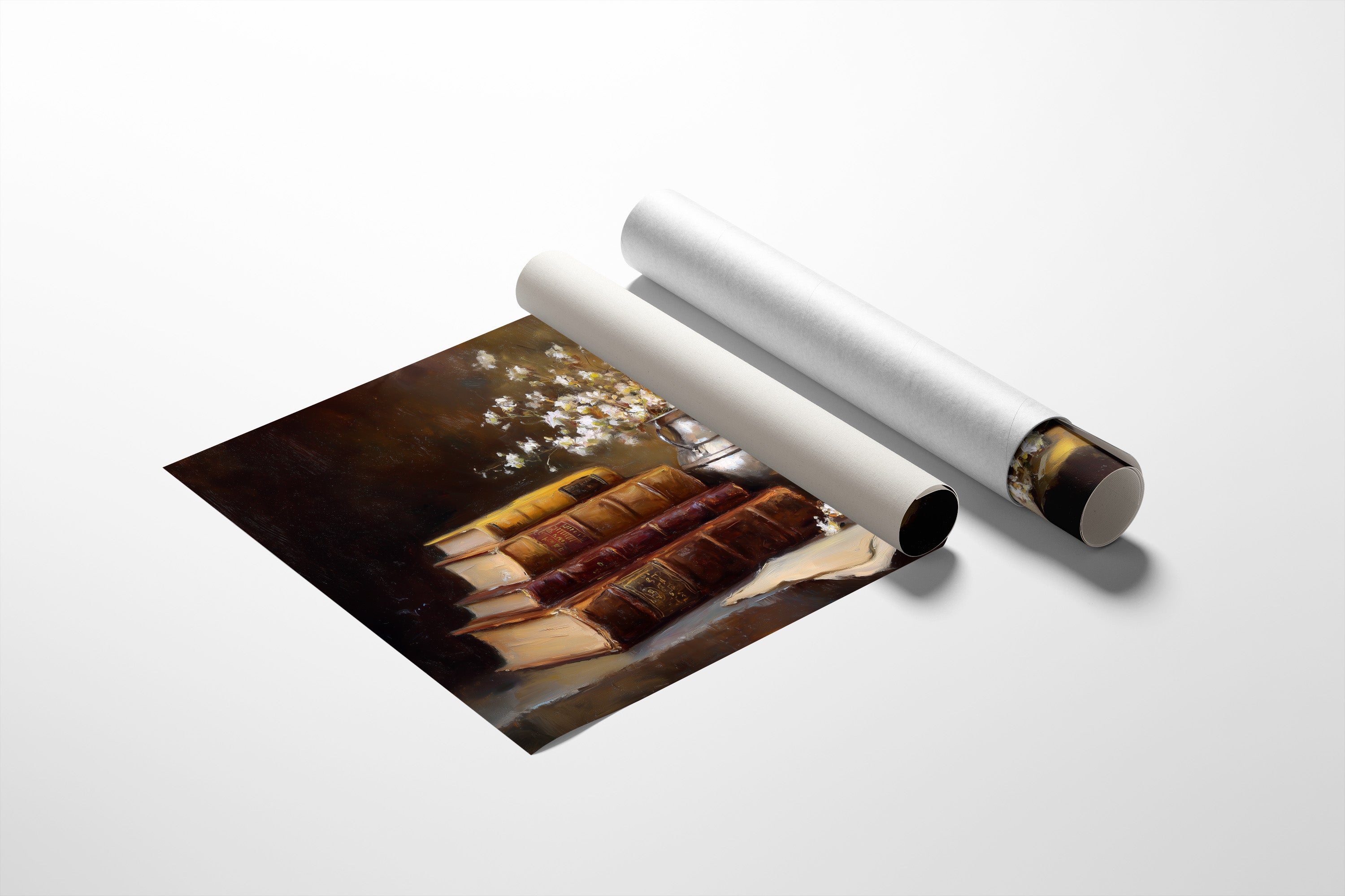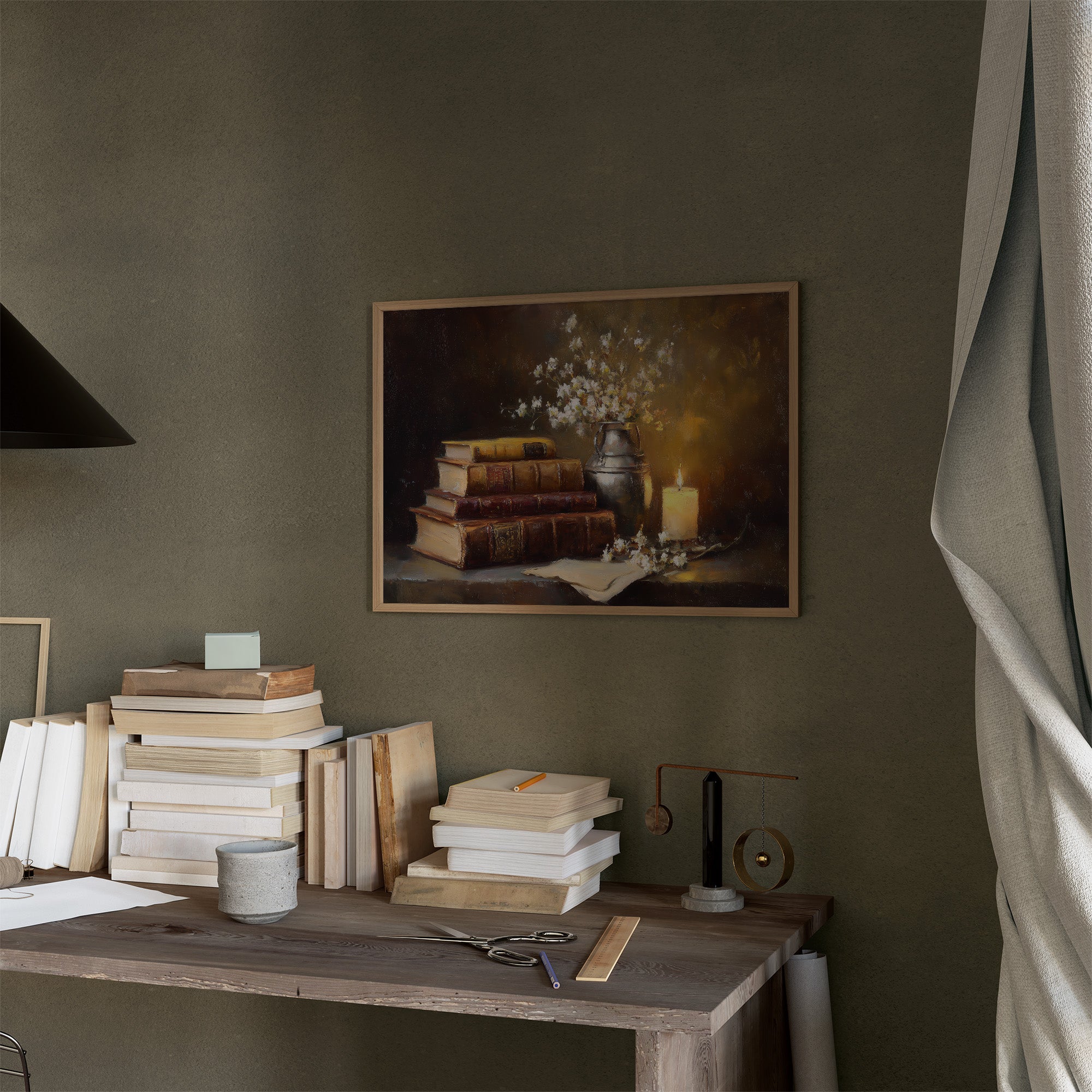 A moment suspended in amber light, where time slows around weathered leather bindings and delicate wildflowers. The painting captures an intimate still lifeantique volumes stacked beneath a silver pitcher of white blooms, all bathed in the gentle flicker of a single candle. Rich amber tones and deep shadows create a conversation between past and present, knowledge and beauty, permanence and fleeting light. This contemplative piece brings literary warmth to a home office, reading nook, or any space where stories and quiet reflection are treasured.
