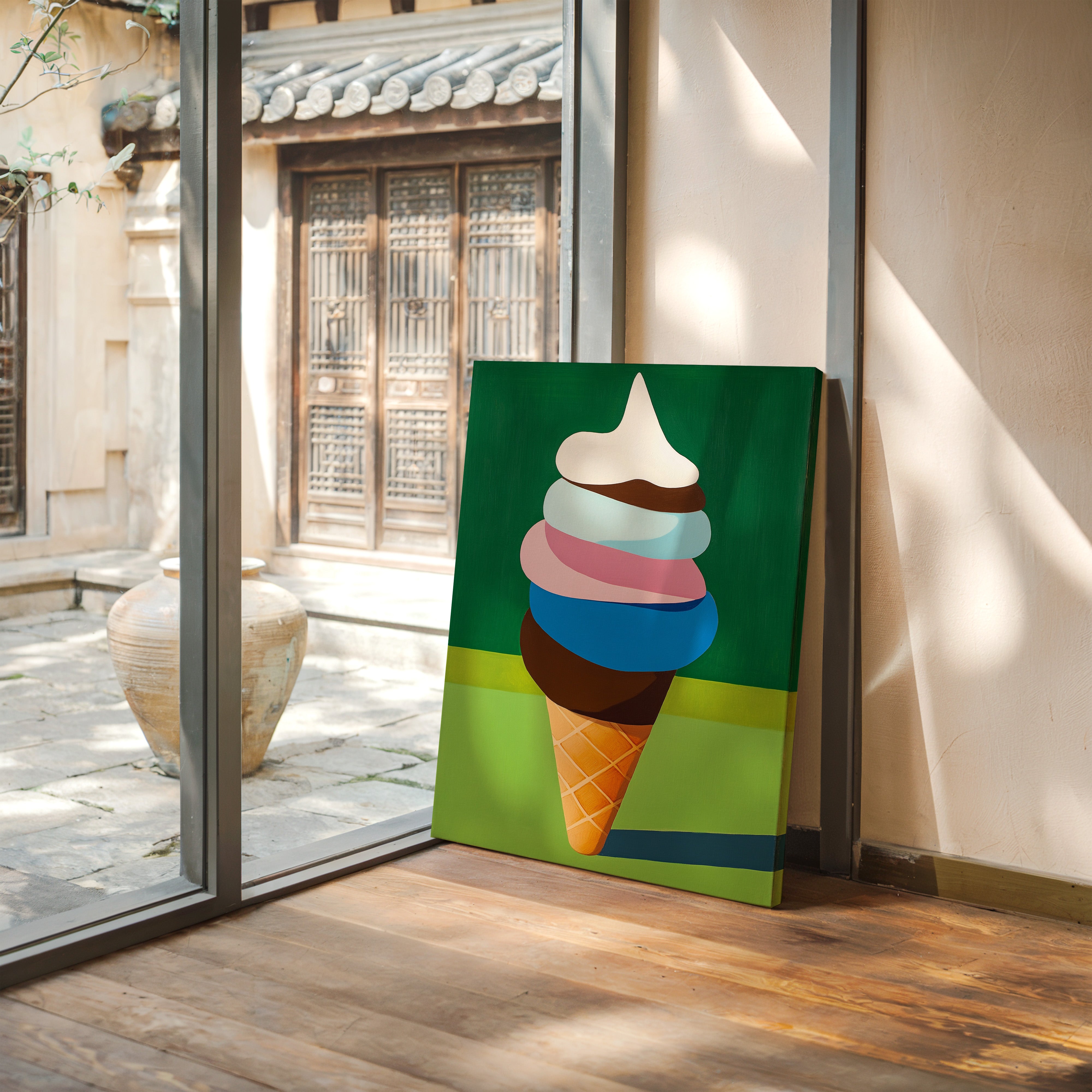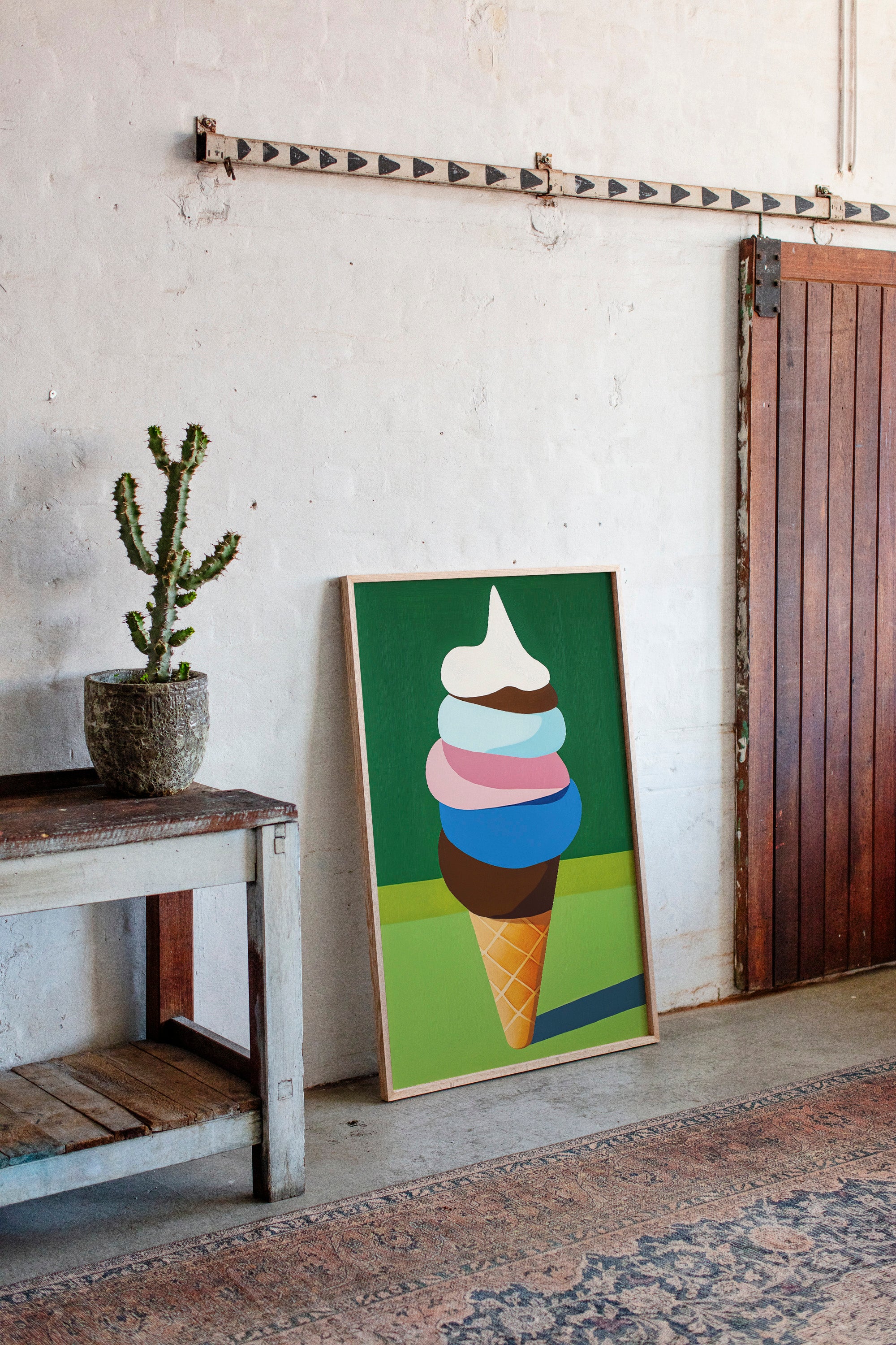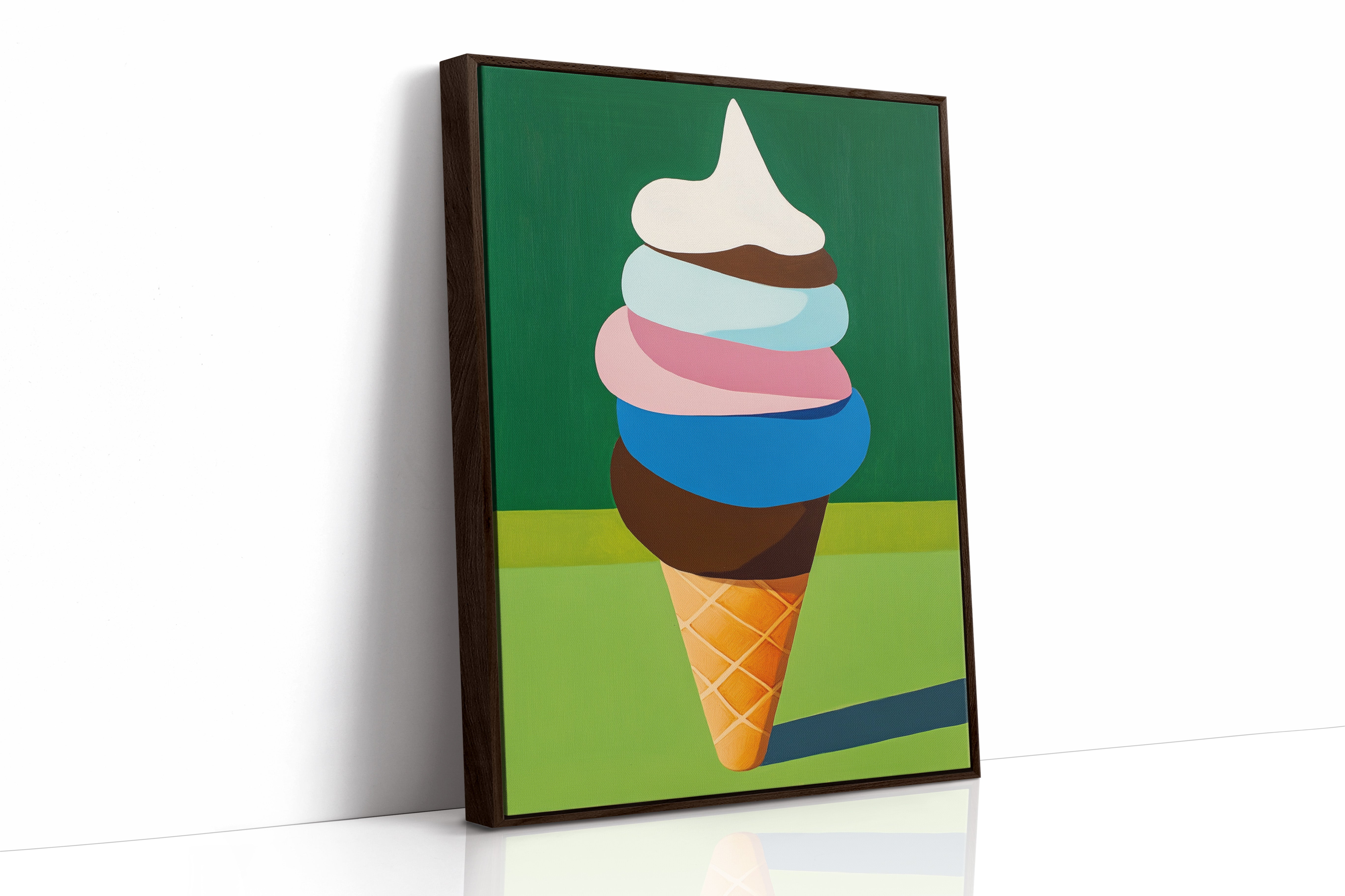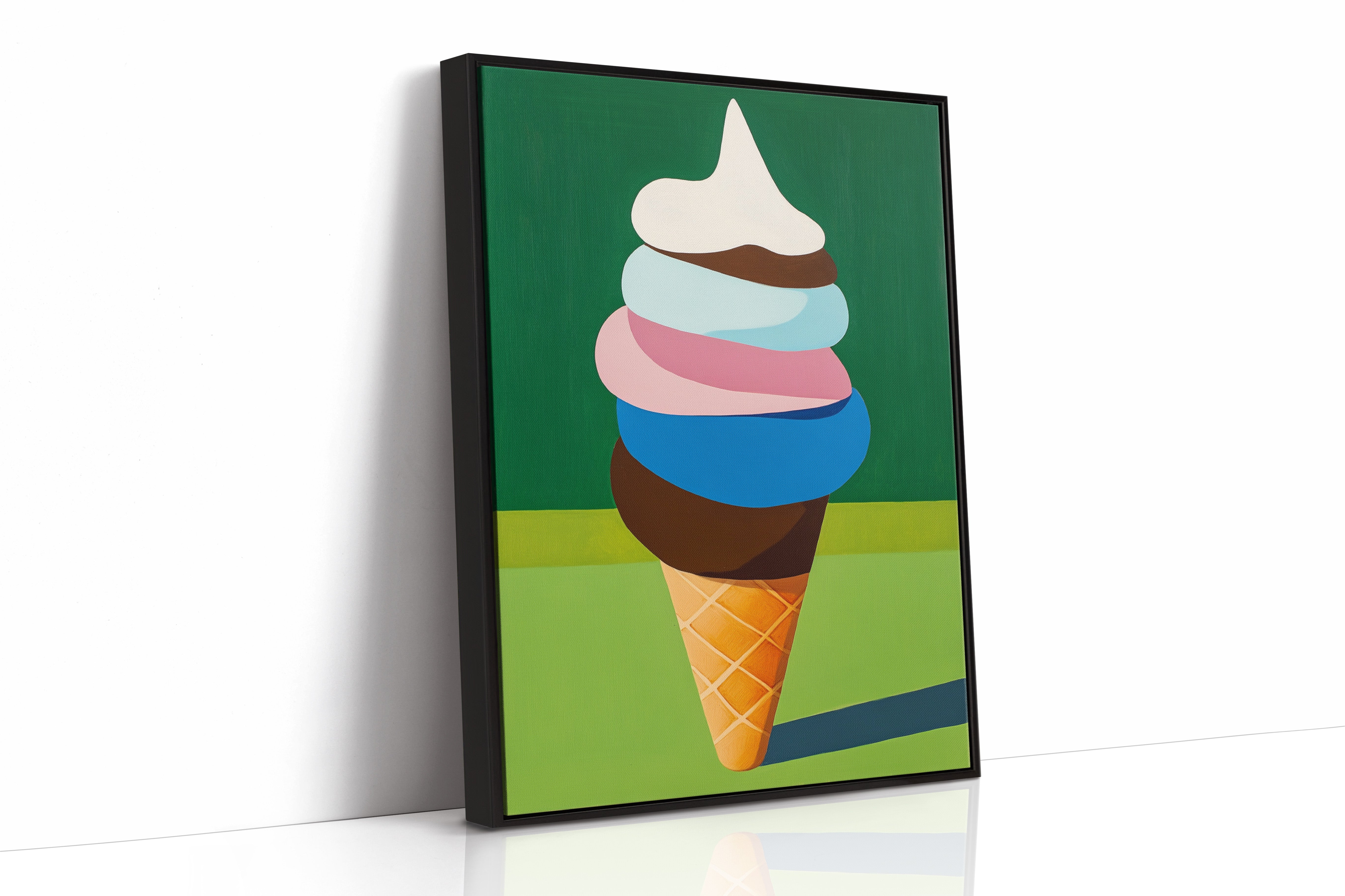A towering ice cream cone stands as a monument to childhood joy, its layers creating a rainbow of sweet promises. Each perfectly stacked scoop - chocolate, blue raspberry, strawberry, mint, and vanilla - tells its own story against a bold emerald backdrop. The geometric precision of the waffle cone contrasts with the soft, curving scoops above, while a playful shadow stretches across the lime-green ground.