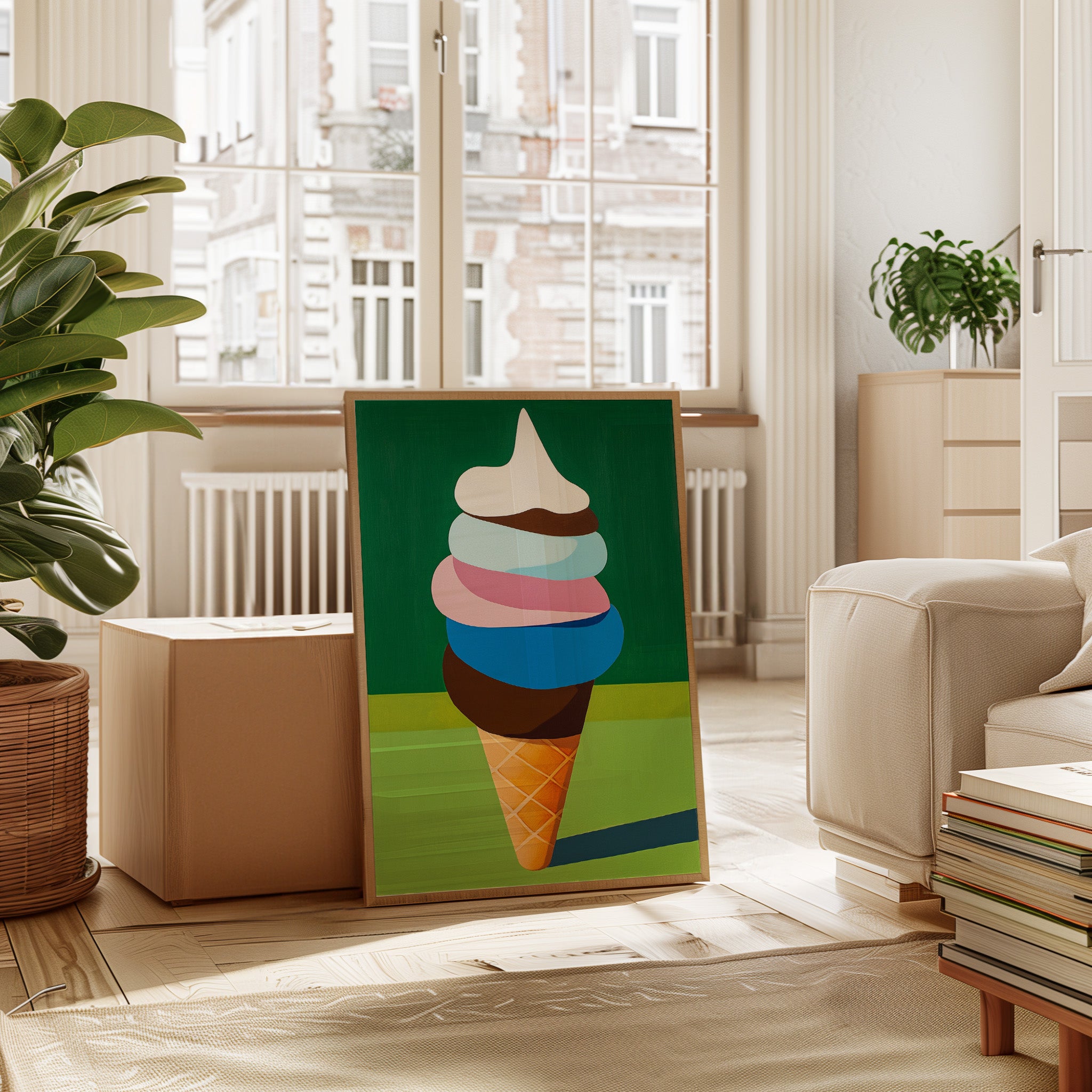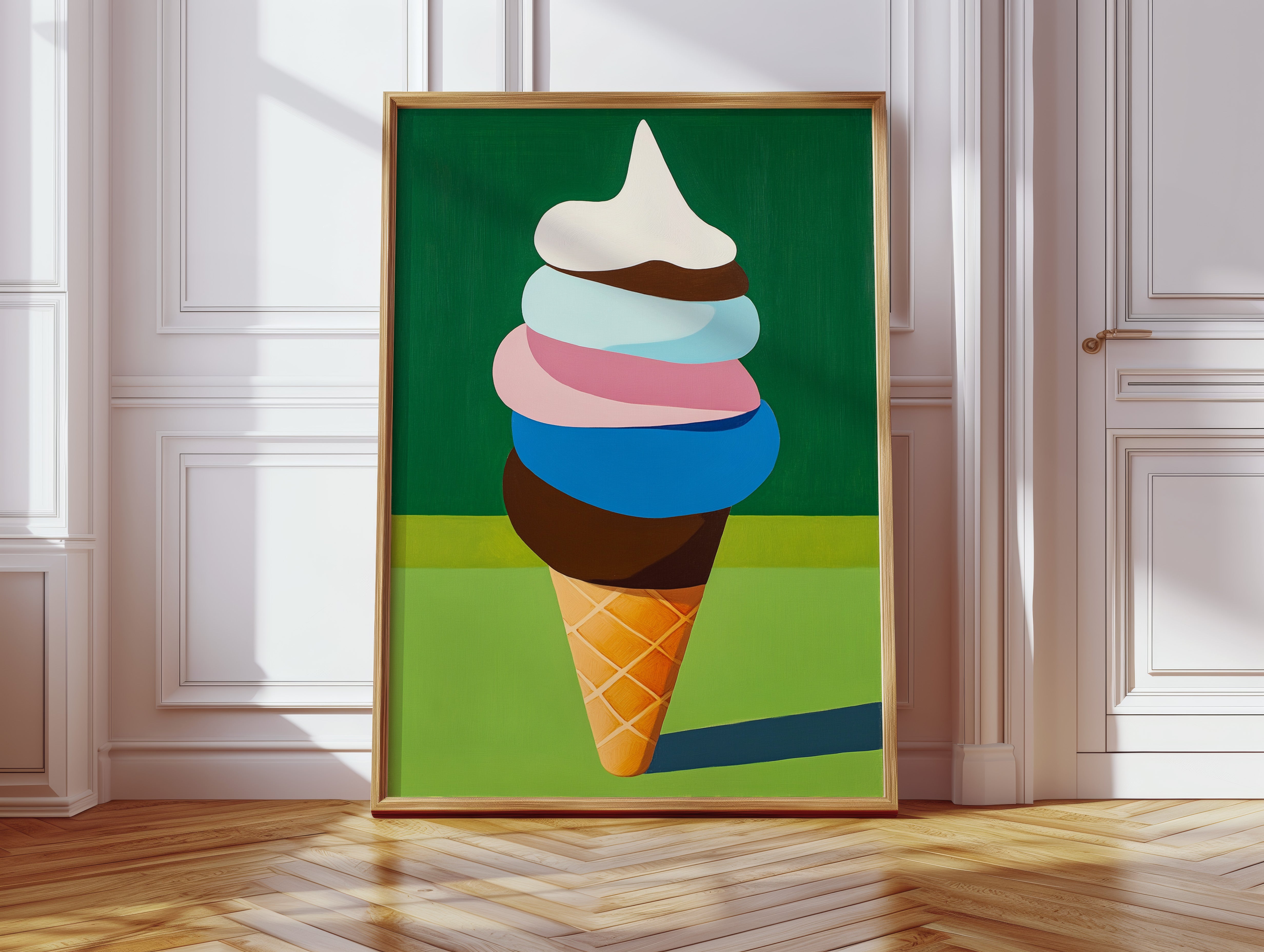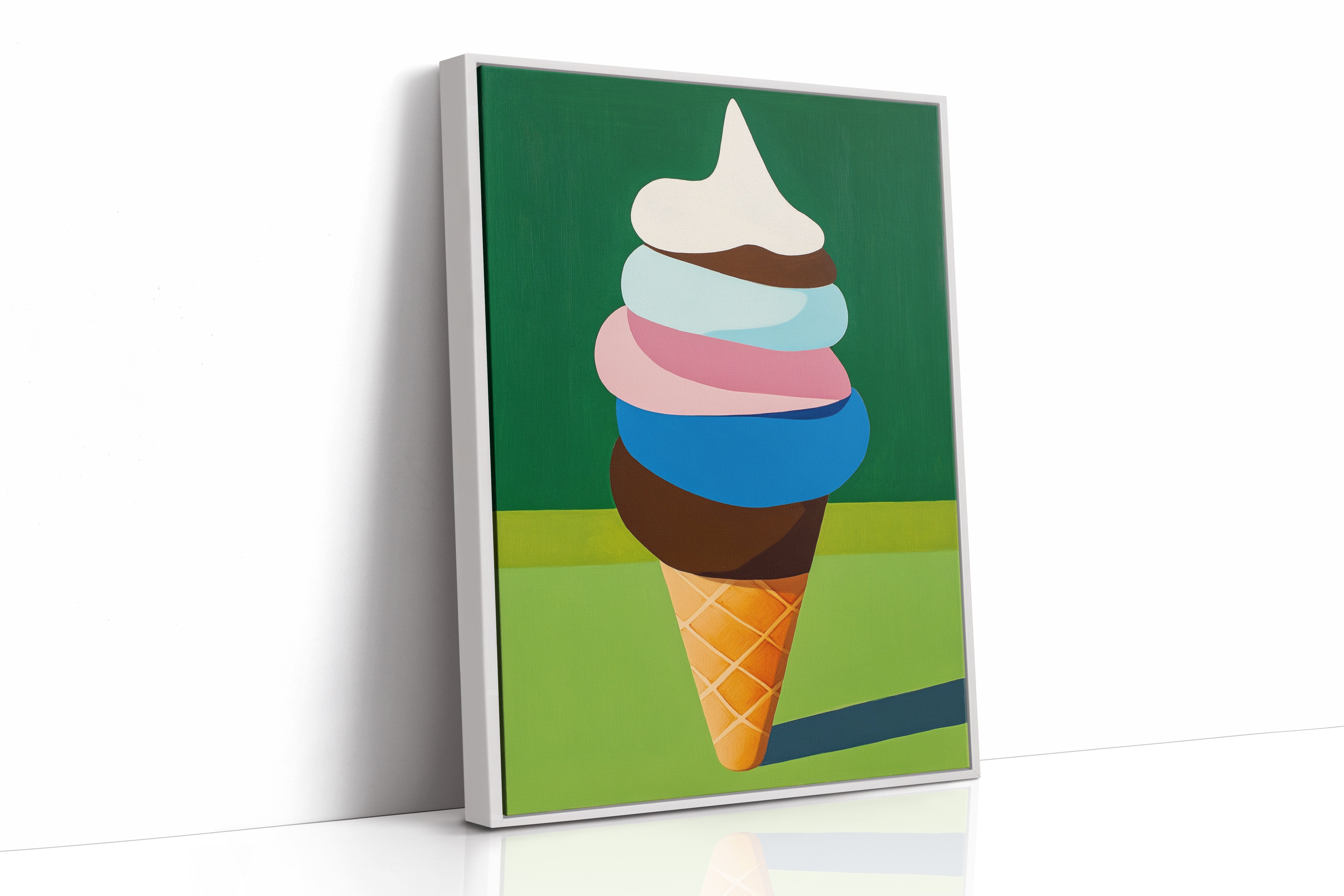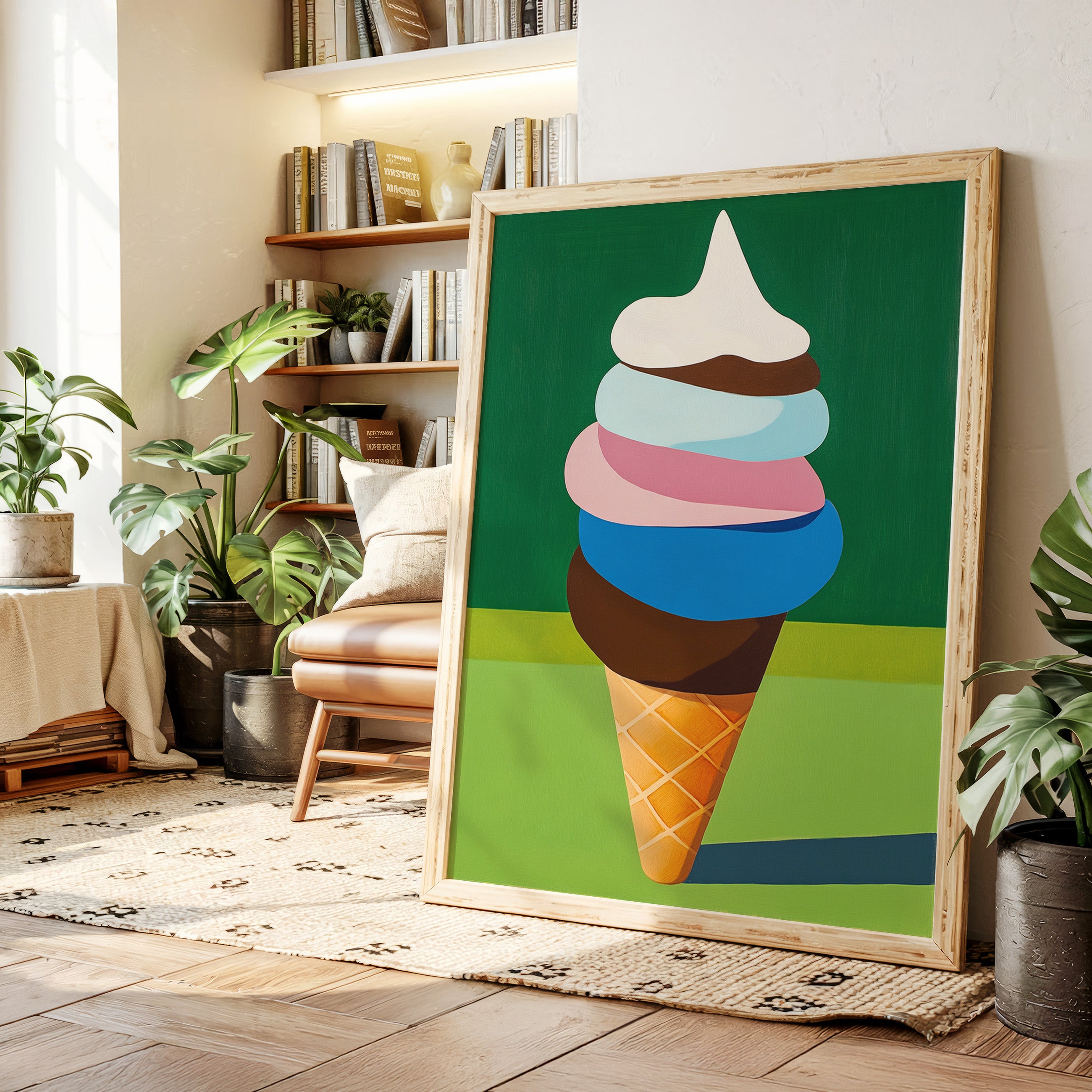A towering ice cream cone stands as a monument to childhood joy, its layers creating a rainbow of sweet promises. Each perfectly stacked scoop - chocolate, blue raspberry, strawberry, mint, and vanilla - tells its own story against a bold emerald backdrop. The geometric precision of the waffle cone contrasts with the soft, curving scoops above, while a playful shadow stretches across the lime-green ground.