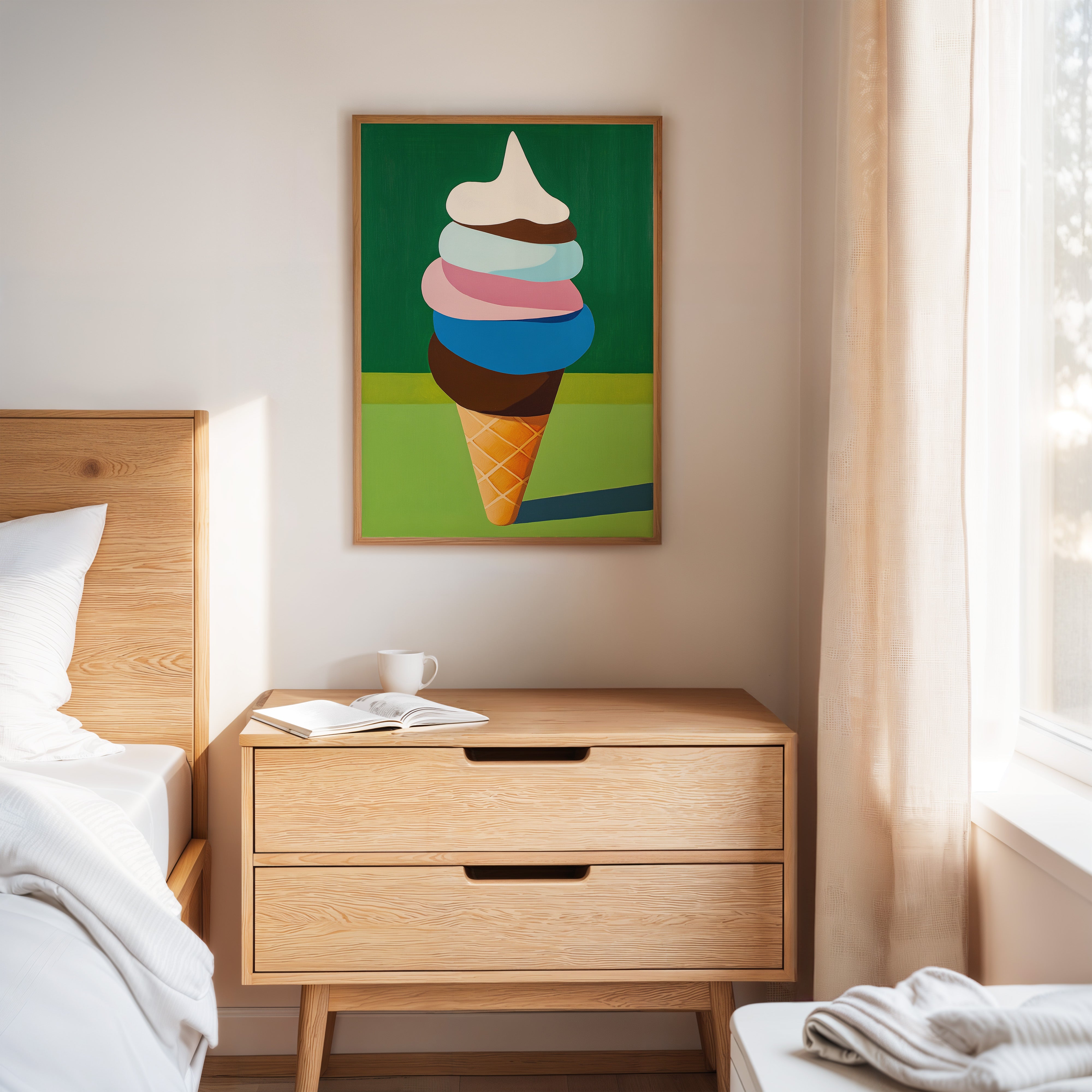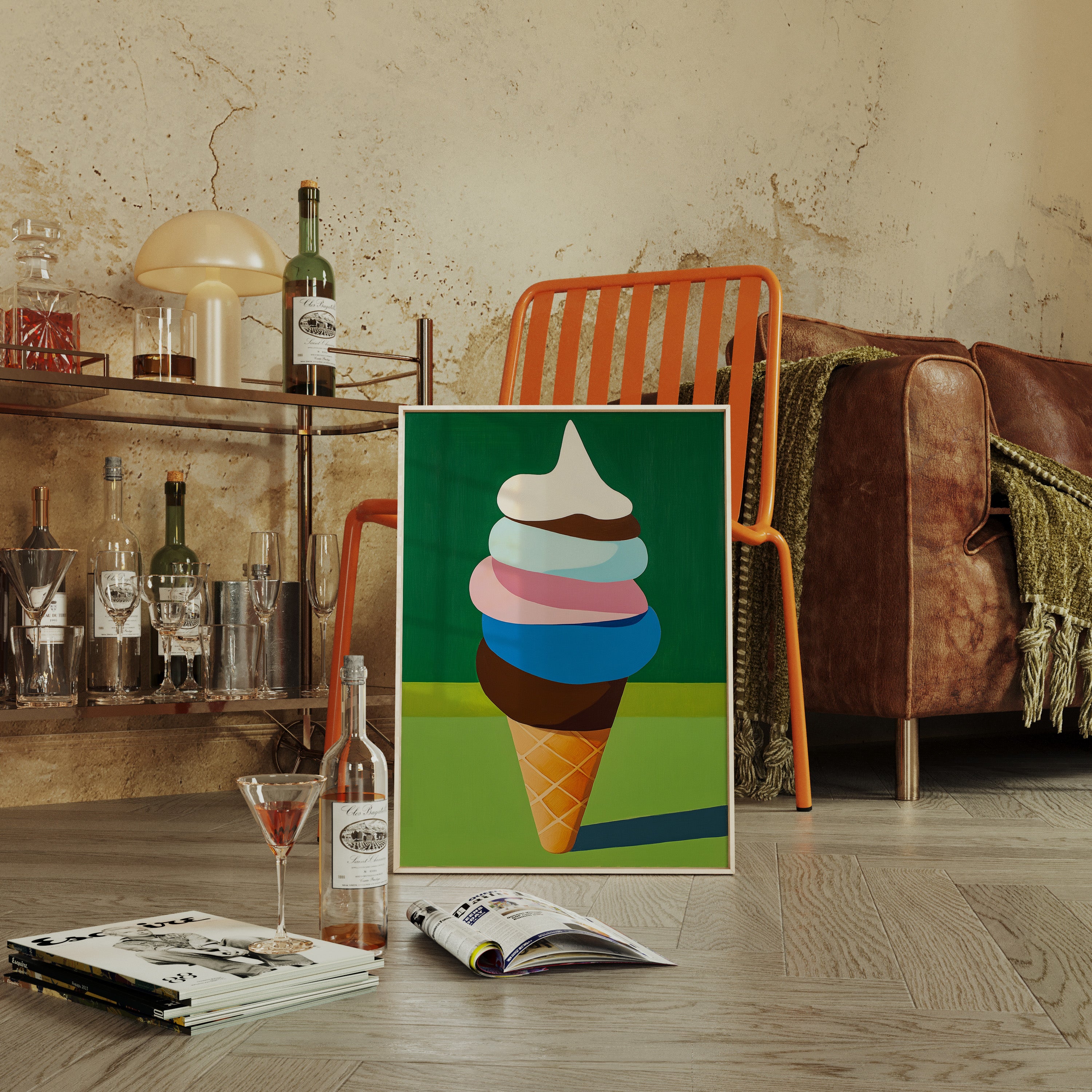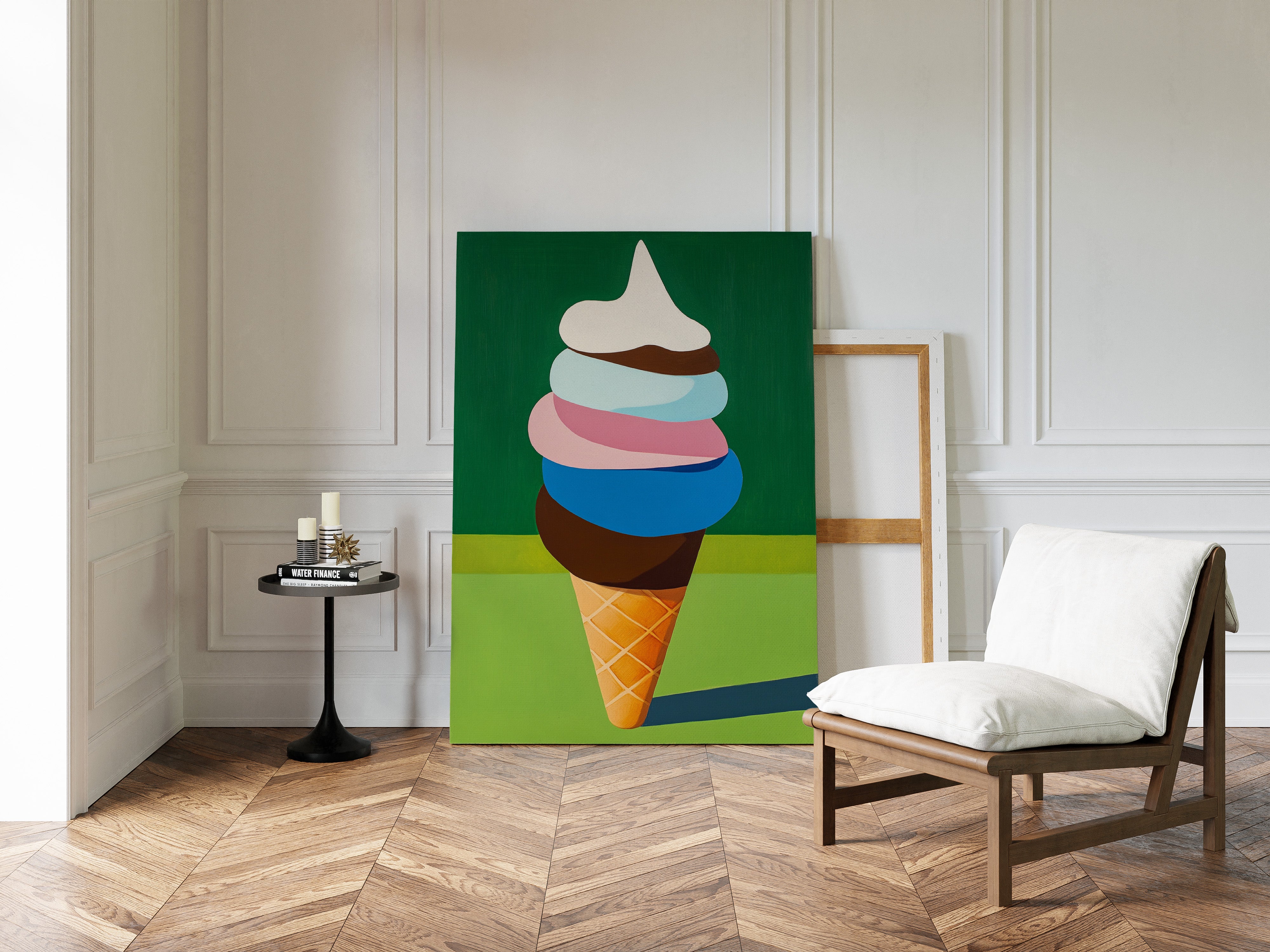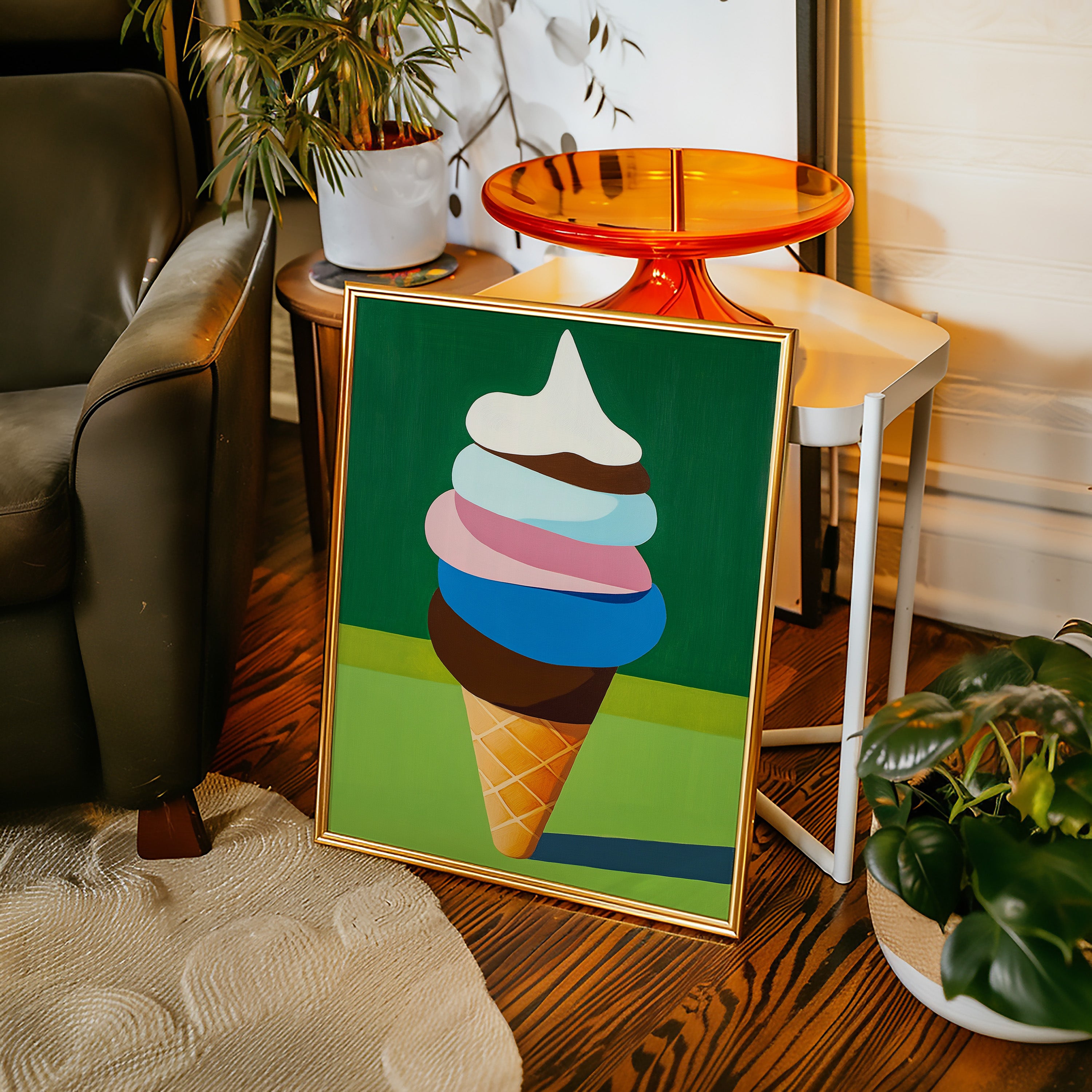 A towering ice cream cone stands as a monument to childhood joy, its layers creating a rainbow of sweet promises. Each perfectly stacked scoop - chocolate, blue raspberry, strawberry, mint, and vanilla - tells its own story against a bold emerald backdrop. The geometric precision of the waffle cone contrasts with the soft, curving scoops above, while a playful shadow stretches across the lime-green ground.