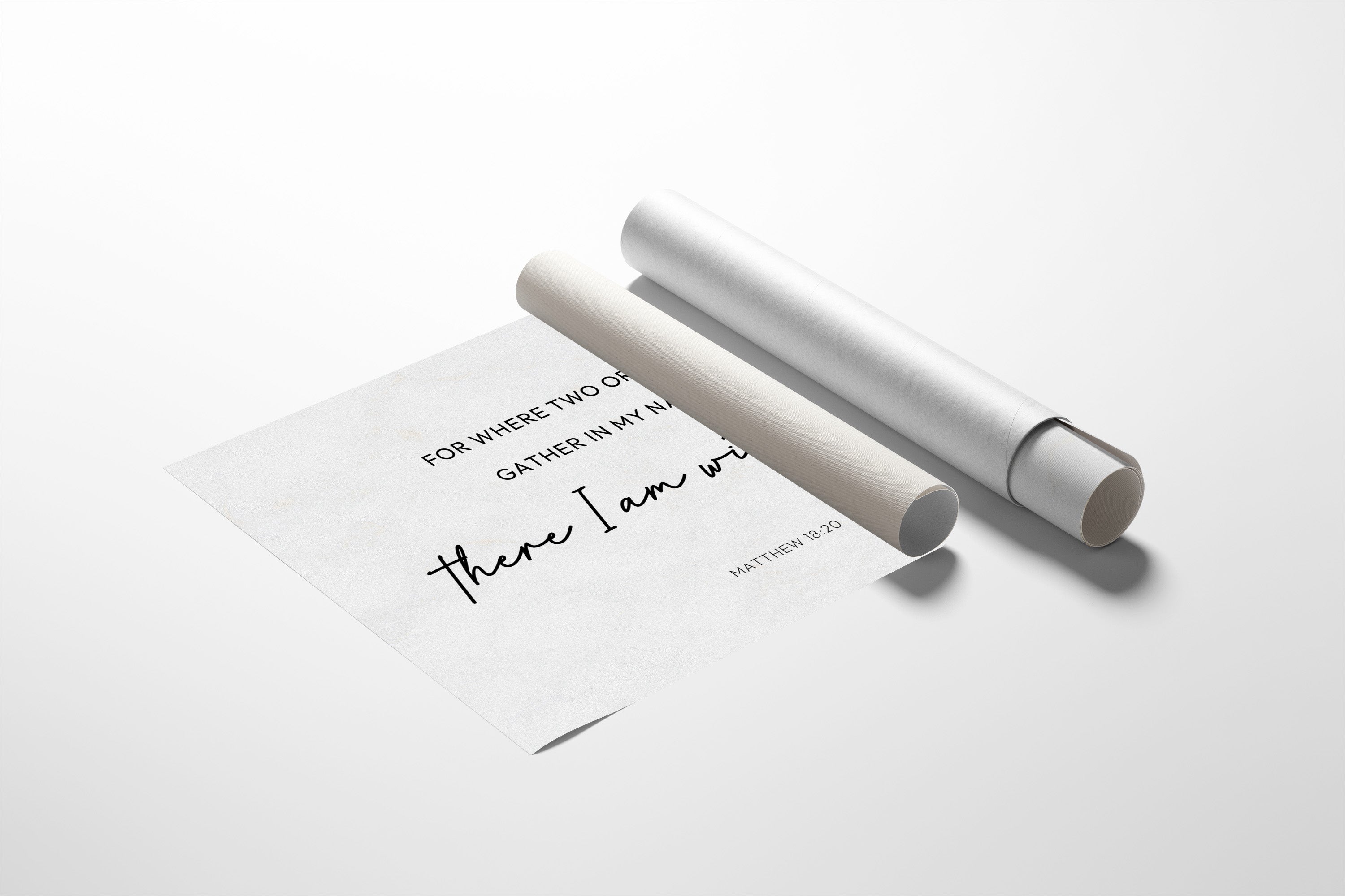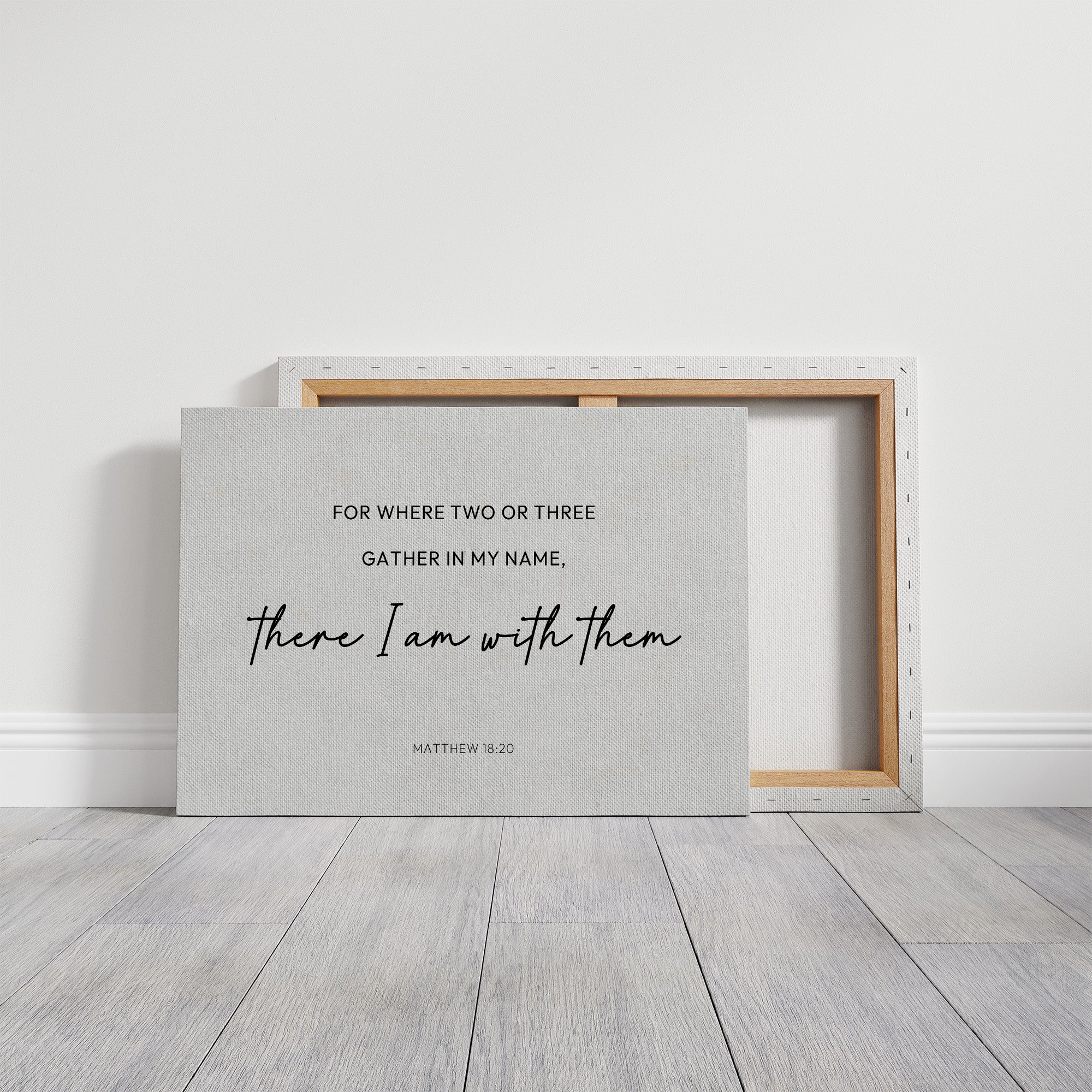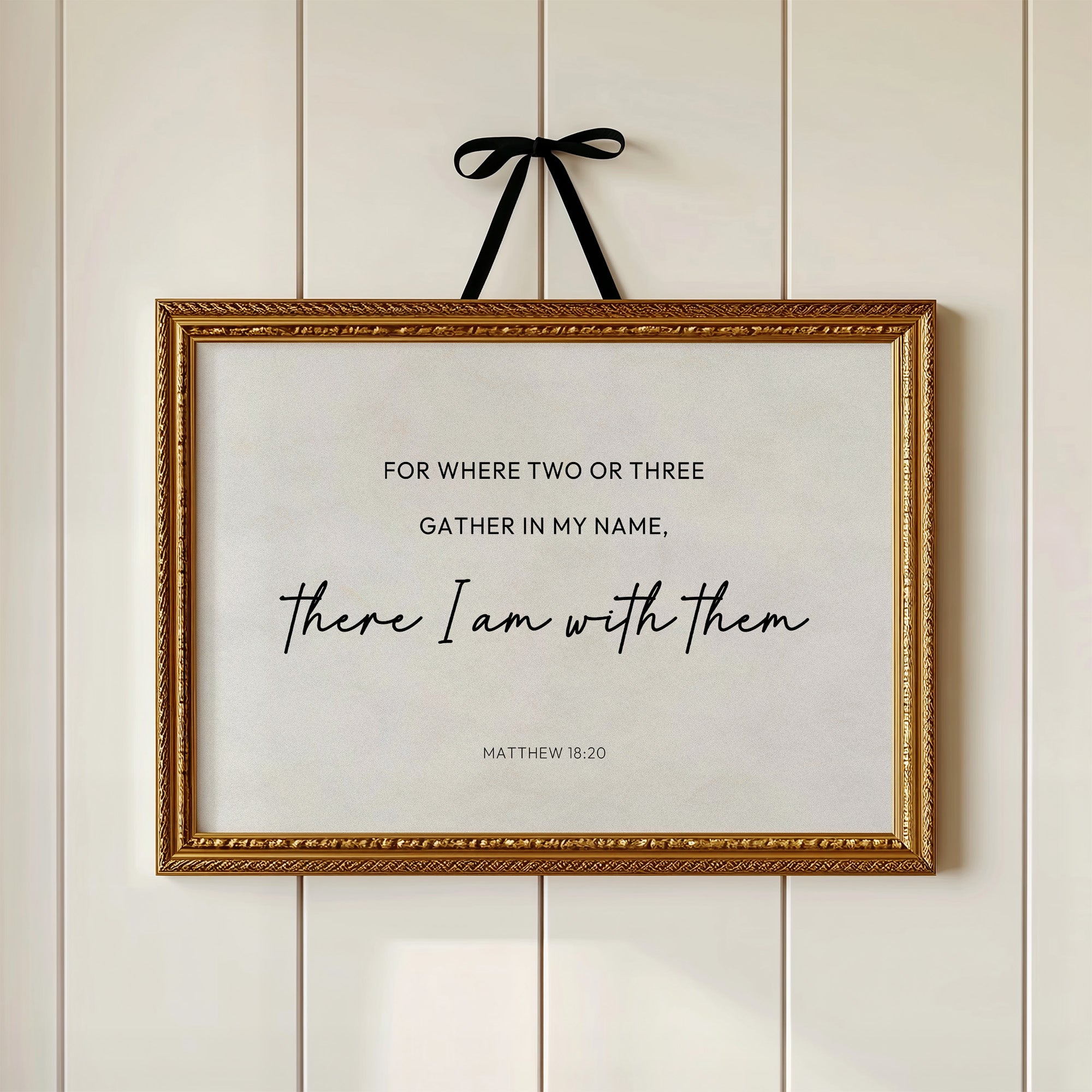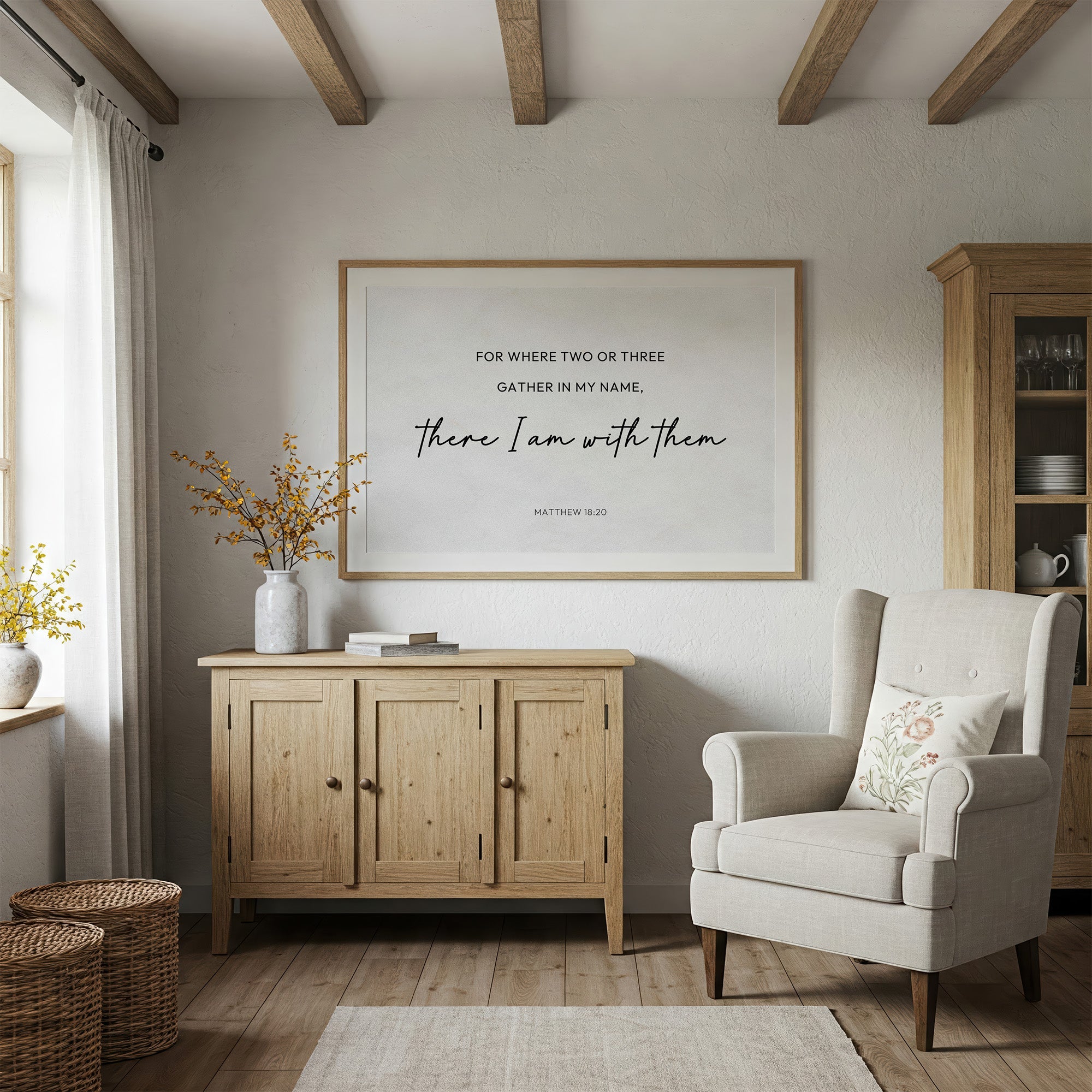 Warm light bathes this tranquil corner where a framed biblical verse becomes the centerpiece of contemplation. The Matthew 18:20 scripture sits elegantly displayed against white, its mixed typography lending both authority and intimacy to the sacred promise. Surrounding bookshelves cradle volumes of knowledge while dried pampas grass adds organic texture, creating a harmonious balance between the intellectual and the natural.