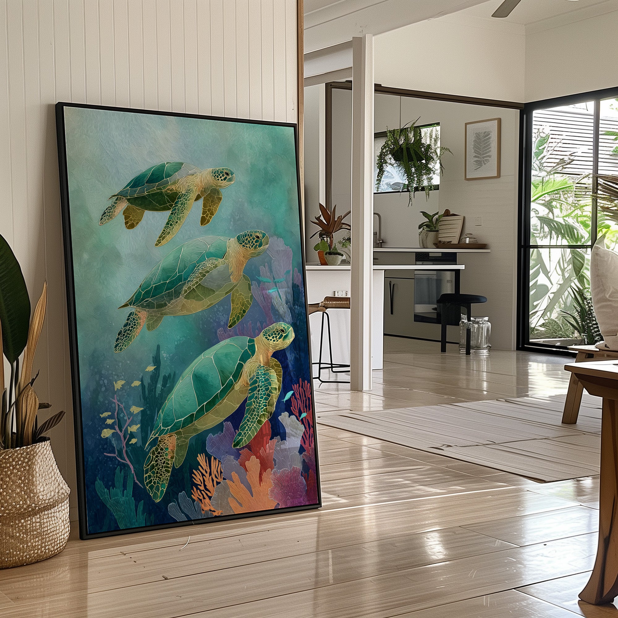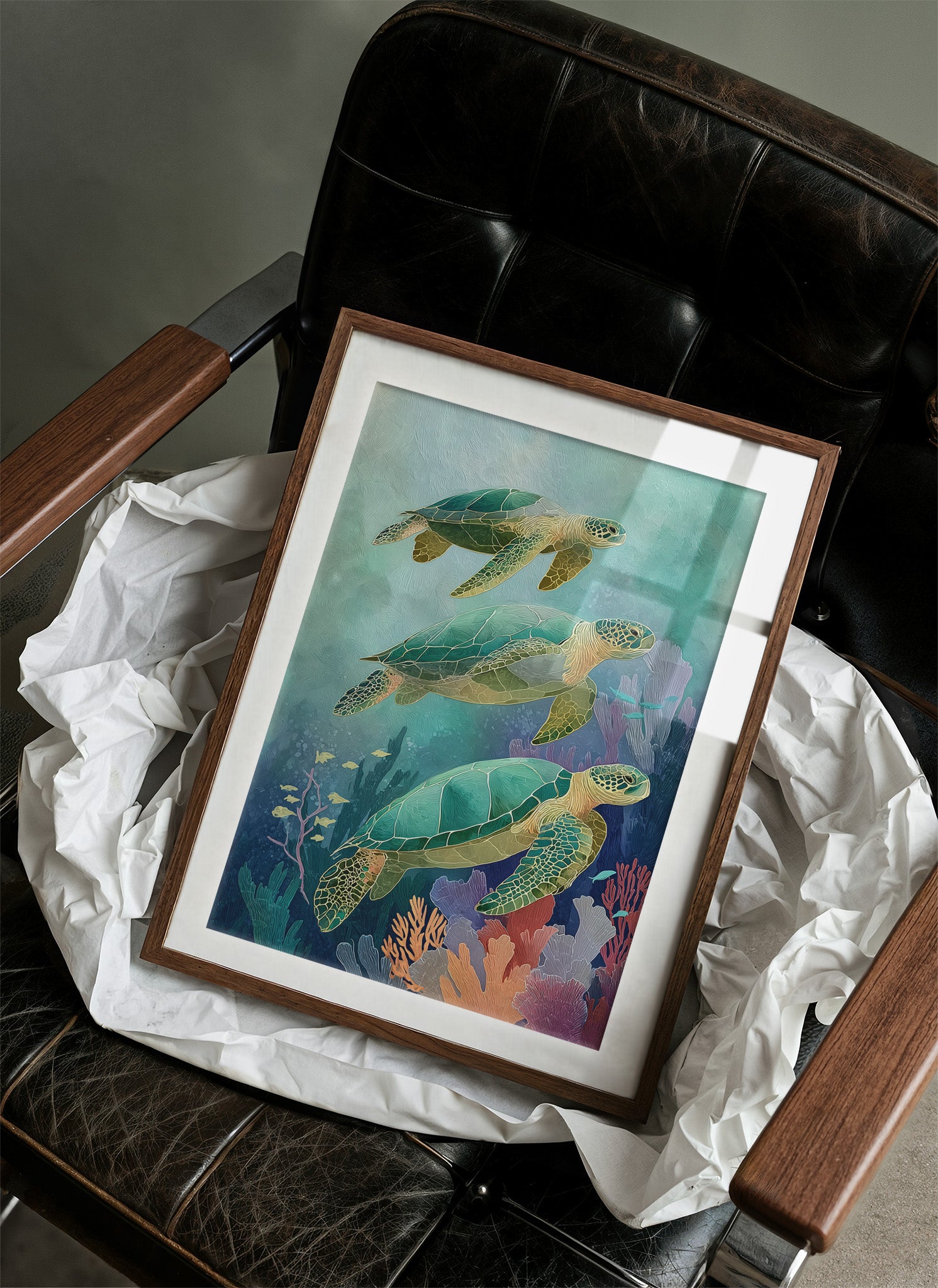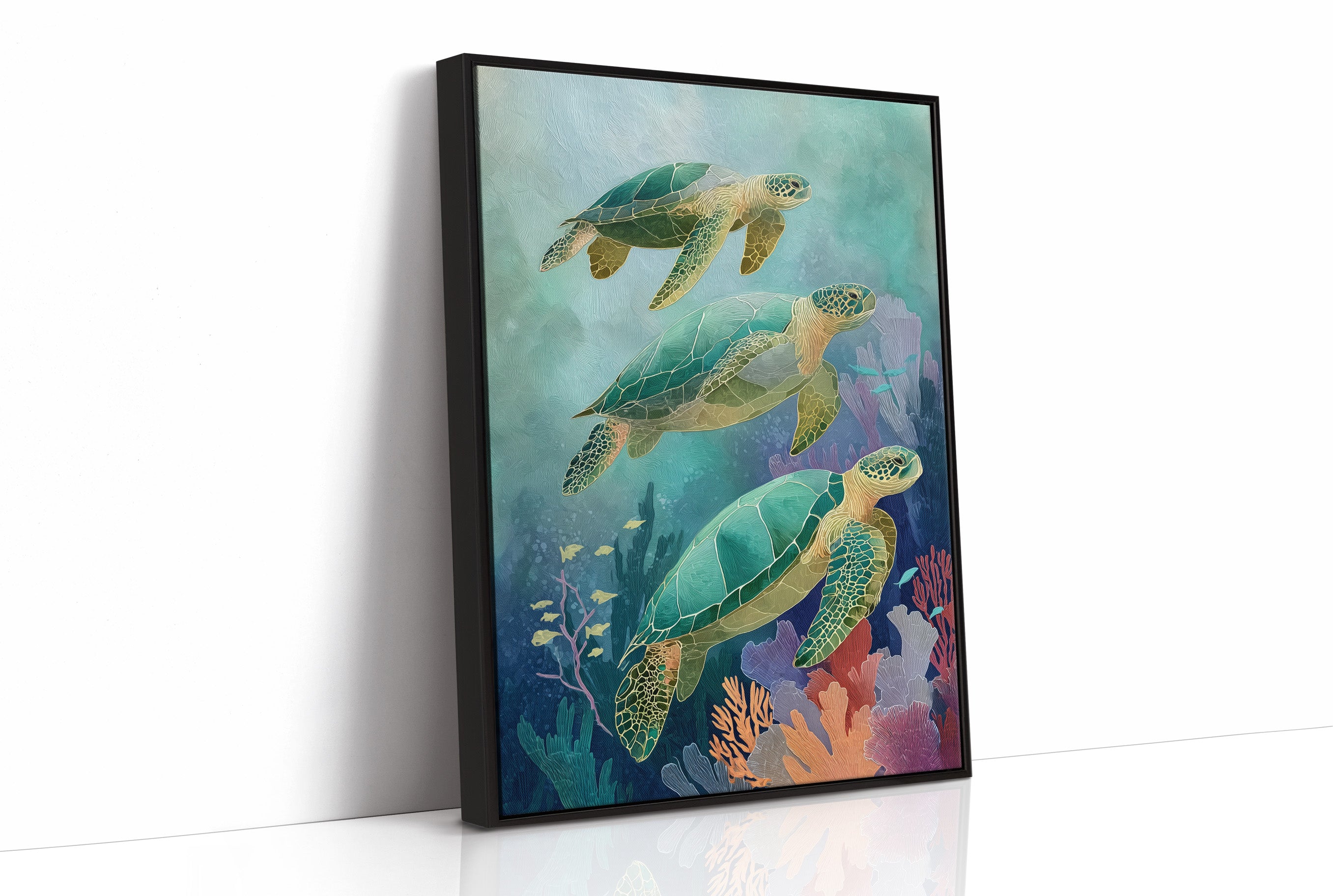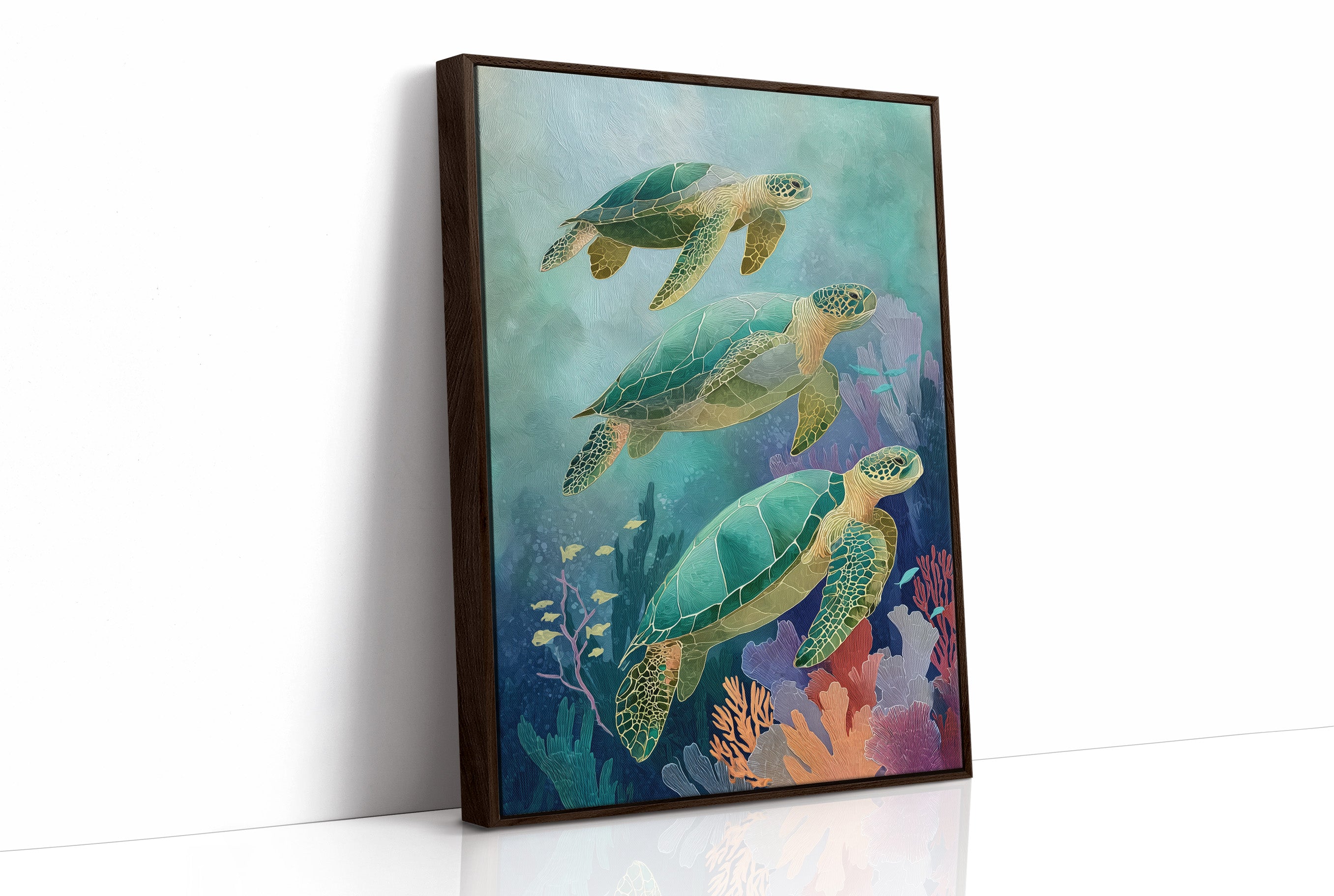 Gentle giants glide through aquamarine depths, their ancient shells catching the dappled sunlight filtering through distant waves. Three sea turtles navigate a vibrant underwater landscape, their emerald bodies contrasting with the soft coral and seafloor vegetation in muted pinks and purples. The artwork's tranquil palette creates a meditative escape, inviting the viewer to imagine the peaceful rhythm of ocean currents.