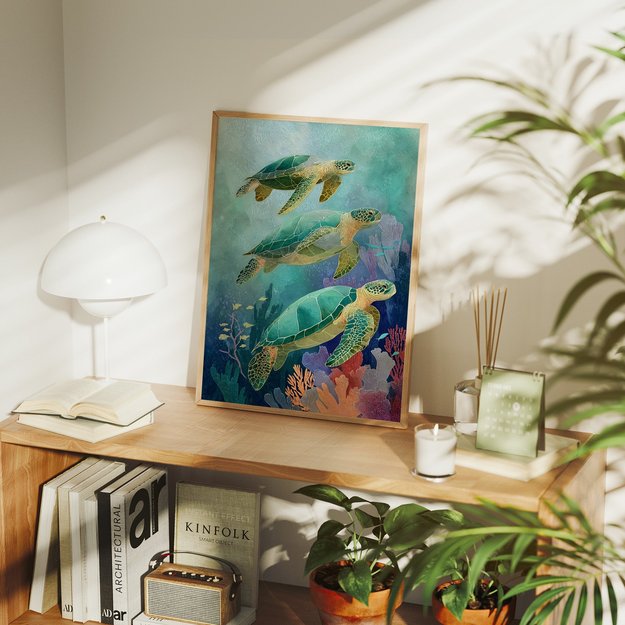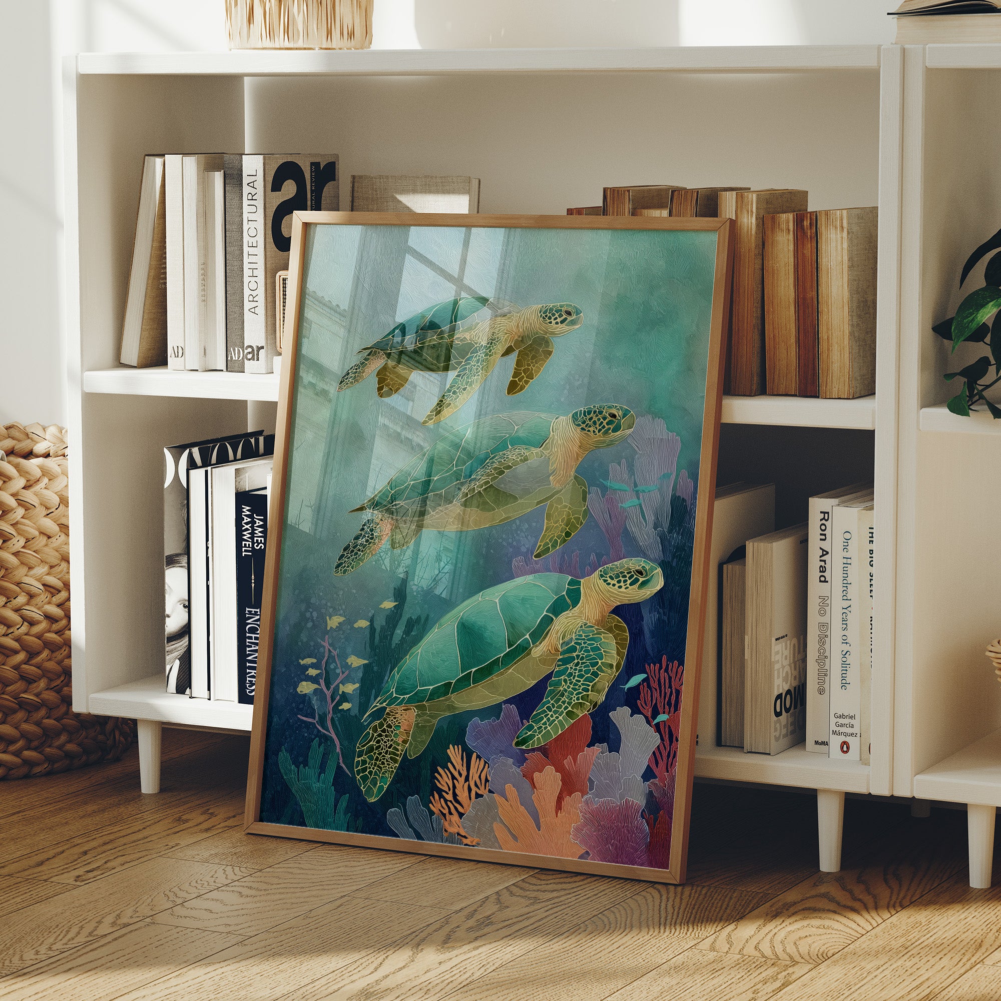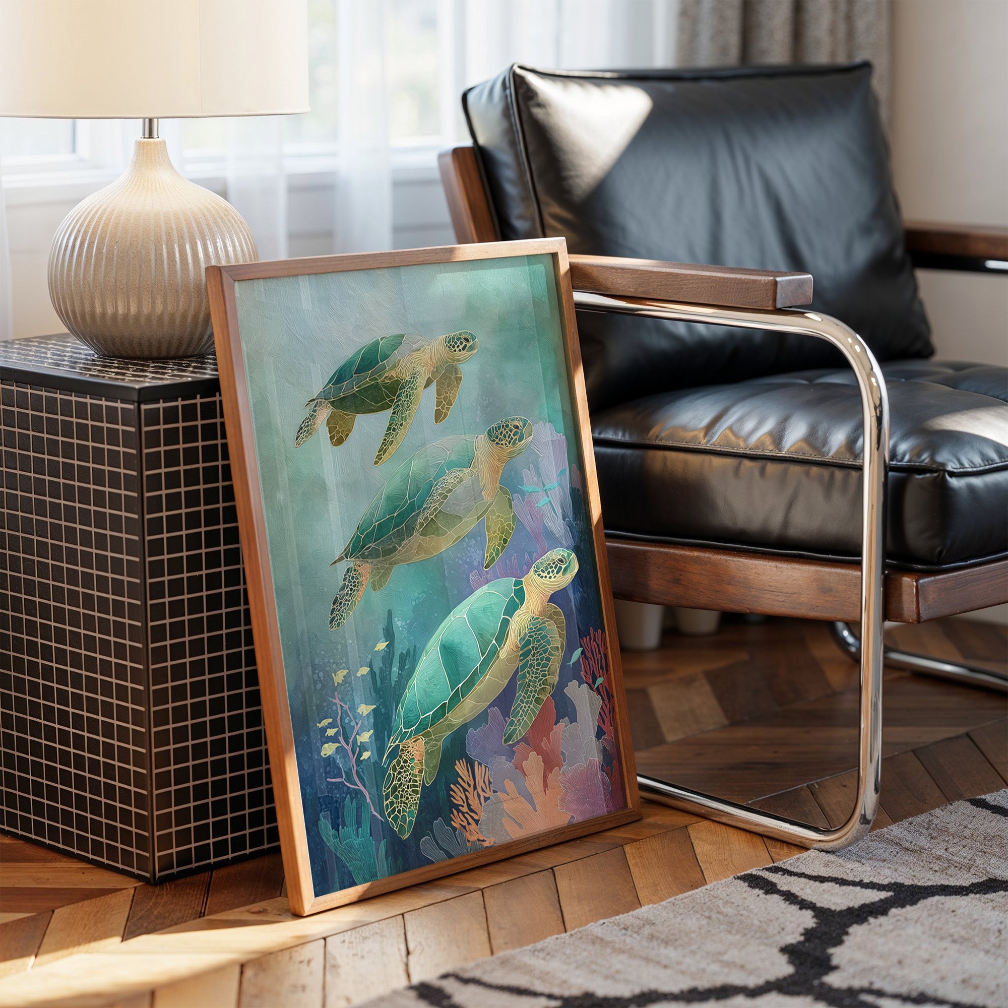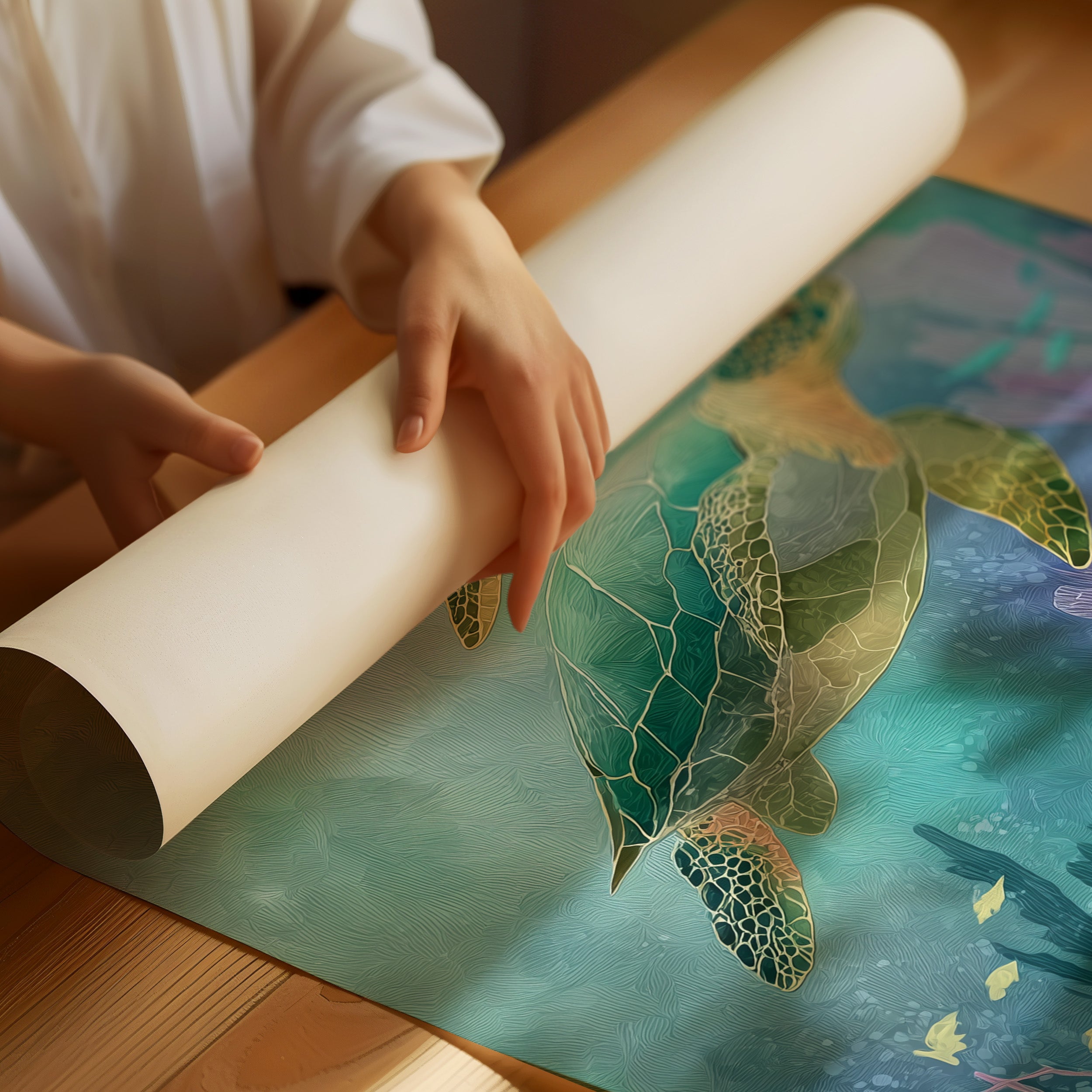 Gentle giants glide through aquamarine depths, their ancient shells catching the dappled sunlight filtering through distant waves. Three sea turtles navigate a vibrant underwater landscape, their emerald bodies contrasting with the soft coral and seafloor vegetation in muted pinks and purples. The artwork's tranquil palette creates a meditative escape, inviting the viewer to imagine the peaceful rhythm of ocean currents.
