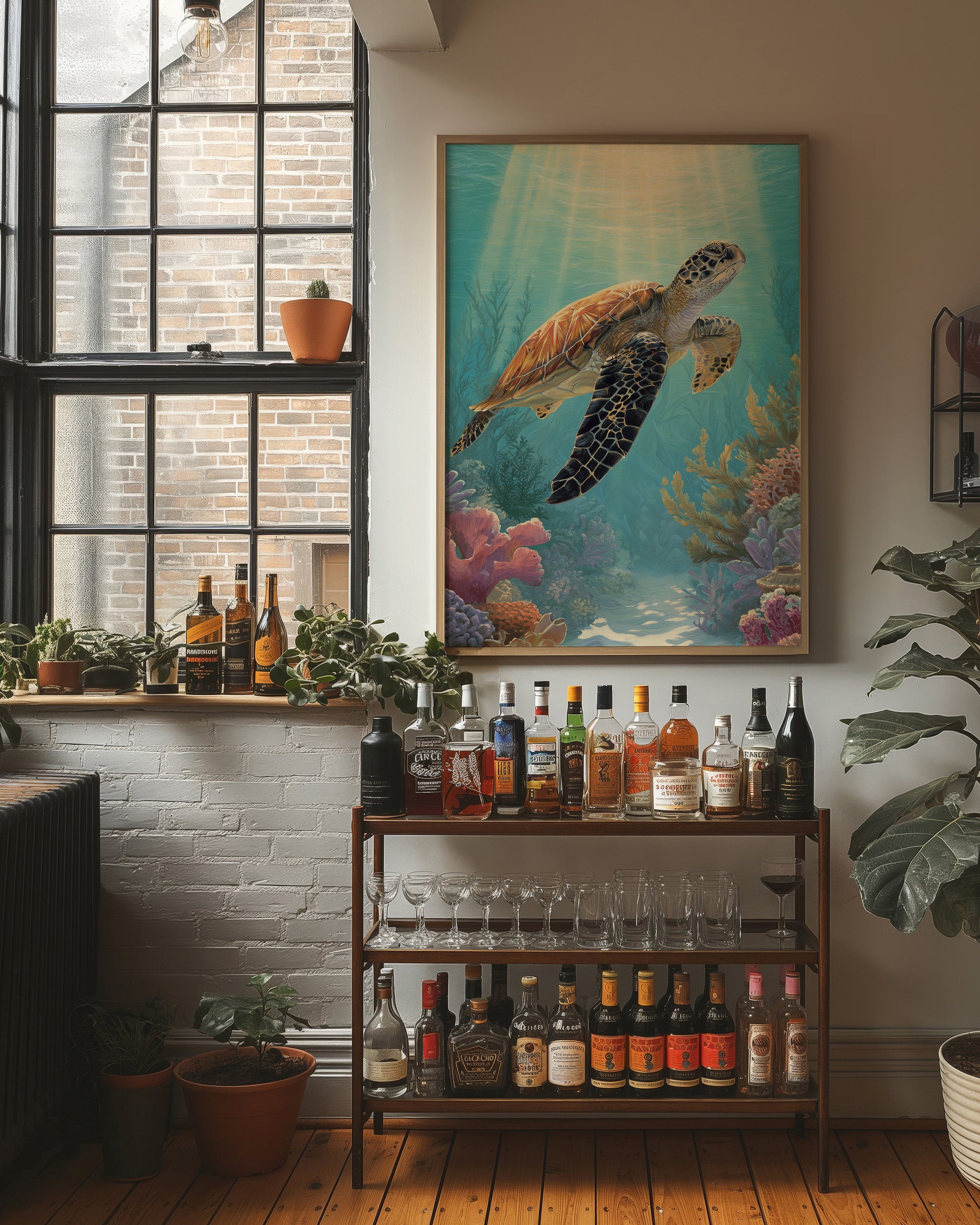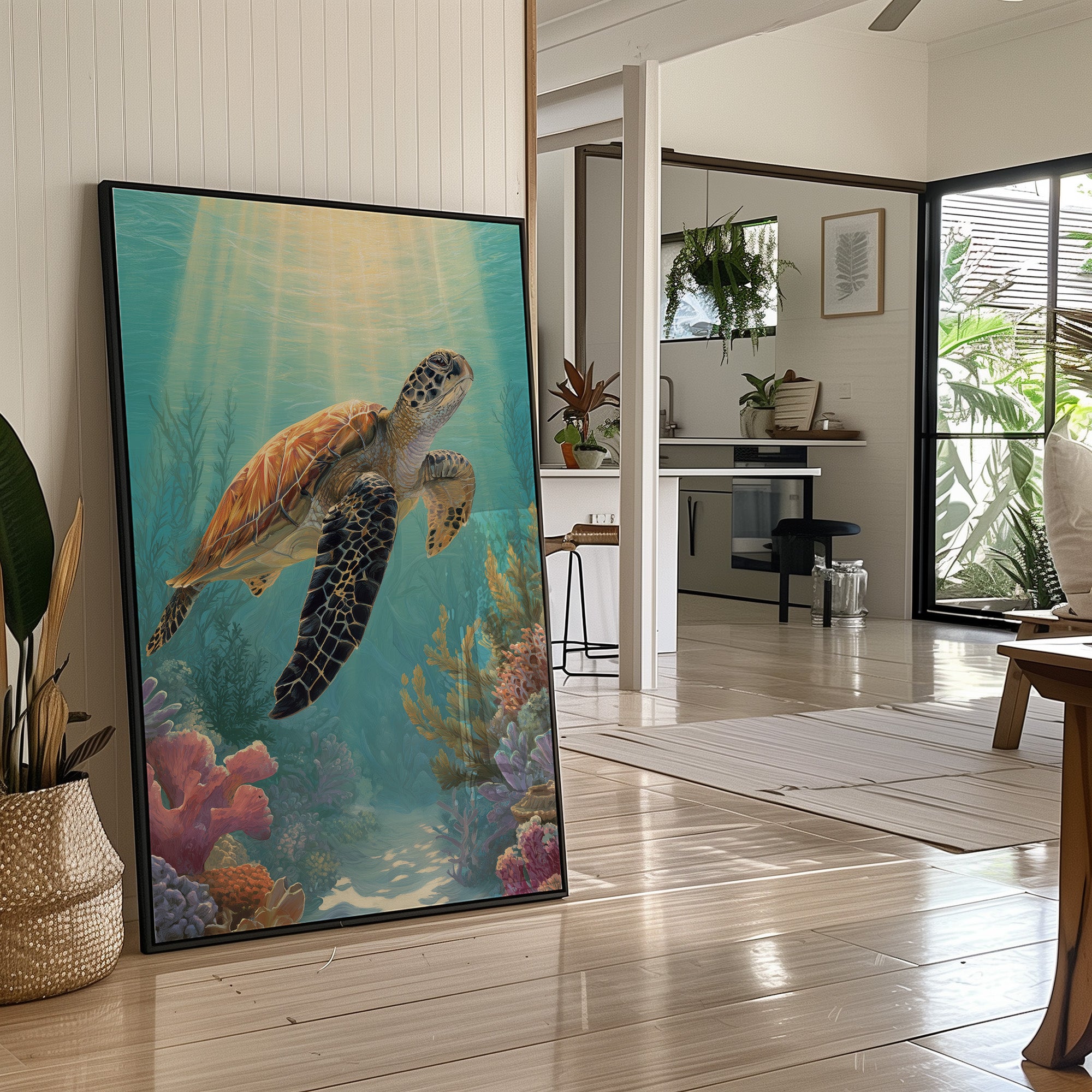 Sunlight filters through turquoise depths, illuminating the ancient wanderer as it glides effortlessly above a vibrant coral kingdom. The turtle's amber shell catches the ethereal rays, creating a warm contrast against the cool blues and pastel corals that populate this underwater sanctuary. This serene underwater portrait brings tranquility to contemporary spaces, perfect for adding a touch of oceanic calm to a living room or study where moments of peaceful reflection are cherished.