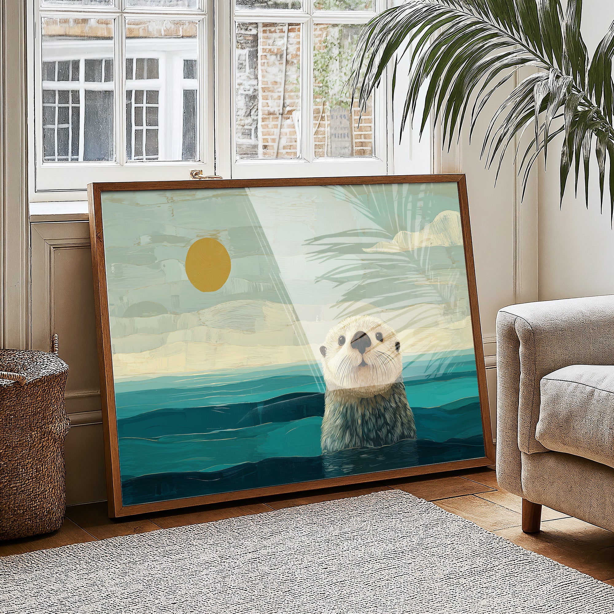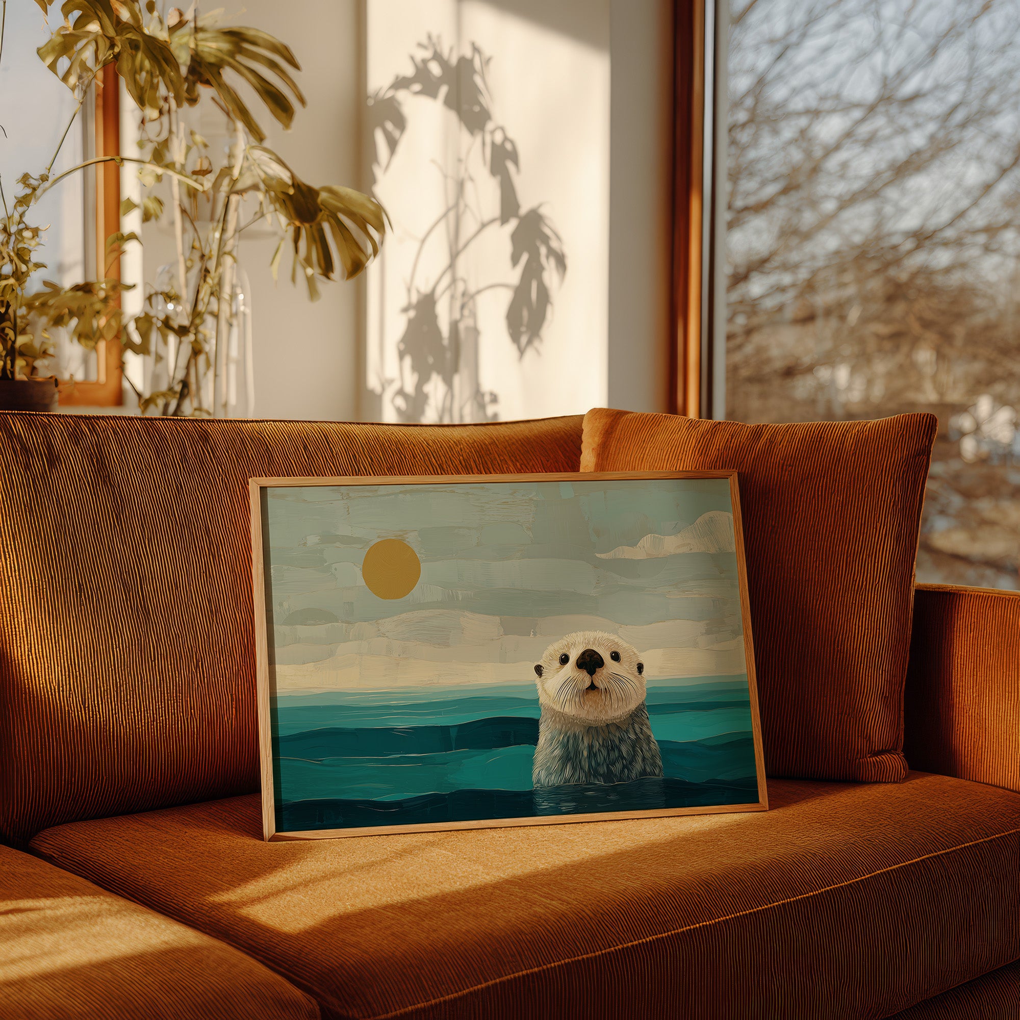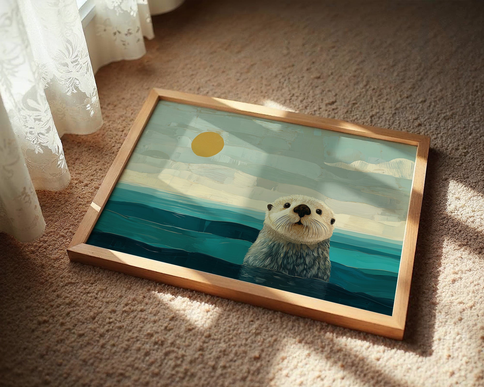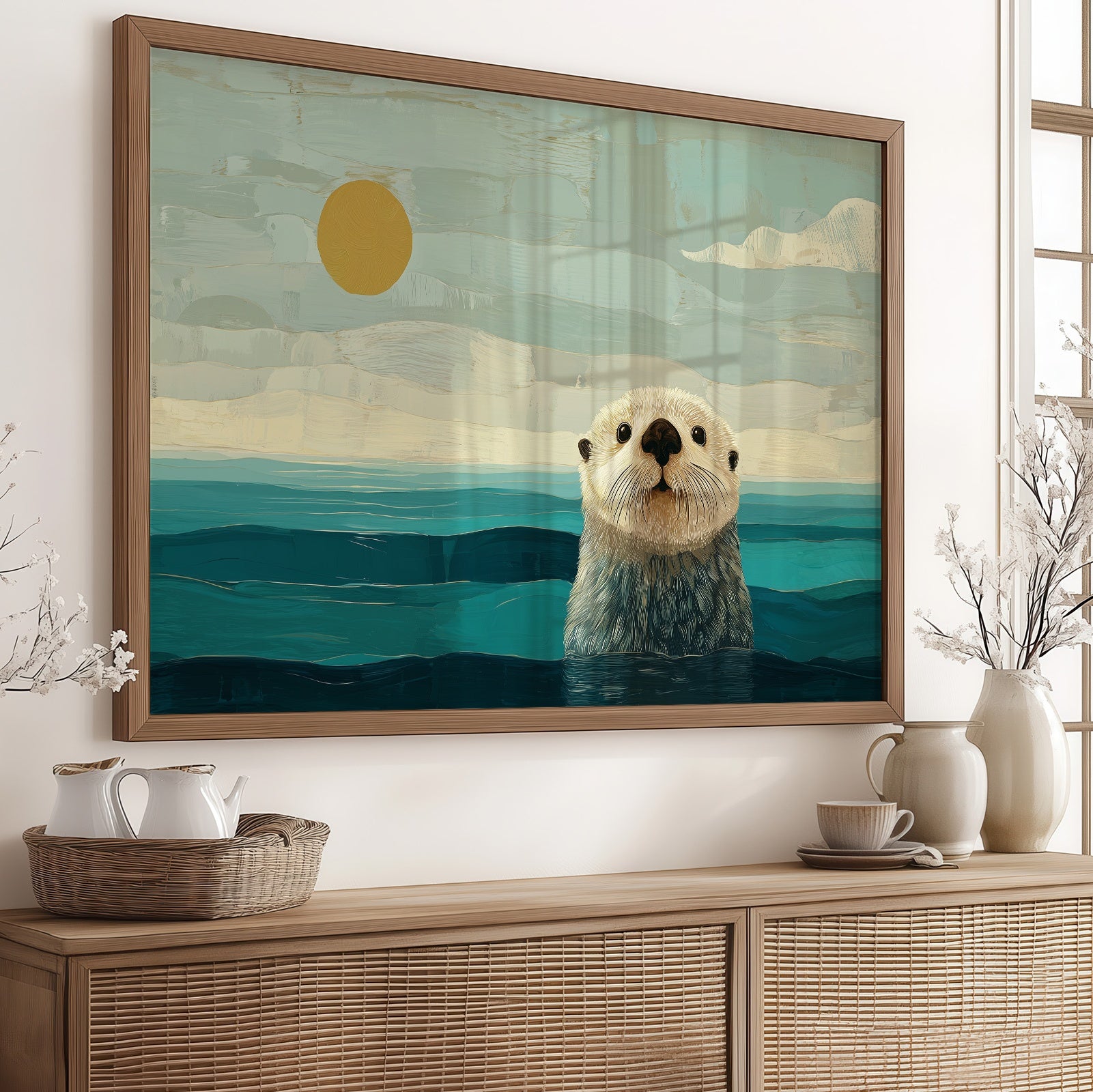 A playful sea otter peeks above turquoise waters, greeting the golden sun with innocent wonder. The brushstrokes create a dreamlike seascape where azure waves meet clouded skies, capturing that perfect moment between solitude and connection. The otter's expressive face and delicate fur details invite viewers into this tranquil coastal narrative, where nature's gentle charm takes center stage. This piece brings serene coastal energy to living rooms, nurseries, or any space needing a touch of whimsical calm.
