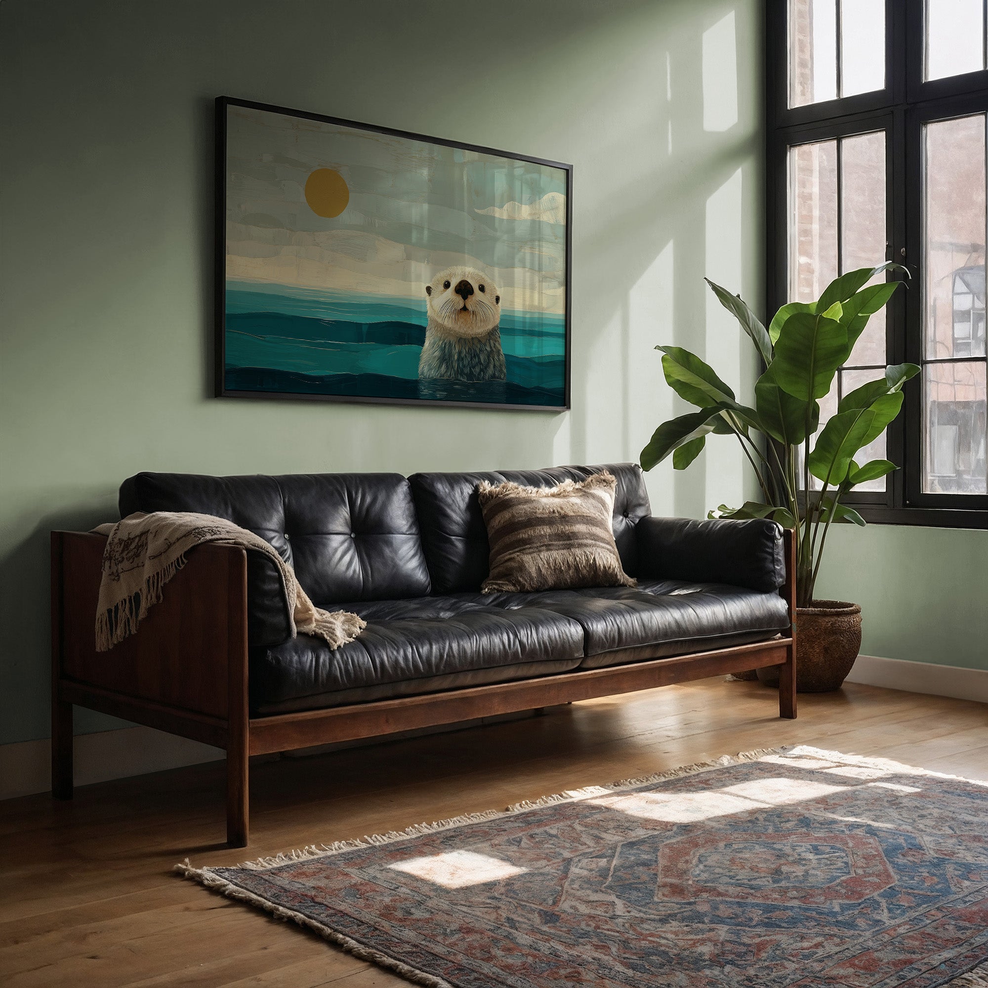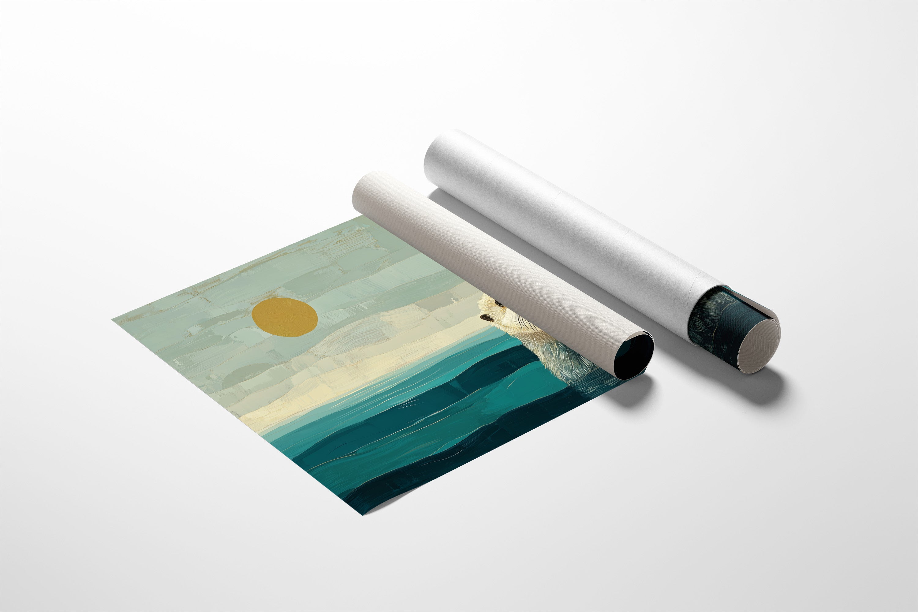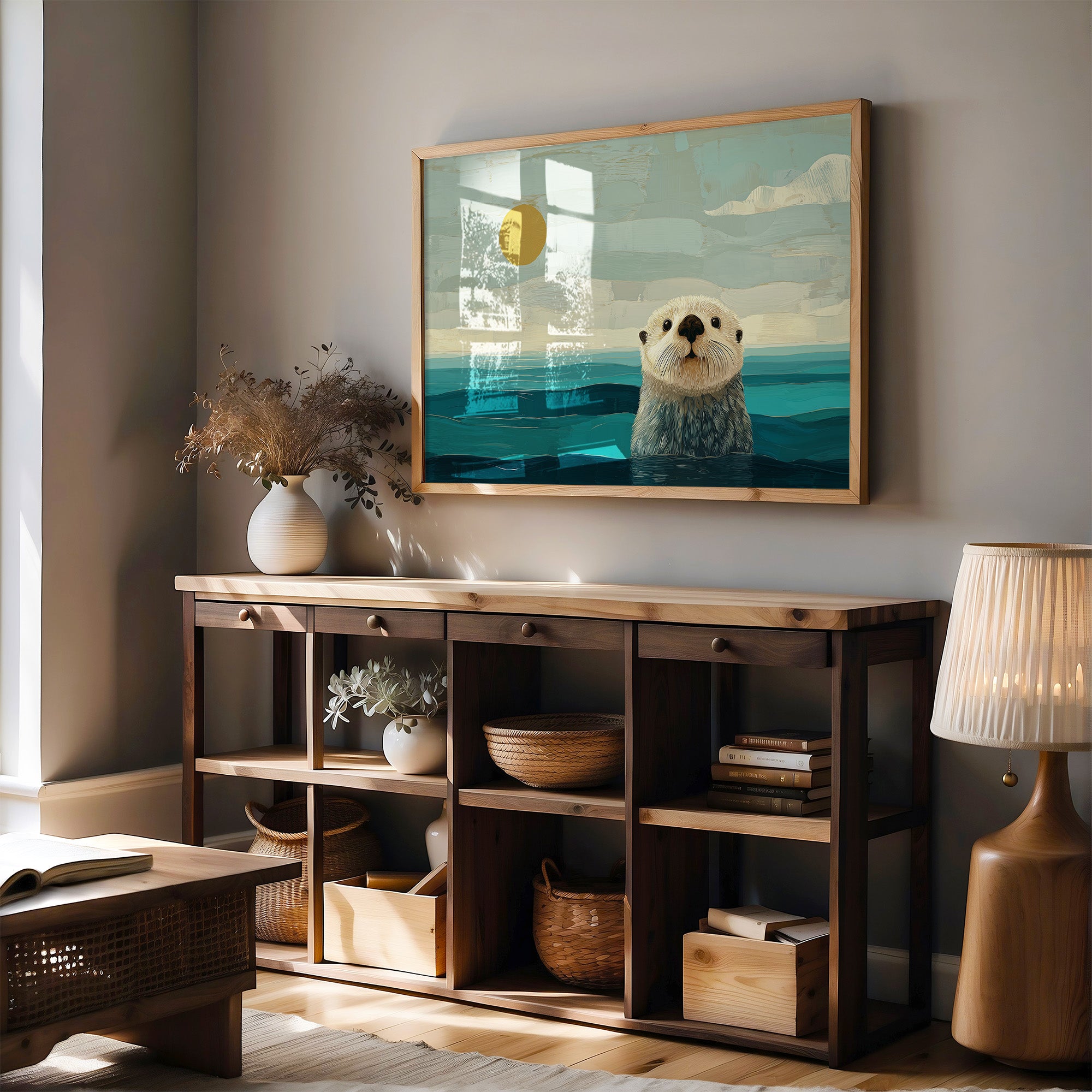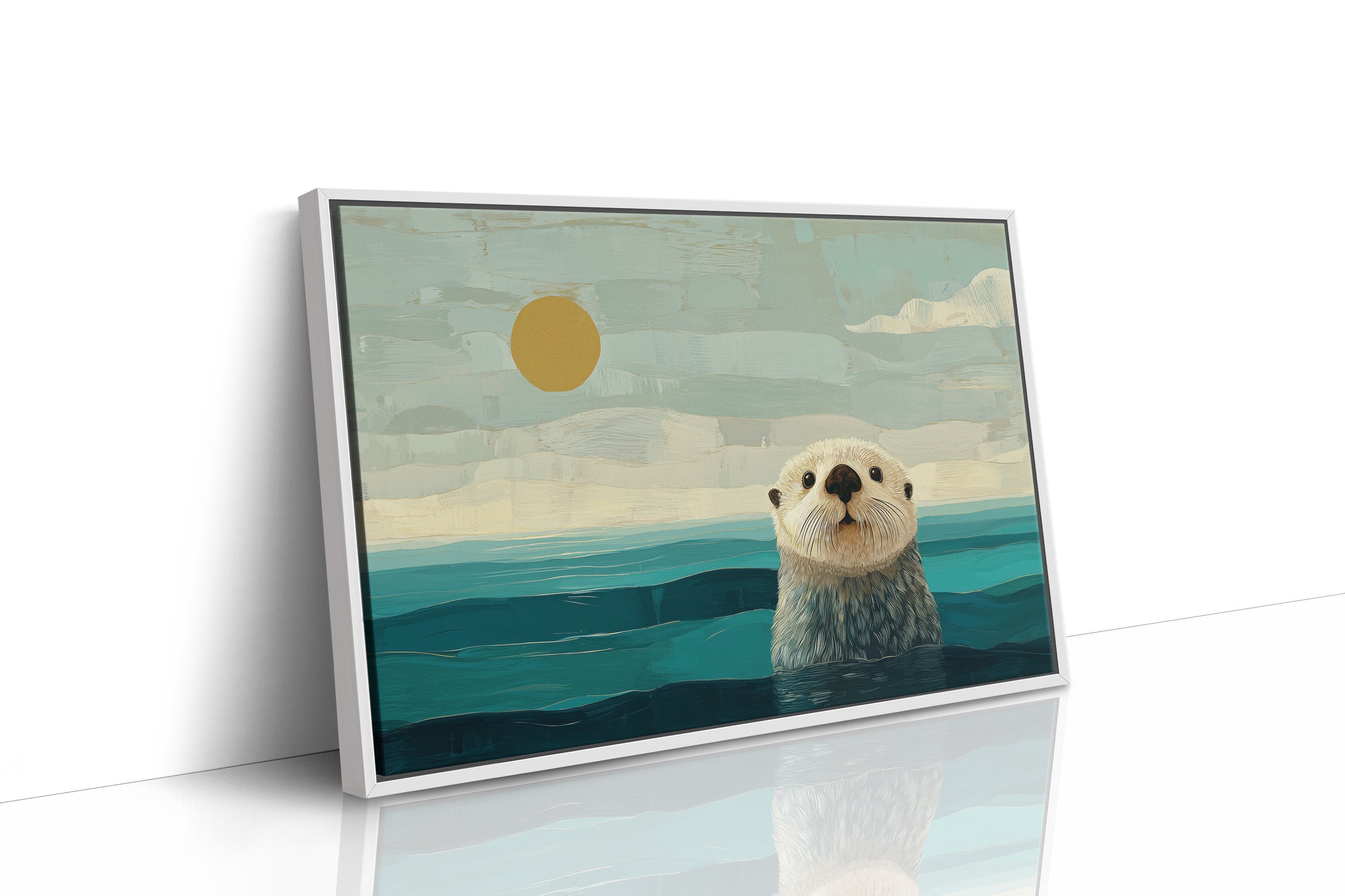 A playful sea otter peeks above turquoise waters, greeting the golden sun with innocent wonder. The brushstrokes create a dreamlike seascape where azure waves meet clouded skies, capturing that perfect moment between solitude and connection. The otter's expressive face and delicate fur details invite viewers into this tranquil coastal narrative, where nature's gentle charm takes center stage. This piece brings serene coastal energy to living rooms, nurseries, or any space needing a touch of whimsical calm.