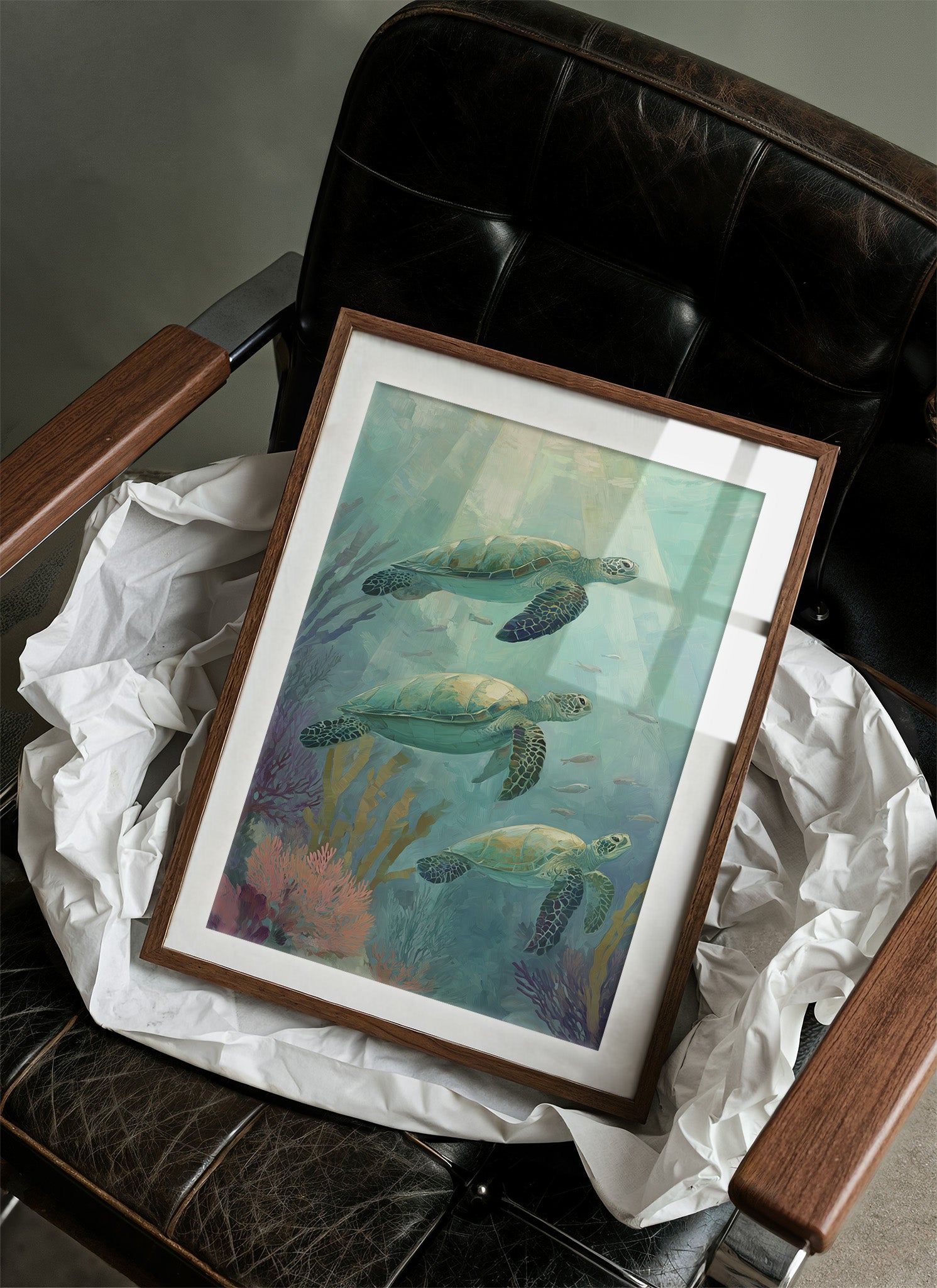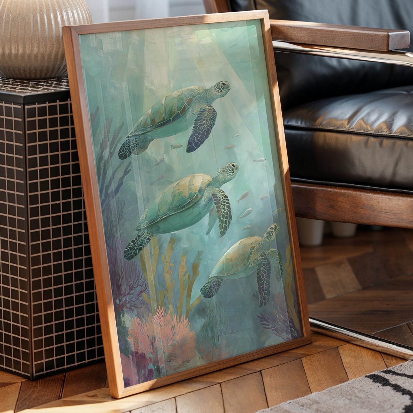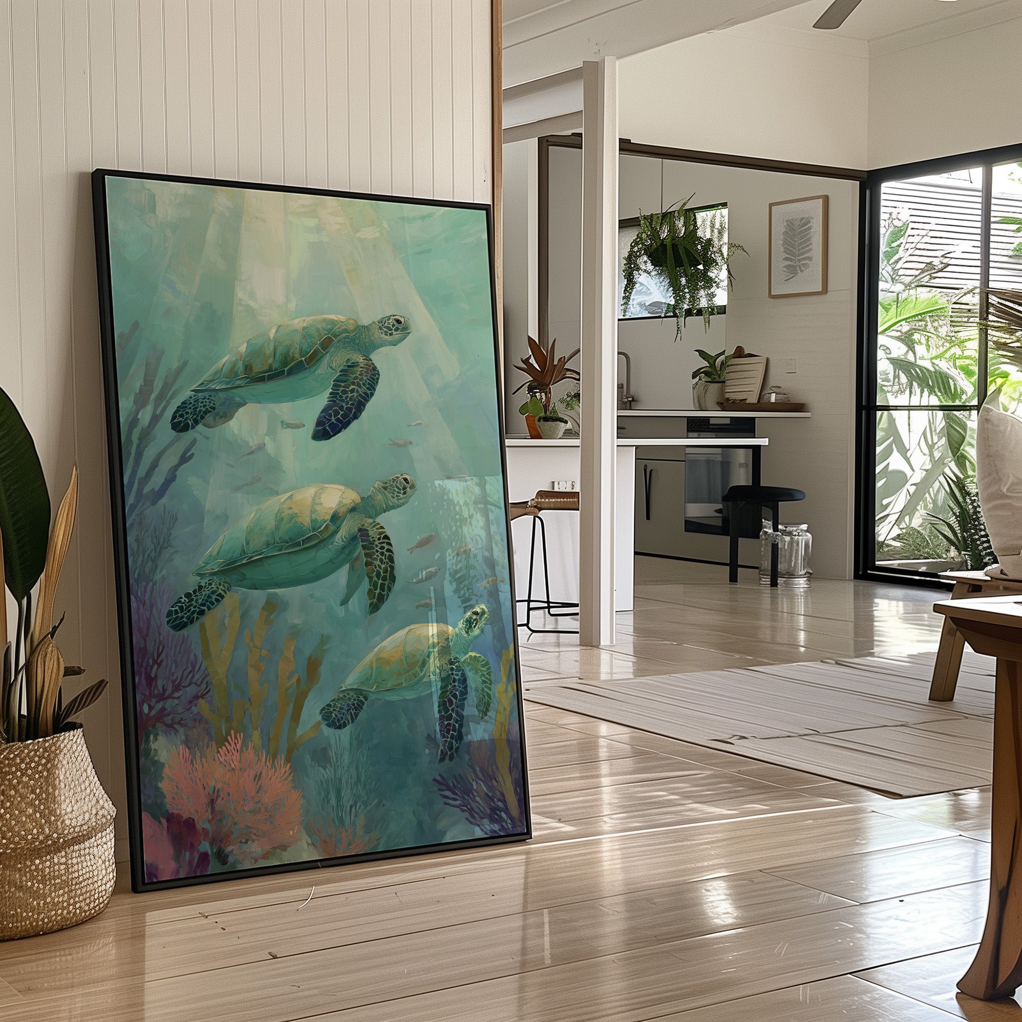 Sunlight filters through turquoise depths where graceful sea turtles glide in peaceful formation. The artwork captures the serene rhythm of marine life, with soft coral hues and golden shells contrasting against the cool aqua backdrop. Each turtle seems to tell its own story as they navigate through swaying seagrass and delicate reef structures. This tranquil oceanic scene brings coastal serenity into sophisticated living spaces.