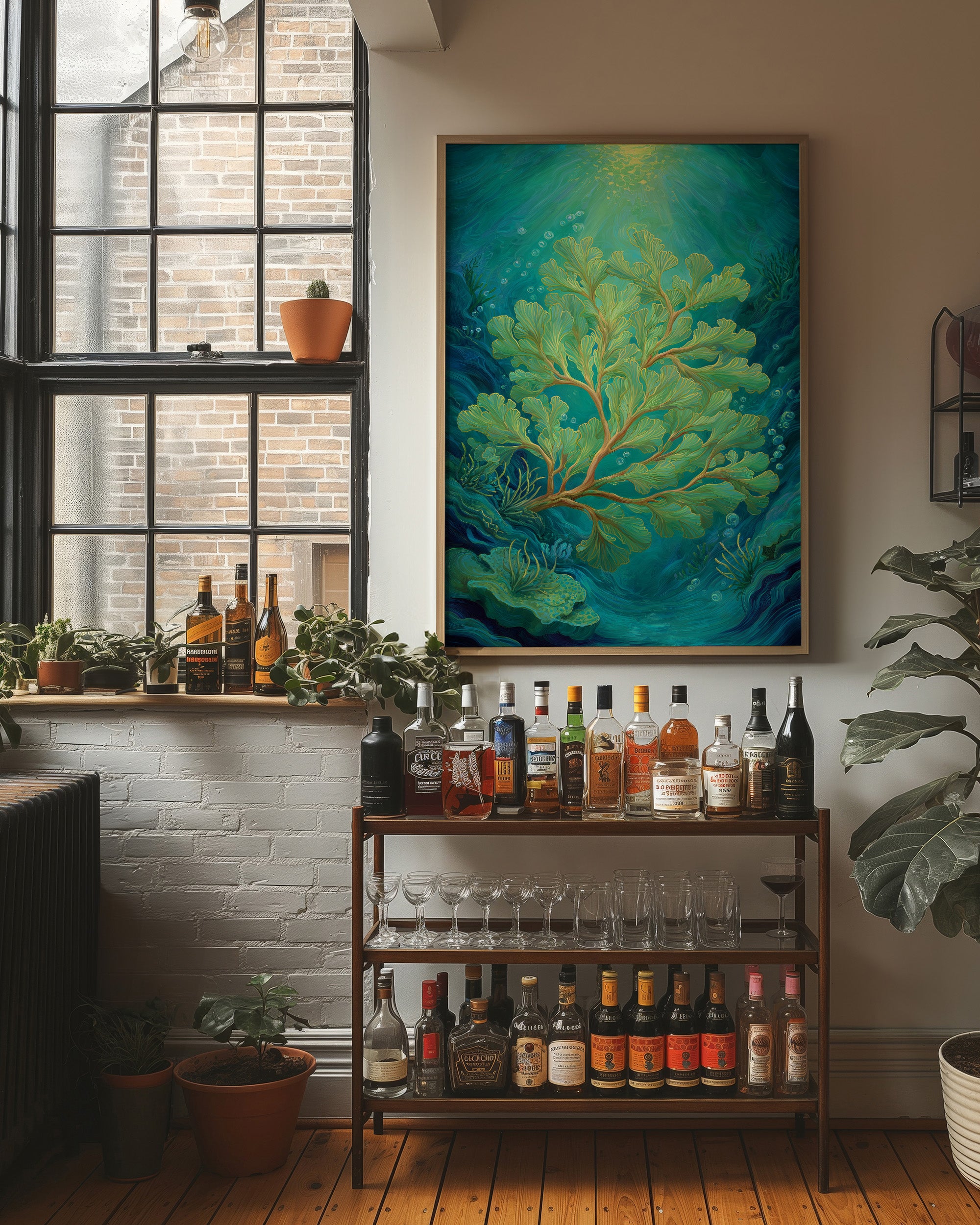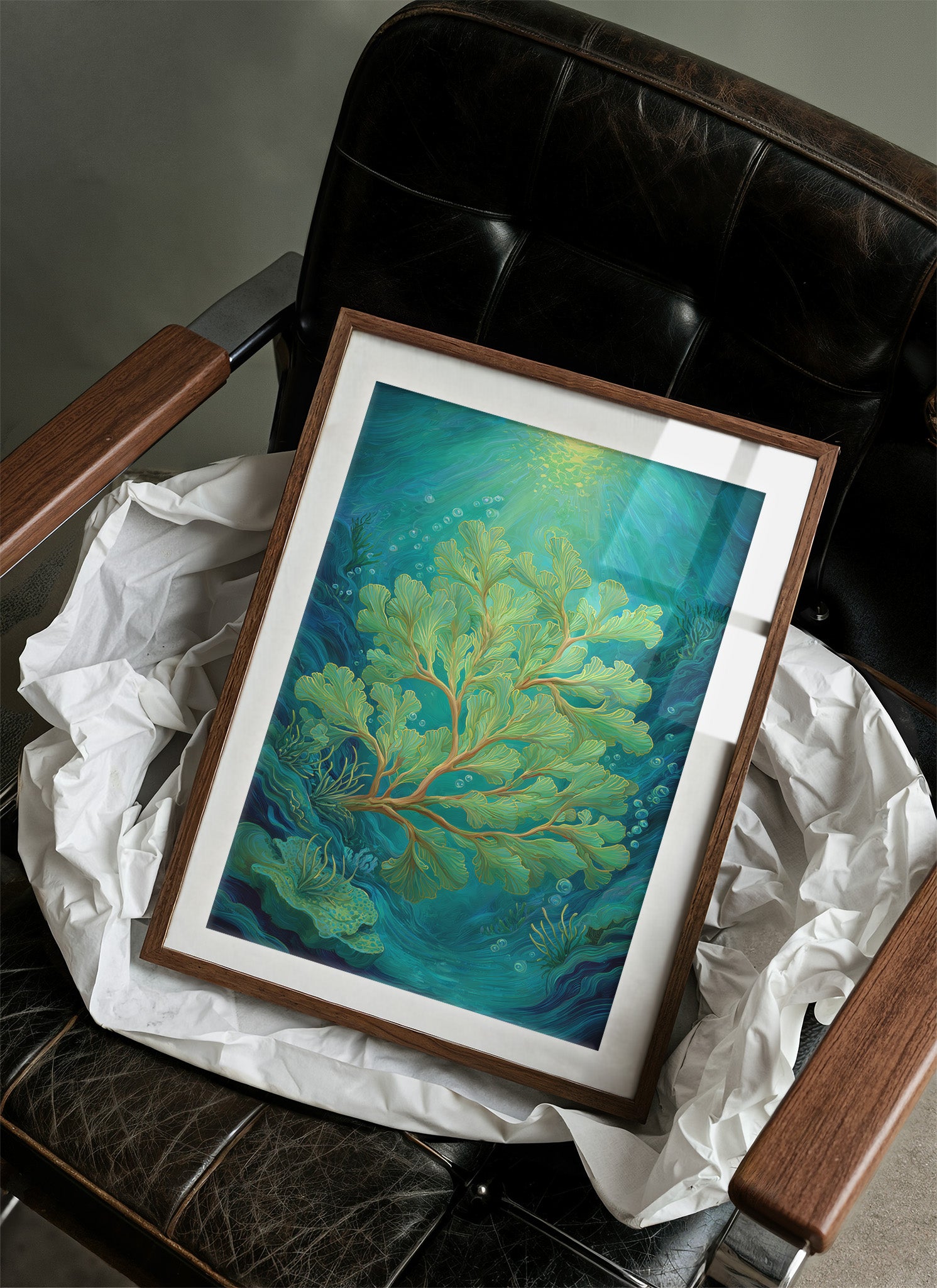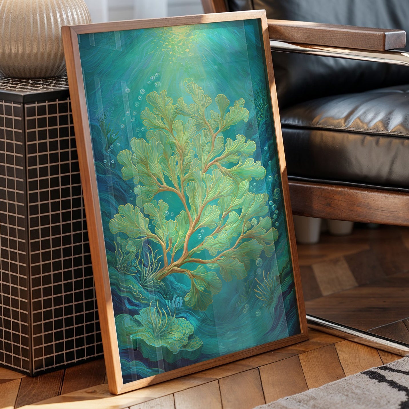 Light filters through aquamarine waters, illuminating the delicate fronds of sea flora in an ethereal underwater ballet. The mint-green coral branches reach upward through bubbles and currents, their intricate patterns creating a mesmerizing contrast against the deep teal background. This tranquil underwater scene captures the serene beauty of ocean life, where sunbeams pierce the surface to reveal nature's hidden architecture.