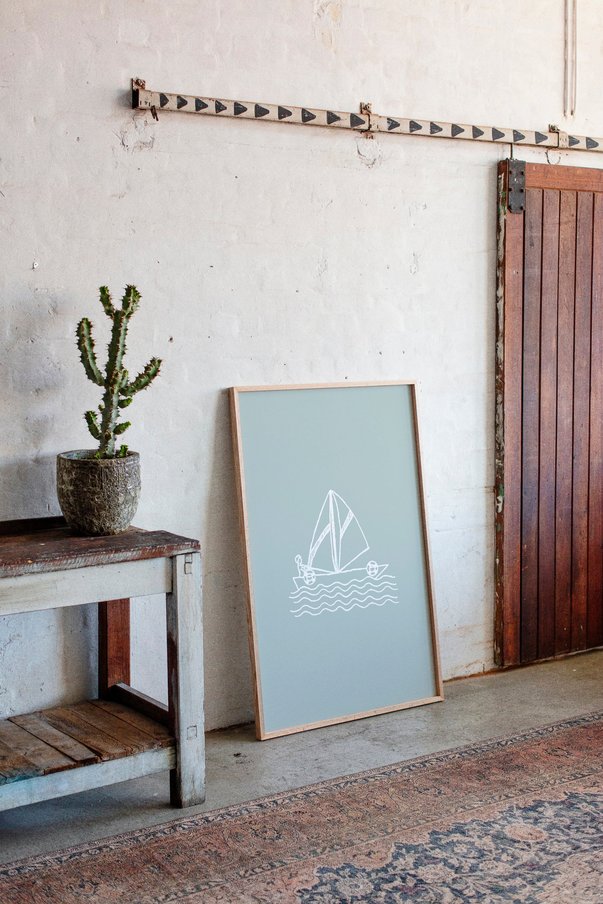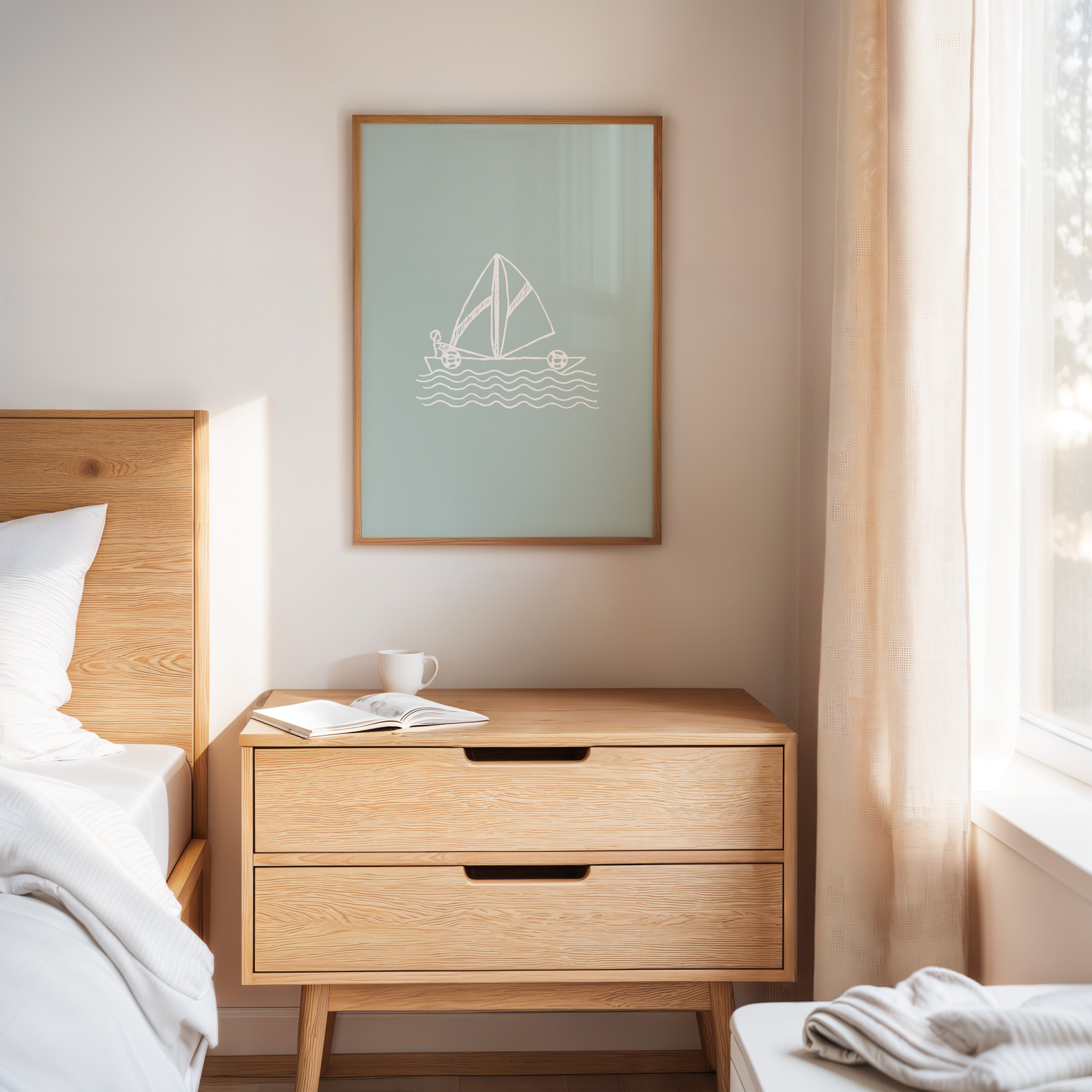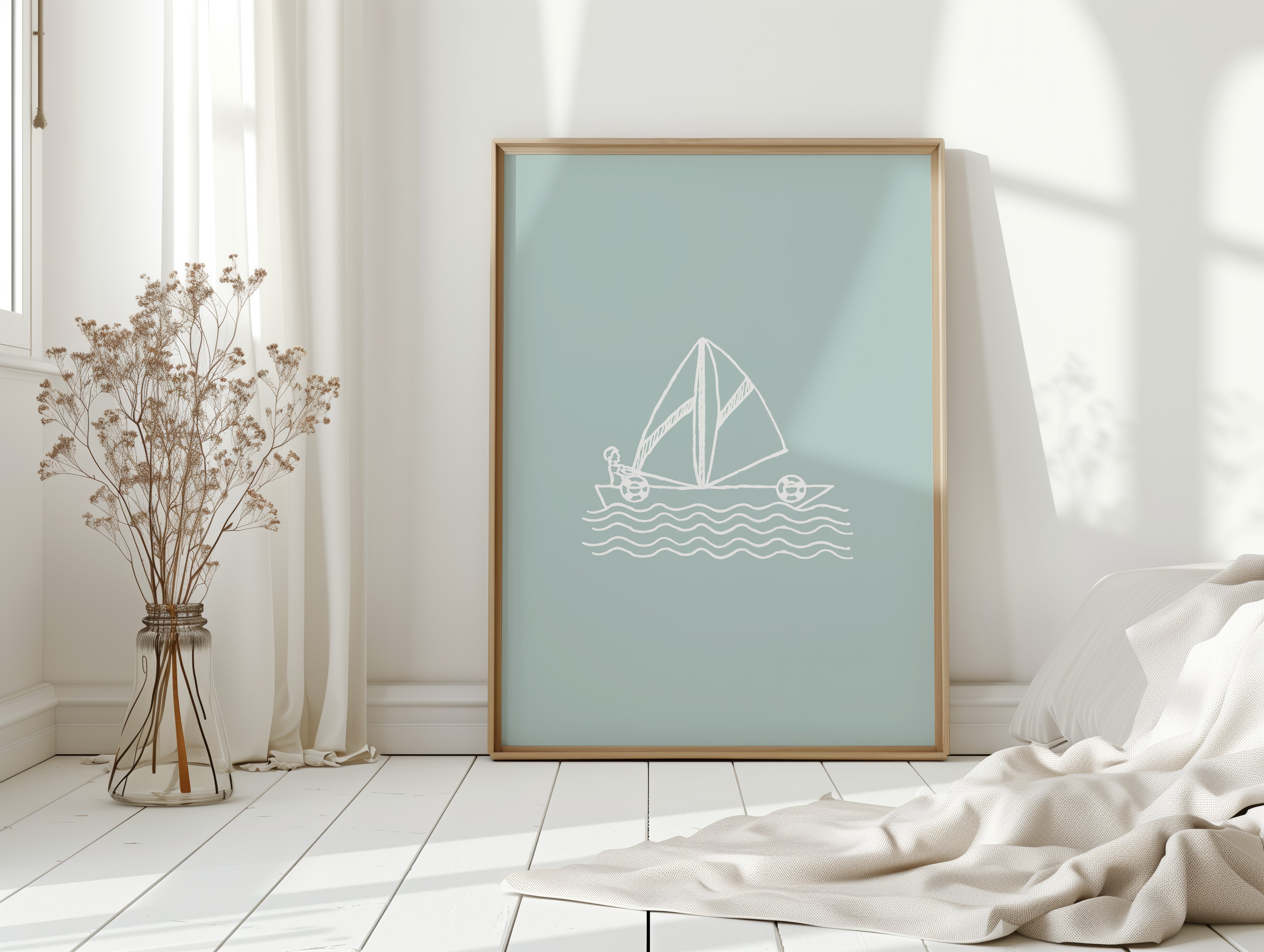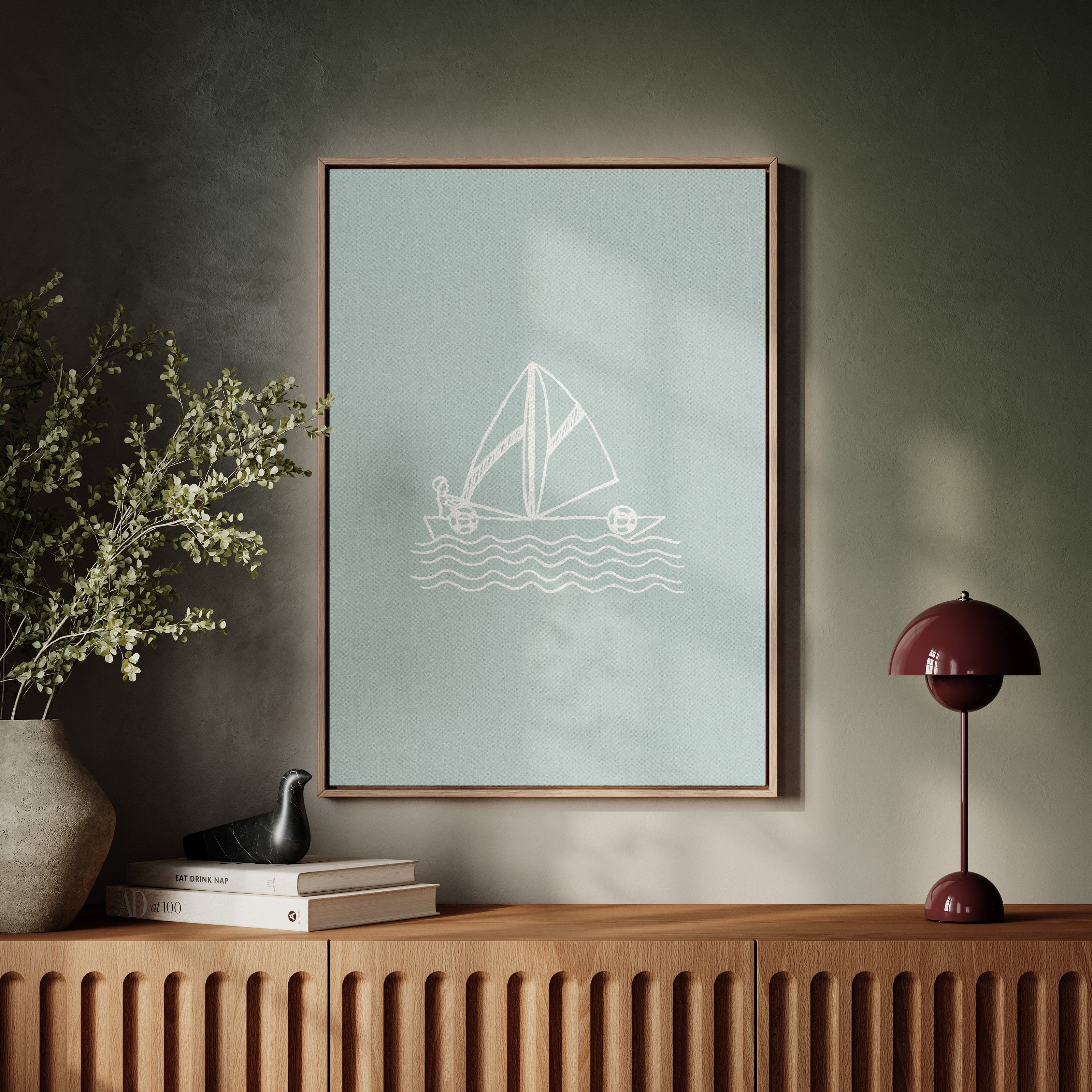 A gentle sailboat glides across waves rendered in minimalist white strokes, carrying stories of maritime serenity. This piece from our Contemporary collection captures modern simplicity through clean, purposeful lines. The sailing vessel's crisp geometry contrasts beautifully with the organic rhythm of waves below, while the seafoam backdrop creates a sense of infinite horizon and possibility. The composition invites viewers to imagine their own nautical journey, where adventure meets tranquility. Perfect for bringing a touch of coastal calm to a modern living room or office space, where its soothing palette can create a mindful moment in daily life.