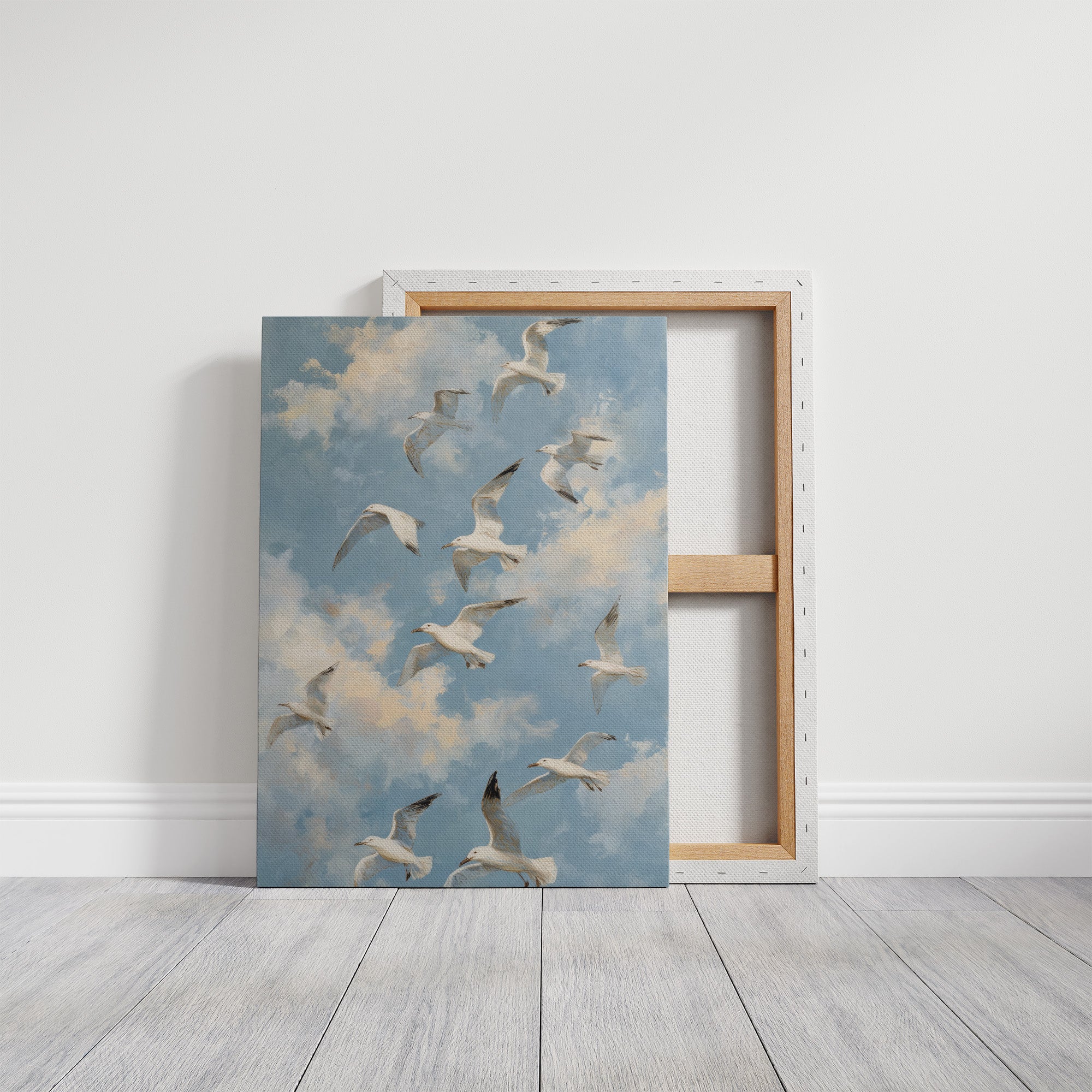 The artwork depicts a flock of white seagulls in flight against a serene blue sky dotted with soft, cream-colored clouds. The birds are captured in various graceful poses as they soar through the atmosphere, creating a sense of movement and liberation. The painting's textured surface is visible, resting on light gray wooden floorboards, suggesting either a work in progress or an artistic display choice that reveals the structural elements of canvas art.