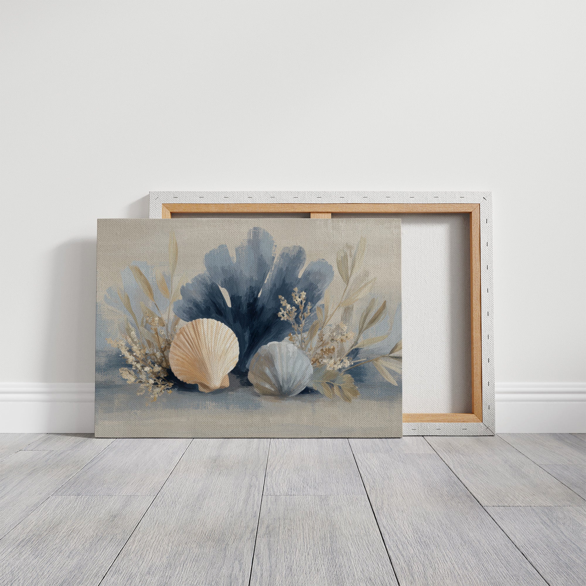 Morning light catches the delicate ridges of ivory shells nestled against a backdrop of serene blue hues. The composition balances the crisp white of scallop shells with soft navy coral forms and whispers of golden grasses, creating a moment of coastal tranquility frozen in time. The watercolor-like brushstrokes invite memories of afternoons spent collecting treasures along forgotten shorelines, each shell holding its own silent story of tides and time.