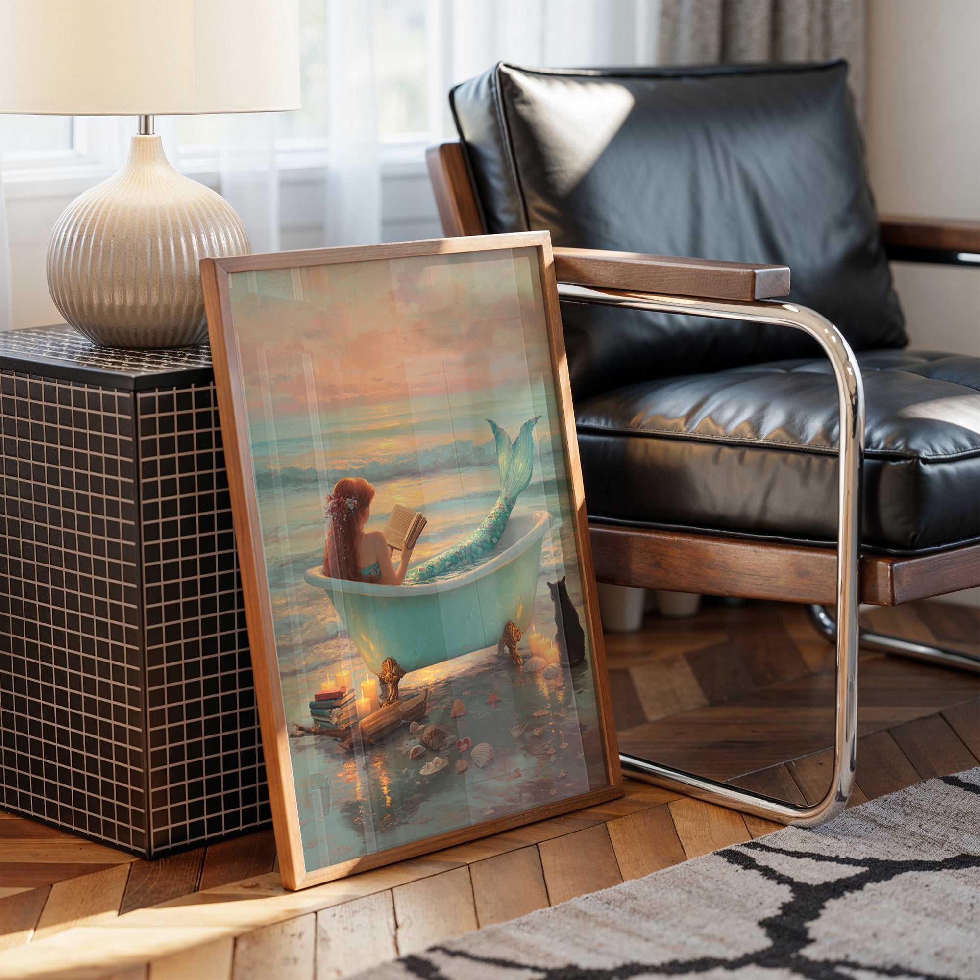 A whimsical canvas featuring a vintage bathtub perched at the ocean's edge during sunset. The teal bathtub contains a figure with a turquoise tail reading a book, suggesting a magical realm where fantasy meets literature. Warm coral skies reflect on gentle waves, while a black cat sits faithfully beside the tub. Surrounding the scene are scattered seashells, stacked books, and glowing candles creating an intimate reading sanctuary where imagination flows freely between worlds.