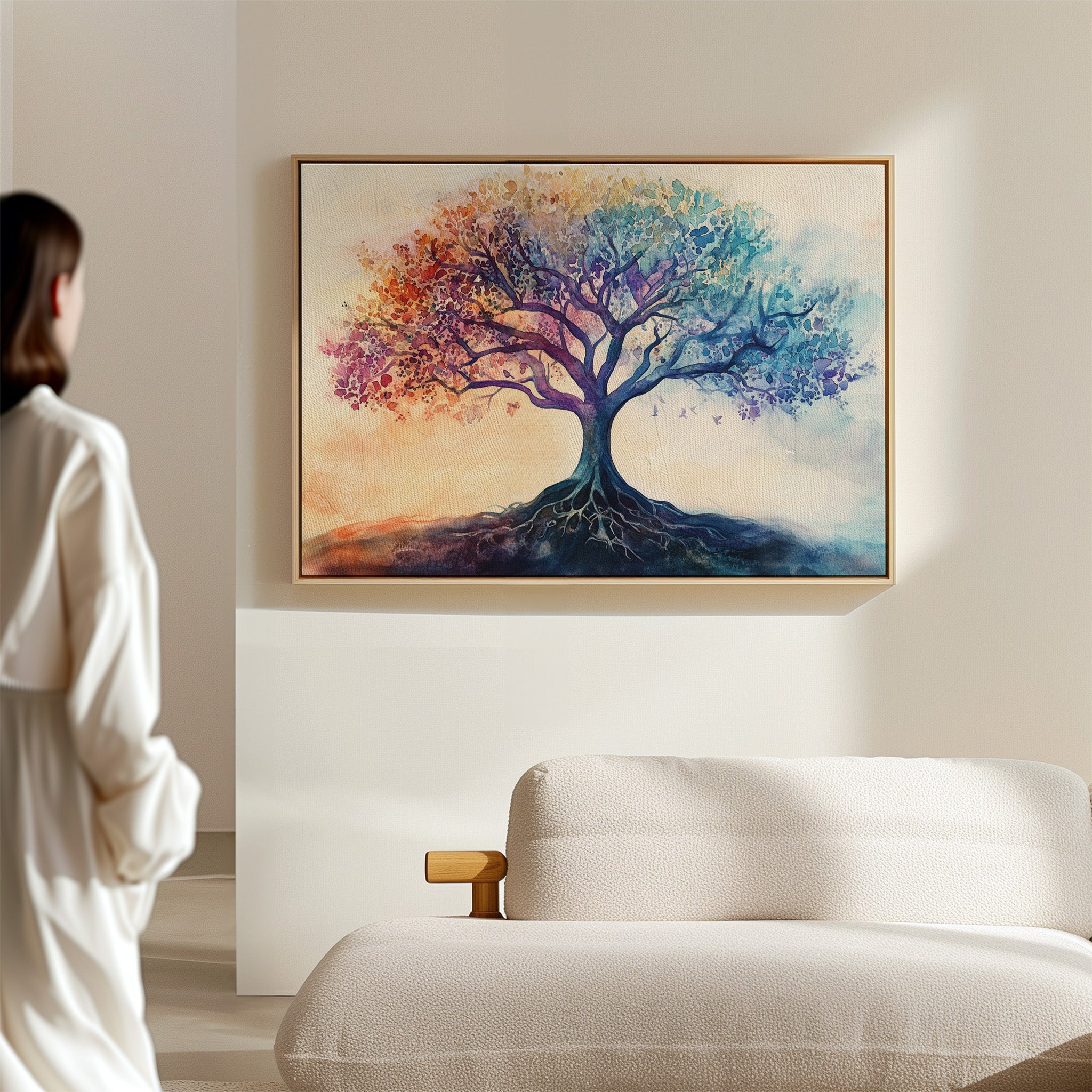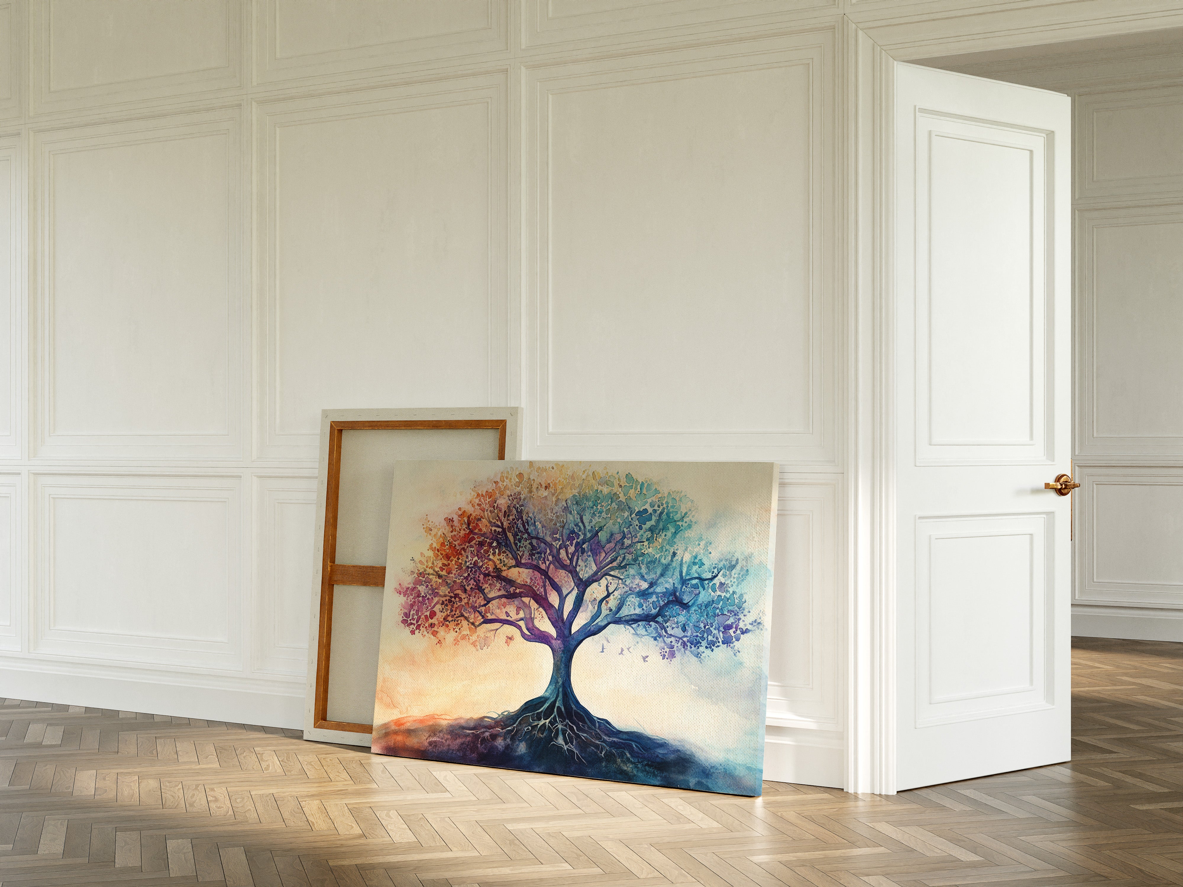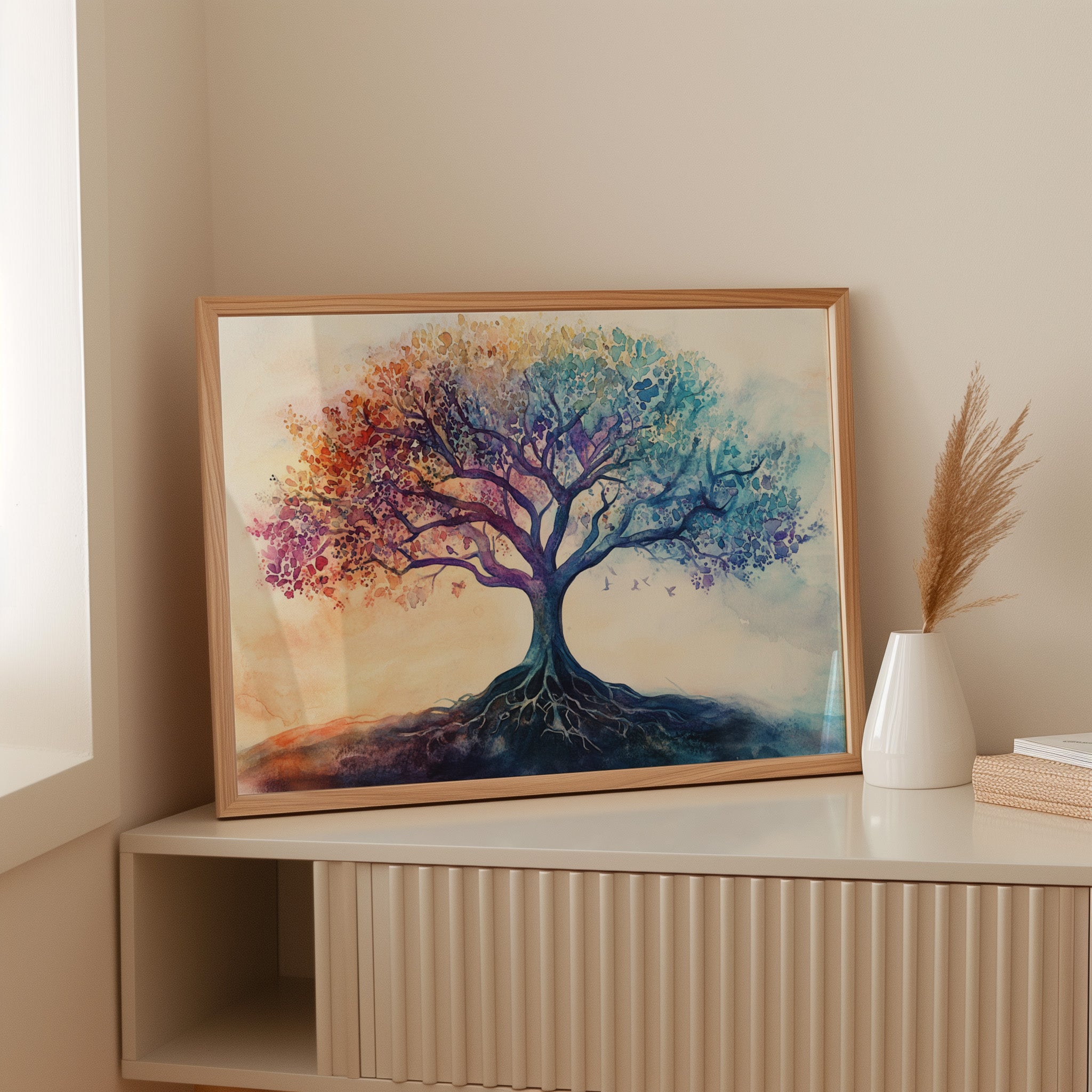 A majestic tree stands as nature's color wheel, its canopy splitting between warm autumn amber and cool summer azure. Delicate watercolors blend and flow through the branches, creating a harmonious transition from dawn to dusk within its leaves. The deep purple trunk anchors the composition while twisted roots grip the mystical earth below, suggesting both strength and fluidity. Small birds take flight from the blue side, carrying stories between realms of warm and cool. This piece would bring a sense of balance and natural wonder to a meditation room or reading nook, where its calming presence can inspire moments of reflection.