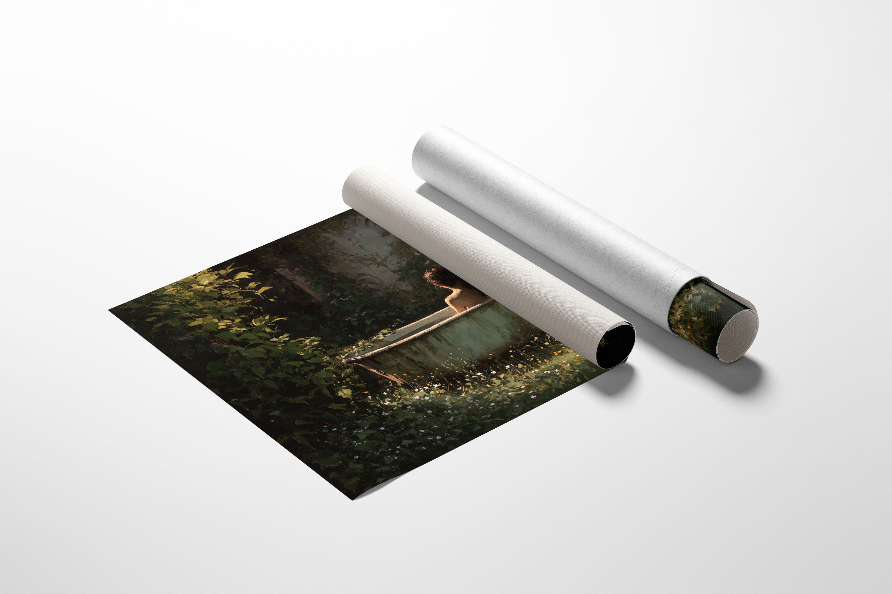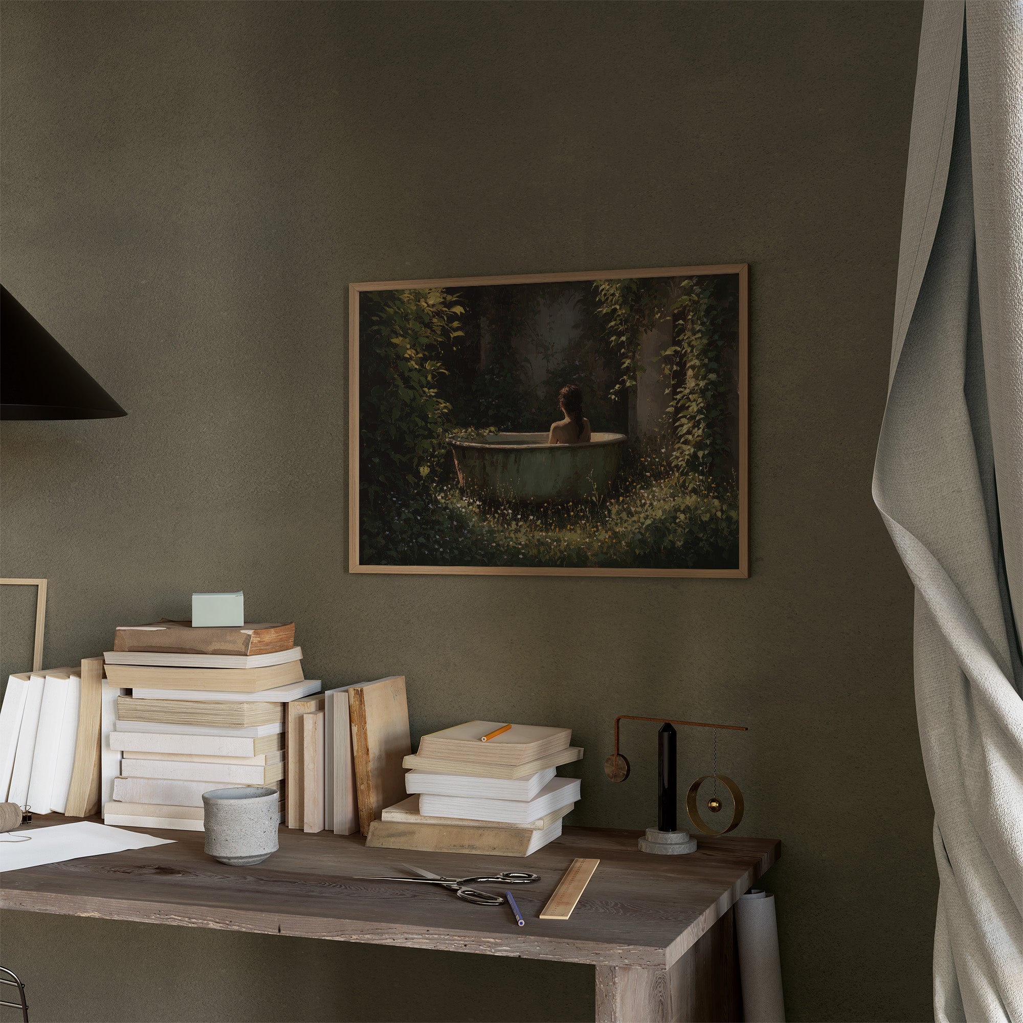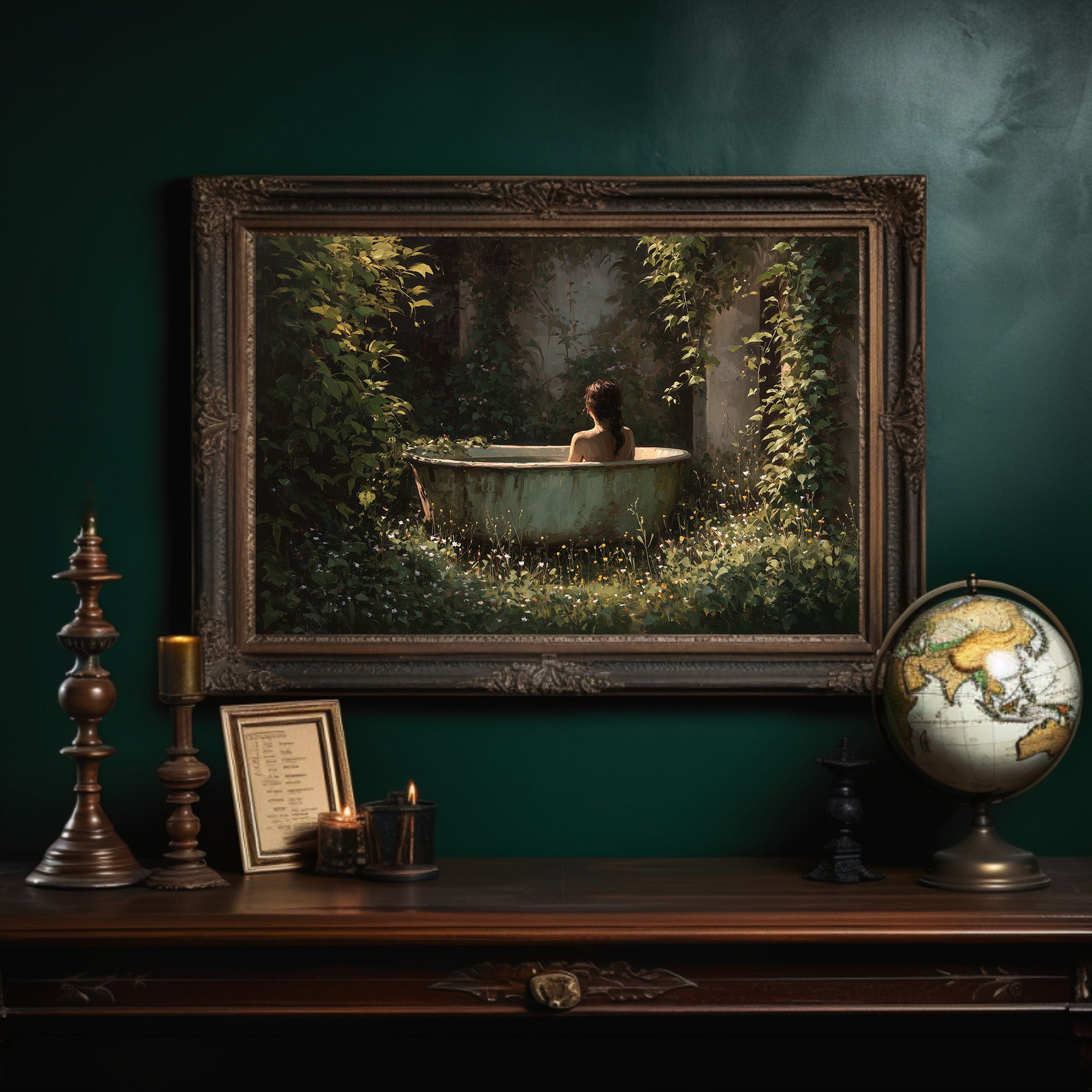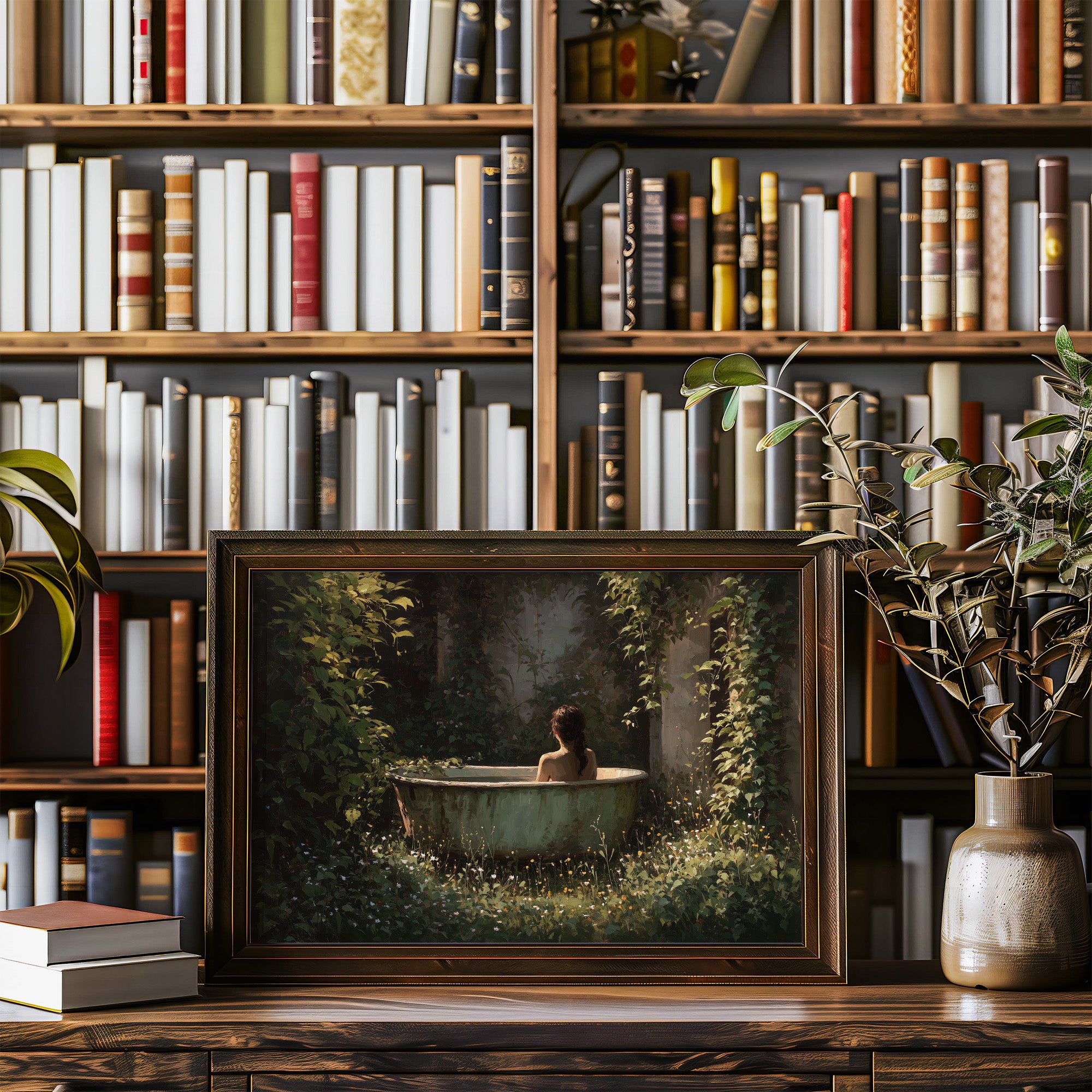 Sunlight filters through dense foliage, casting dappled patterns on a vintage clawfoot tub nestled in a forgotten corner of nature. The painting captures that rare moment of perfect solitude, where time seems suspended between heartbeats. Rich emerald greens contrast with golden wildflowers that dance around the bath, creating a sanctuary both wild and intimate. The scene rests against a backdrop of countless books, the painting itself becoming a portal to escape the everyday world. This contemplative piece brings a touch of romantic solitude to a study, reading nook, or any space where you seek quiet reflection.