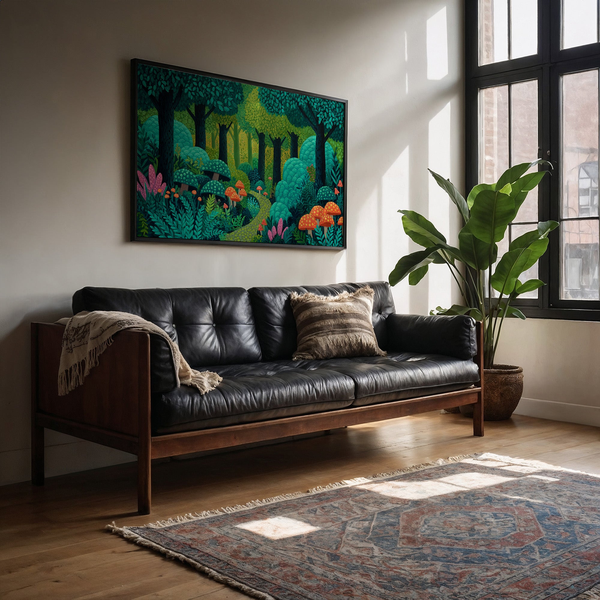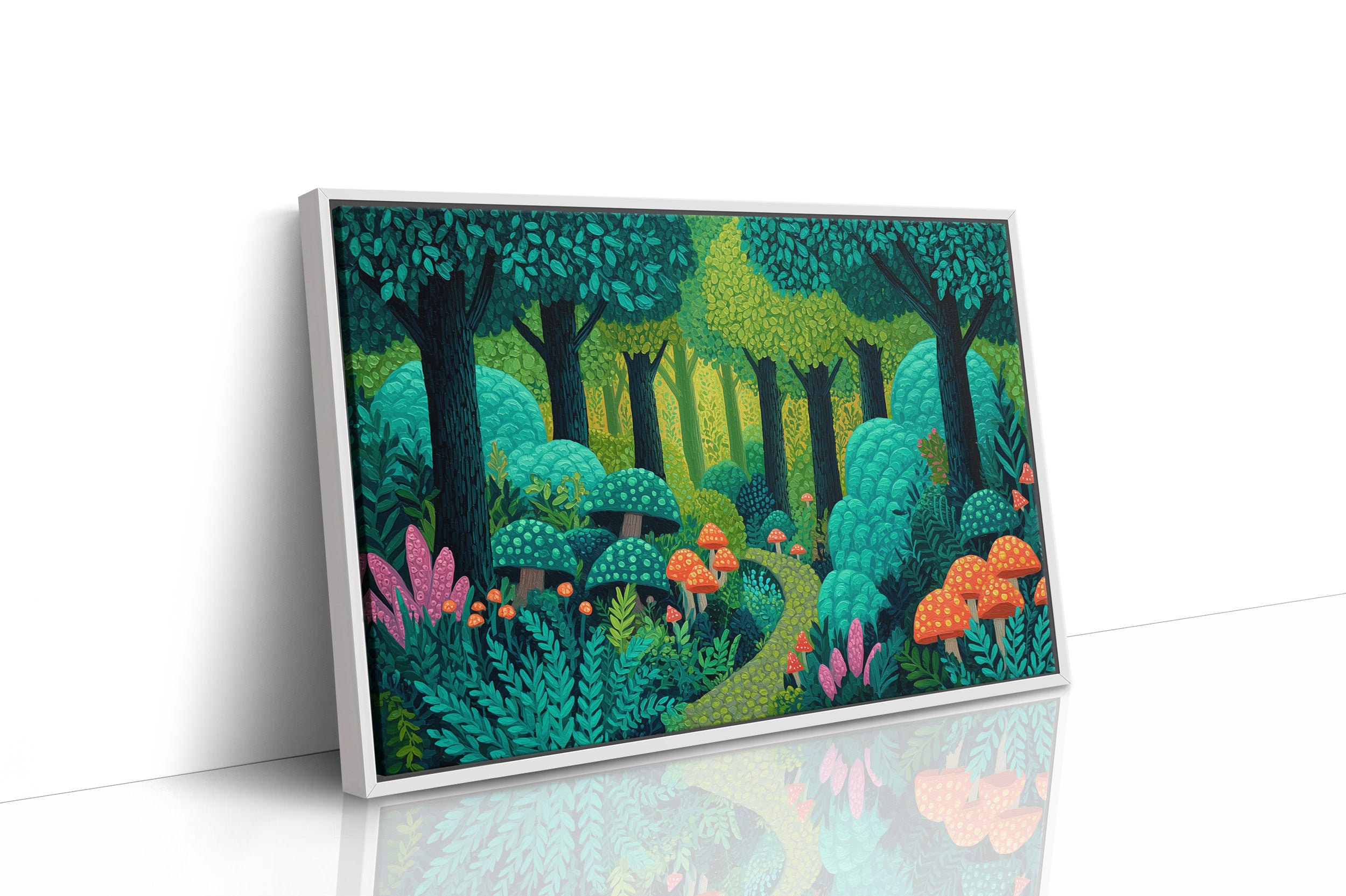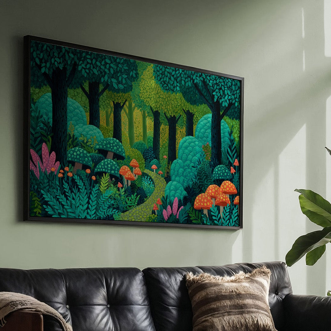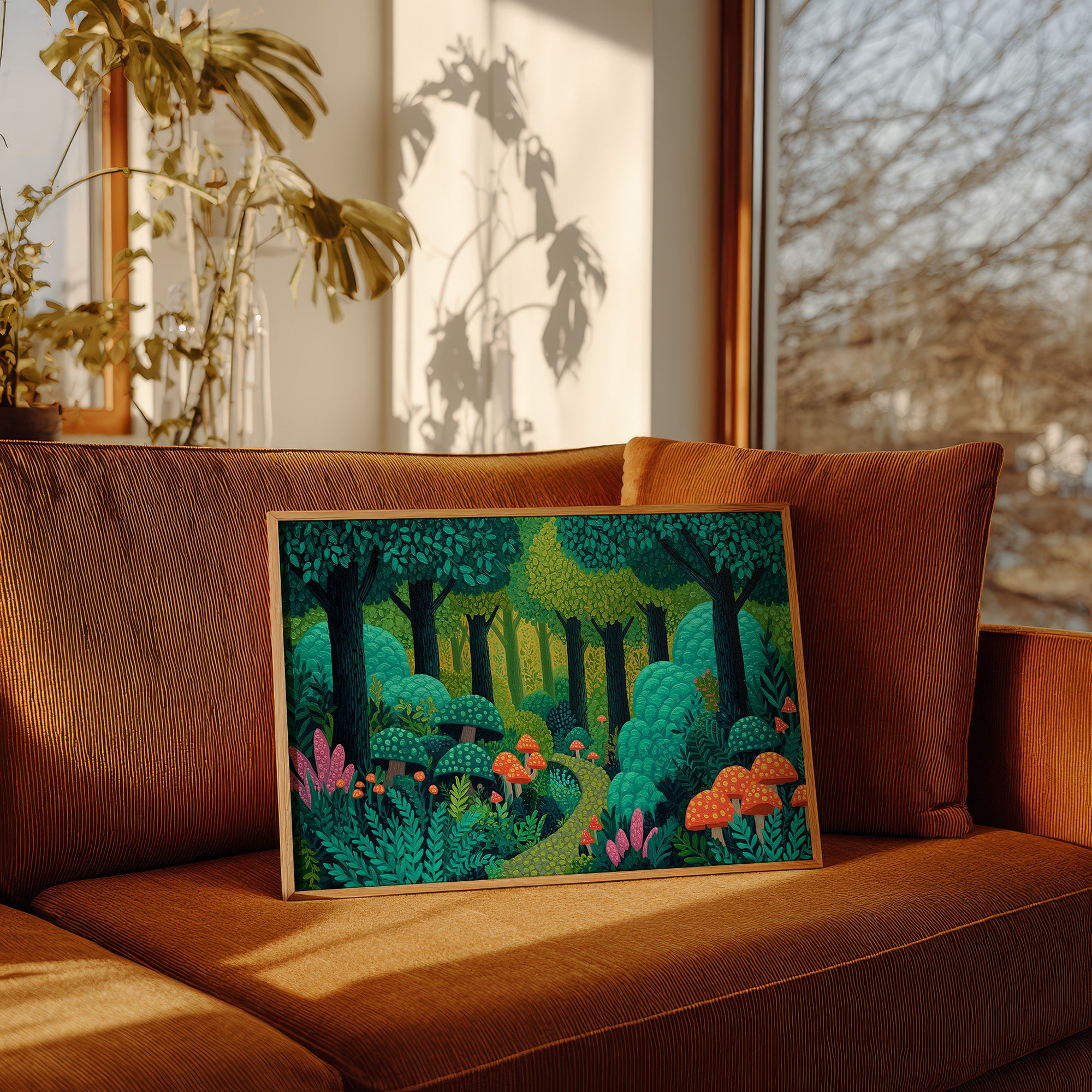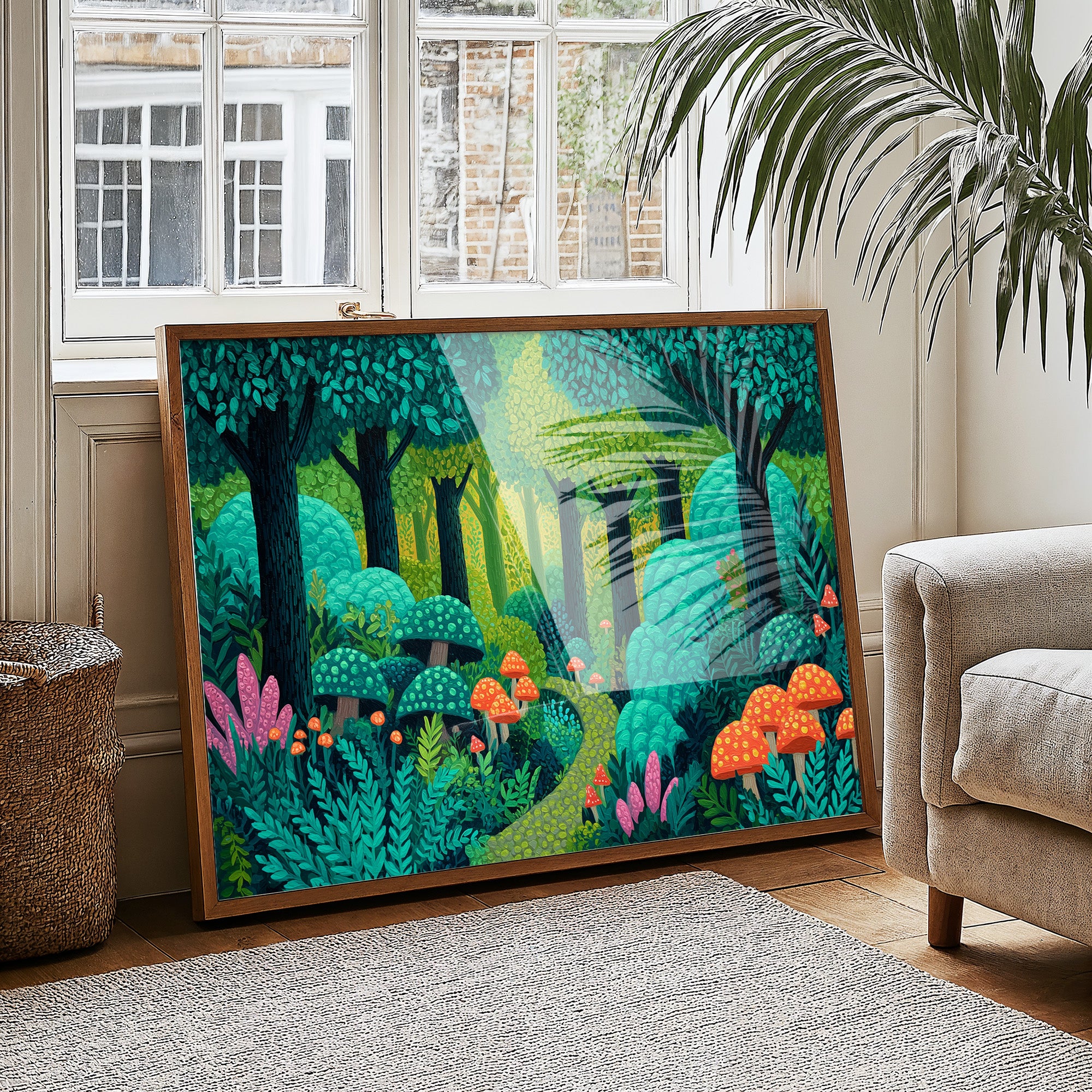 Afternoon light spills across a whimsical forest scene, where emerald trees stand sentinel over a mysterious winding path. Deep greens and teals create a lush canopy, while vibrant orange and pink mushrooms dot the forest floor like tiny lanterns in an enchanted grove. The detailed illustration captures a fairytale-like atmosphere where every leaf and mushroom seems to hold a story of its own. This playful yet sophisticated piece would bring a touch of wonder to a reading nook, children's room, or any space where imagination is welcome to roam free.