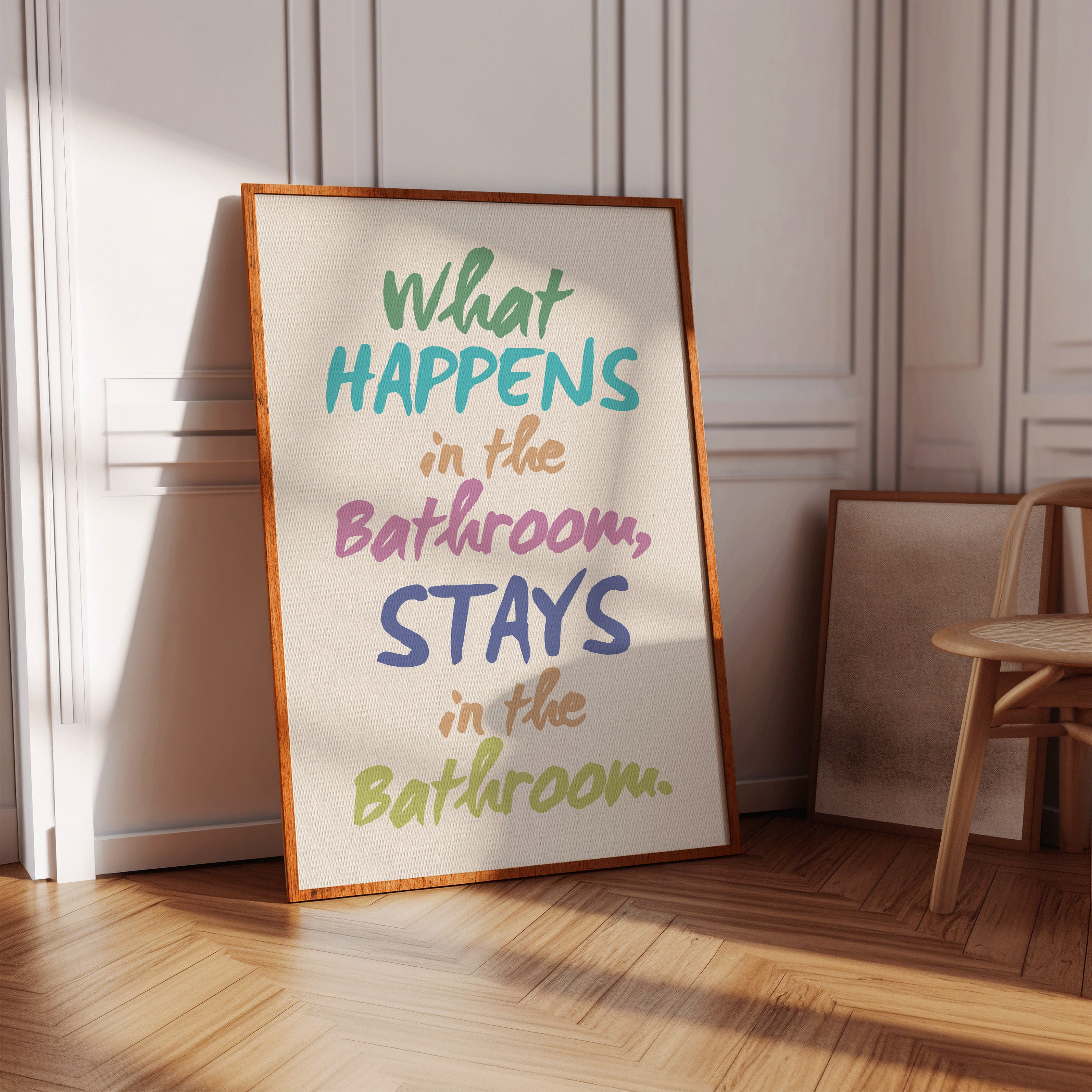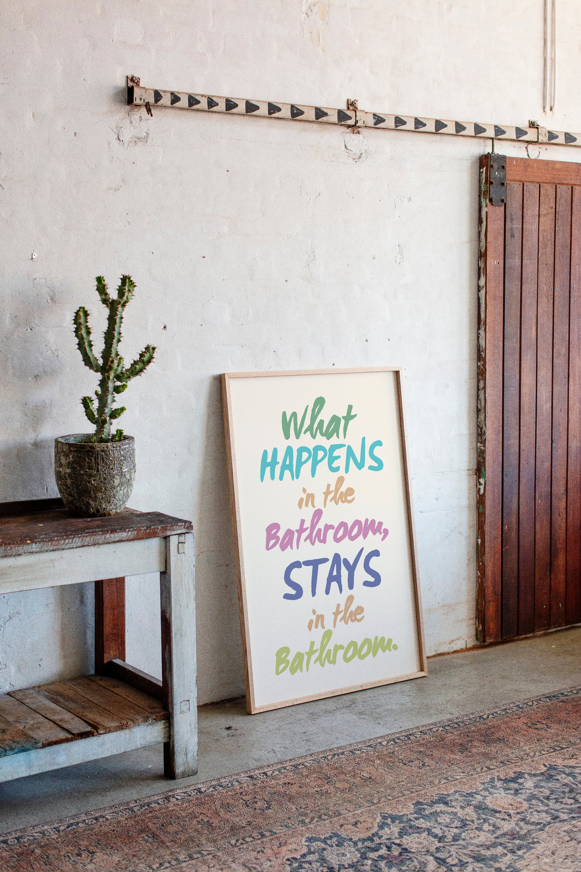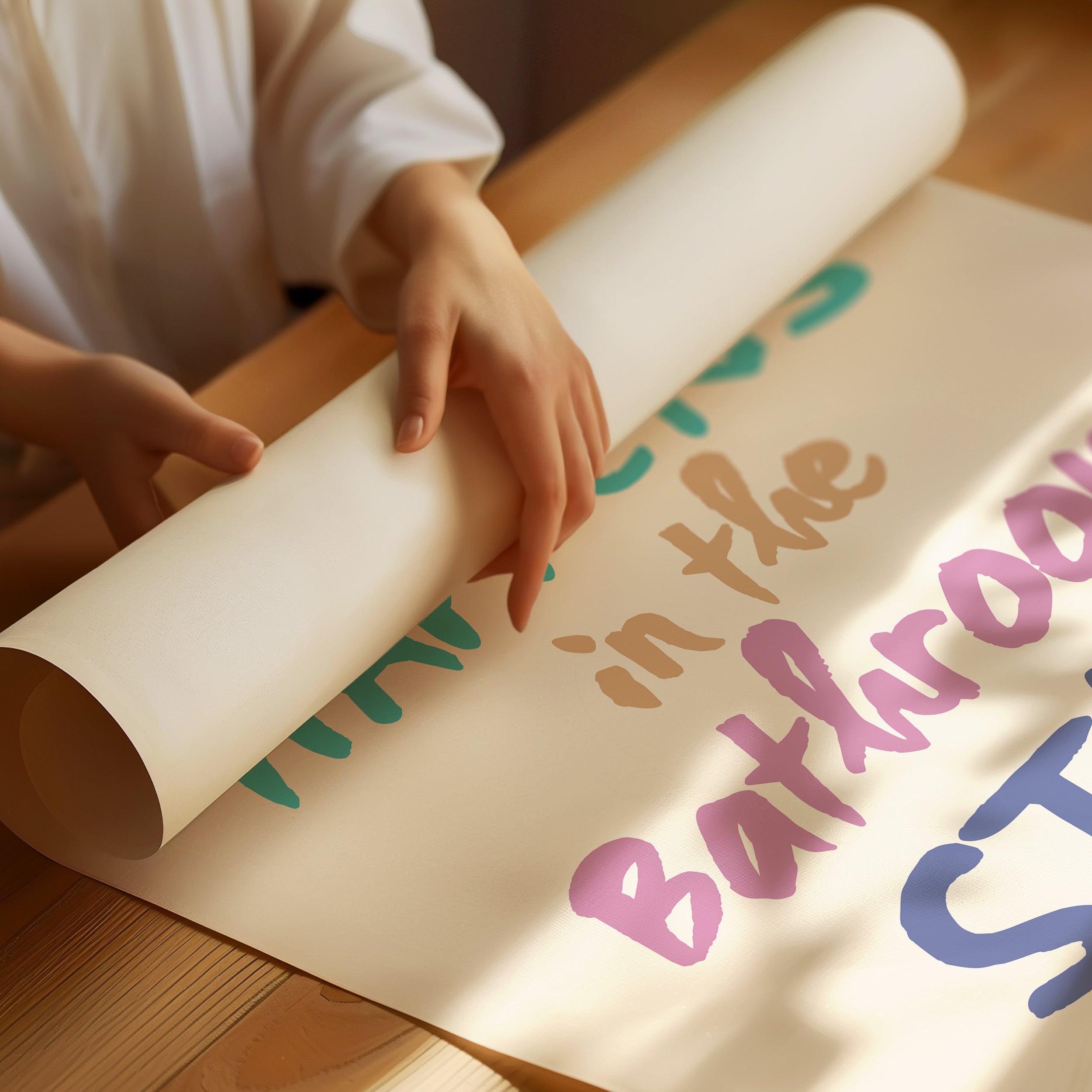 Playful pastels dance across cream-colored canvas, bringing lighthearted wisdom to life through bold brush strokes and gentle humor. This piece from our Contemporary collection perfectly captures the essence of modern typography art with a dash of wit. The cascading letters in soothing mint, turquoise, and lavender create a rhythmic flow that draws the eye downward, while the message itself delivers a knowing smile. A gentle reminder that some moments are meant to be private, wrapped in the comfort of pastel hues and casual elegance. Perfect for adding a touch of personality to powder rooms or master baths, this piece sparks joy while maintaining sophistication. The soft color palette ensures it complements any bathroom decor while adding just the right amount of charm and character.