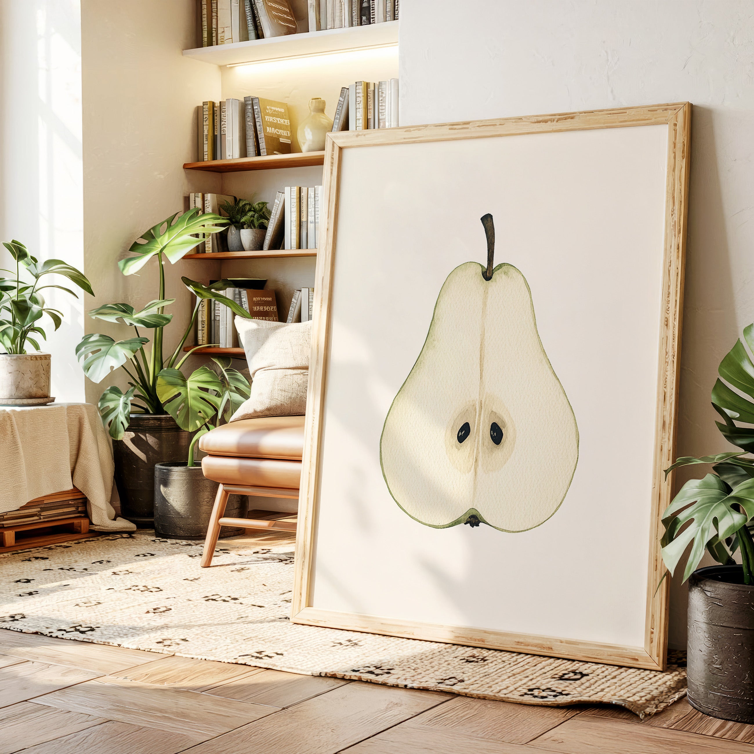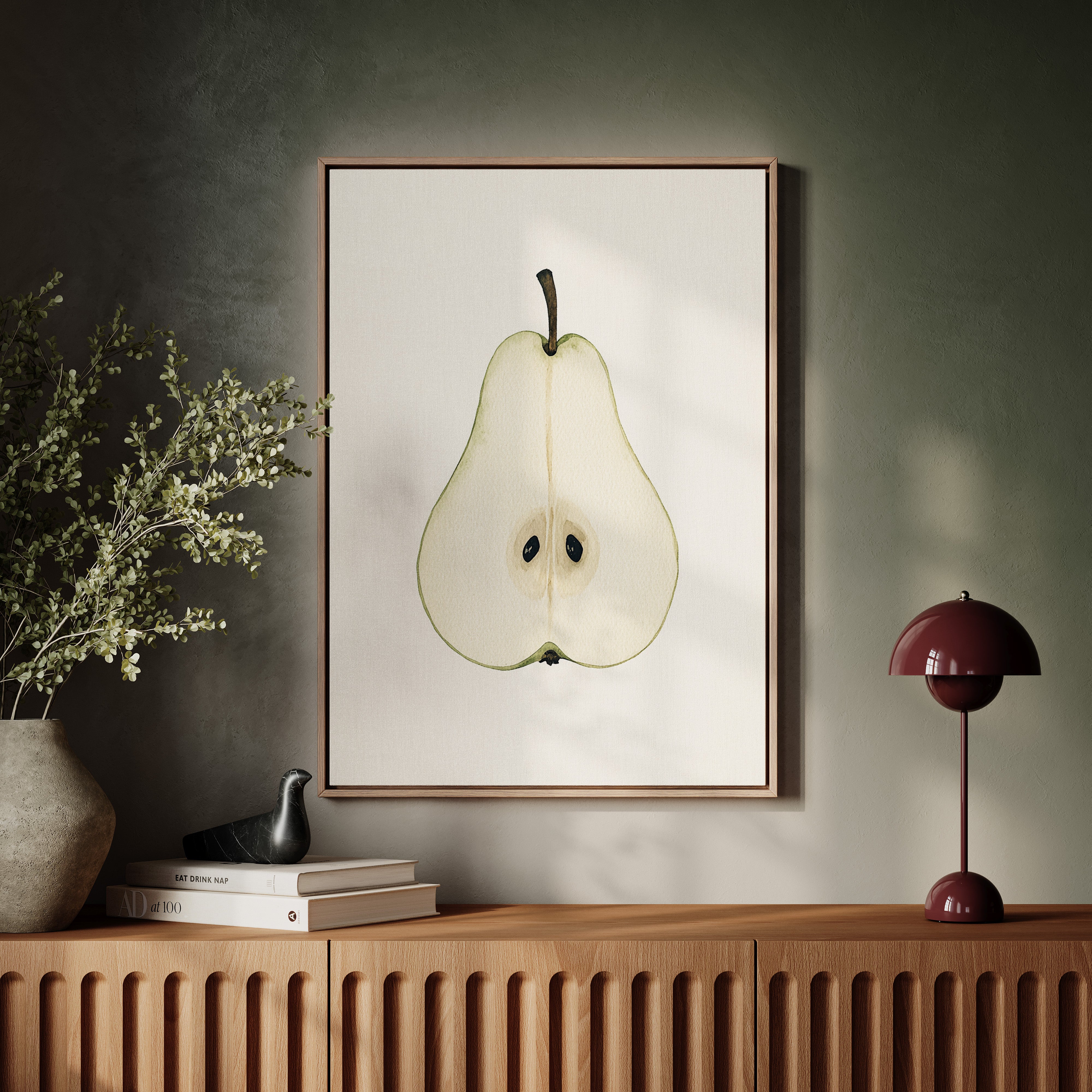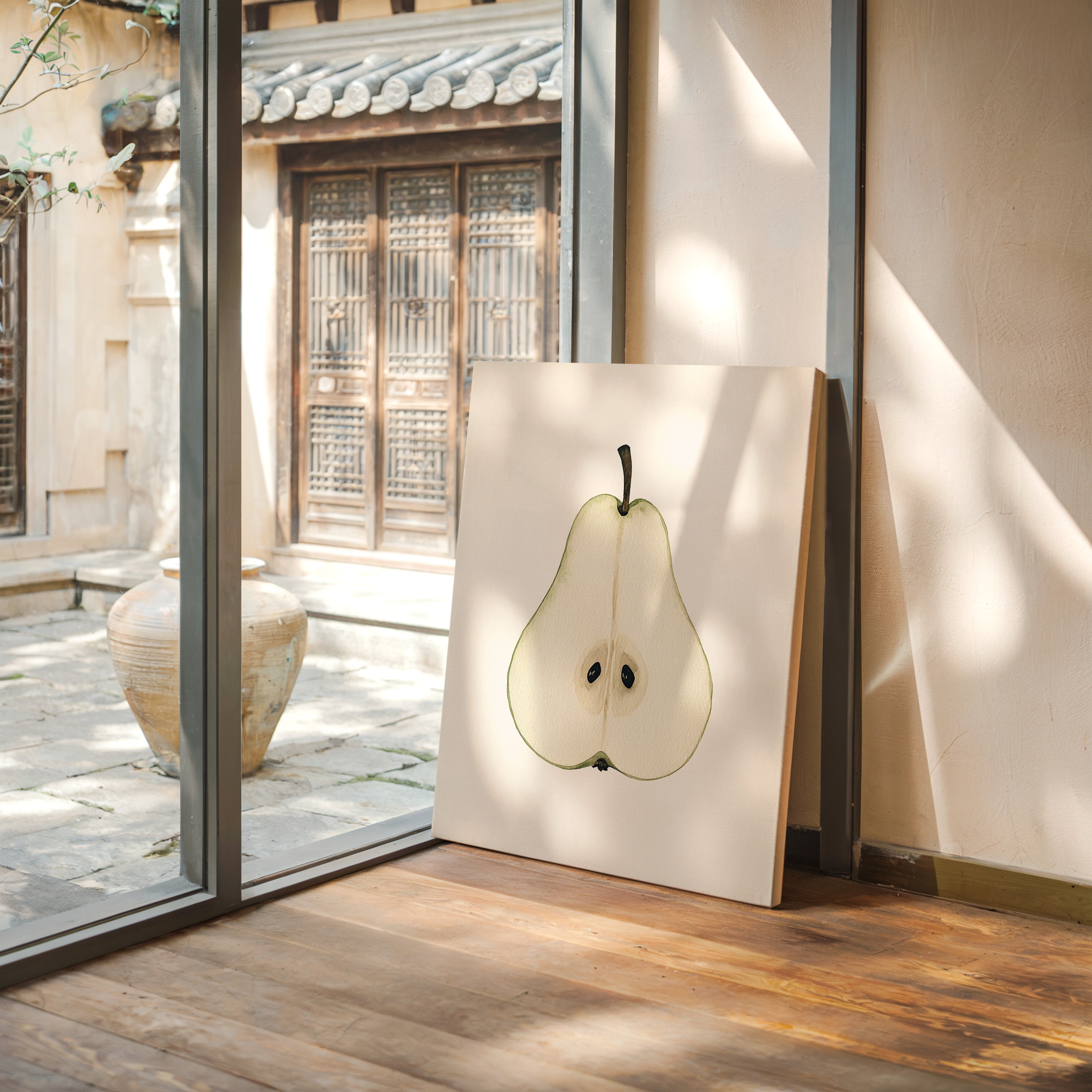 A moment of pristine simplicity captured in the clean bisection of a fresh pear. The creamy flesh reveals its inner architecture - a perfect symmetry of pale ivory touched with the gentlest hint of green at its edges. Dark seeds rest like eyes in the fruit's core, creating an almost whimsical expression against the minimalist backdrop. The composition speaks to the quiet beauty found in everyday objects, celebrating both form and organic geometry. This contemporary botanical study would bring a touch of understated elegance to a modern kitchen or dining space, particularly when paired with clean lines and natural materials.