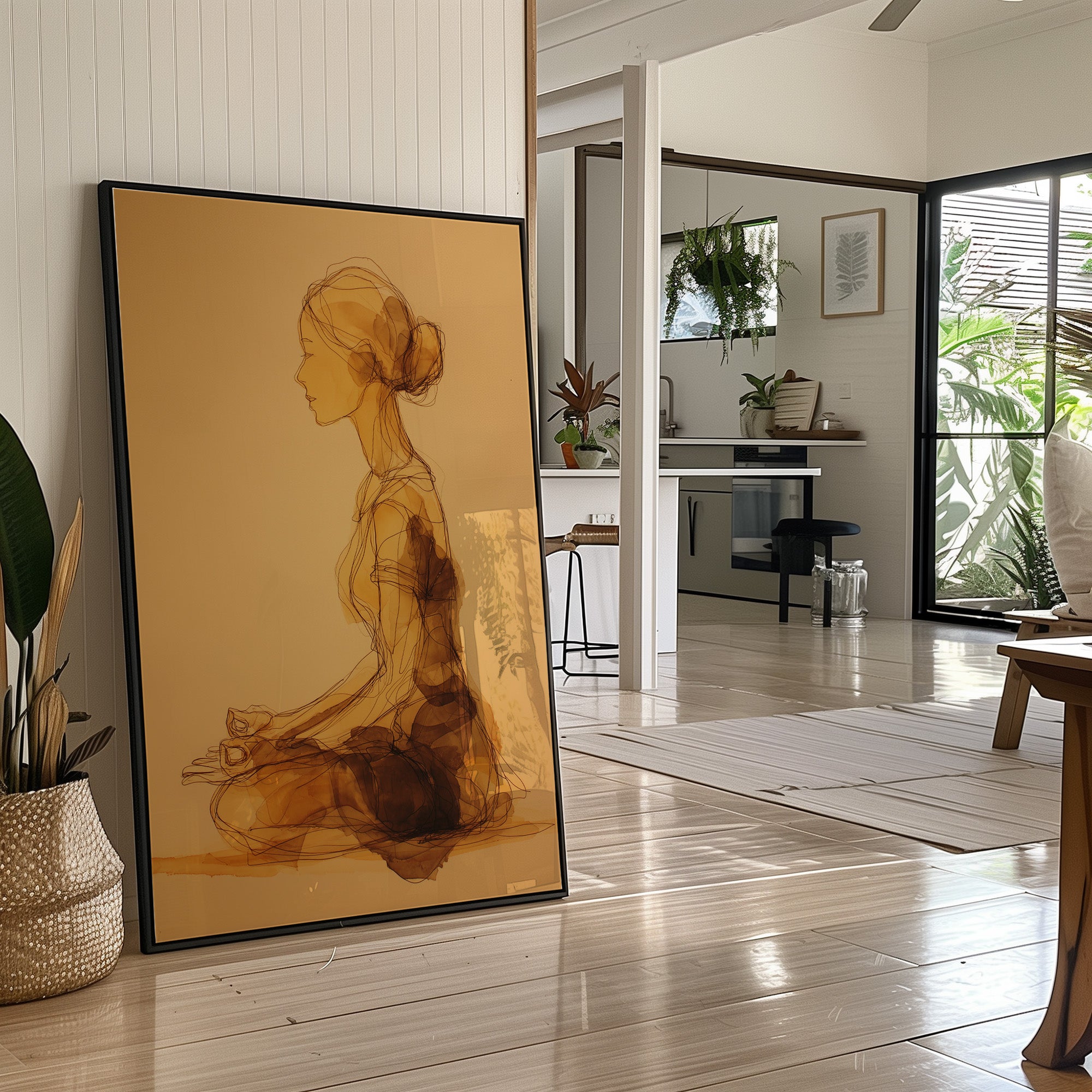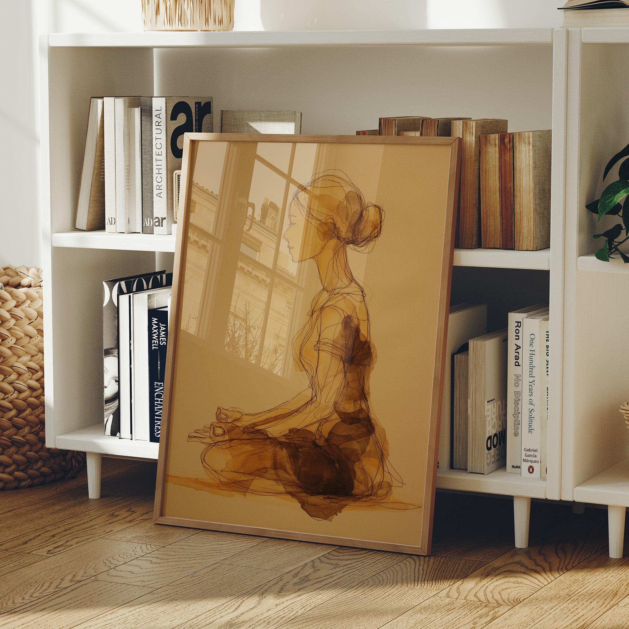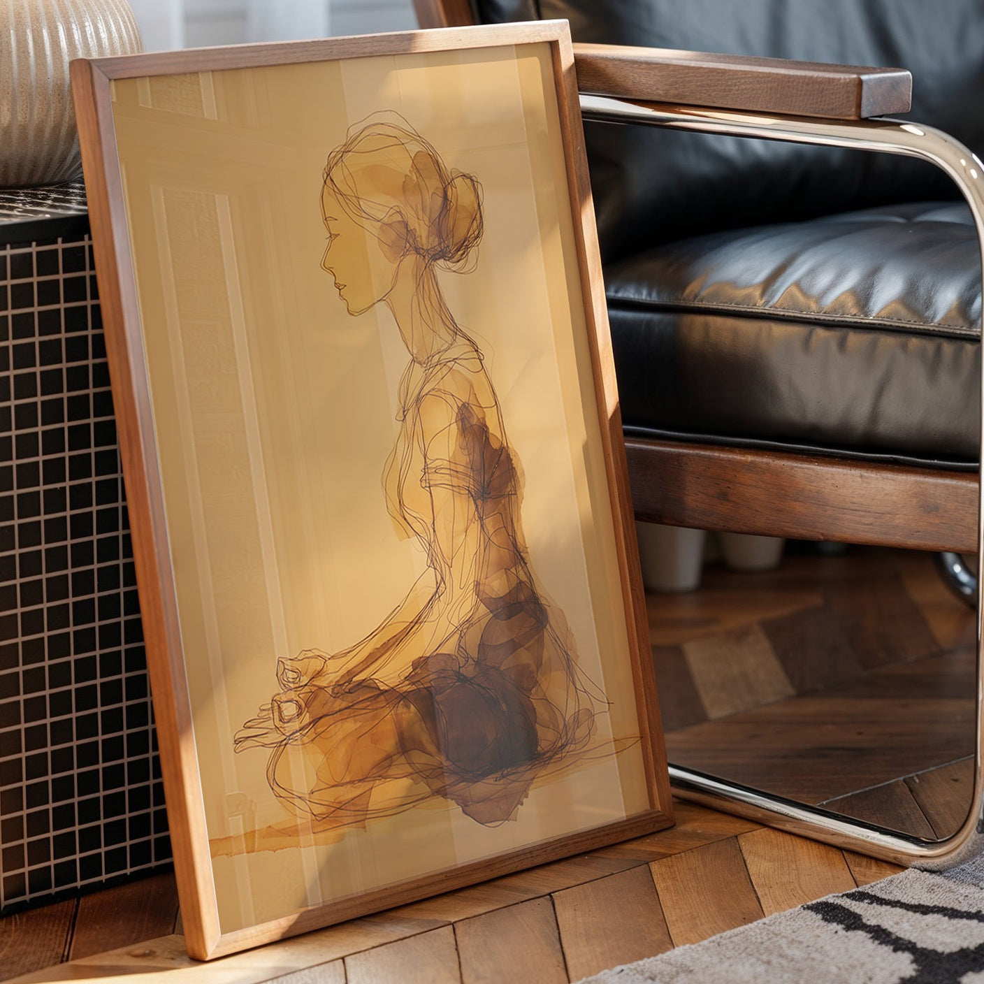 Gentle morning light washes over a minimalist ink drawing, casting soft shadows that dance with the sepia tones. The flowing lines capture a figure in meditation, rendered with delicate brushstrokes that suggest both movement and stillness. The amber warmth of the piece creates a sense of timeless tranquility, complemented by the natural wood frame and surrounding elements of a mindful space. This piece brings contemplative energy to a reading nook, meditation space, or any quiet corner seeking artistic soul.