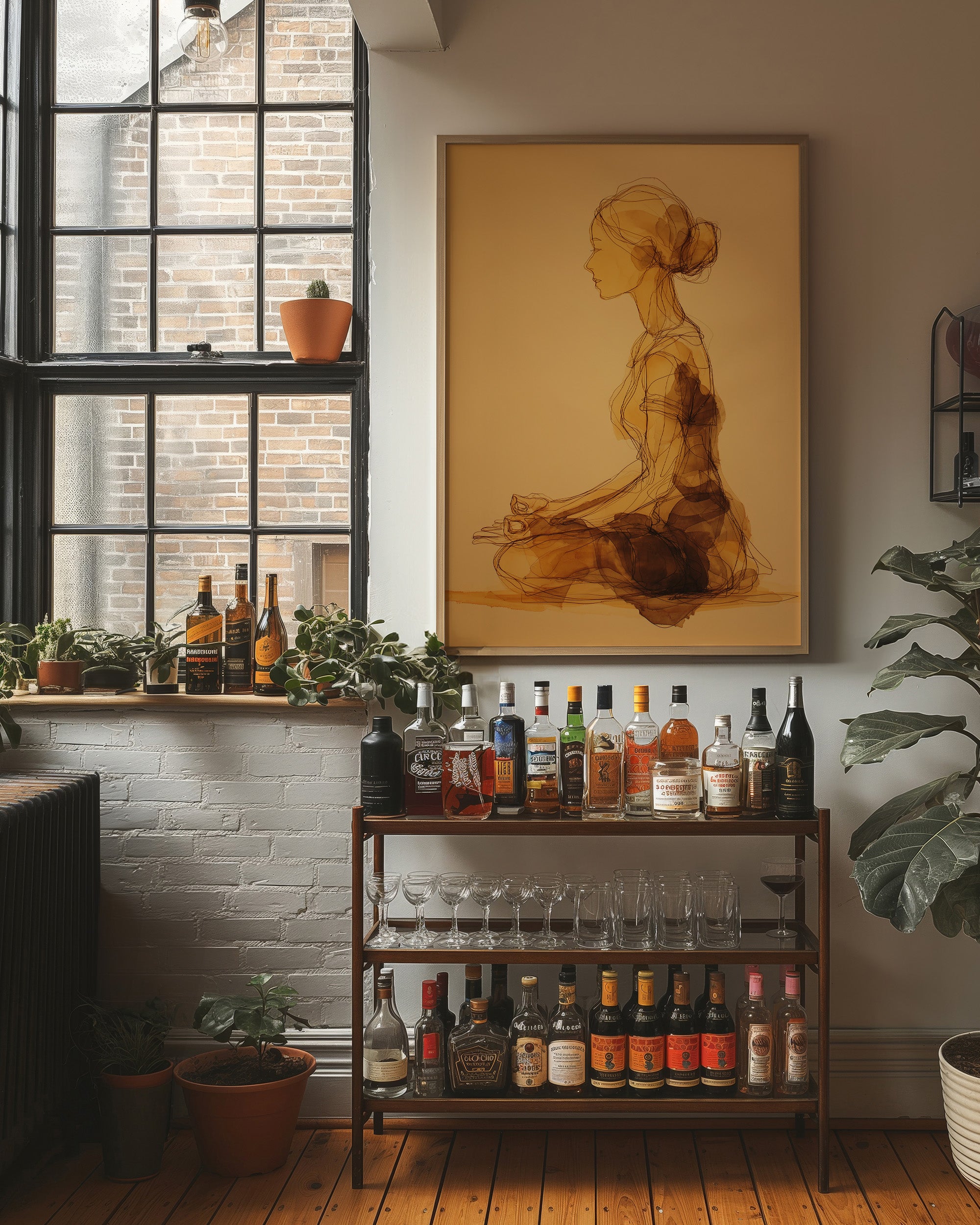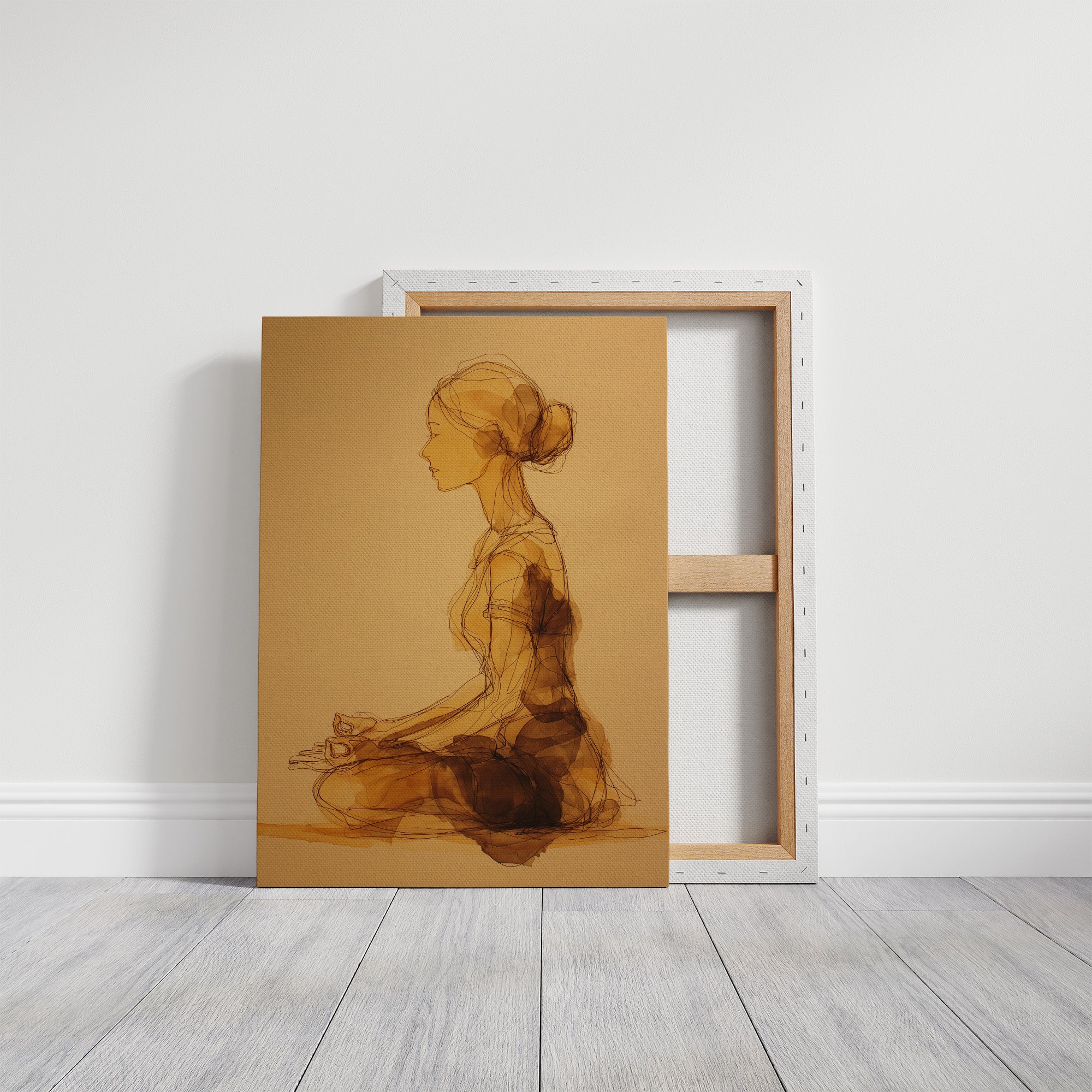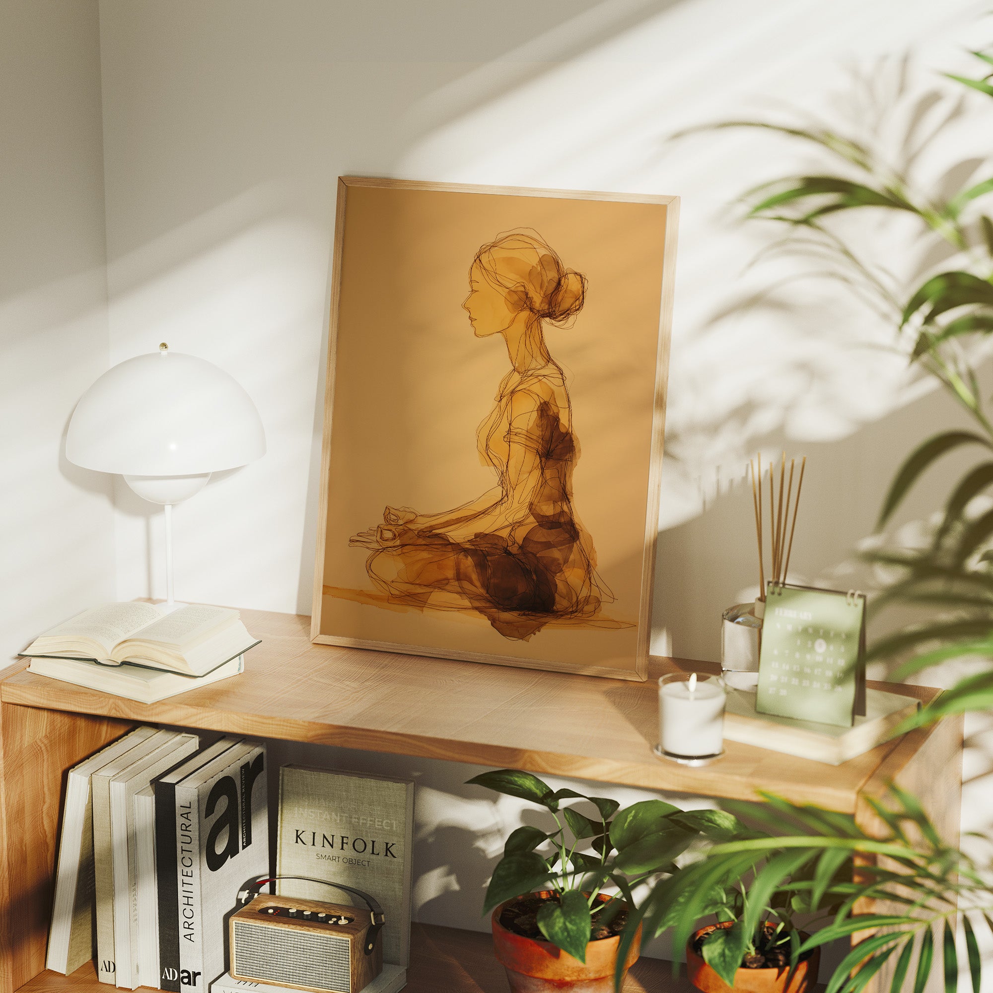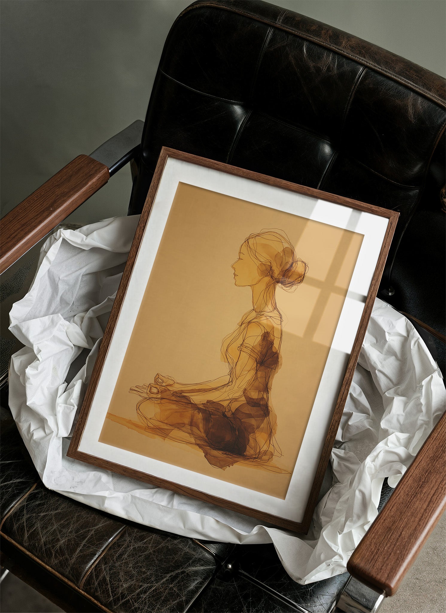 Gentle morning light washes over a minimalist ink drawing, casting soft shadows that dance with the sepia tones. The flowing lines capture a figure in meditation, rendered with delicate brushstrokes that suggest both movement and stillness. The amber warmth of the piece creates a sense of timeless tranquility, complemented by the natural wood frame and surrounding elements of a mindful space. This piece brings contemplative energy to a reading nook, meditation space, or any quiet corner seeking artistic soul.