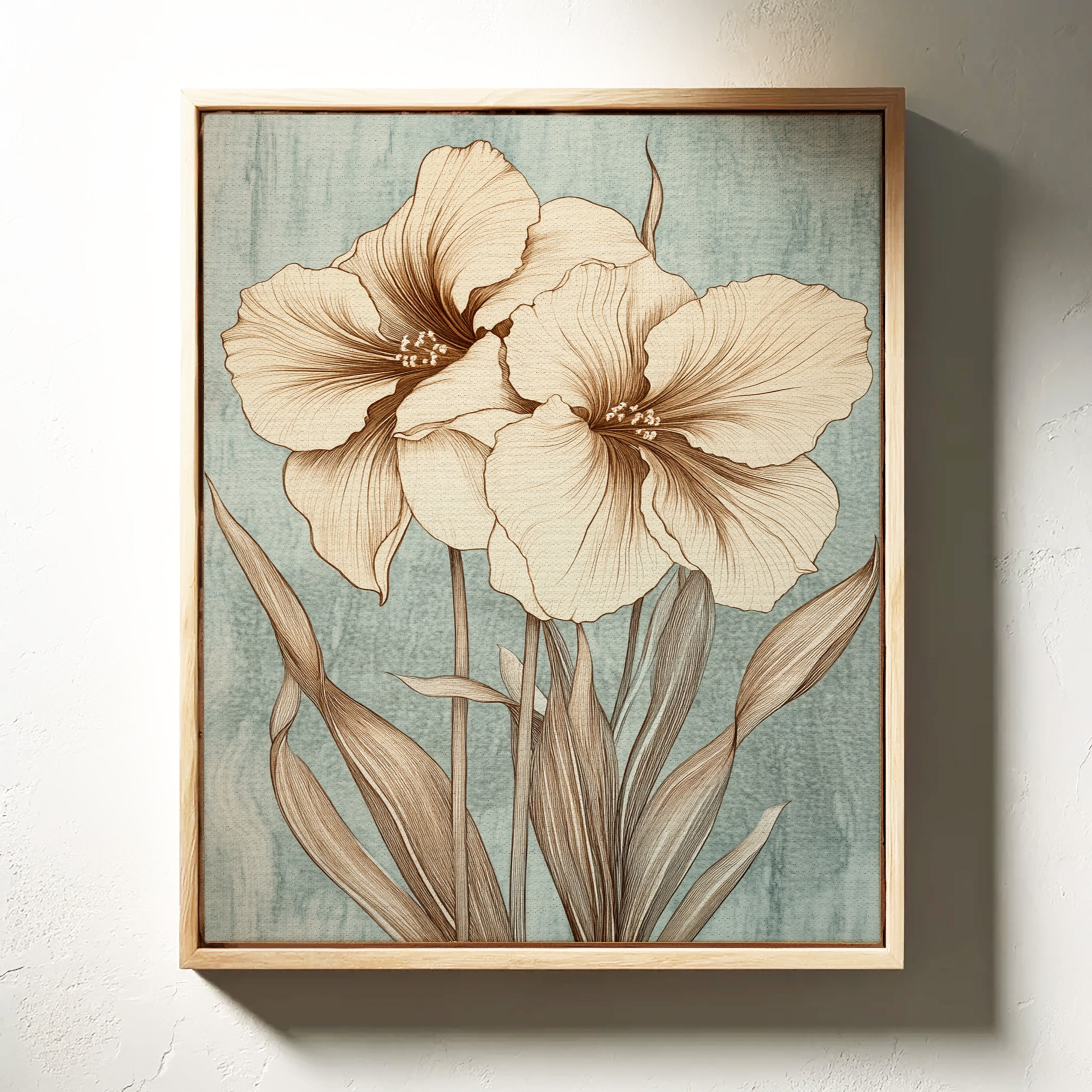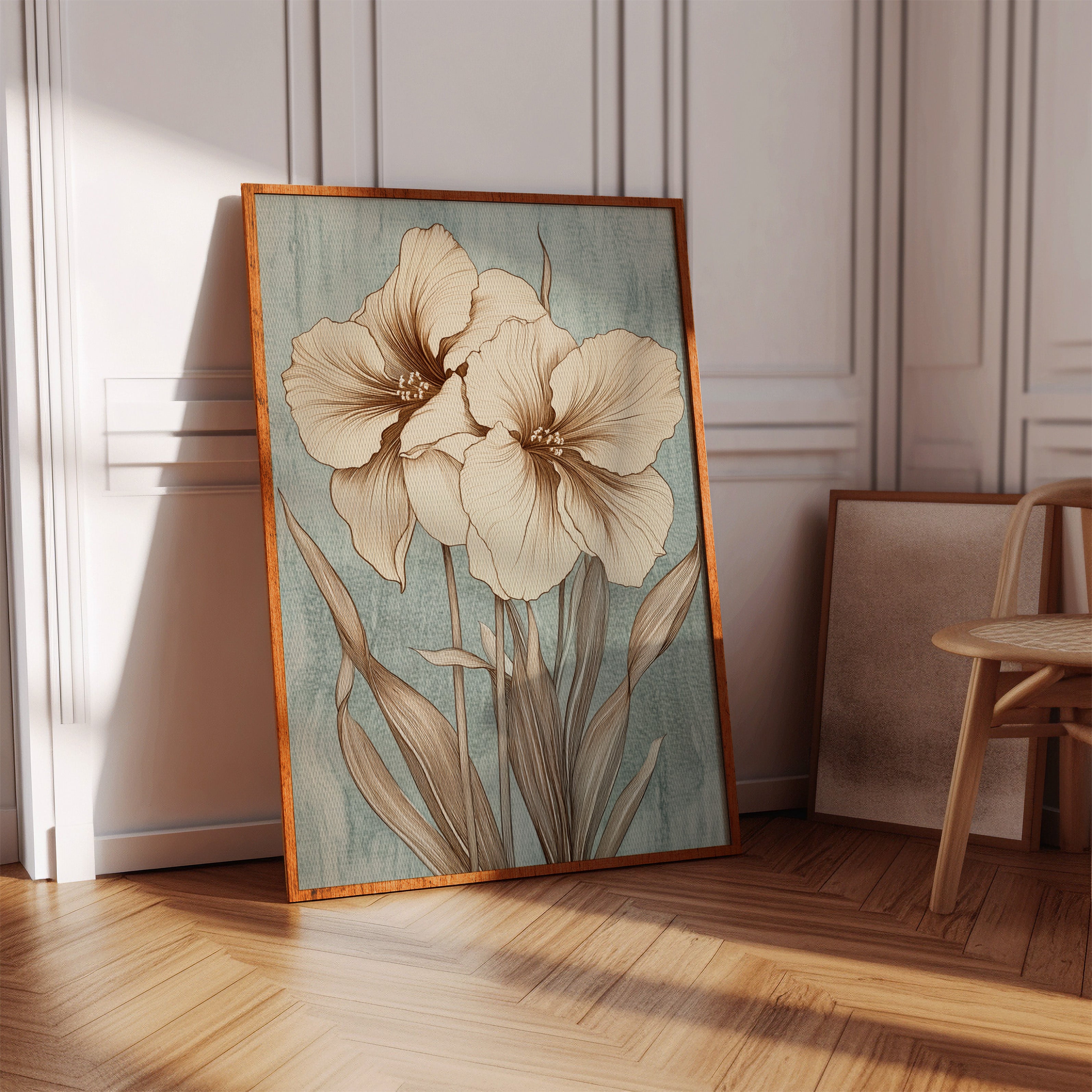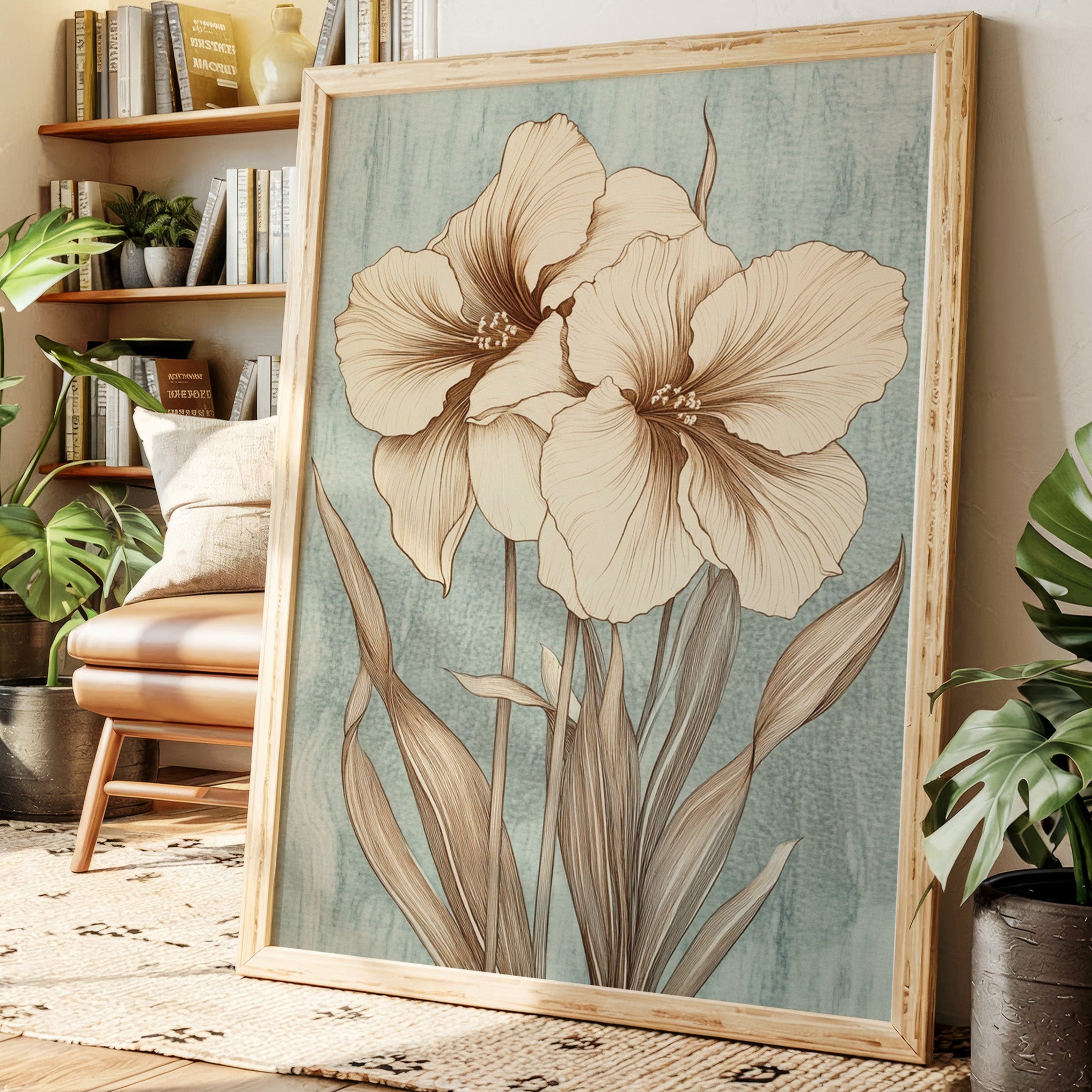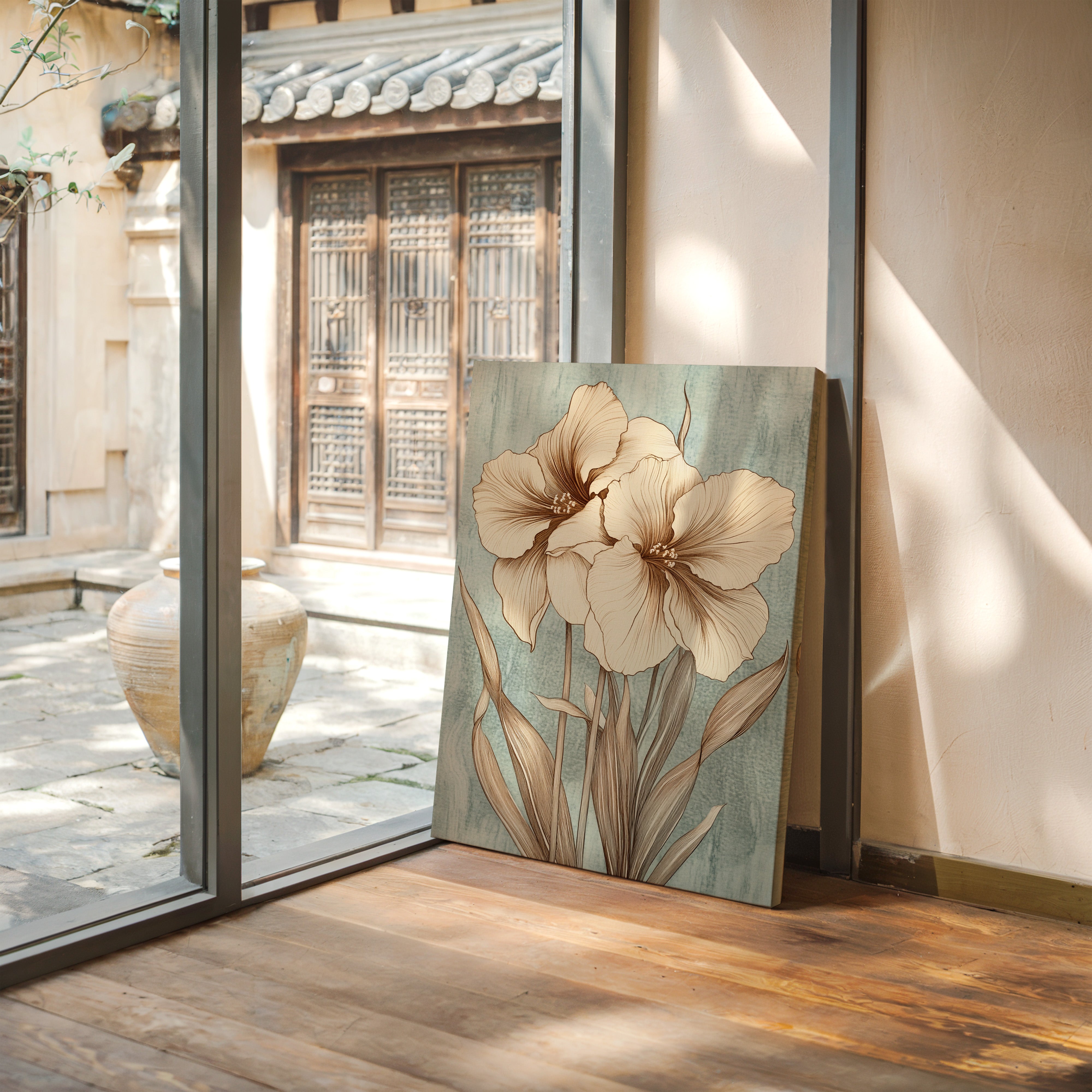 Delicate hibiscus blooms unfold their stories in gentle sepia tones, their petals as thin as ancient love letters. The intricate line work traces each vein and fold with the precision of a master botanist's sketch, while the soft sage background creates a dreamy atmosphere of dawn's first light. The composition captures the flowers in perfect symmetry, their stamens reaching outward like nature's own calligraphy. This elegant botanical study would bring sophisticated grace to a modern bedroom or create a serene focal point in a minimalist living space.
