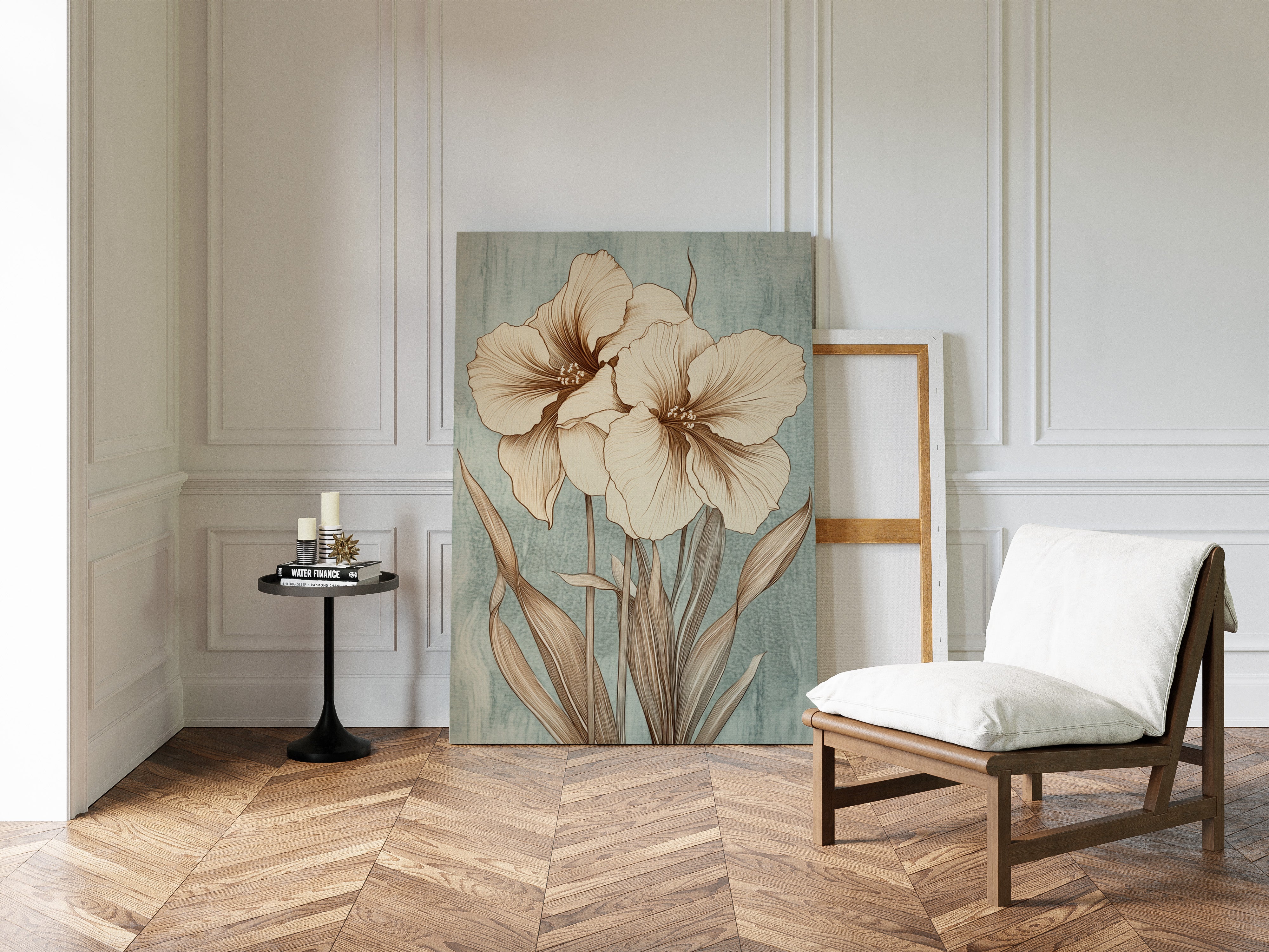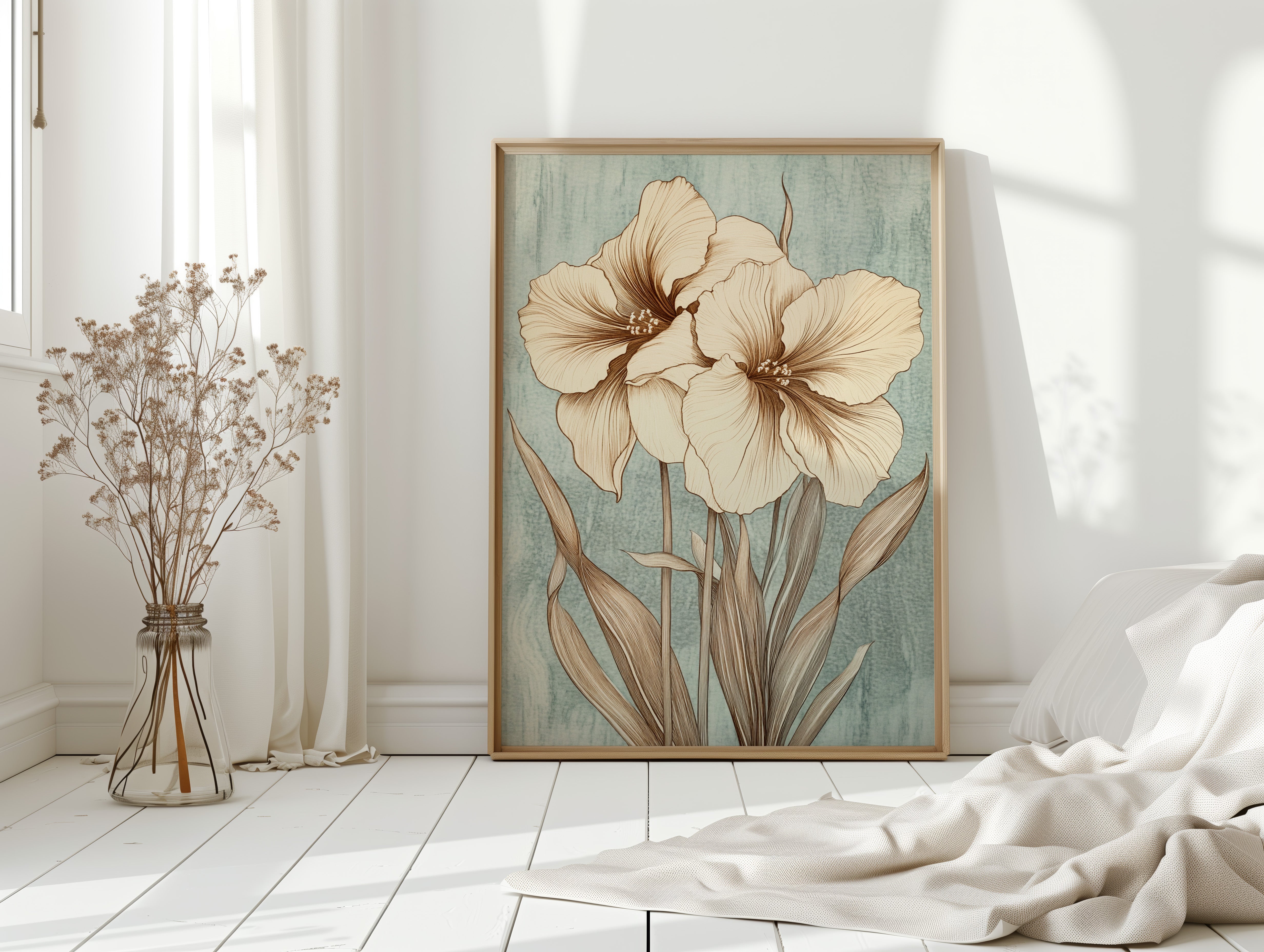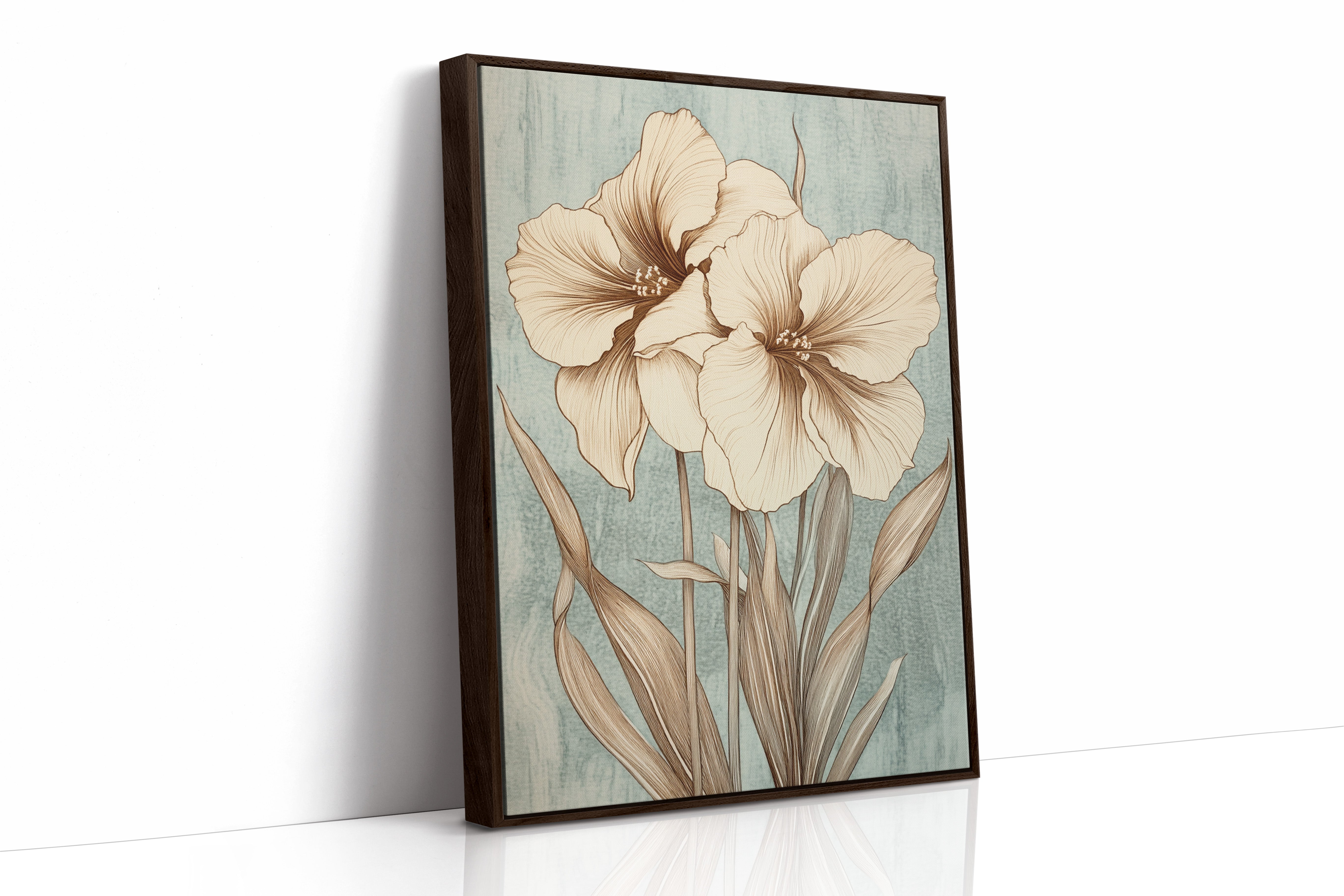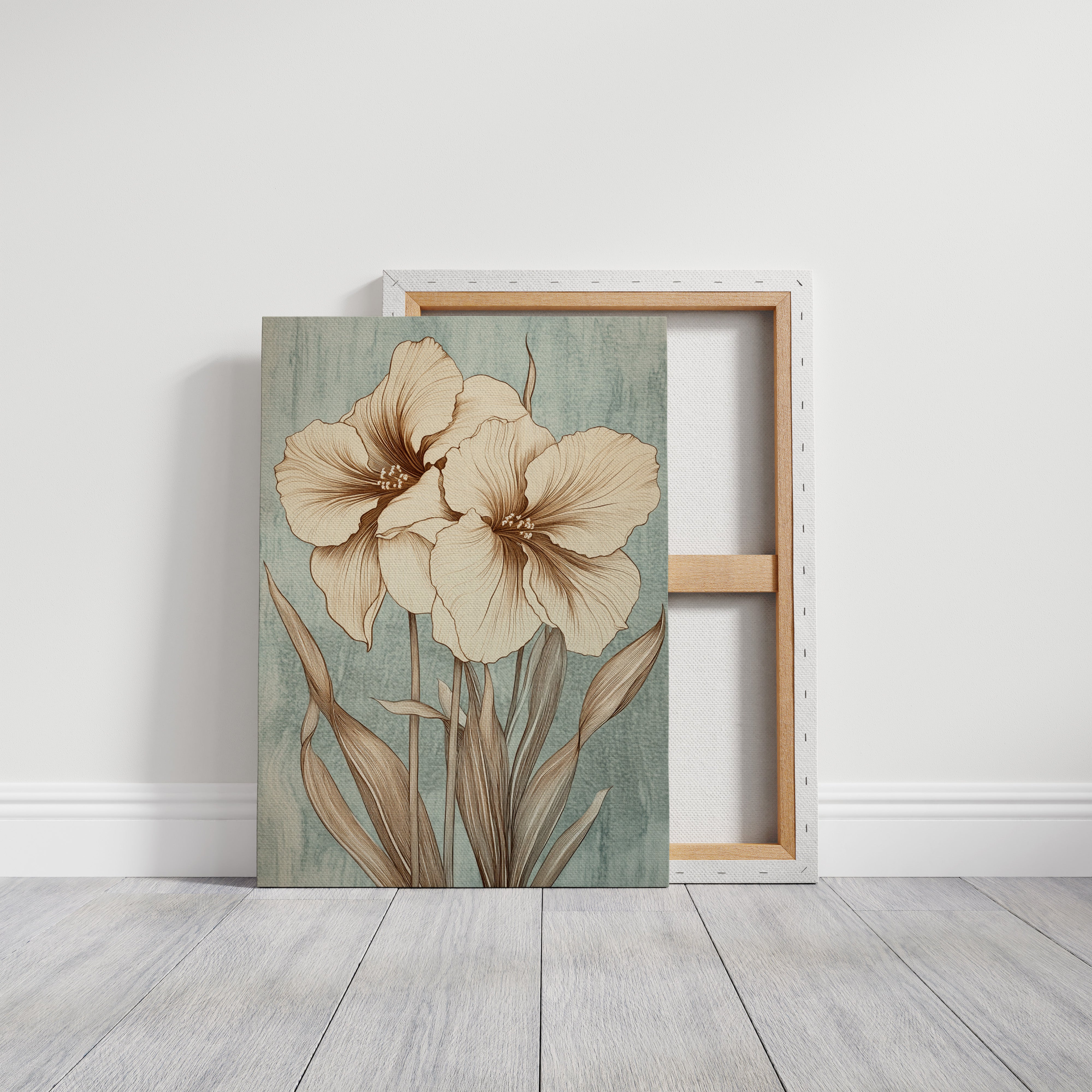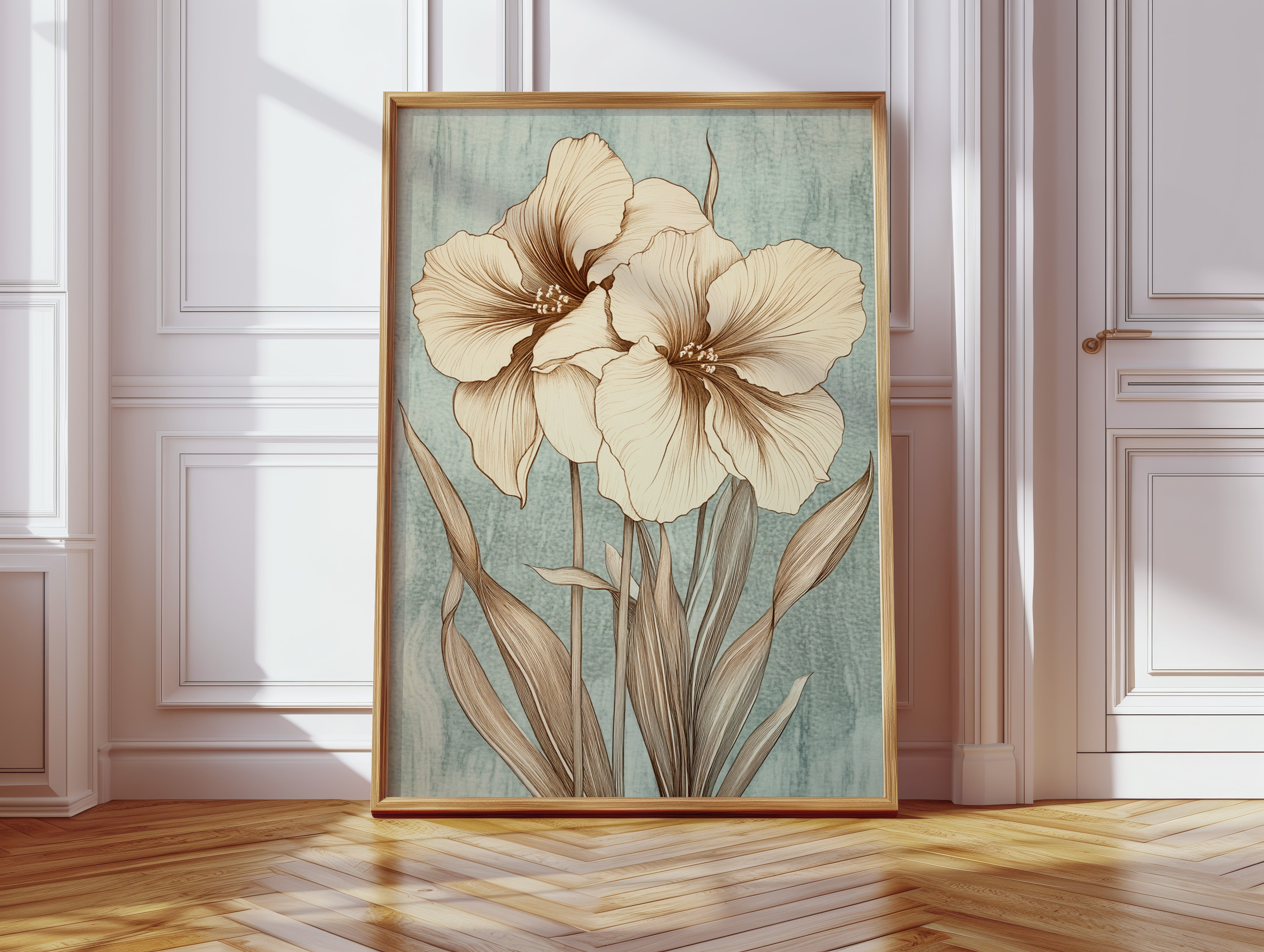 Delicate hibiscus blooms unfold their stories in gentle sepia tones, their petals as thin as ancient love letters. The intricate line work traces each vein and fold with the precision of a master botanist's sketch, while the soft sage background creates a dreamy atmosphere of dawn's first light. The composition captures the flowers in perfect symmetry, their stamens reaching outward like nature's own calligraphy. This elegant botanical study would bring sophisticated grace to a modern bedroom or create a serene focal point in a minimalist living space.
