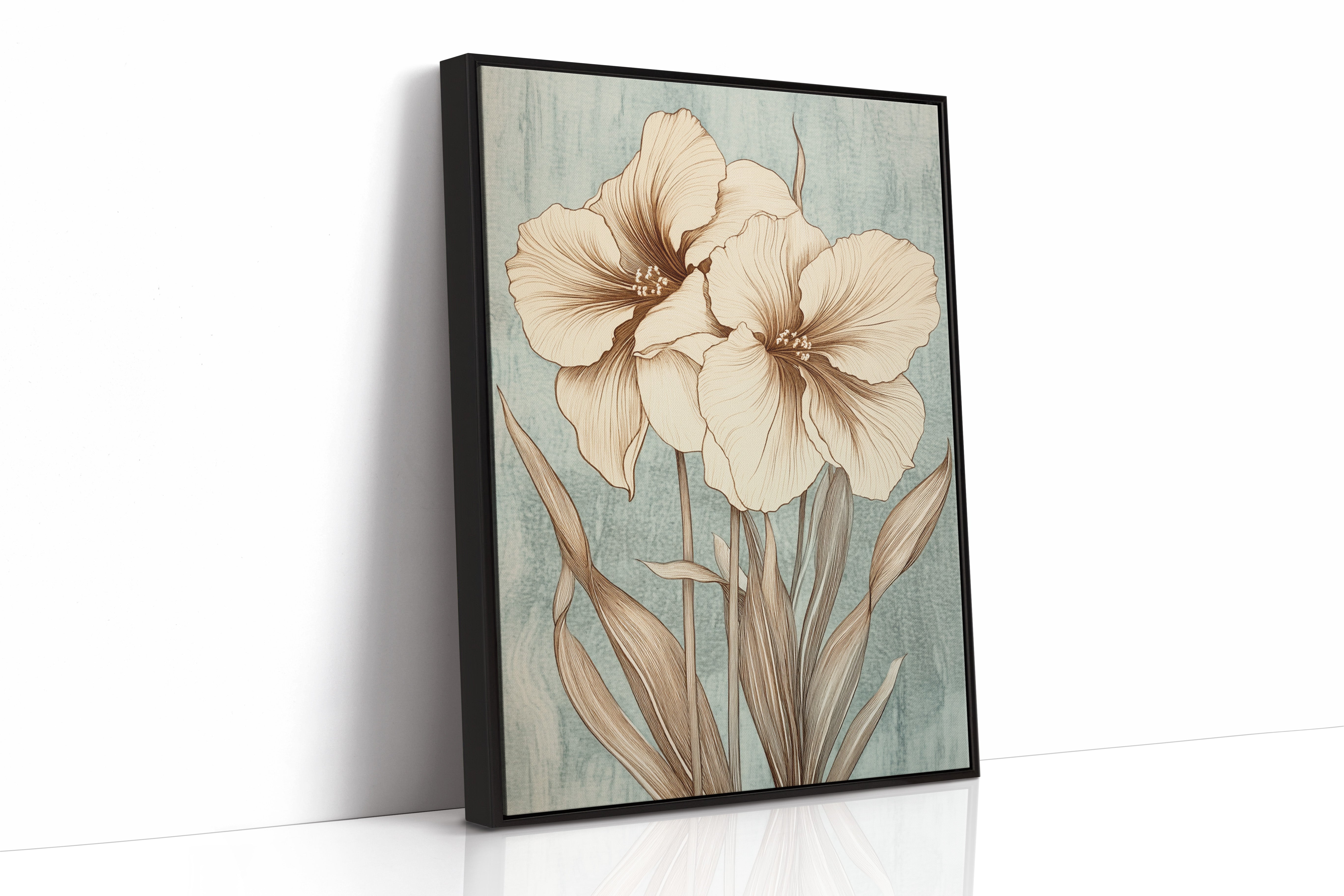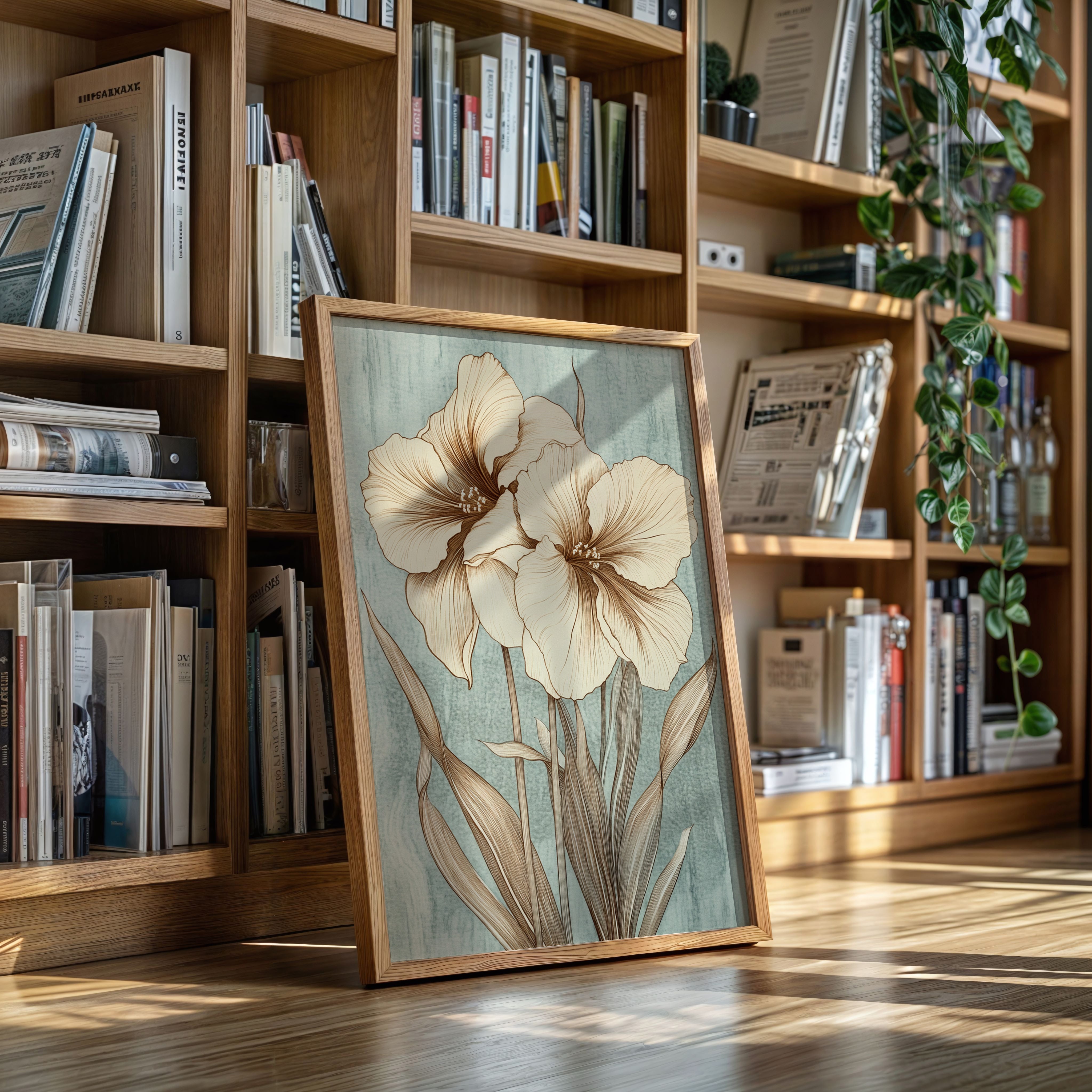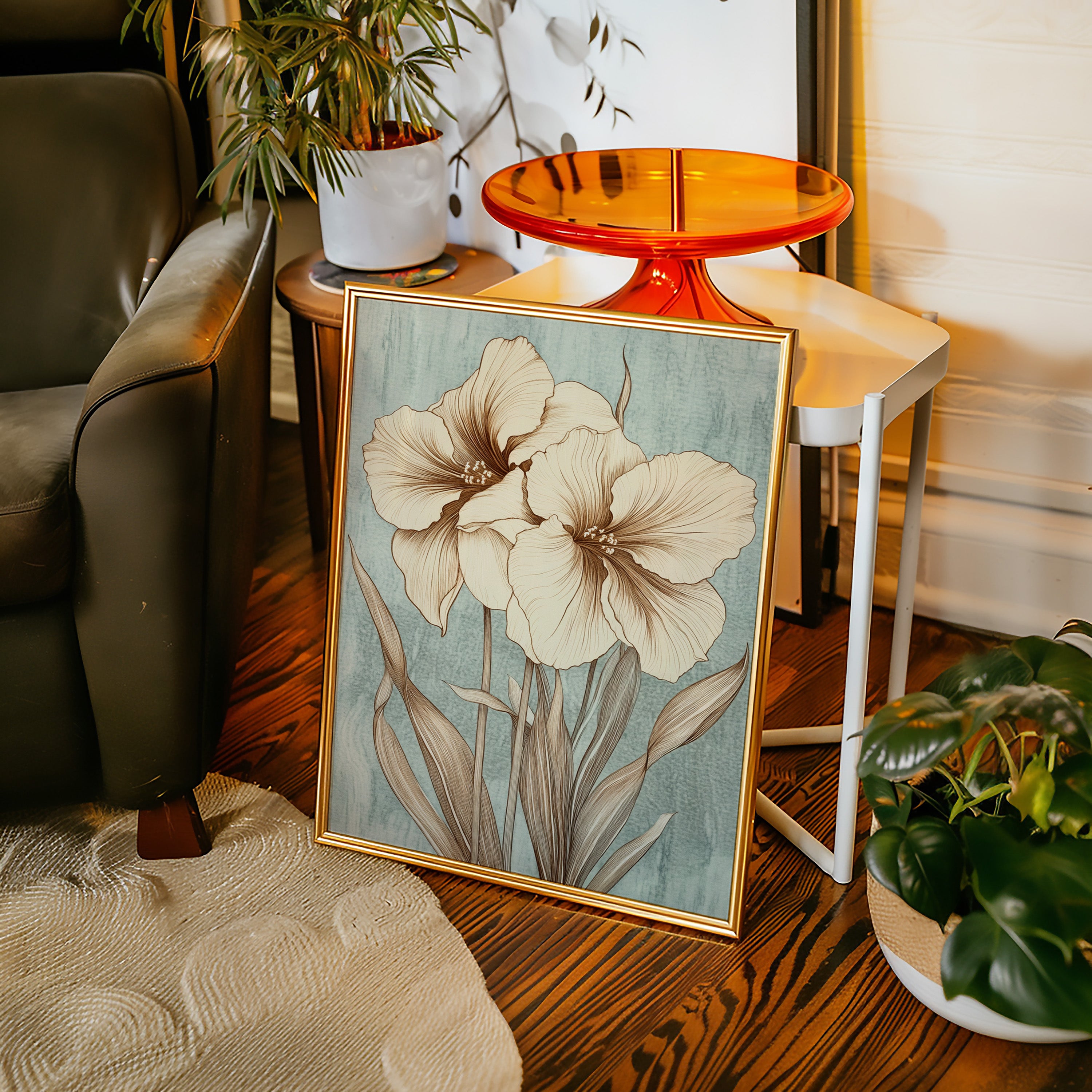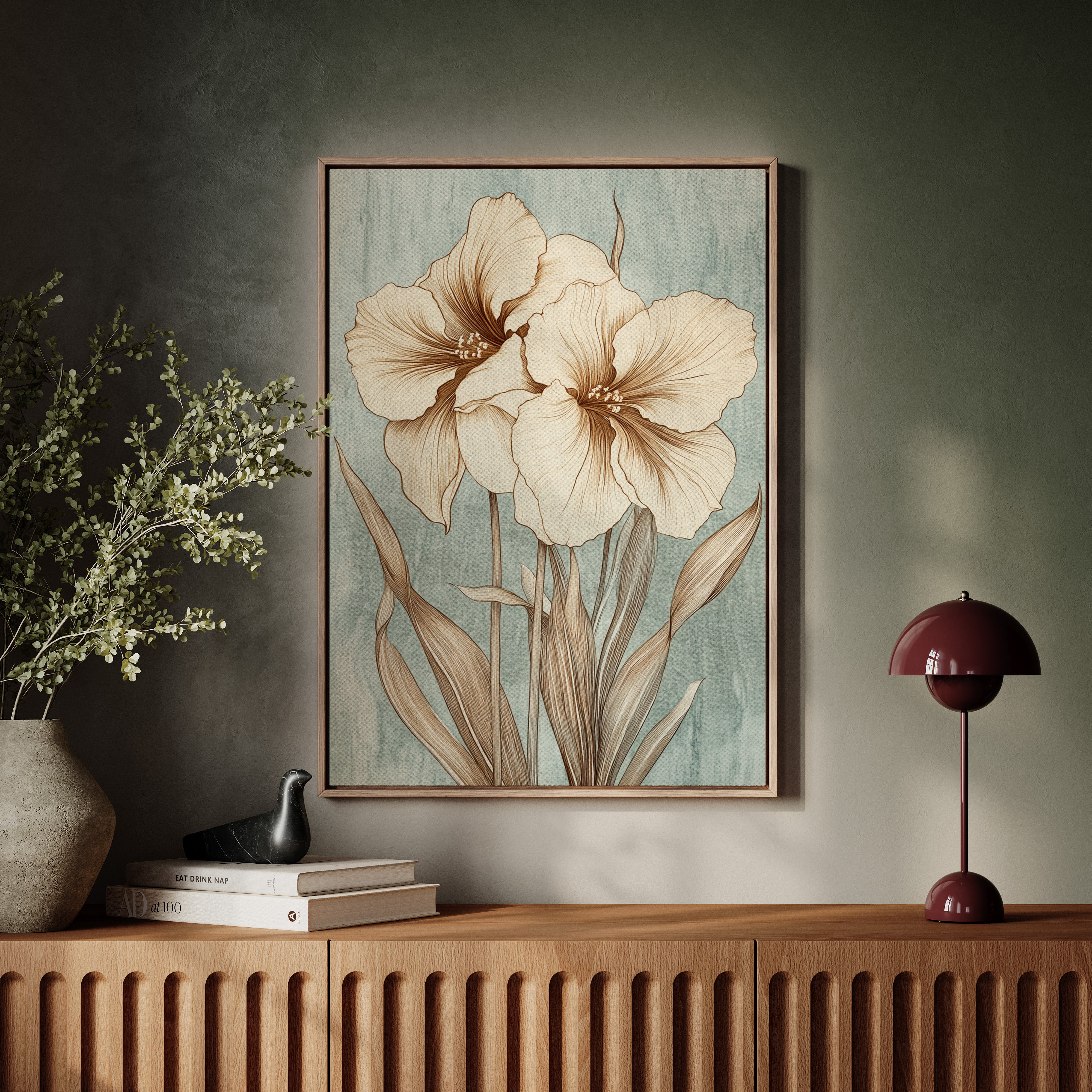 Delicate hibiscus blooms unfold their stories in gentle sepia tones, their petals as thin as ancient love letters. The intricate line work traces each vein and fold with the precision of a master botanist's sketch, while the soft sage background creates a dreamy atmosphere of dawn's first light. The composition captures the flowers in perfect symmetry, their stamens reaching outward like nature's own calligraphy. This elegant botanical study would bring sophisticated grace to a modern bedroom or create a serene focal point in a minimalist living space.