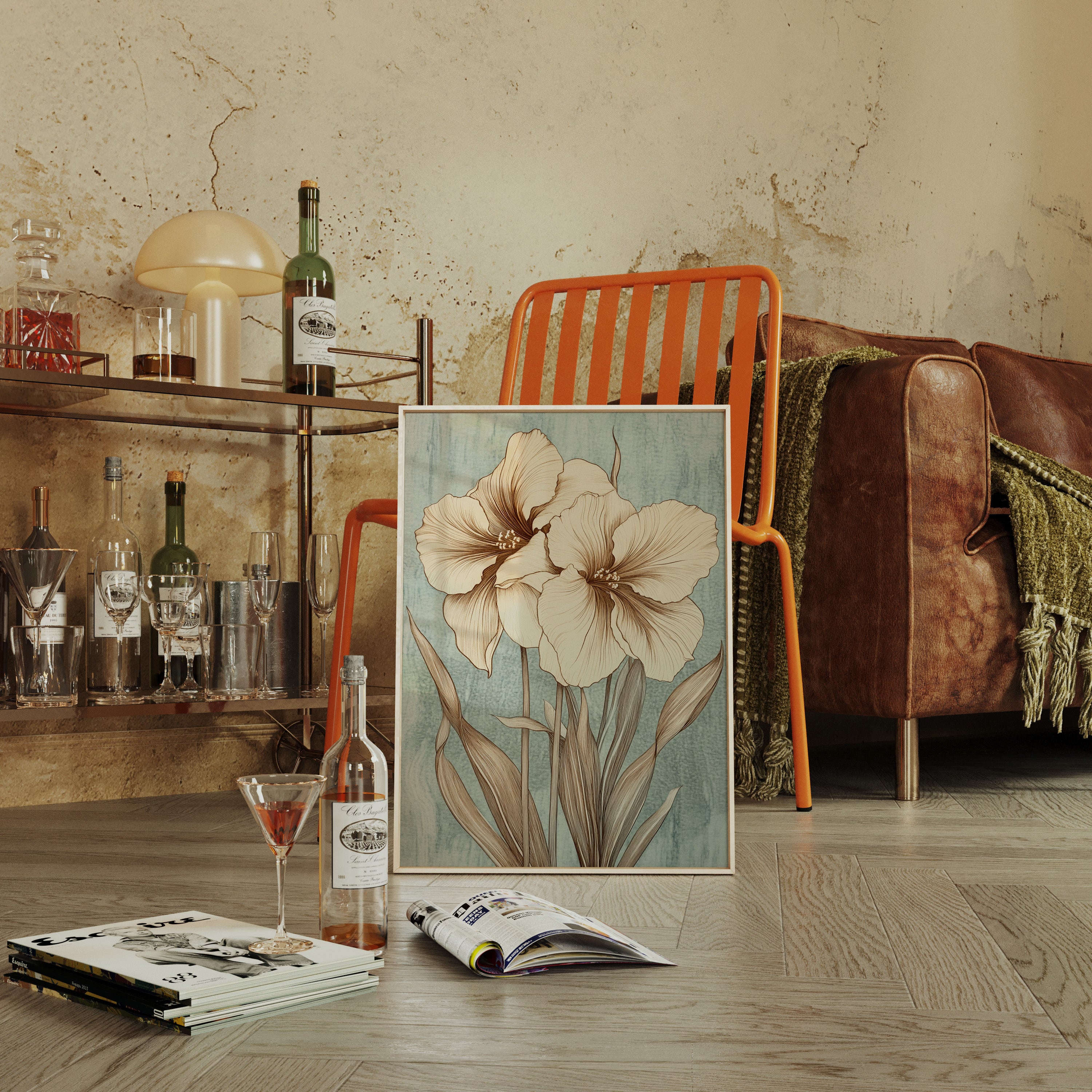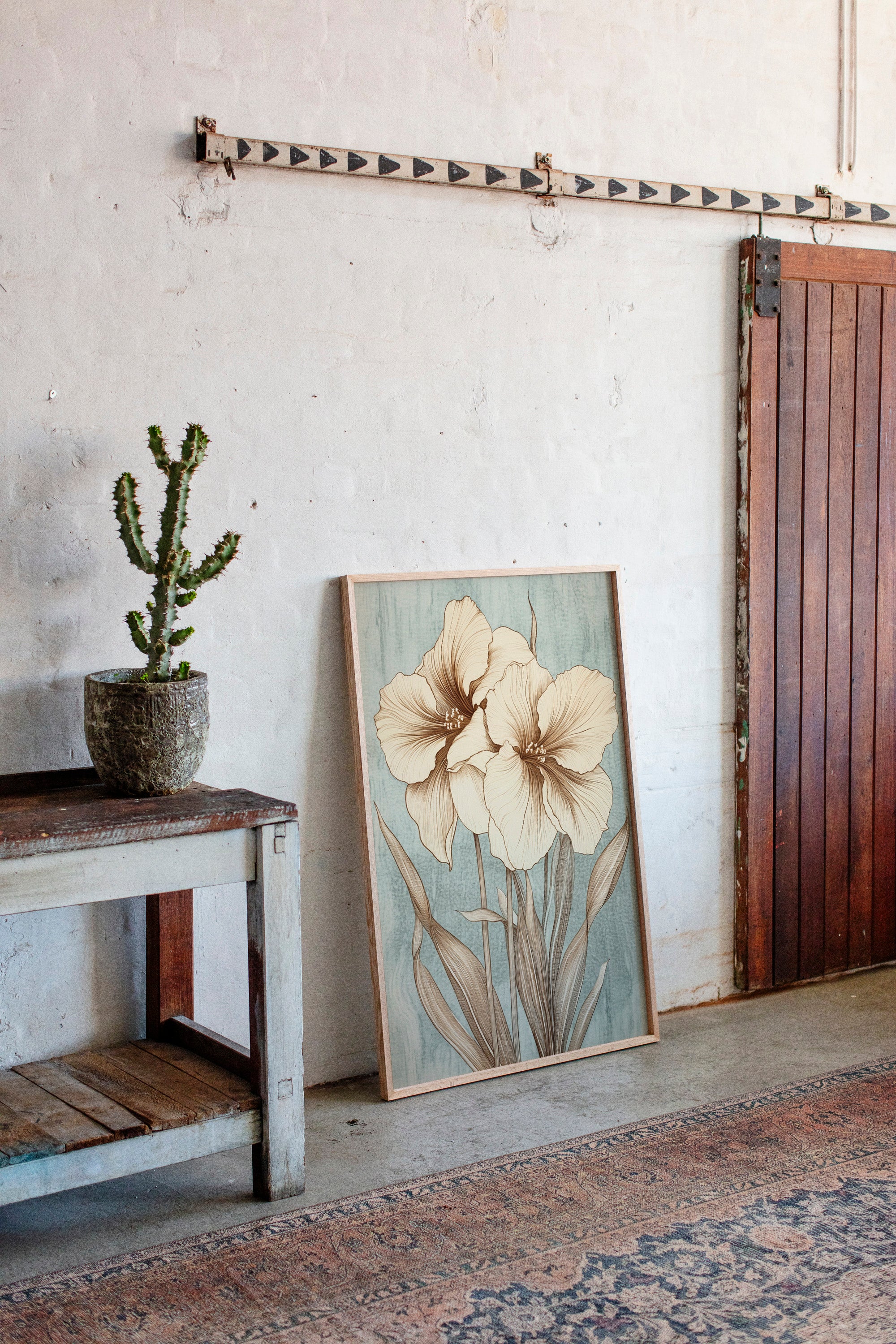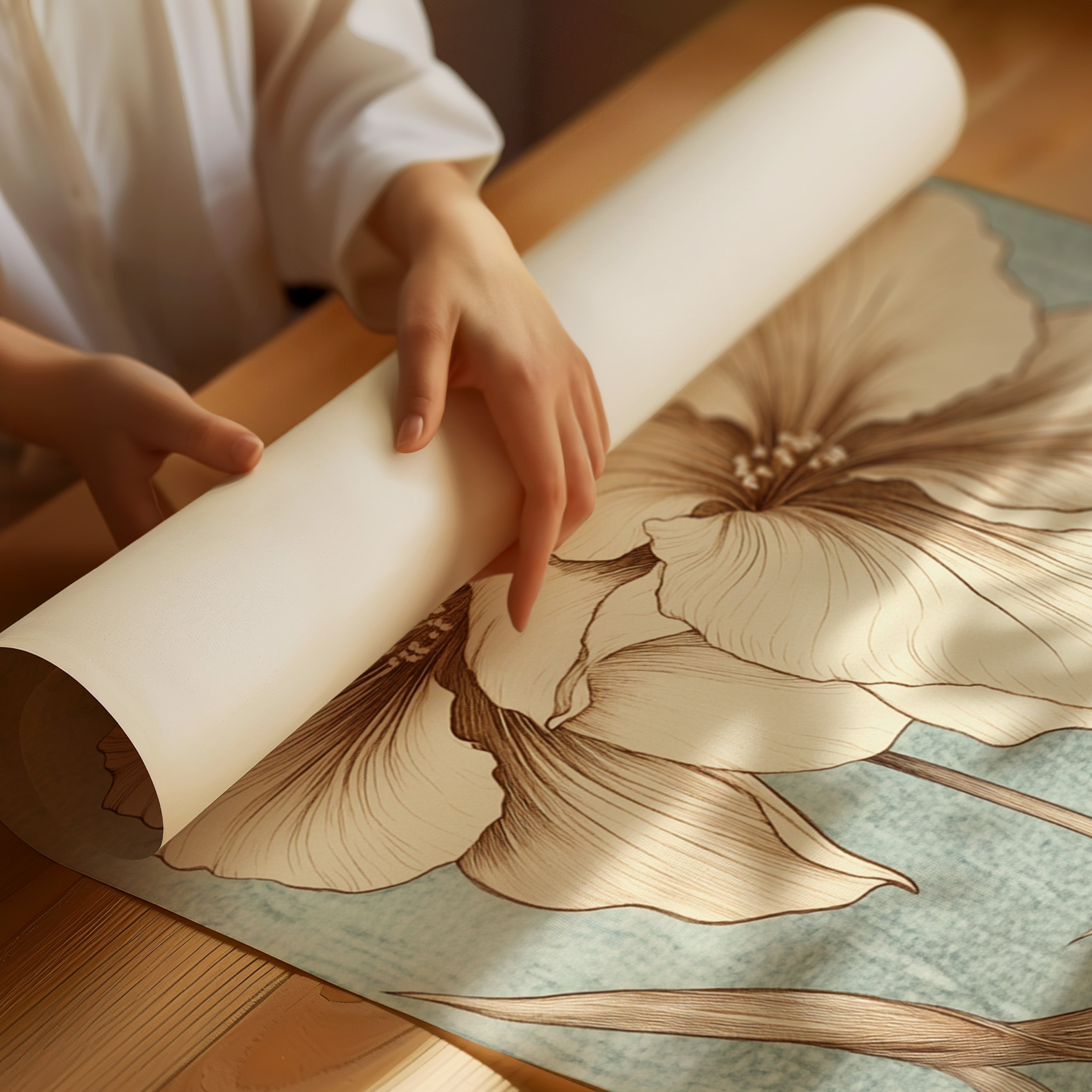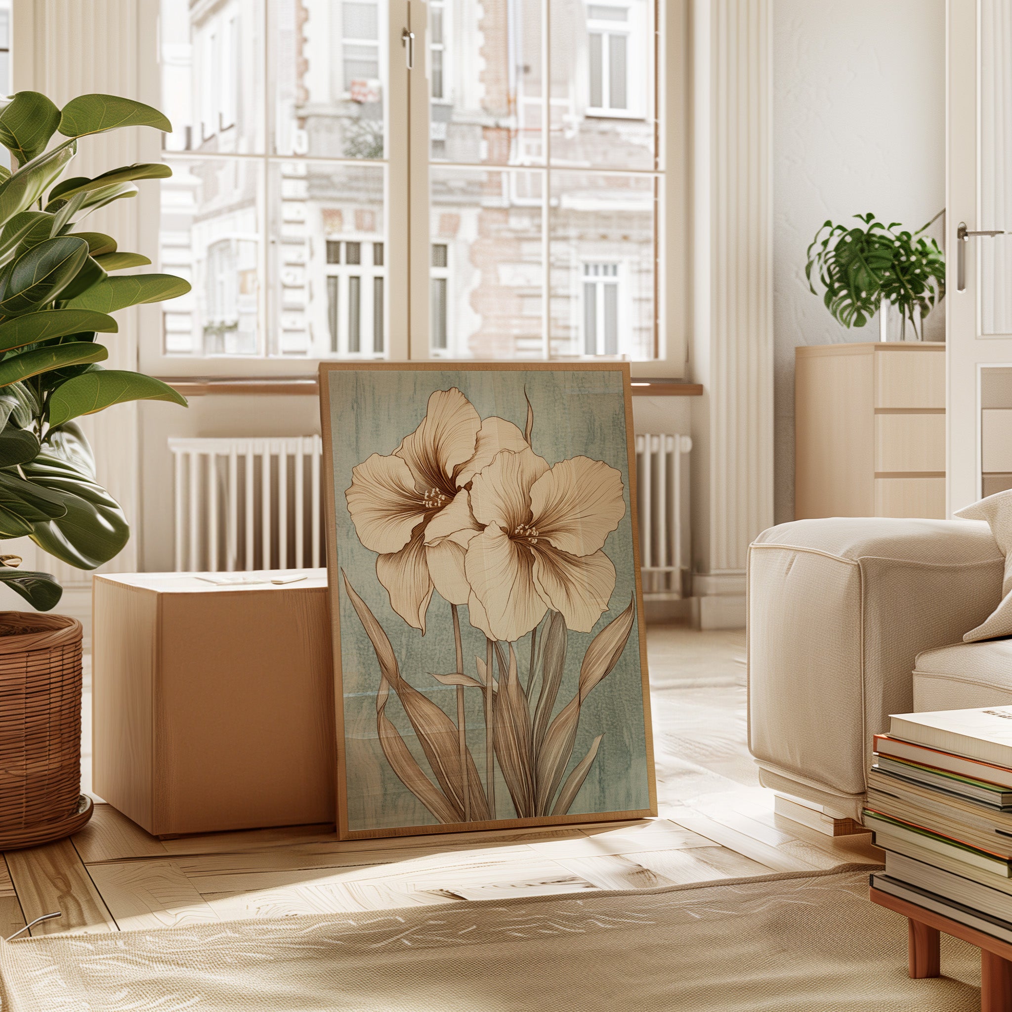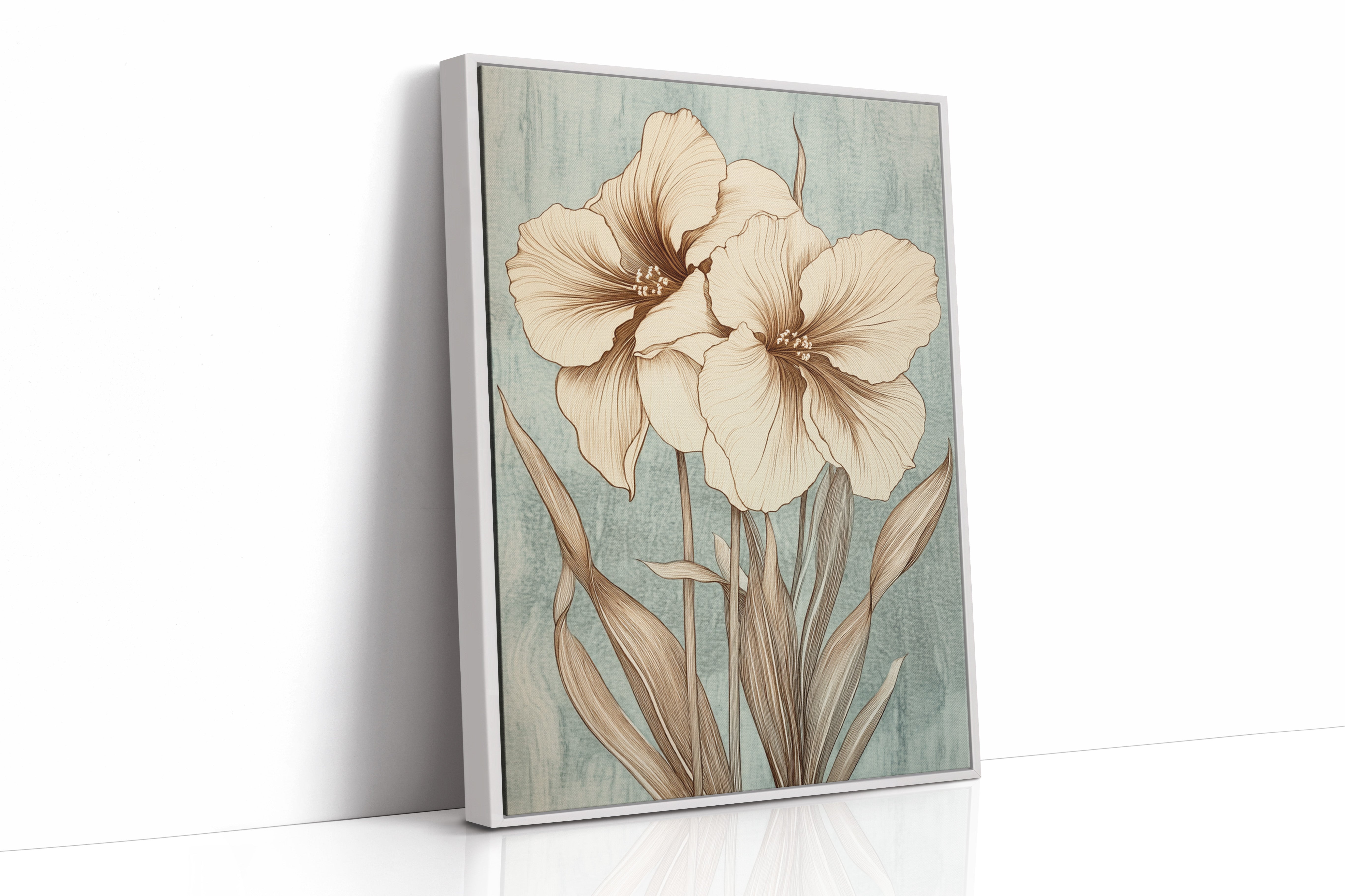 Delicate hibiscus blooms unfold their stories in gentle sepia tones, their petals as thin as ancient love letters. The intricate line work traces each vein and fold with the precision of a master botanist's sketch, while the soft sage background creates a dreamy atmosphere of dawn's first light. The composition captures the flowers in perfect symmetry, their stamens reaching outward like nature's own calligraphy. This elegant botanical study would bring sophisticated grace to a modern bedroom or create a serene focal point in a minimalist living space.