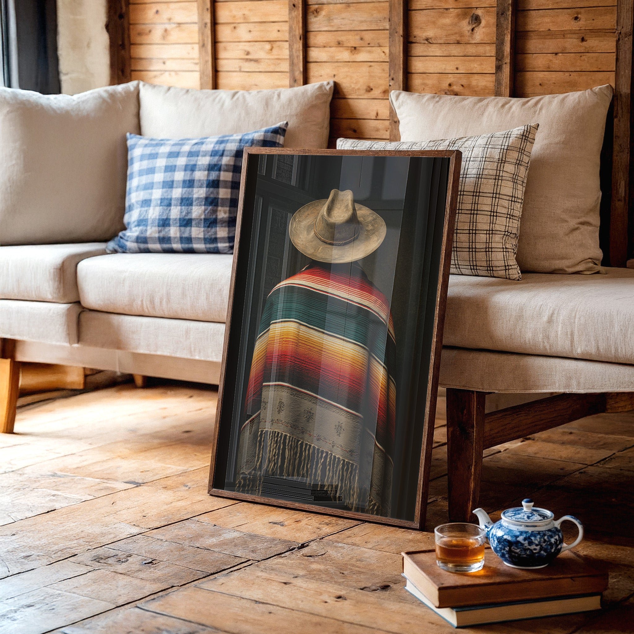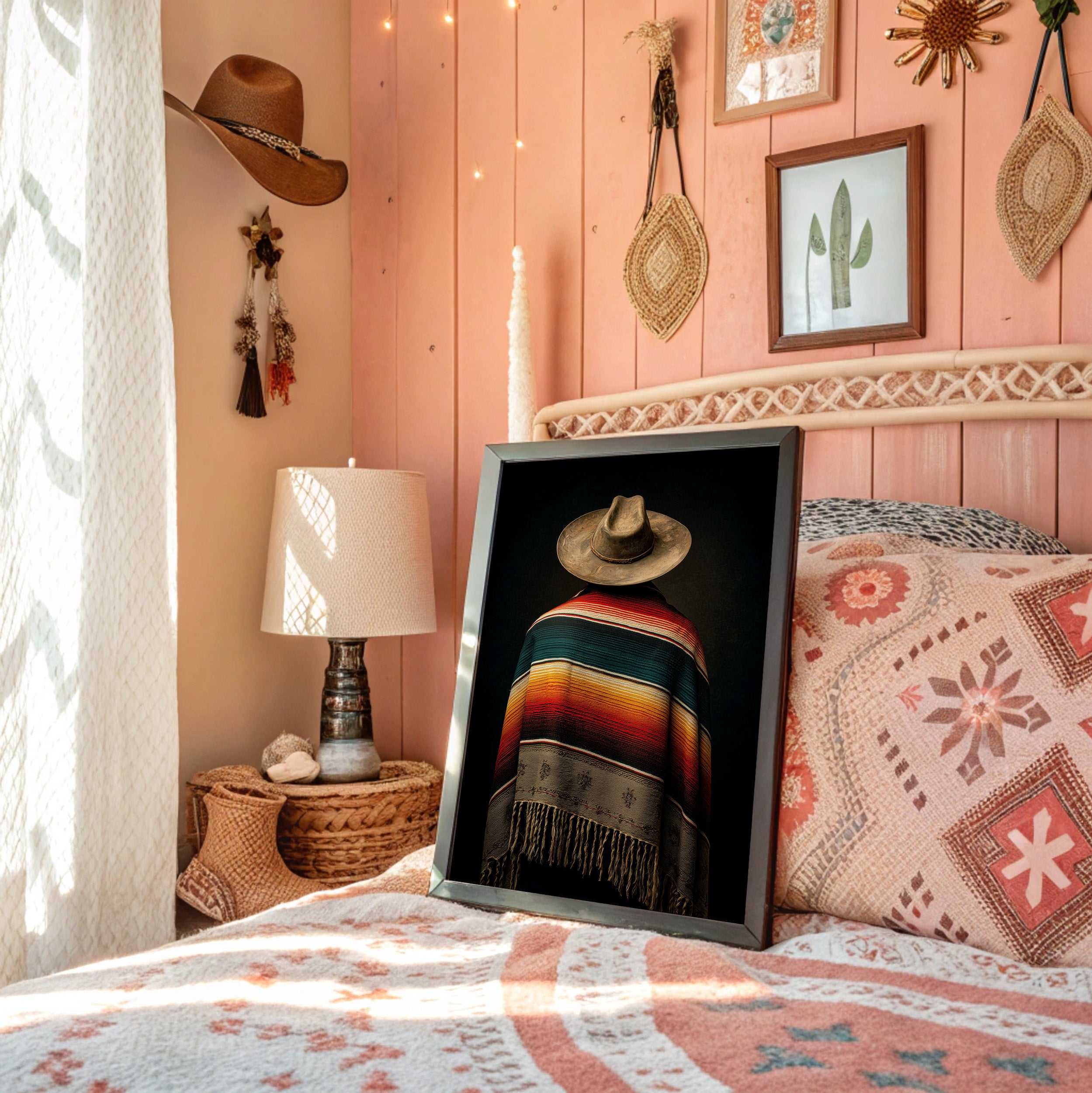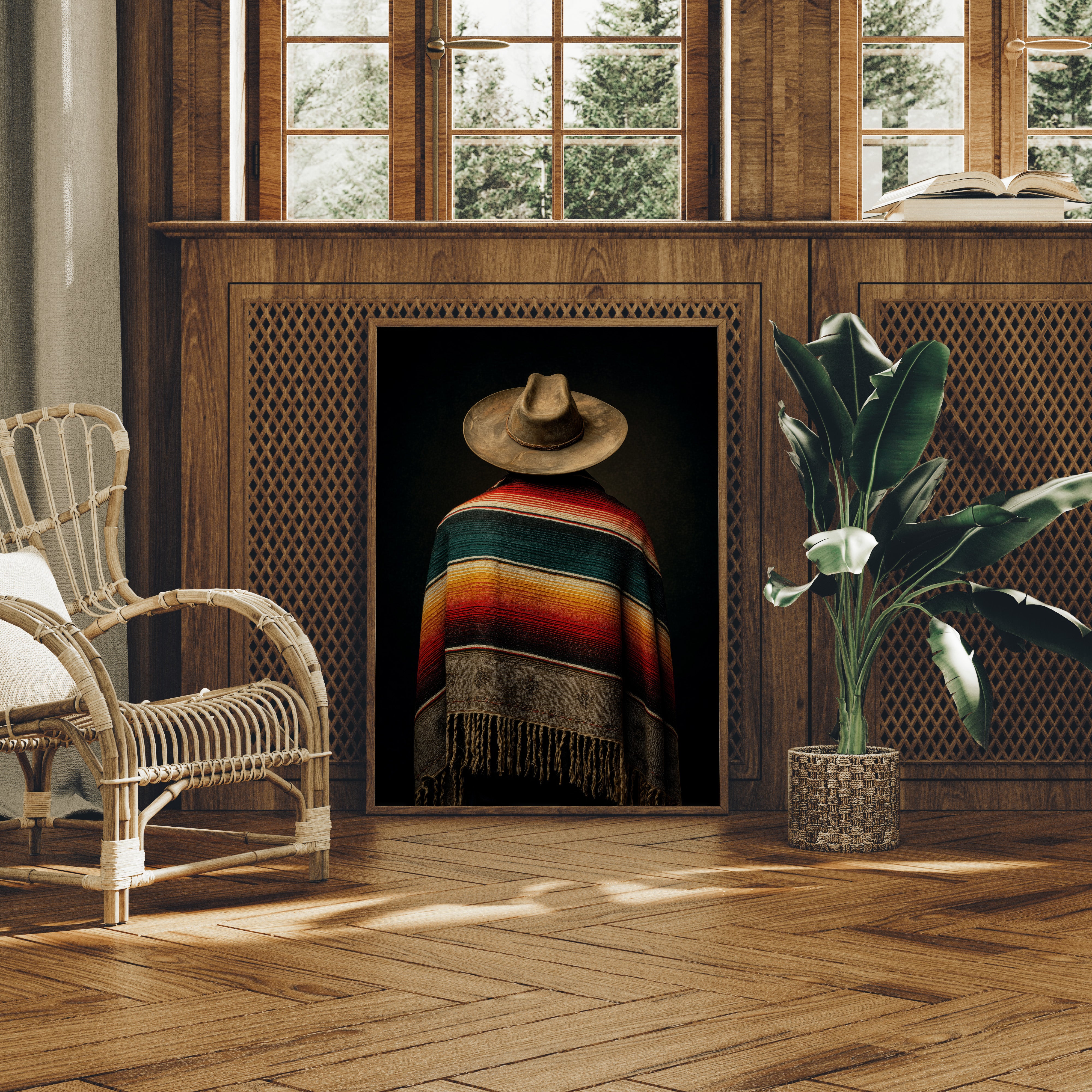 A lone hat floats mysteriously above a vibrant Mexican serape, creating an ethereal silhouette against the darkness. Rich sunset stripes of orange, yellow, and turquoise cascade down the traditional wool textile, their warmth echoing the spirit of the Southwest. Delicate fringe details and weathered textures tell tales of dusty trails and fireside gatherings. Perfect for a modern ranch house living room or a sophisticated Southwestern-inspired space where heritage meets contemporary design.