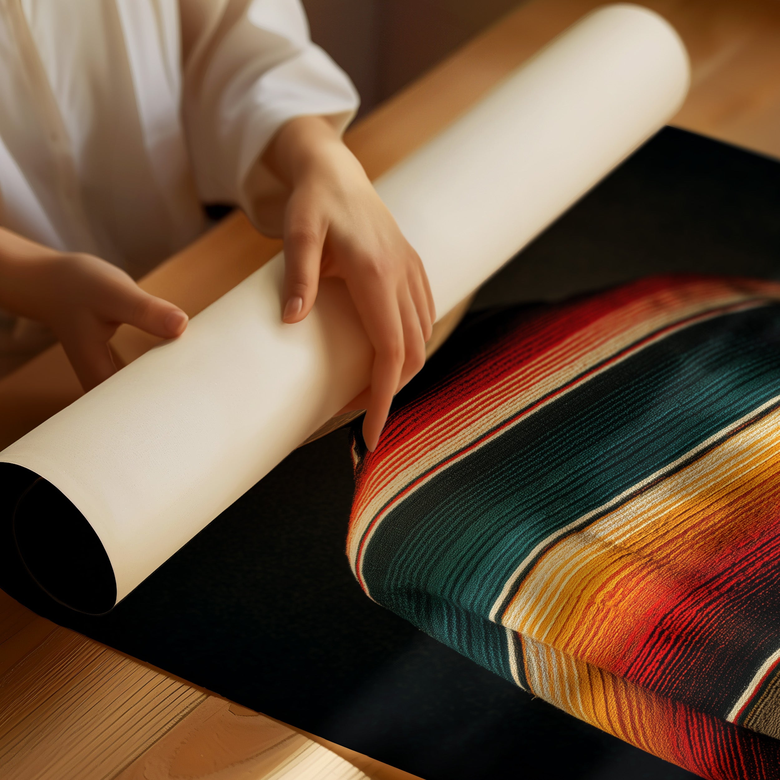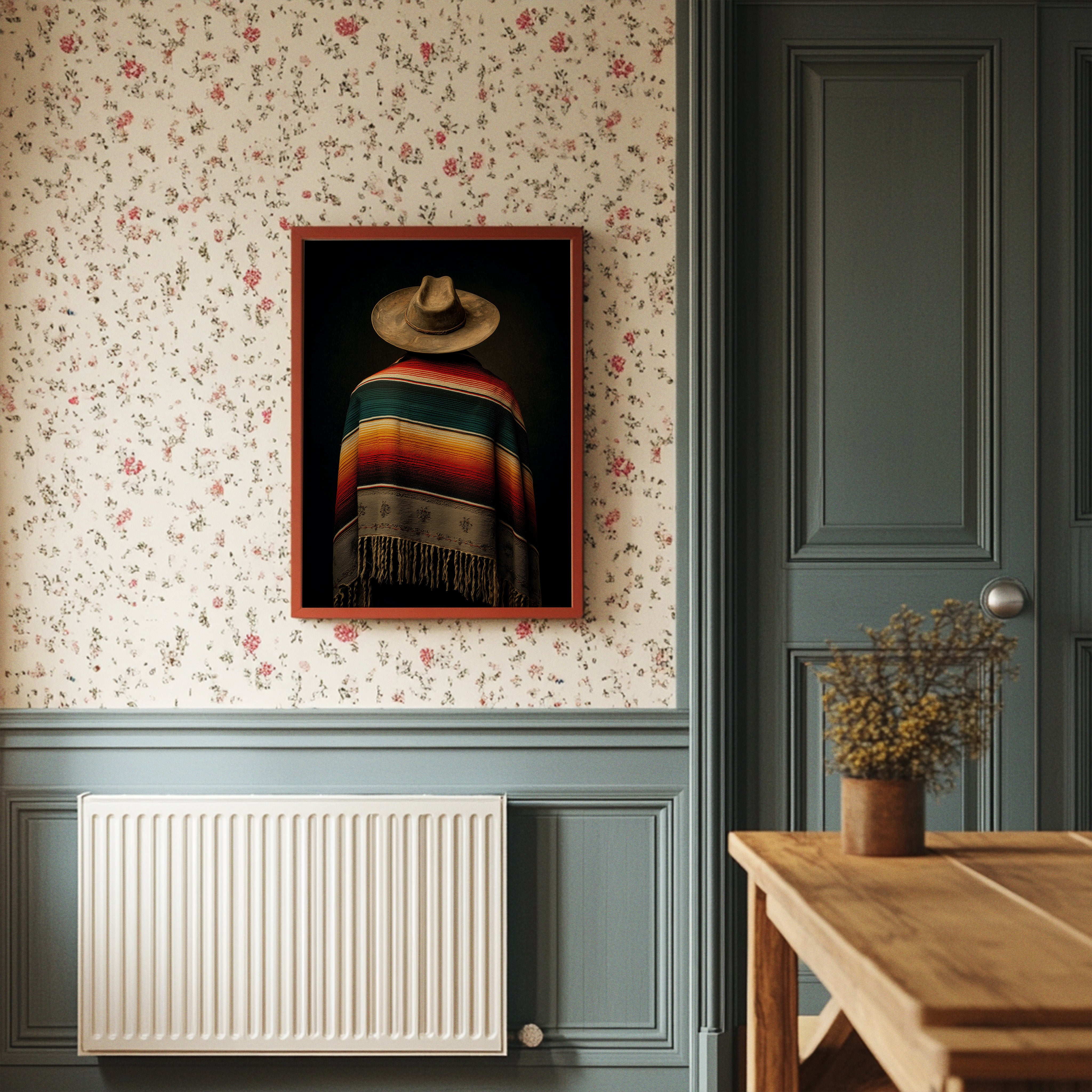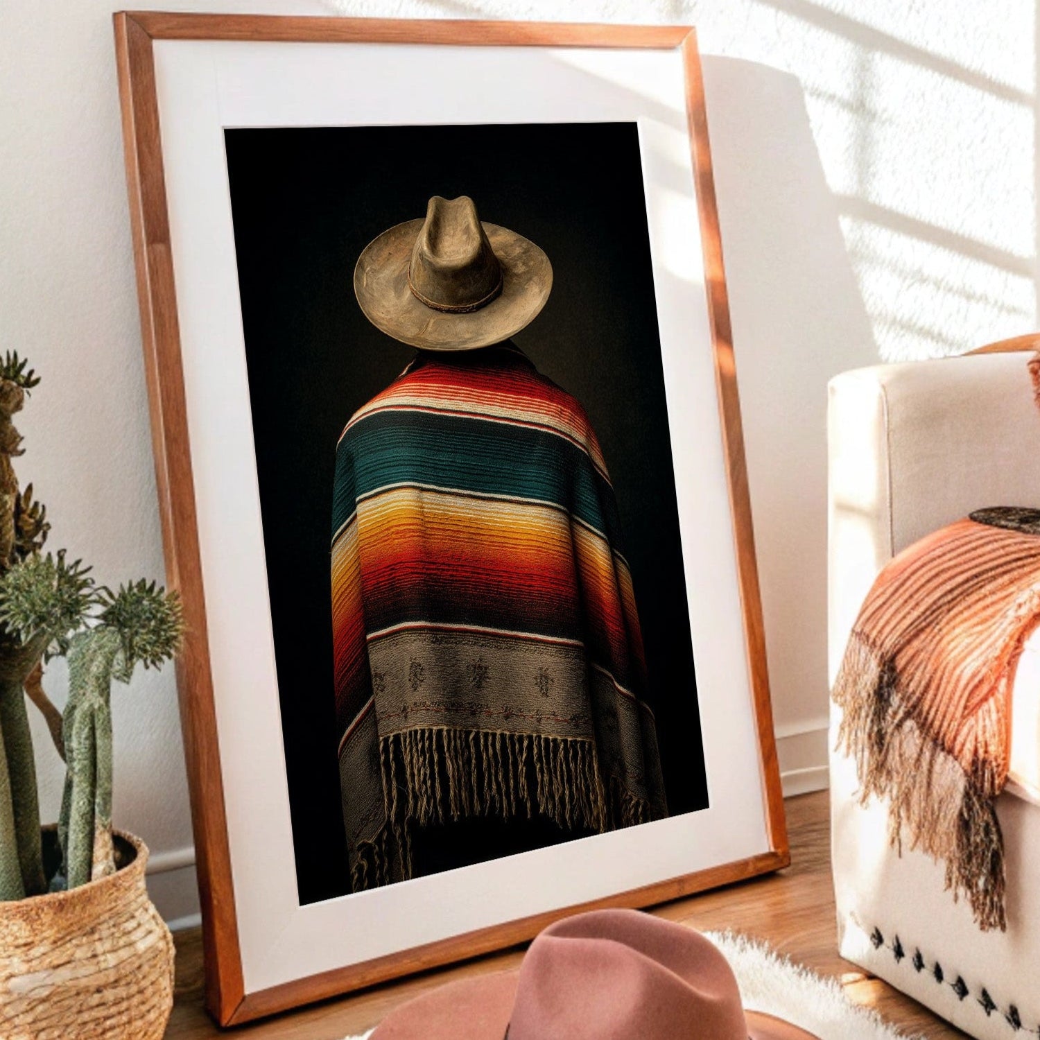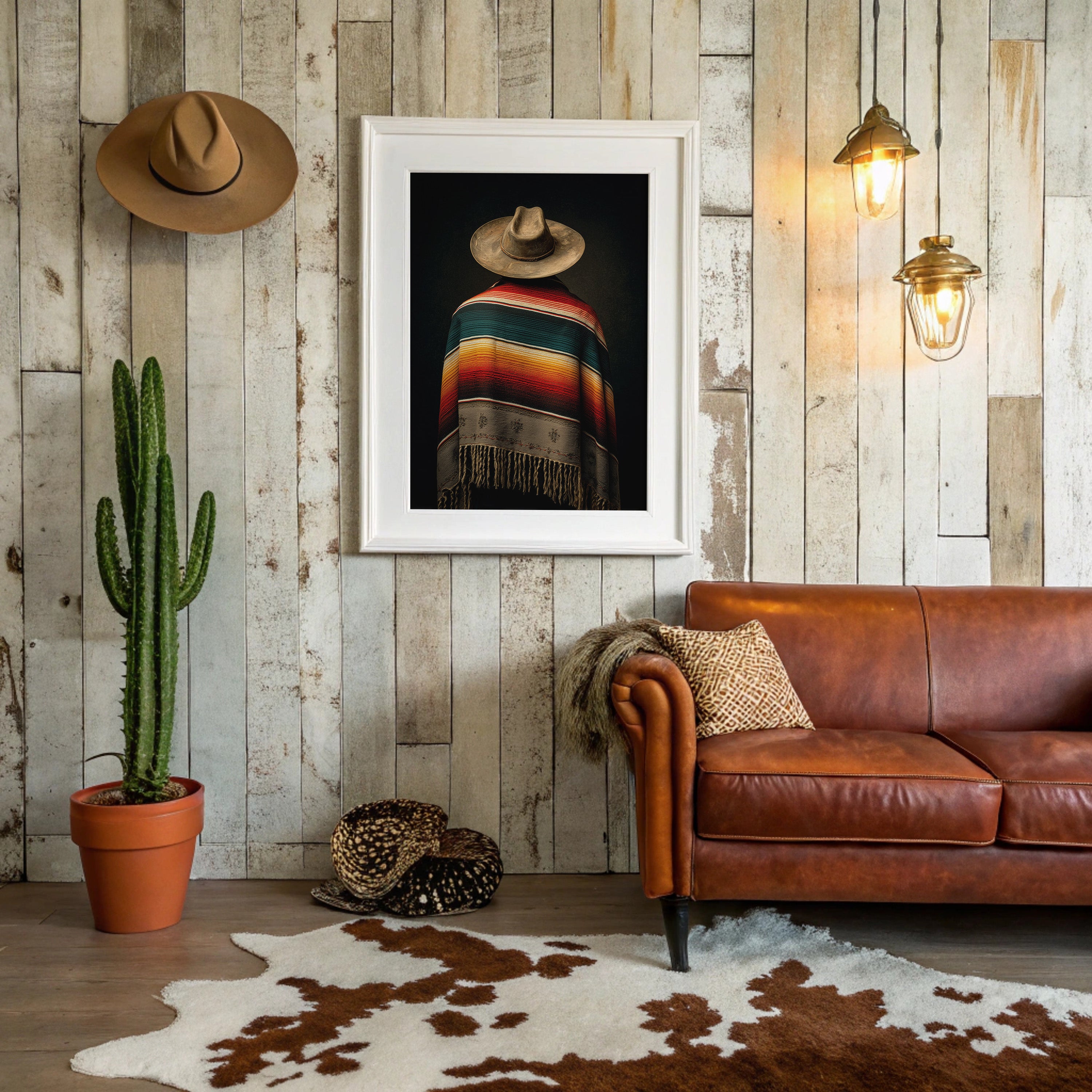 A lone hat floats mysteriously above a vibrant Mexican serape, creating an ethereal silhouette against the darkness. Rich sunset stripes of orange, yellow, and turquoise cascade down the traditional wool textile, their warmth echoing the spirit of the Southwest. Delicate fringe details and weathered textures tell tales of dusty trails and fireside gatherings. Perfect for a modern ranch house living room or a sophisticated Southwestern-inspired space where heritage meets contemporary design.