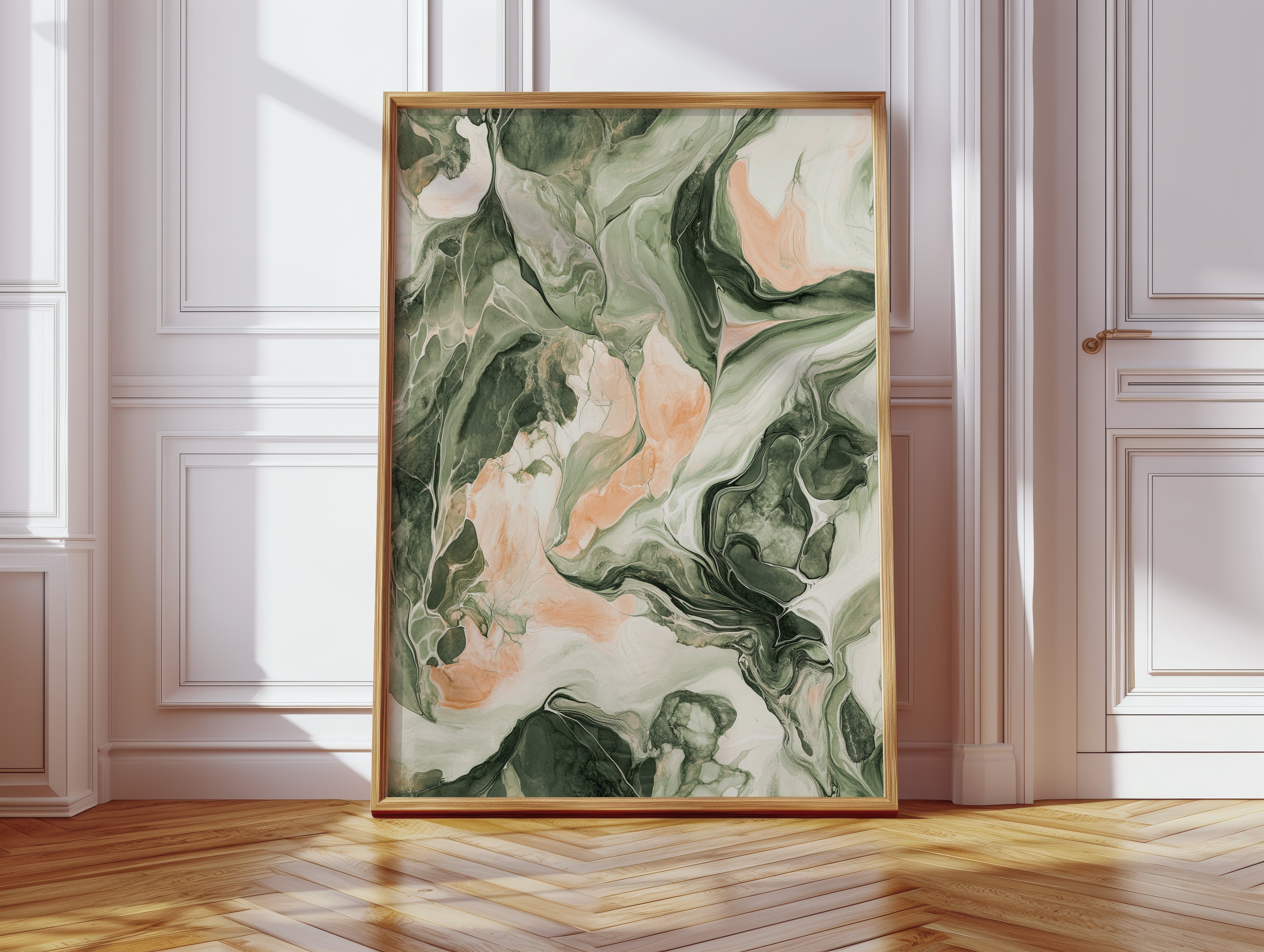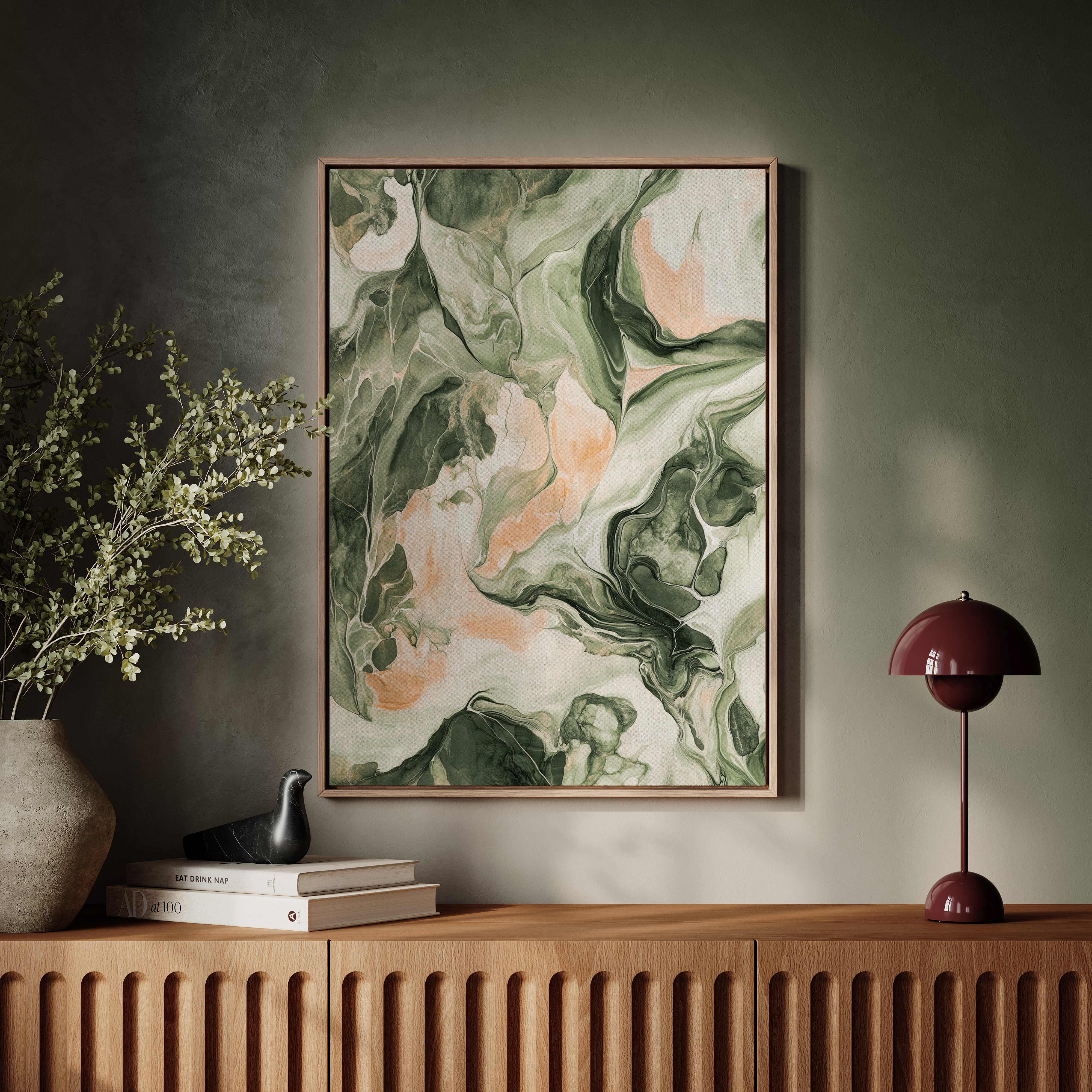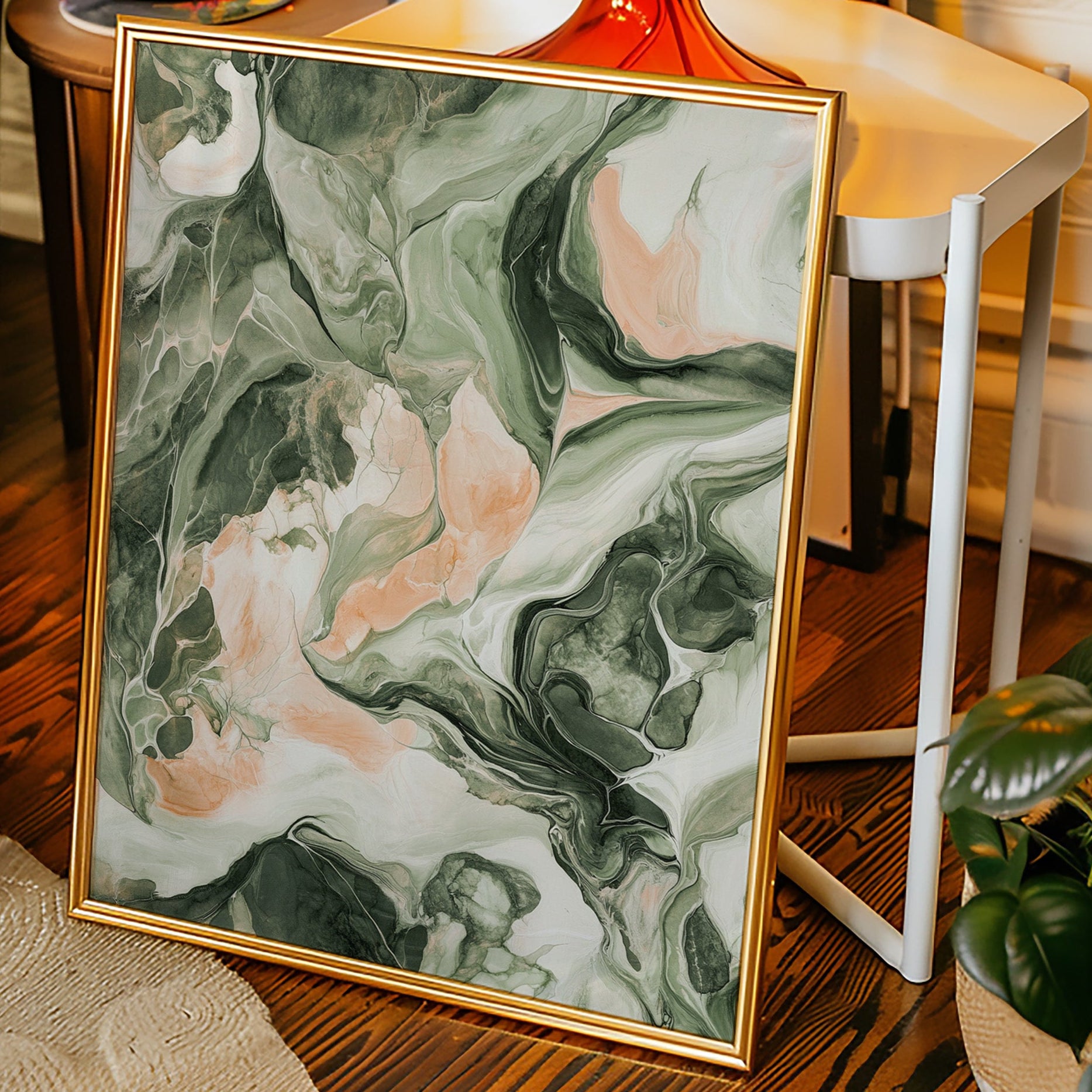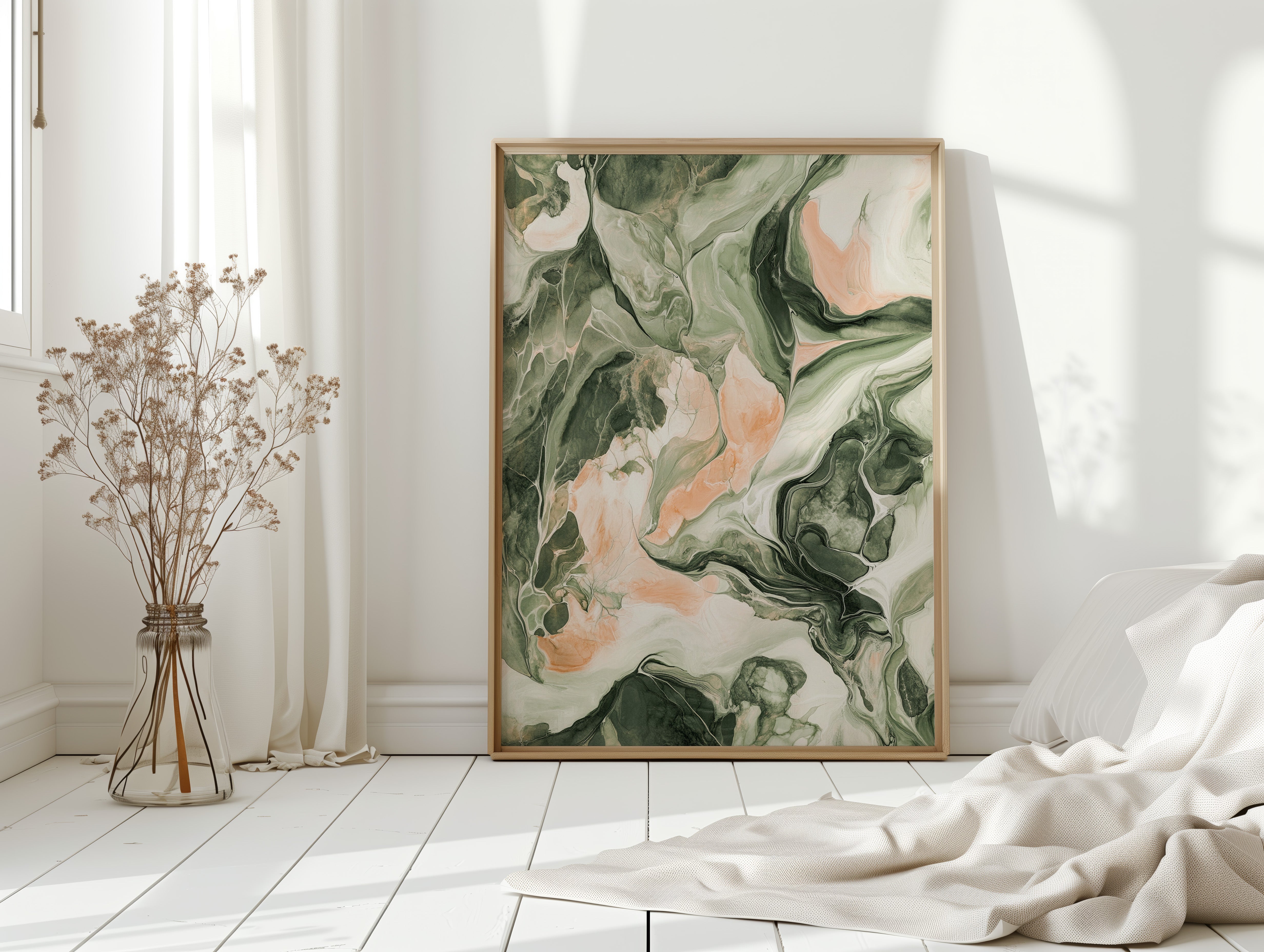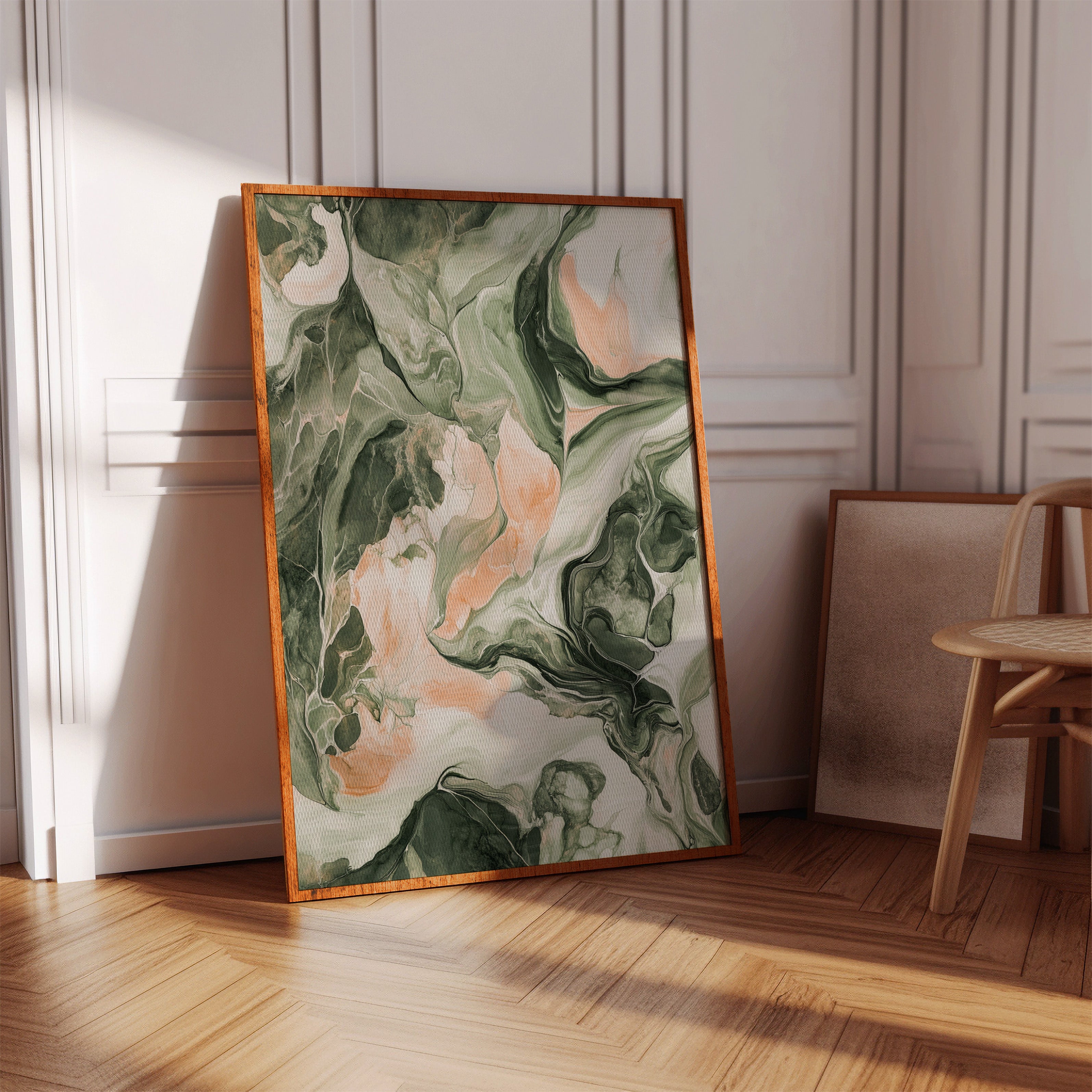 This abstract piece blends muted sage, forest green, and soft blush tones in fluid marble patterns that mimic the textures of stone and the flow of water. A serene yet striking design, perfect for elevating contemporary interiors with organic elegance and warmth.