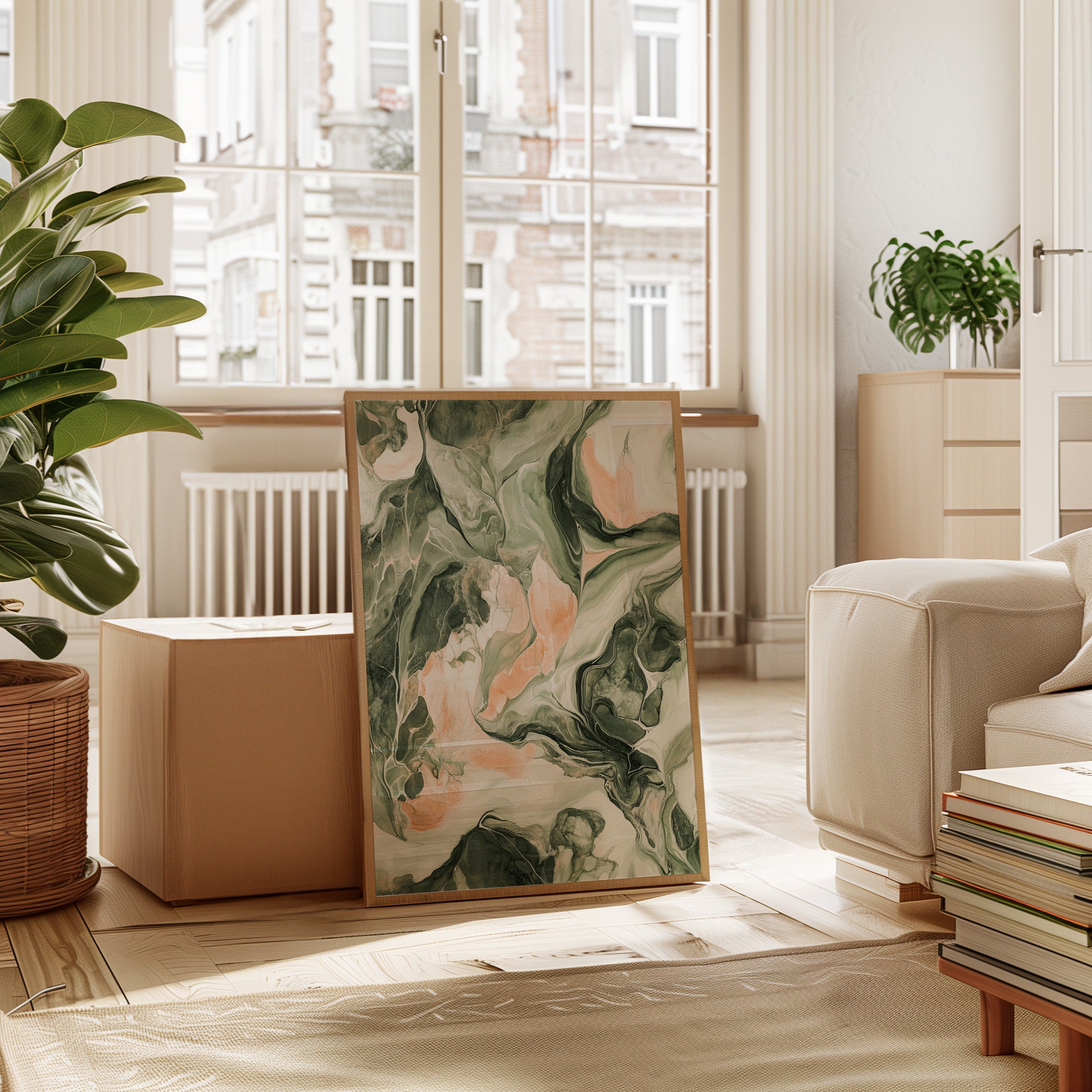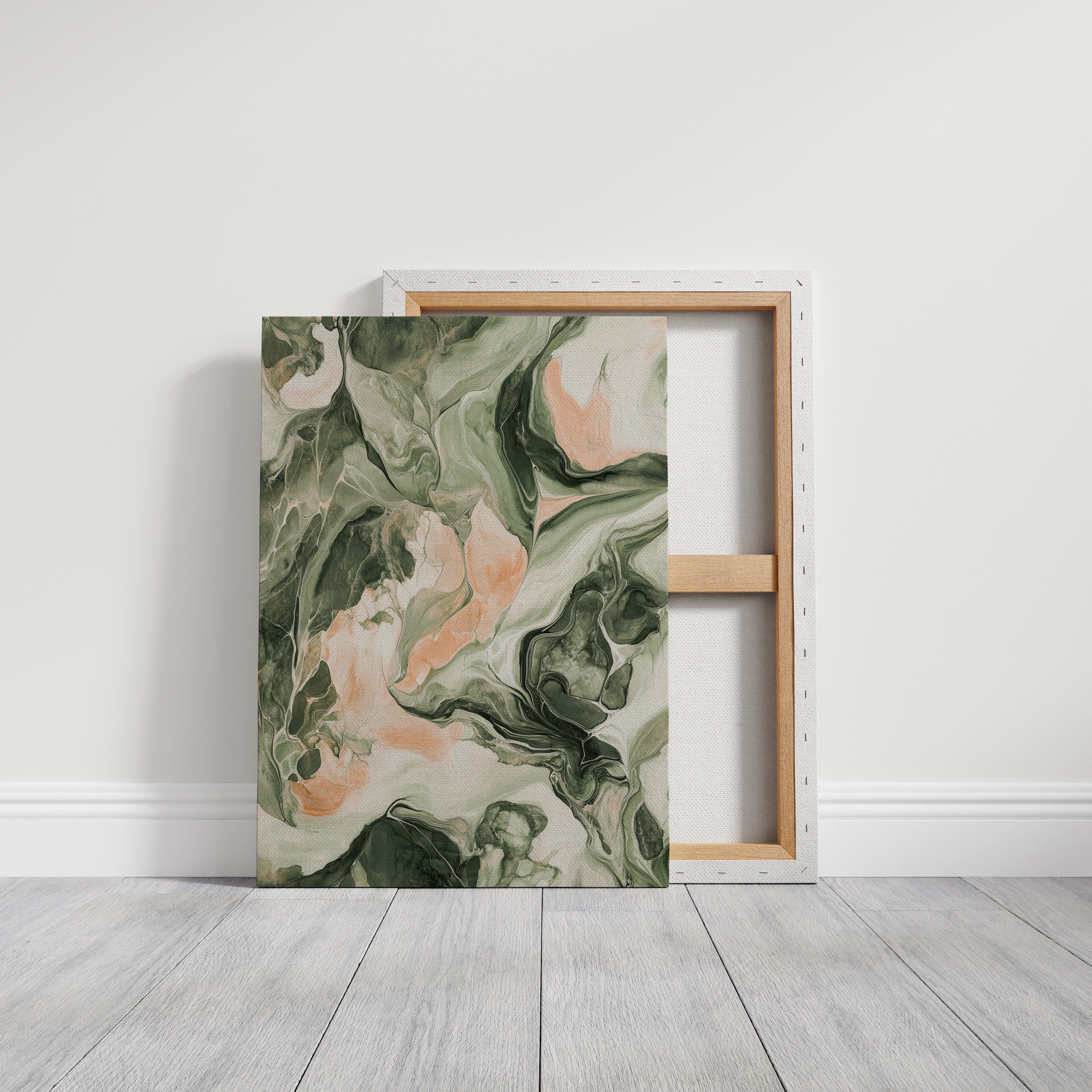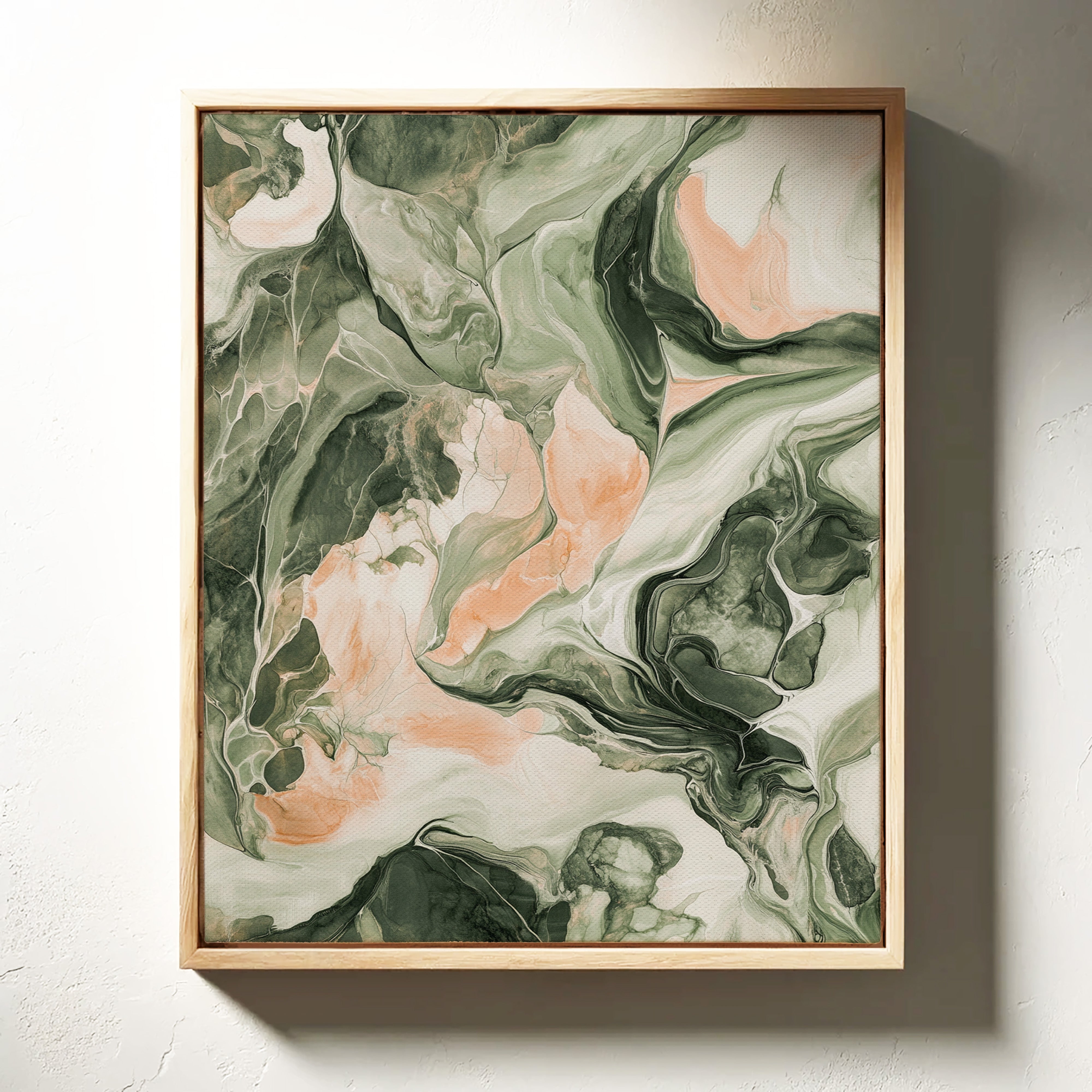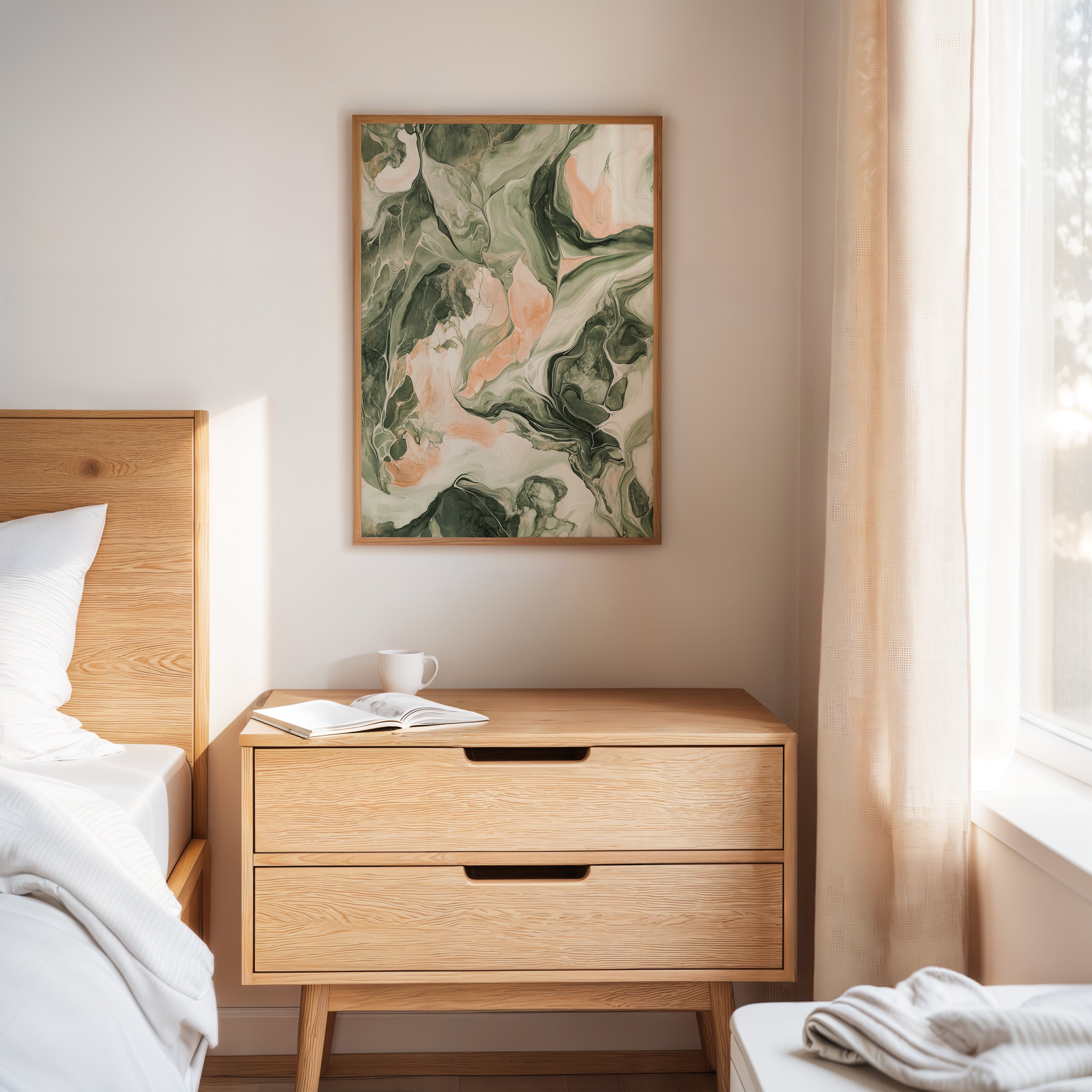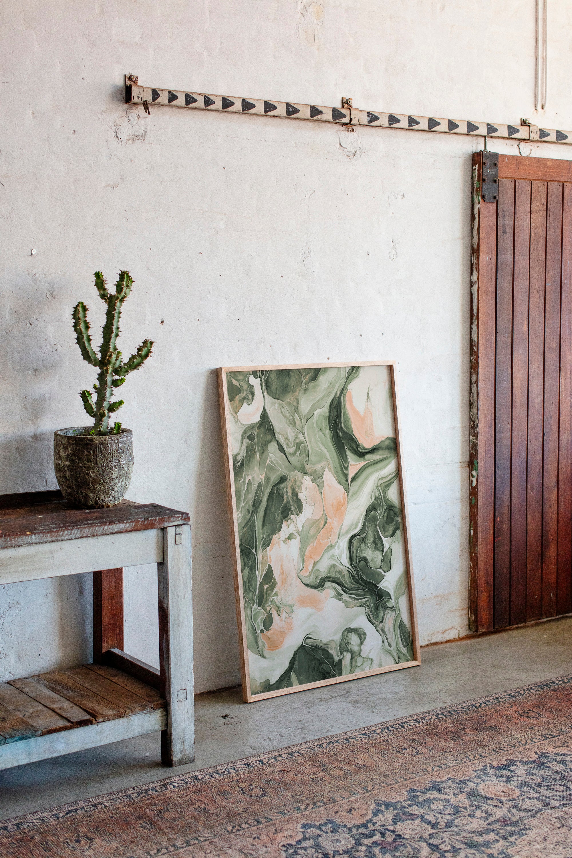 This abstract piece blends muted sage, forest green, and soft blush tones in fluid marble patterns that mimic the textures of stone and the flow of water. A serene yet striking design, perfect for elevating contemporary interiors with organic elegance and warmth.