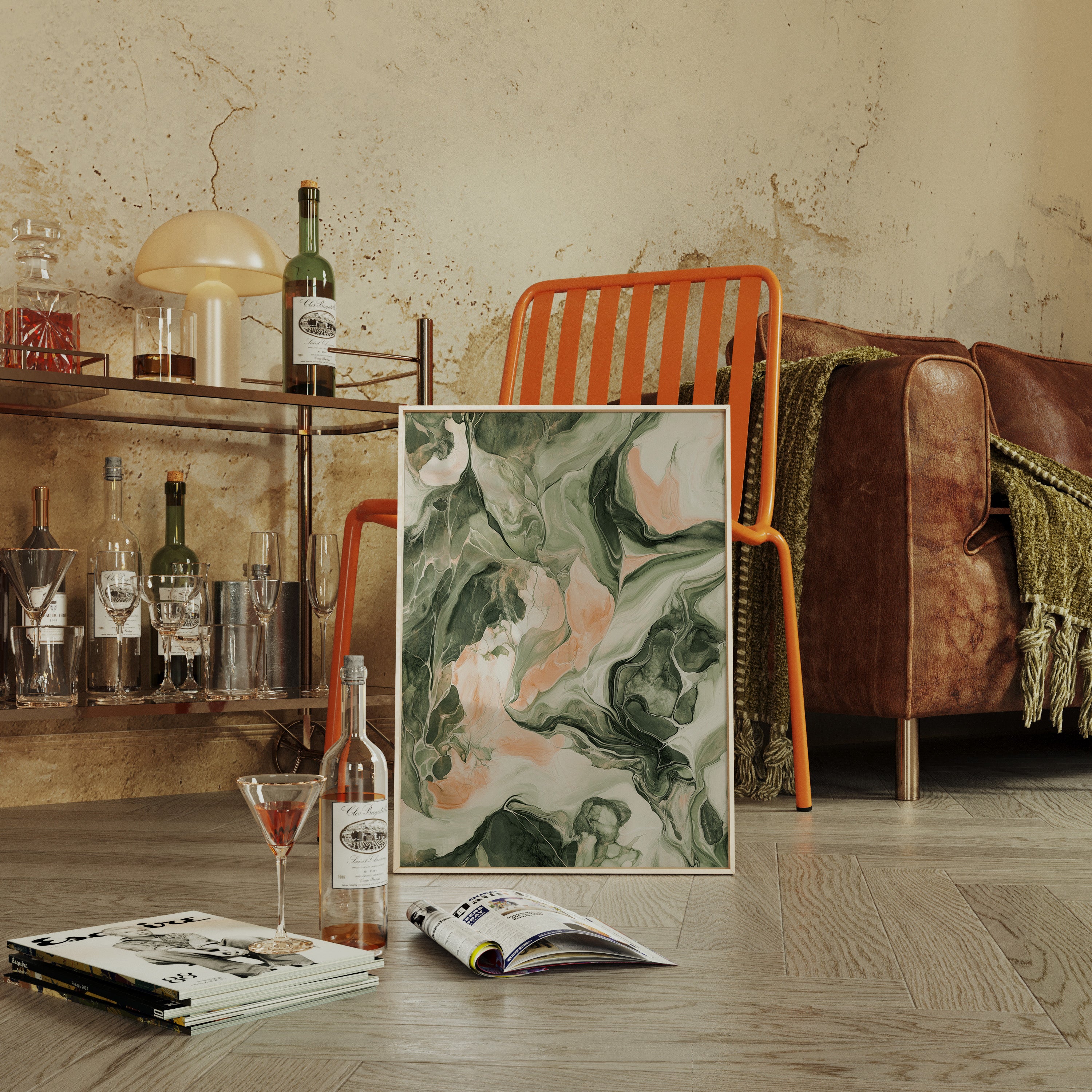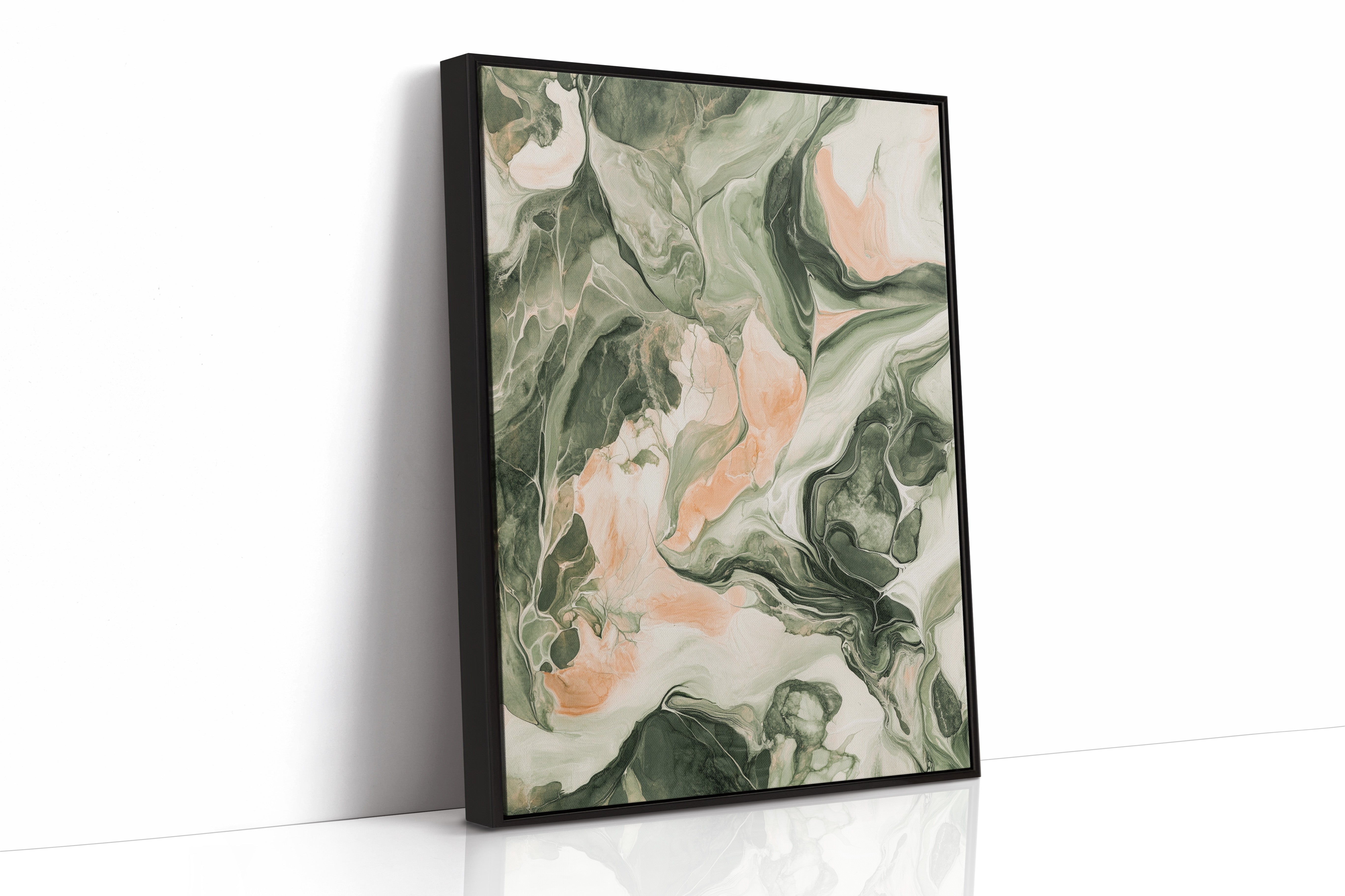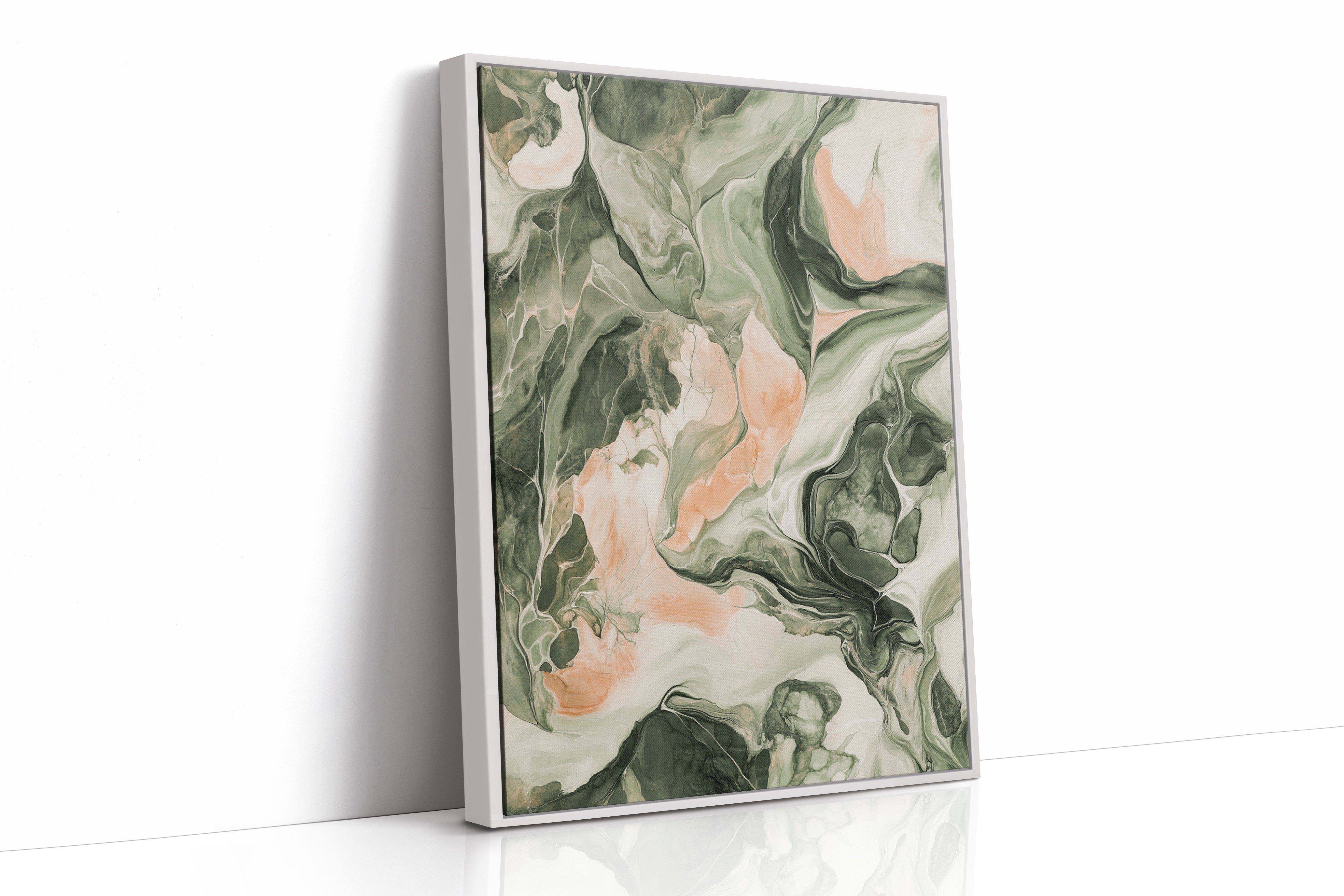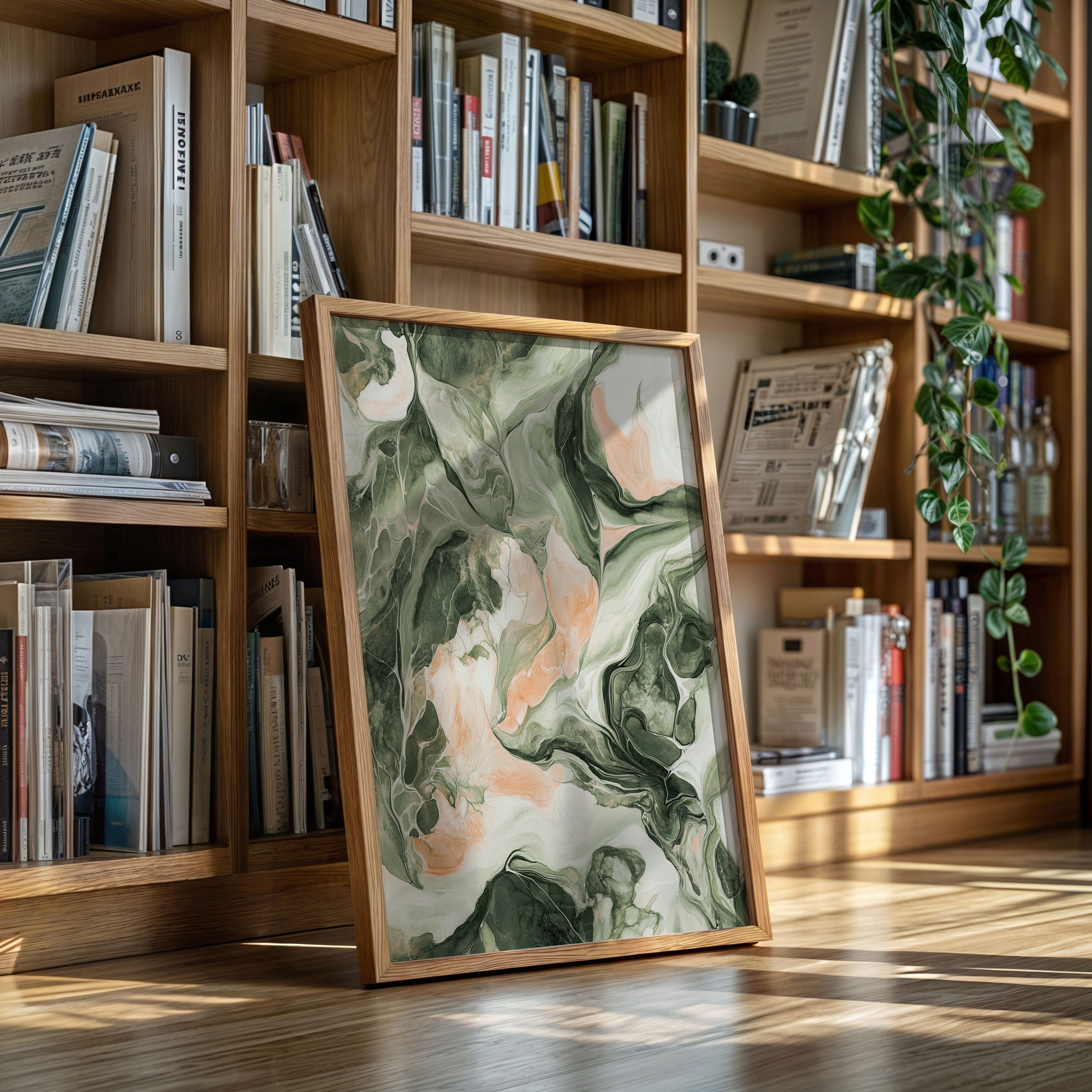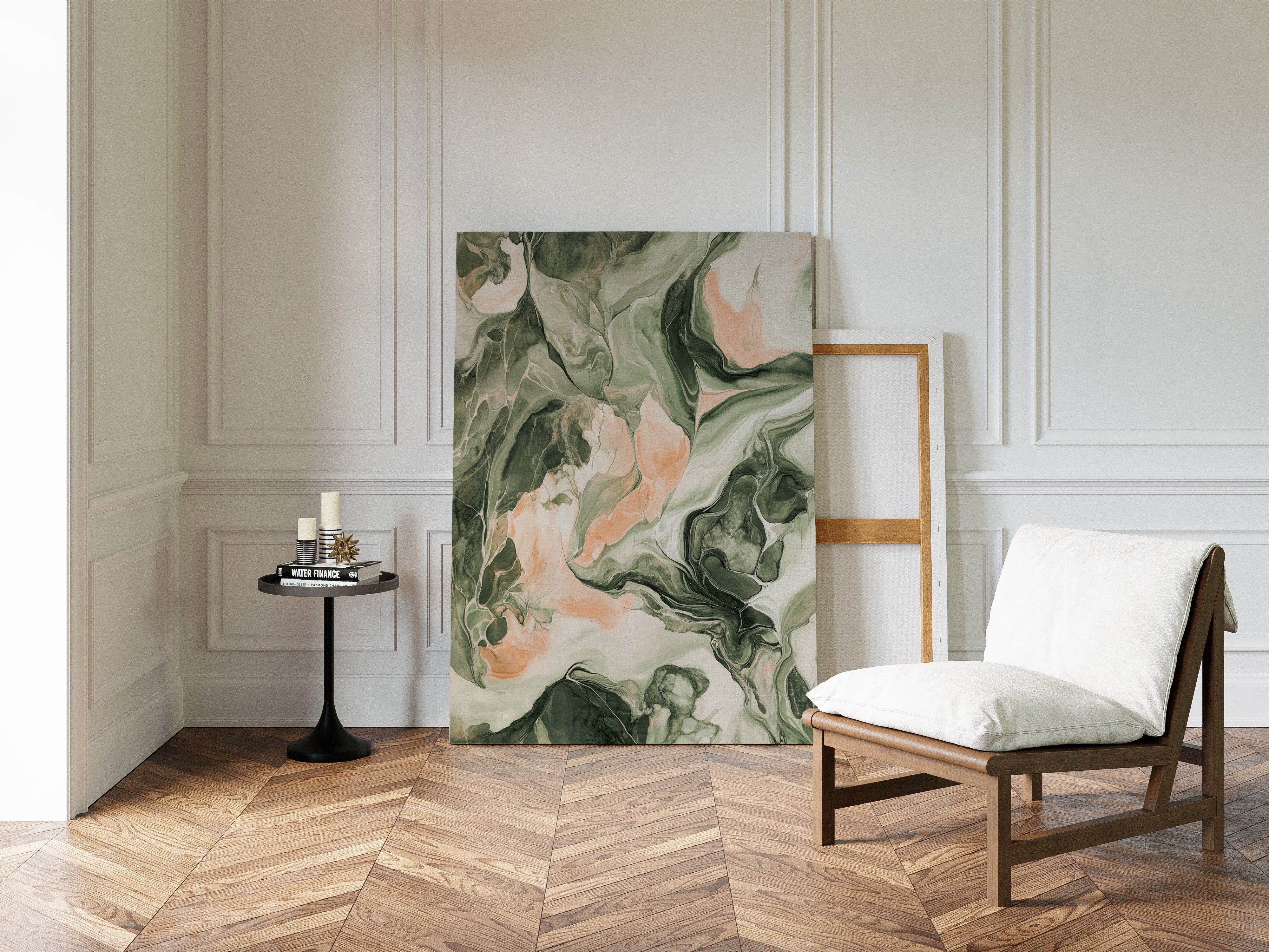 This abstract piece blends muted sage, forest green, and soft blush tones in fluid marble patterns that mimic the textures of stone and the flow of water. A serene yet striking design, perfect for elevating contemporary interiors with organic elegance and warmth.