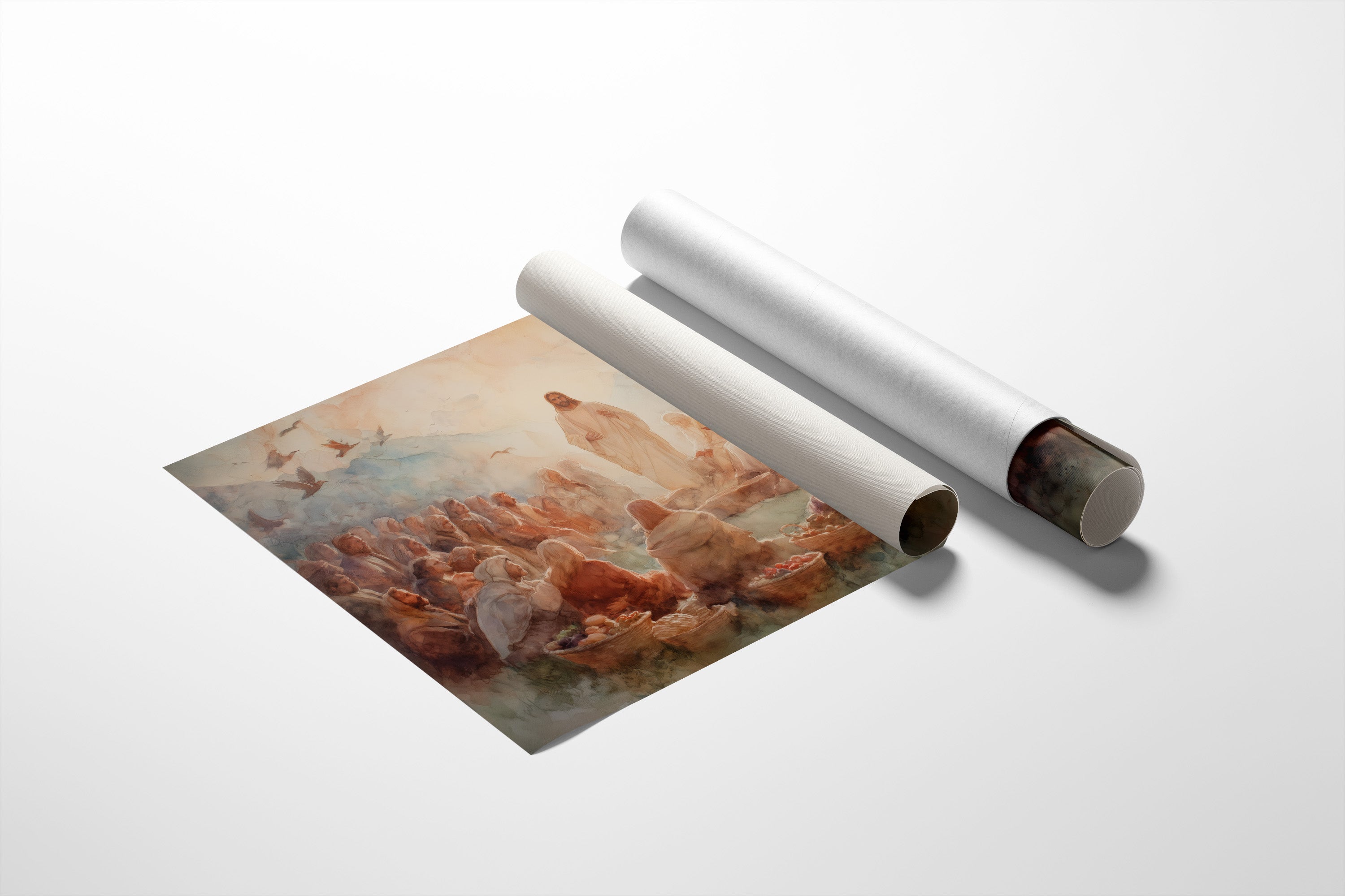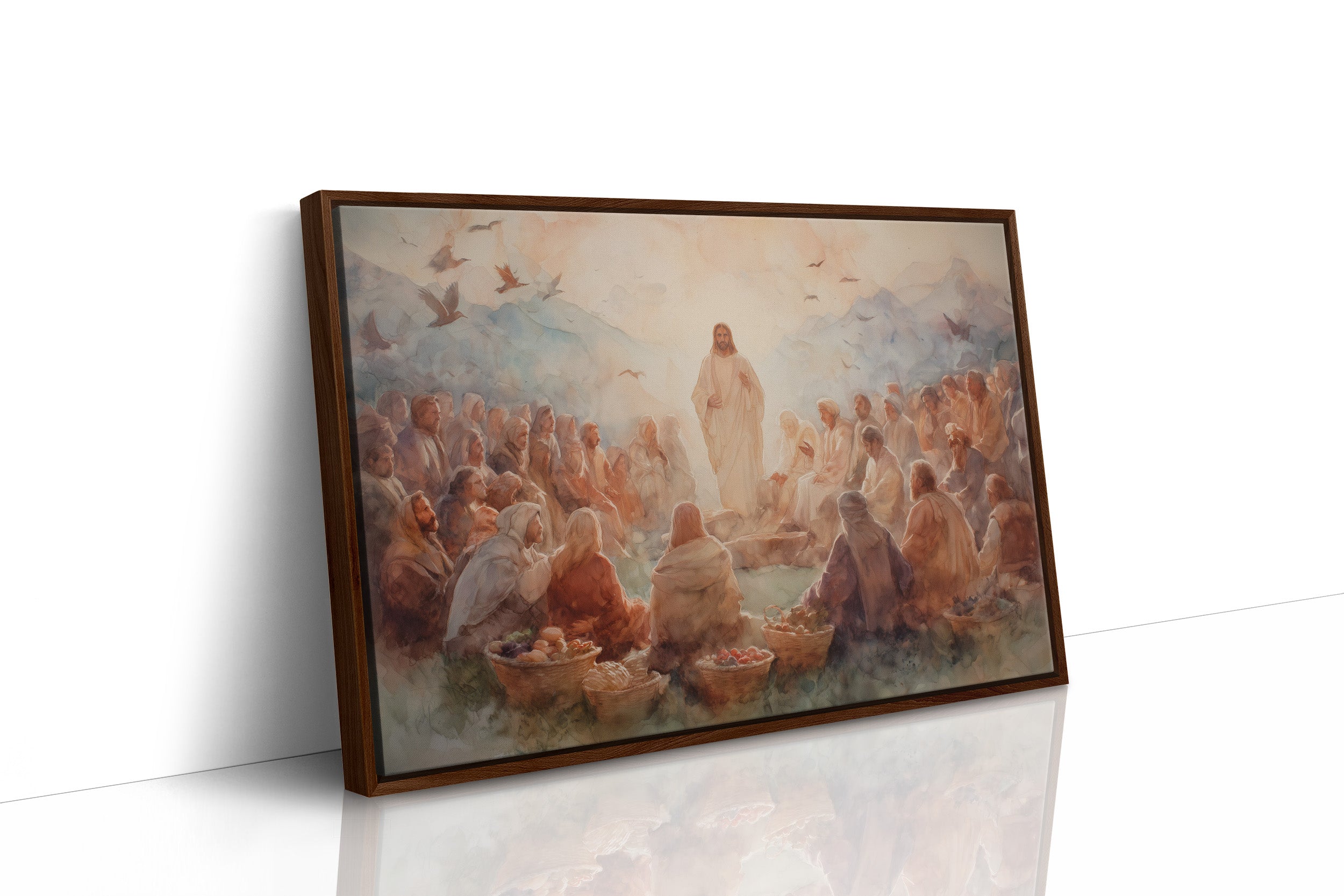 Soft golden light bathes a scene of reverence and peace, drawing the eye to a central figure surrounded by attentive listeners. The watercolor-like painting blends warm earth tones with ethereal blues, creating a timeless moment where humanity connects with divinity. Baskets of abundance rest at feet while birds soar overhead, symbolizing freedom and transcendence against distant mountains. This contemplative piece brings spiritual warmth to a home library, reading nook, or meditation space.