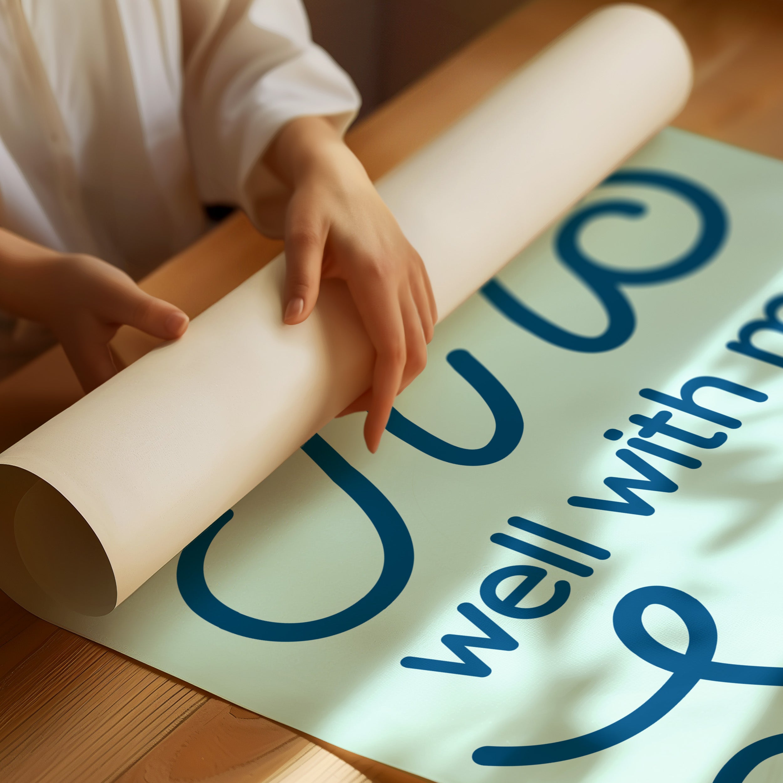 Deep navy script flows gracefully against a tranquil mint backdrop, offering a moment of peaceful affirmation. The elegant cursive letters dance across the space with a confident rhythm, their fluid lines creating a sense of calm resolve and inner strength. This contemplative piece brings a touch of mindful serenity to any personal sanctuary.