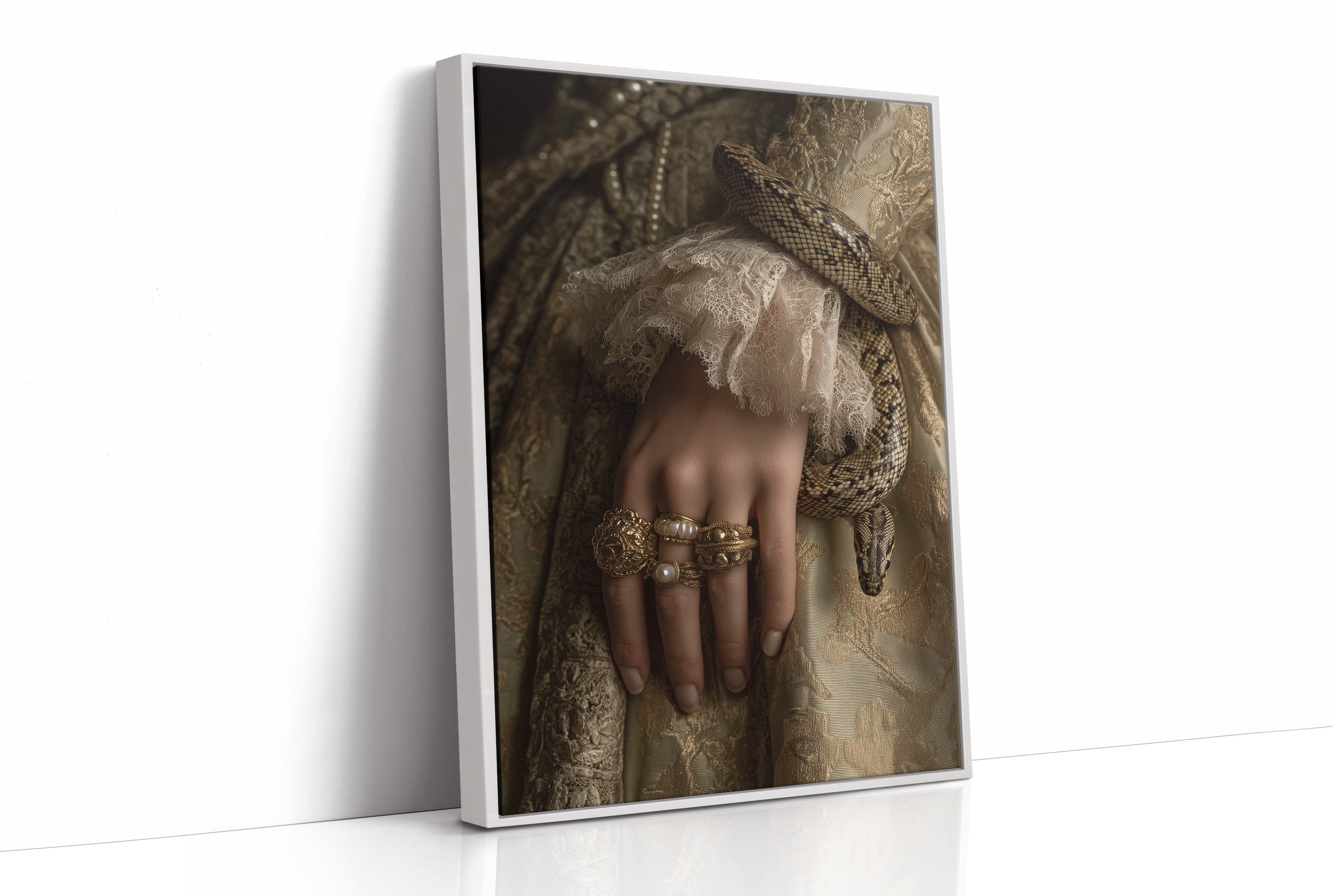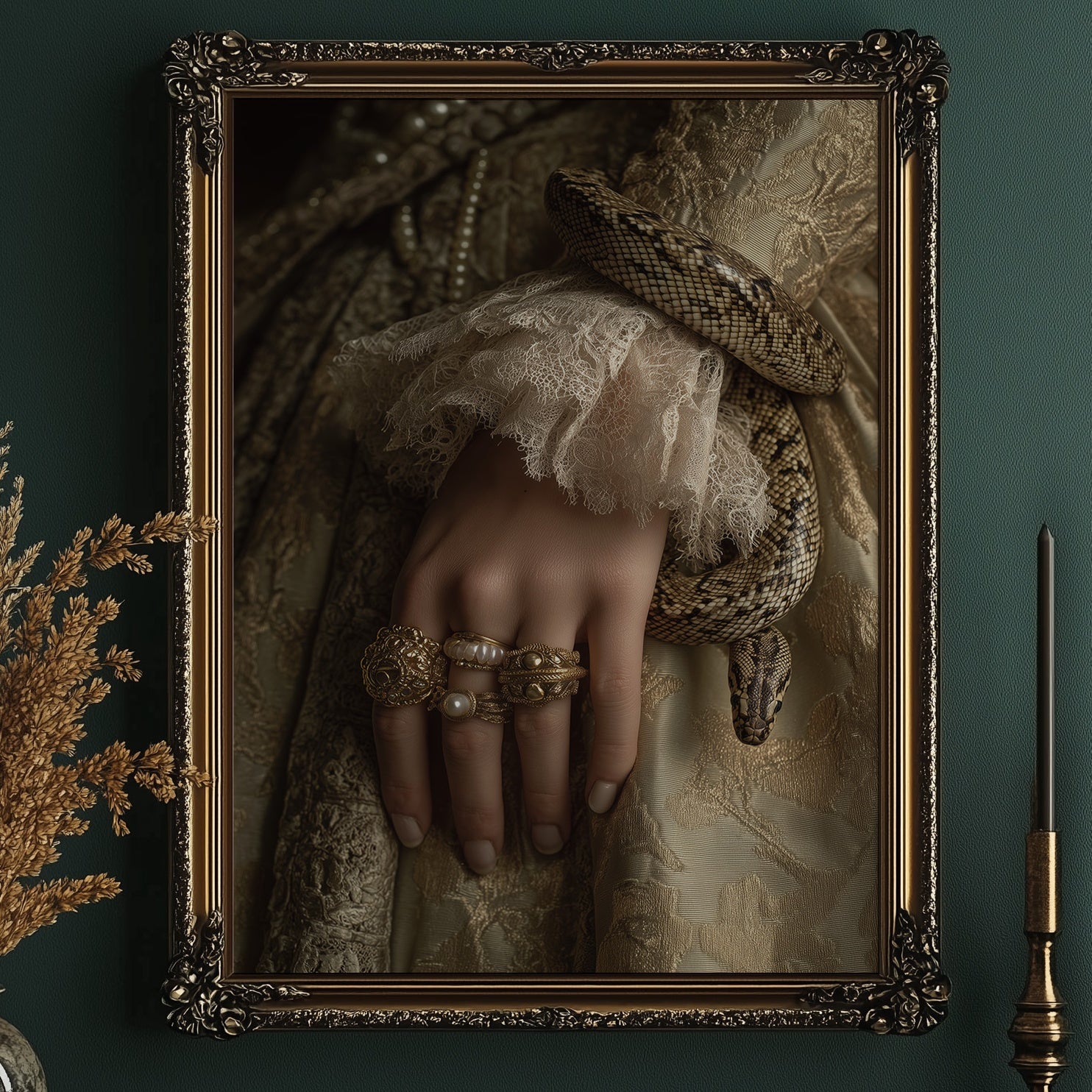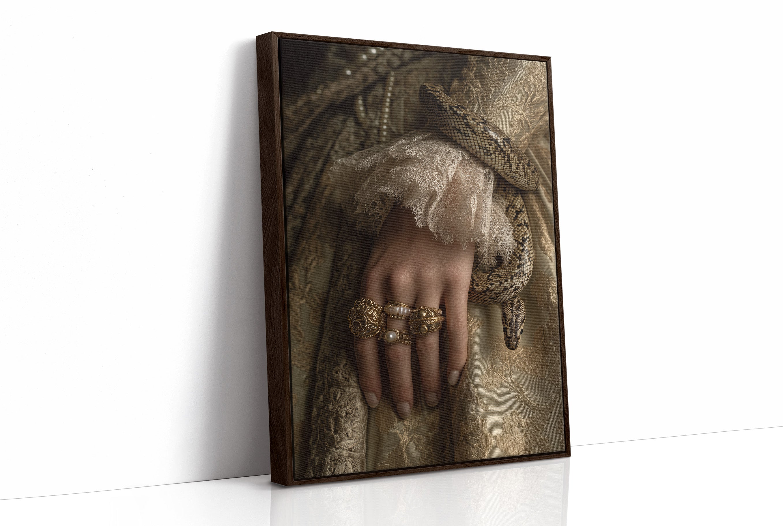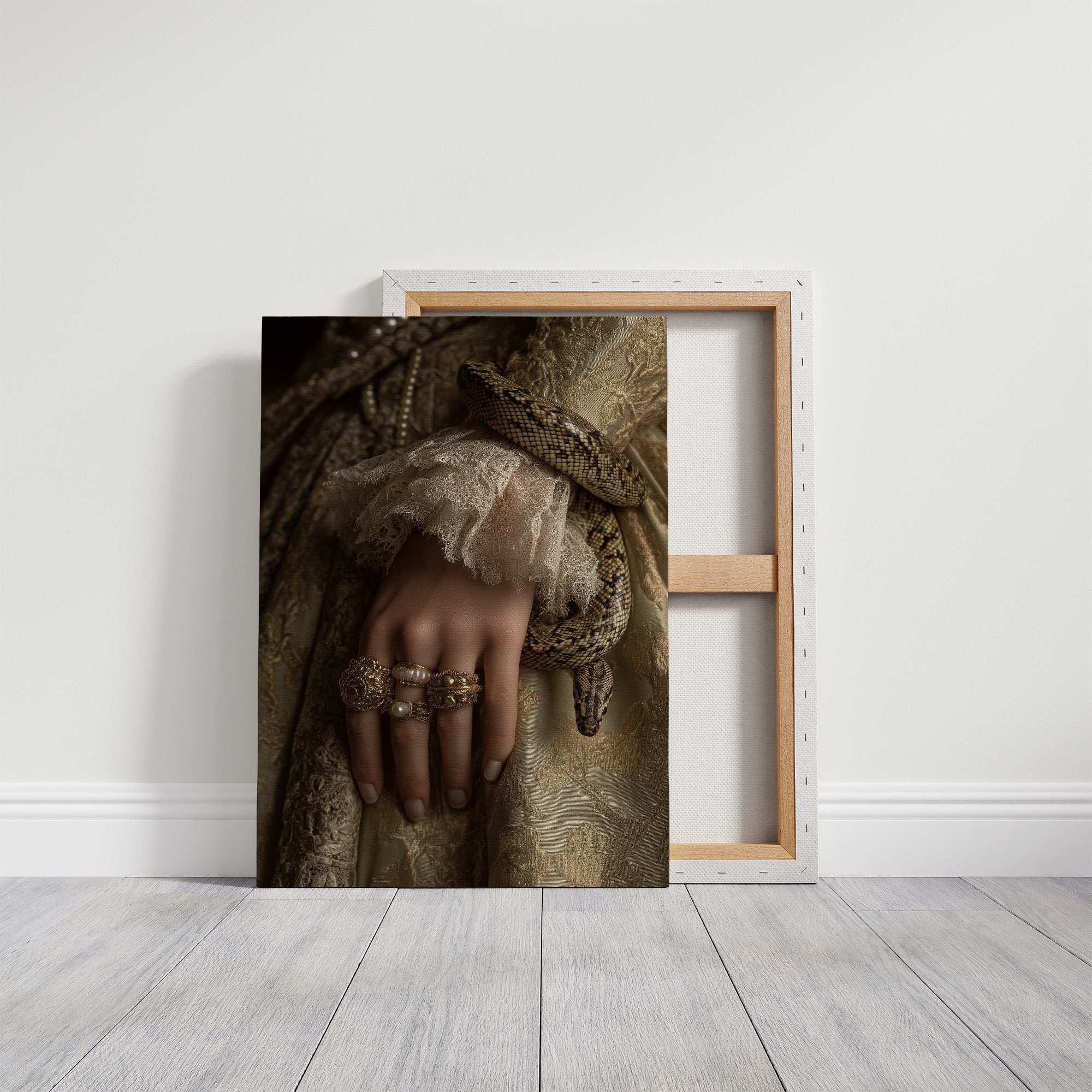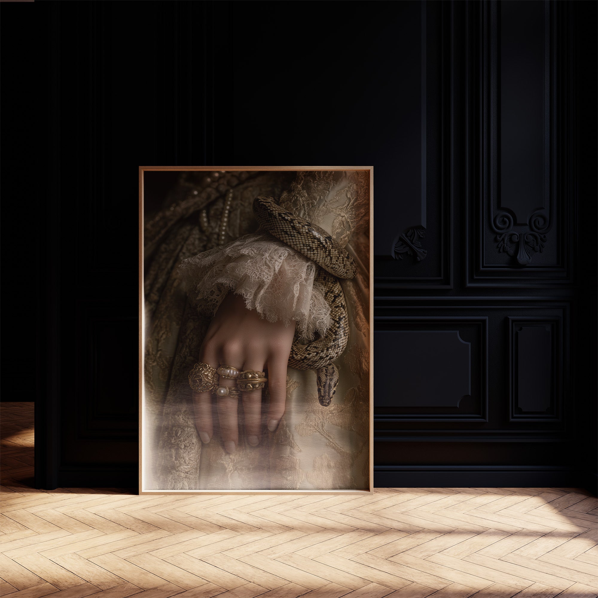 Danger and opulence intertwine in this haunting moment frozen in time. A serpent winds deliberately around a delicate wrist adorned with gold and pearls, creating a striking contrast against the soft ivory lace. The sepia-toned palette evokes a sense of forgotten aristocracy, where beauty and peril existed in the same breath, telling stories of forbidden allure and Victorian mystique. This striking piece commands attention in spaces that celebrate the unconventional. Perfect for a sophisticated study, dramatic dining room, or as the centerpiece in a maximalist interior where its rich narrative can spark conversation and intrigue.