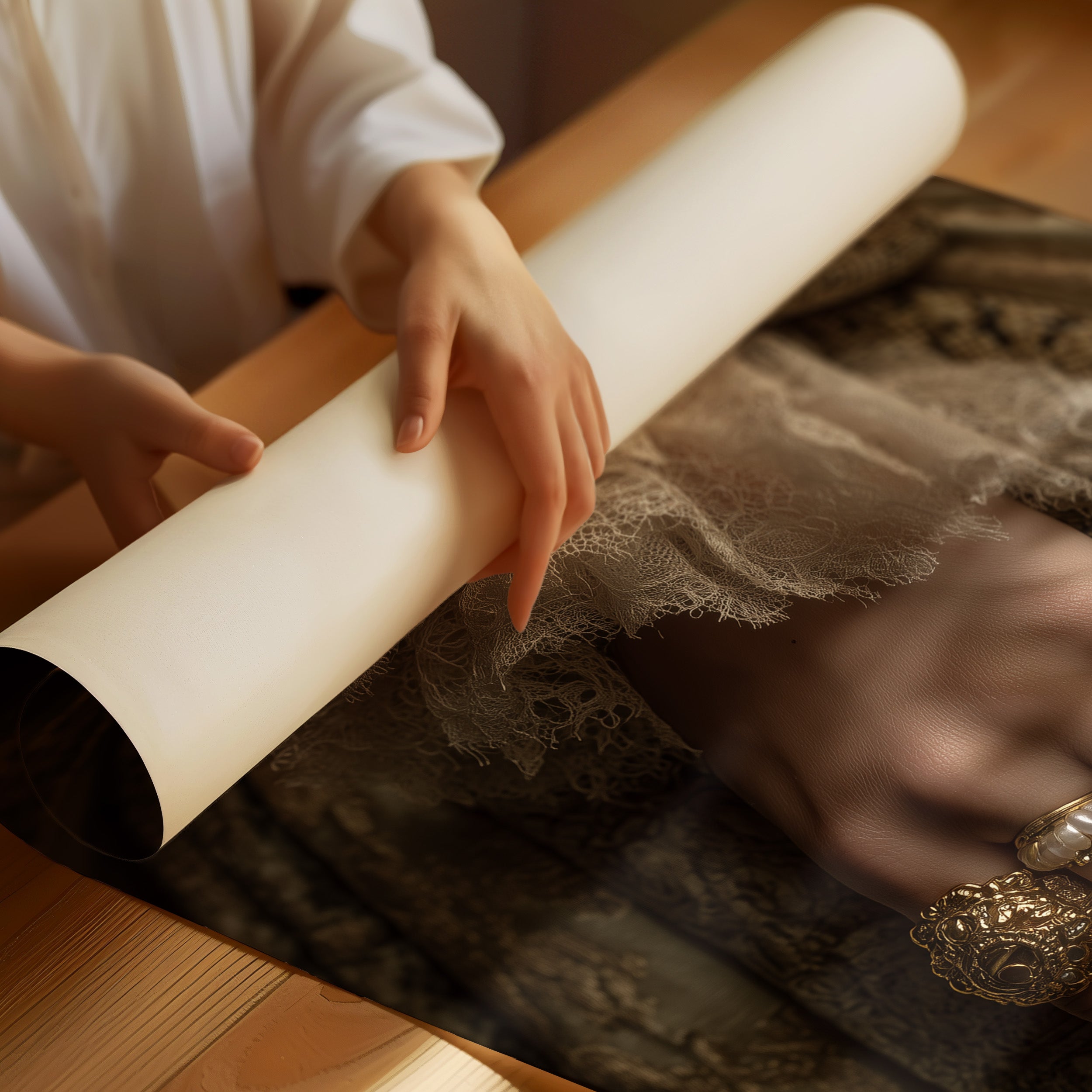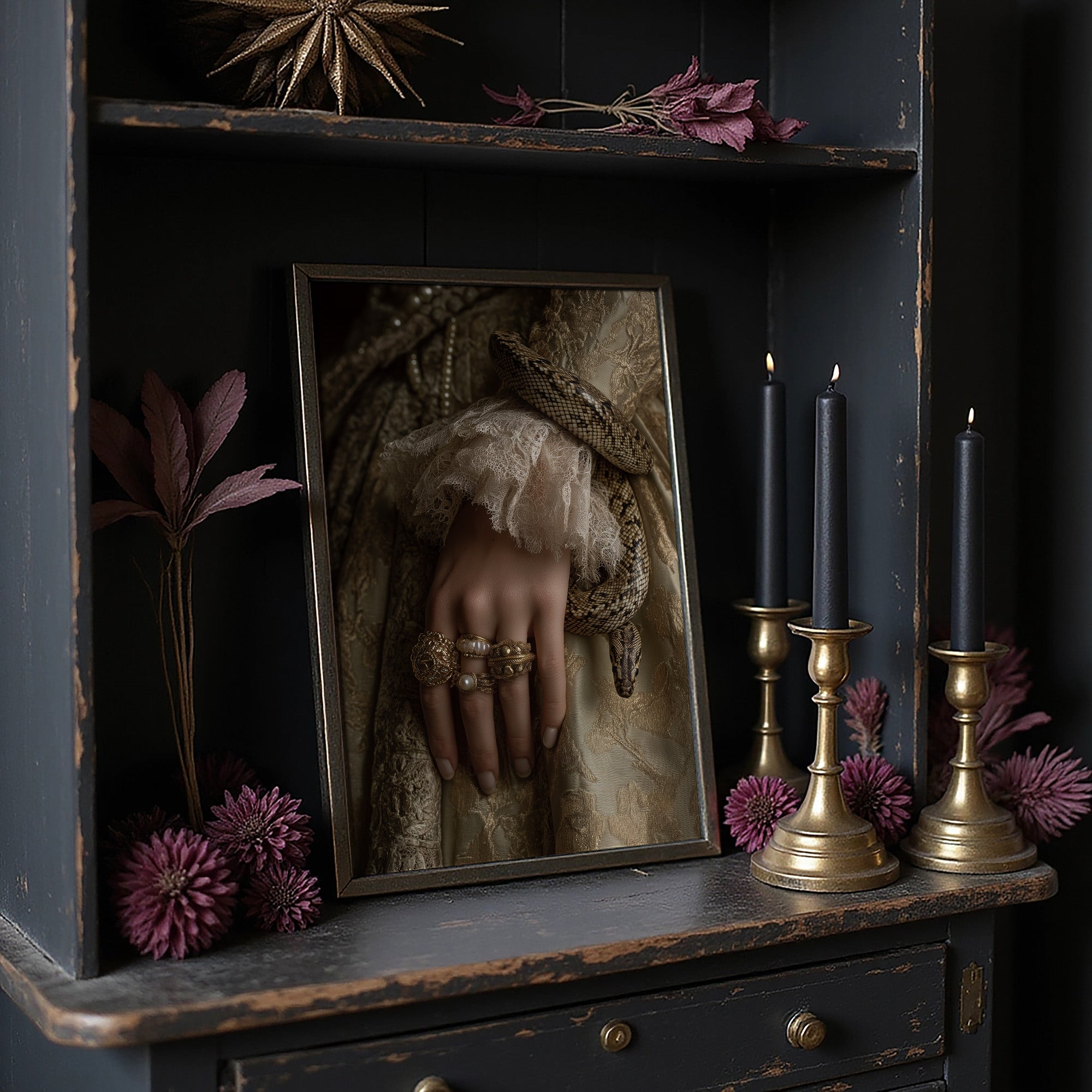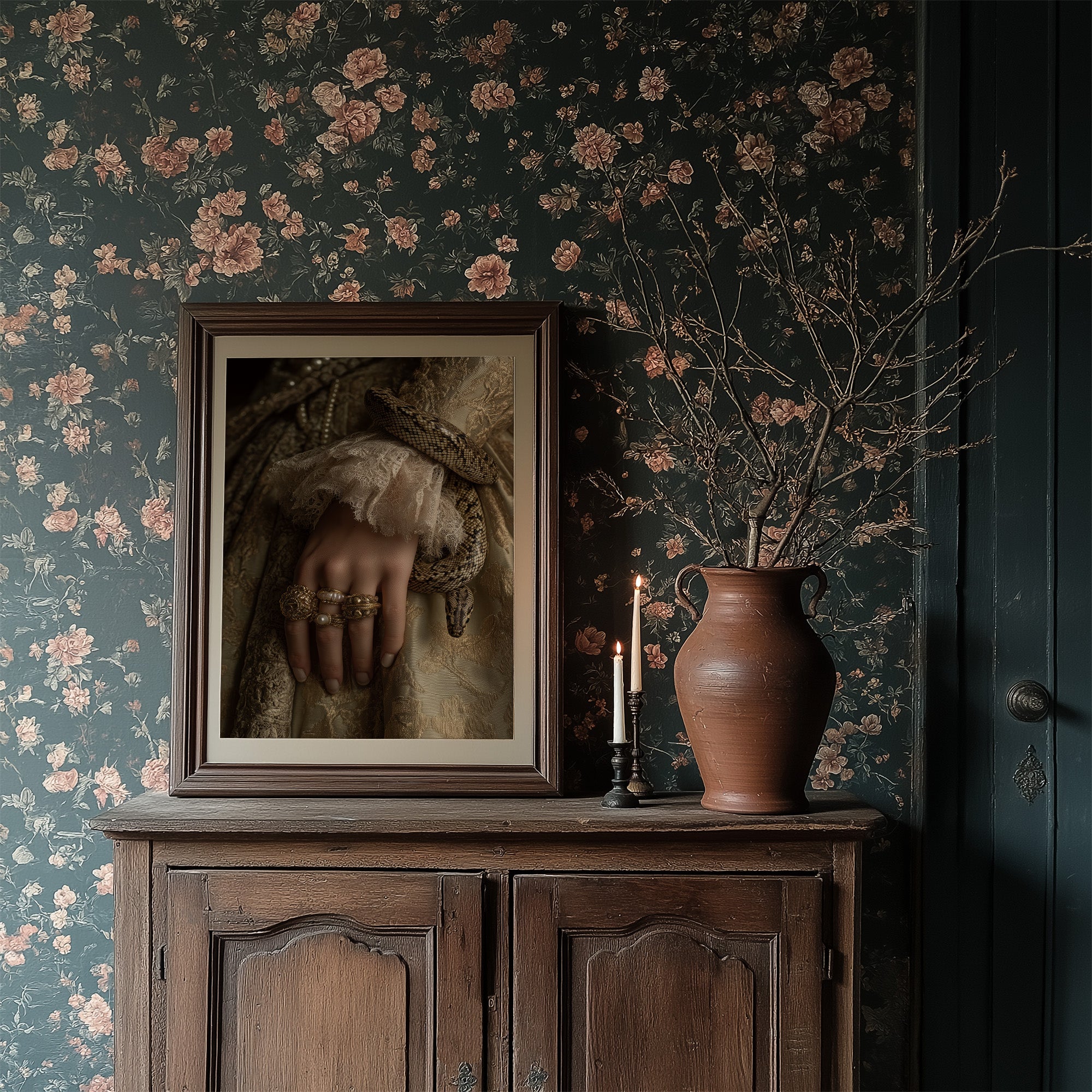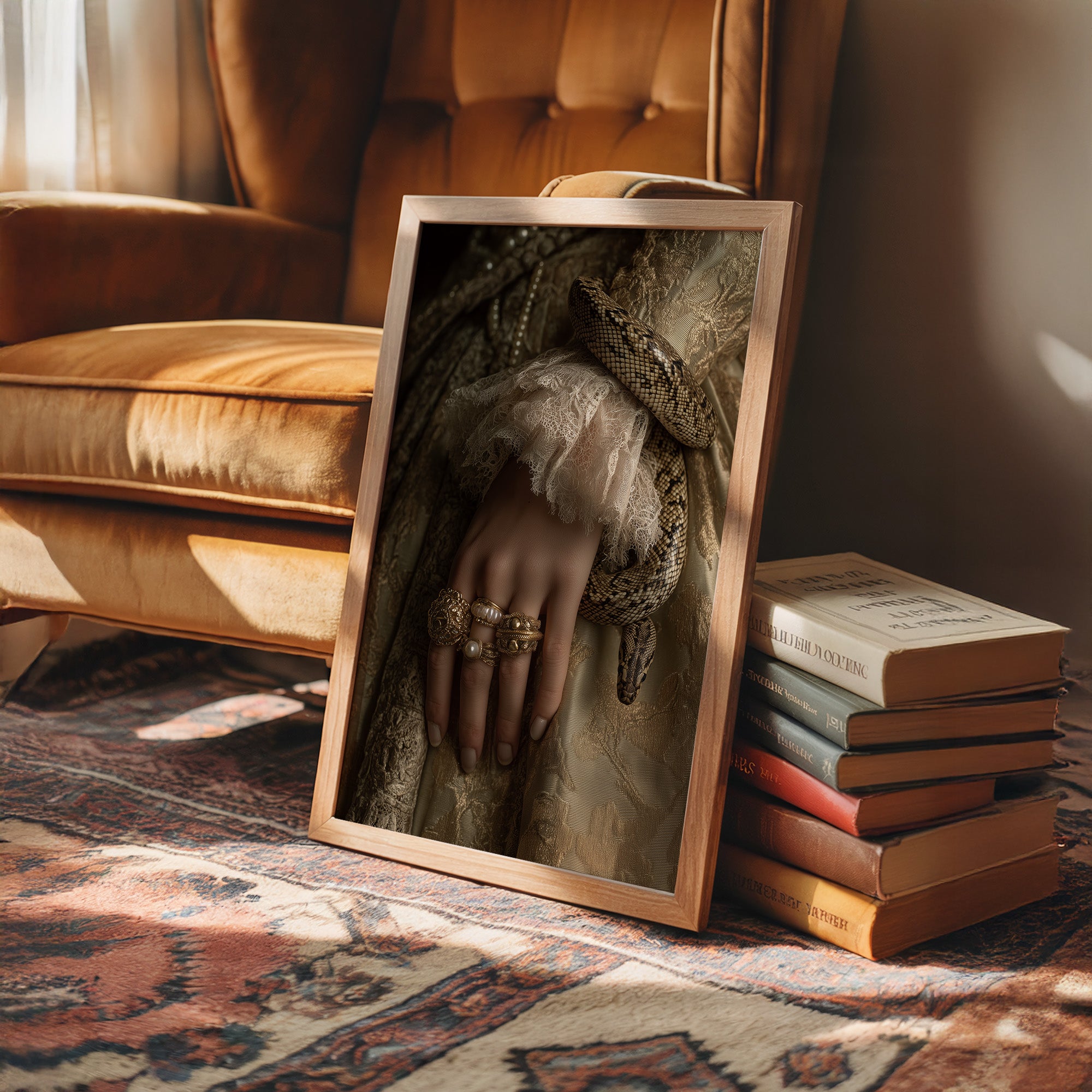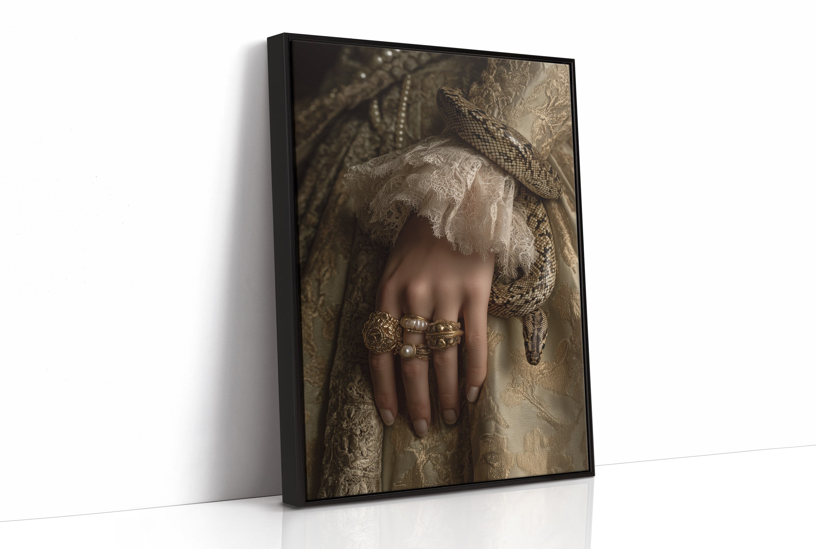 Danger and opulence intertwine in this haunting moment frozen in time. A serpent winds deliberately around a delicate wrist adorned with gold and pearls, creating a striking contrast against the soft ivory lace. The sepia-toned palette evokes a sense of forgotten aristocracy, where beauty and peril existed in the same breath, telling stories of forbidden allure and Victorian mystique. This striking piece commands attention in spaces that celebrate the unconventional. Perfect for a sophisticated study, dramatic dining room, or as the centerpiece in a maximalist interior where its rich narrative can spark conversation and intrigue.