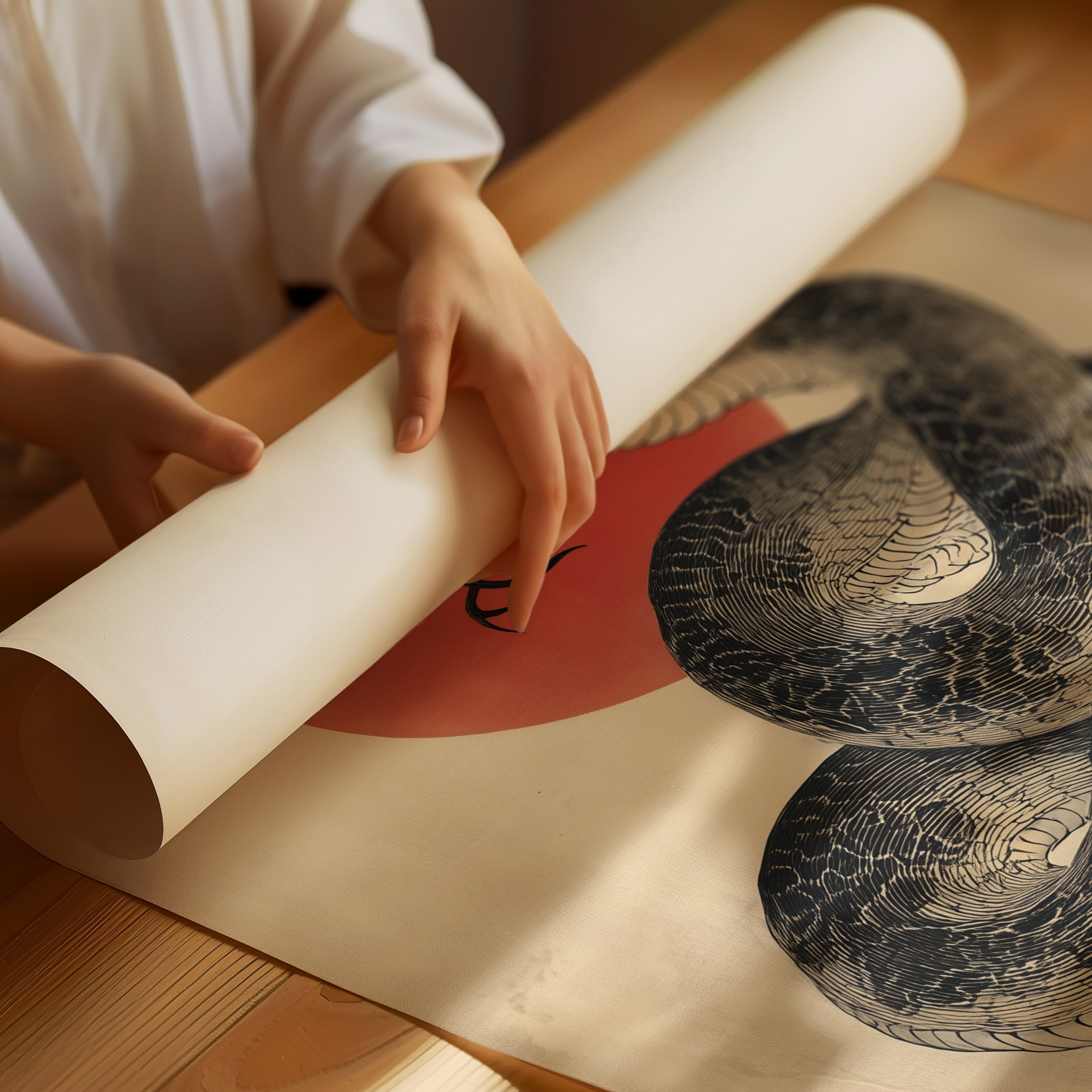 A powerful Japanese-inspired scene captures a sinuous snake coiled against a weathered cream background, crowned by a bold crimson sun. The detailed scales and fluid motion of the serpent create a mesmerizing dance of strength and grace, while the stark contrast between the dark creature and the vibrant red orb speaks to the eternal balance of nature. The piece brings dramatic Asian artistry into a modern, plant-filled space, where natural light plays across polished floors. This statement piece commands attention in a contemporary home setting, perfect for creating a bold focal point in a minimalist living room or adding dramatic flair to a zen-inspired study.