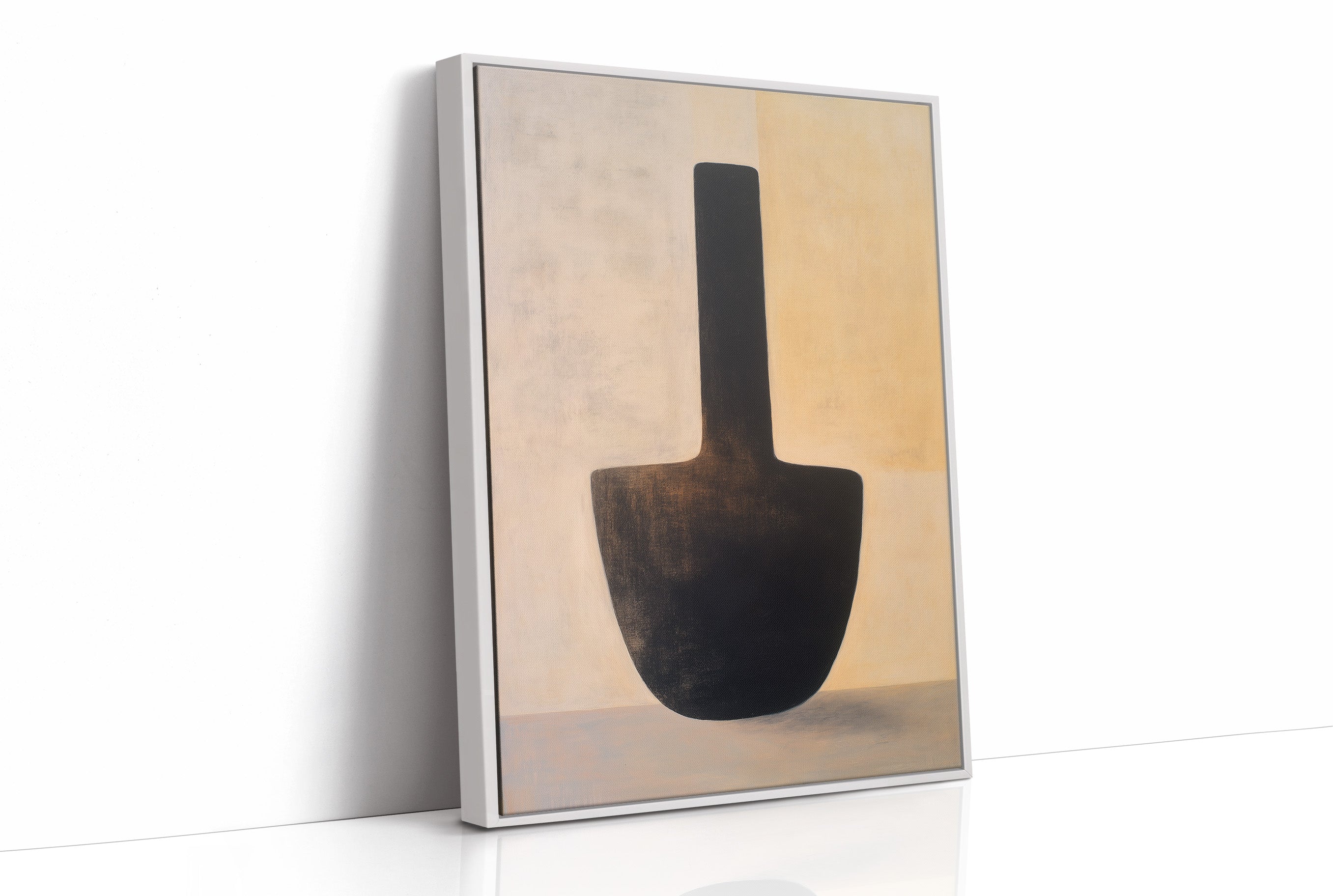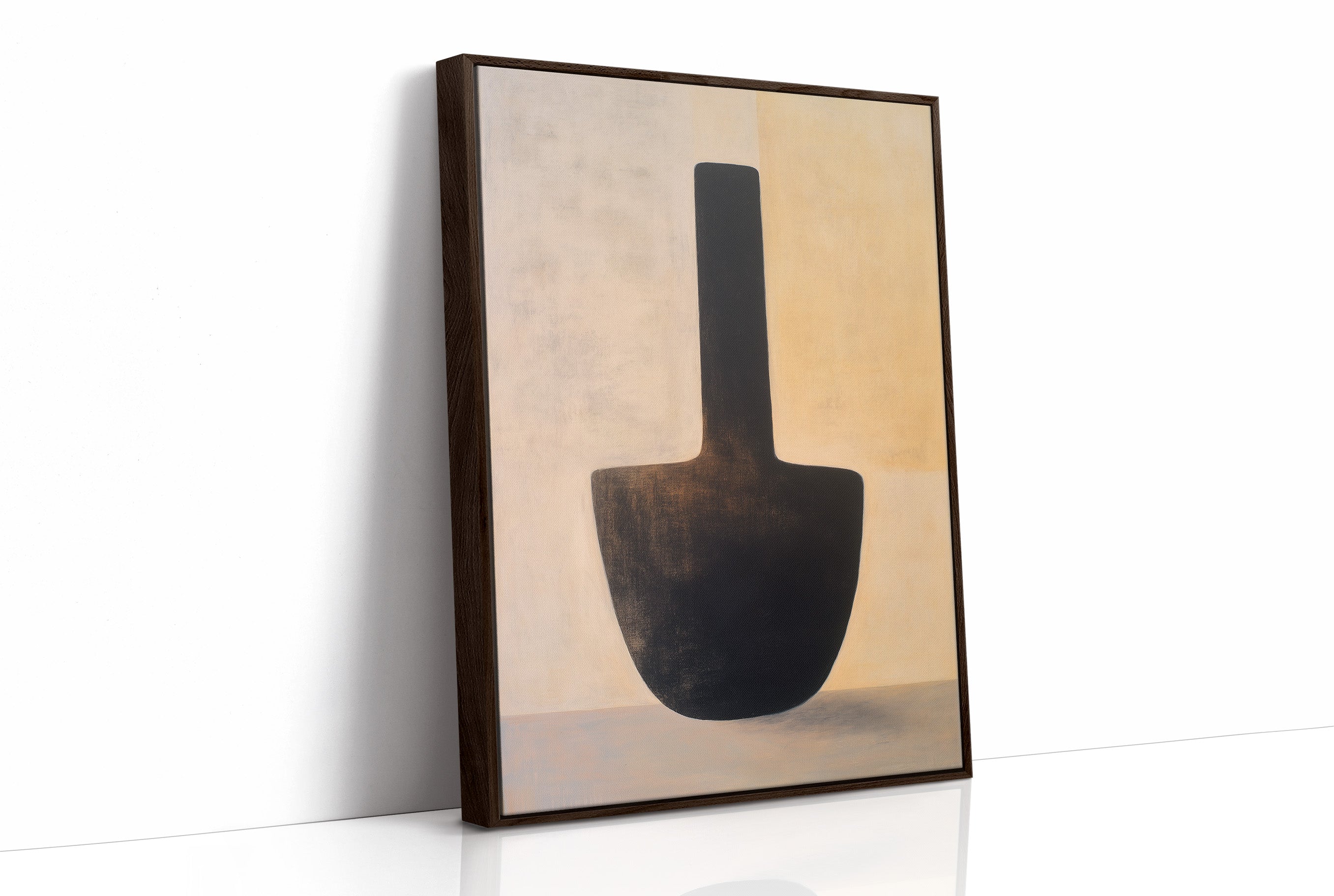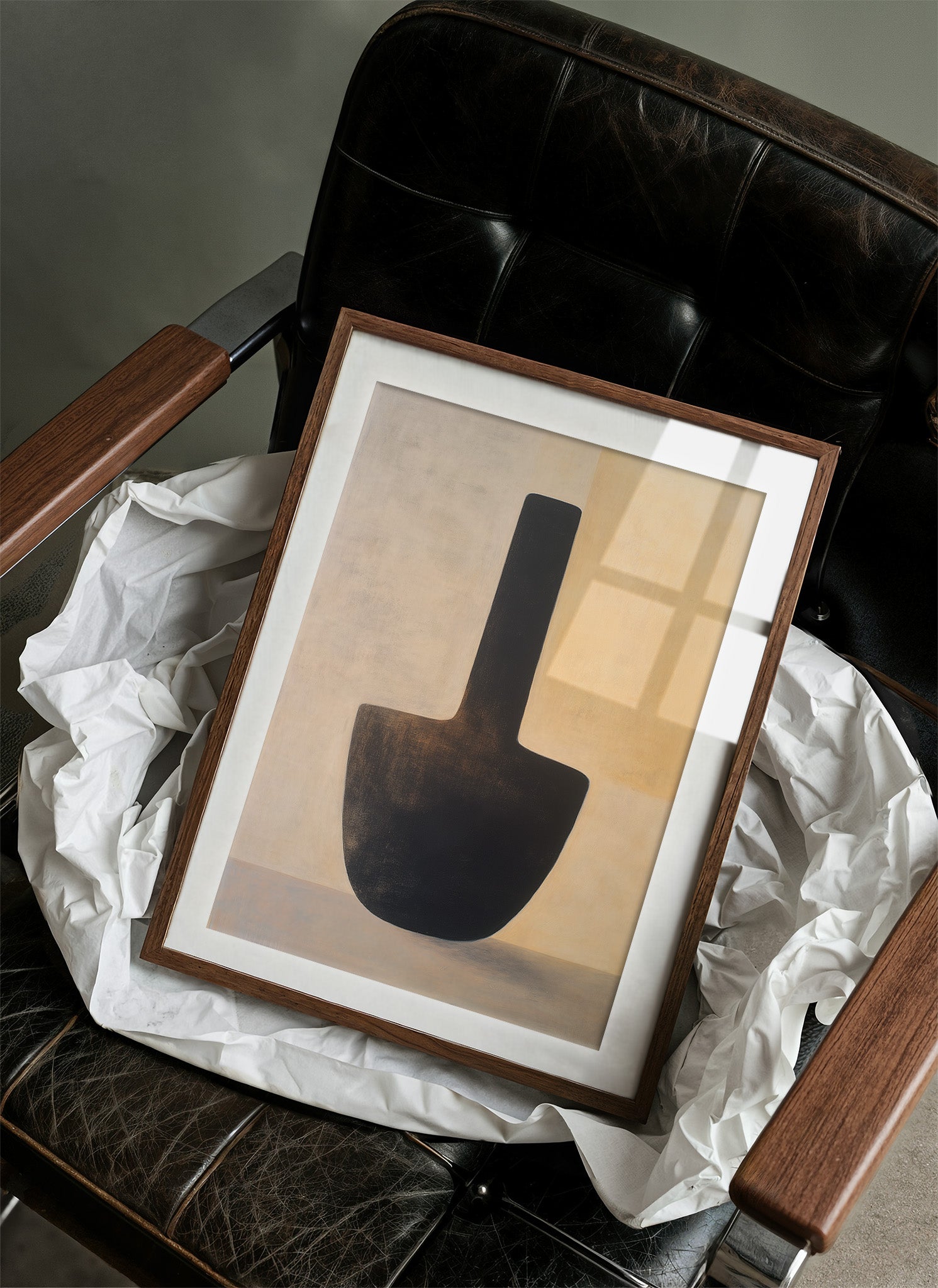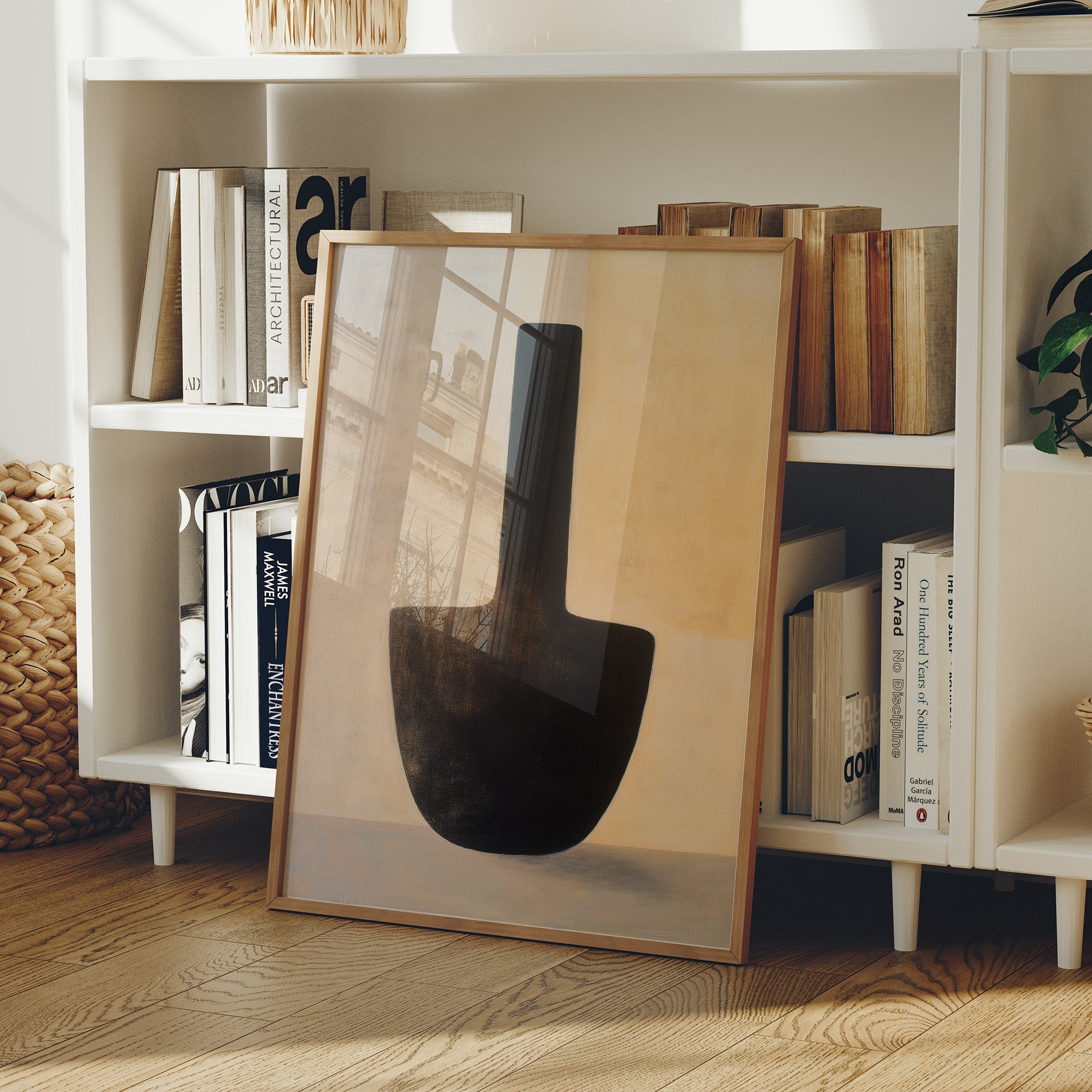 A minimalist composition emerges from gentle shadows and warm light, featuring a bold black form against a neutral backdrop. The stark geometry creates a powerful presence, while delicate paper folds and morning sunlight add layers of organic texture to the scene. The interplay between the modern abstract shape and classic wooden frame speaks to a timeless aesthetic that bridges contemporary and traditional design.