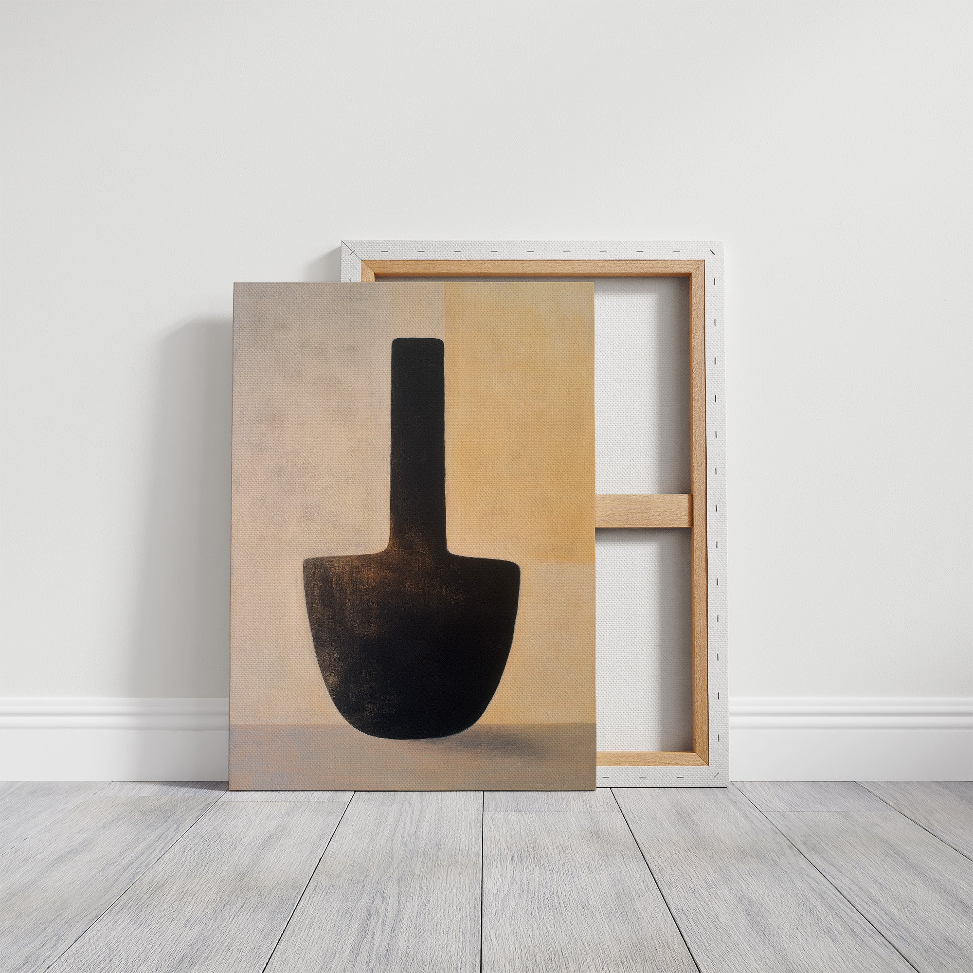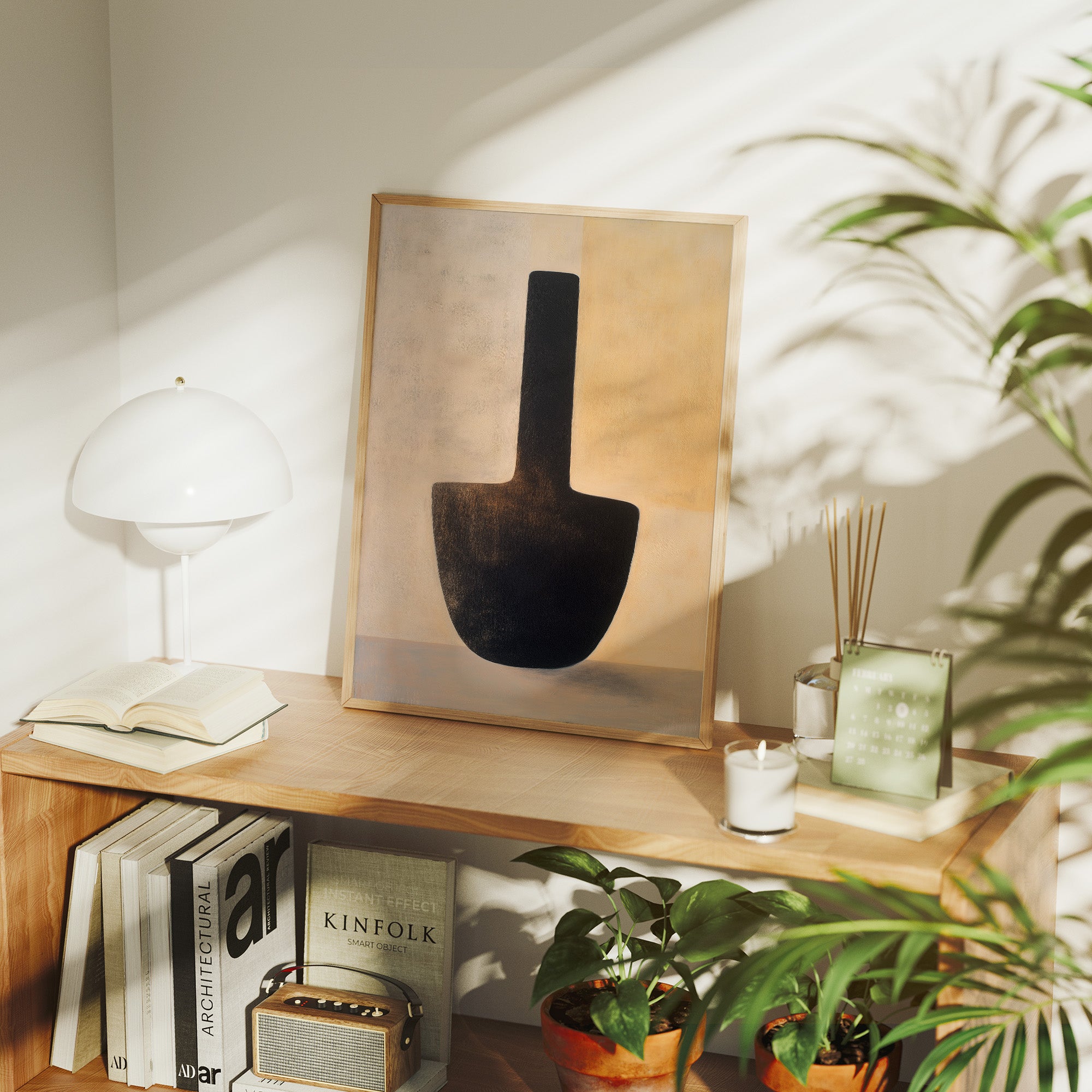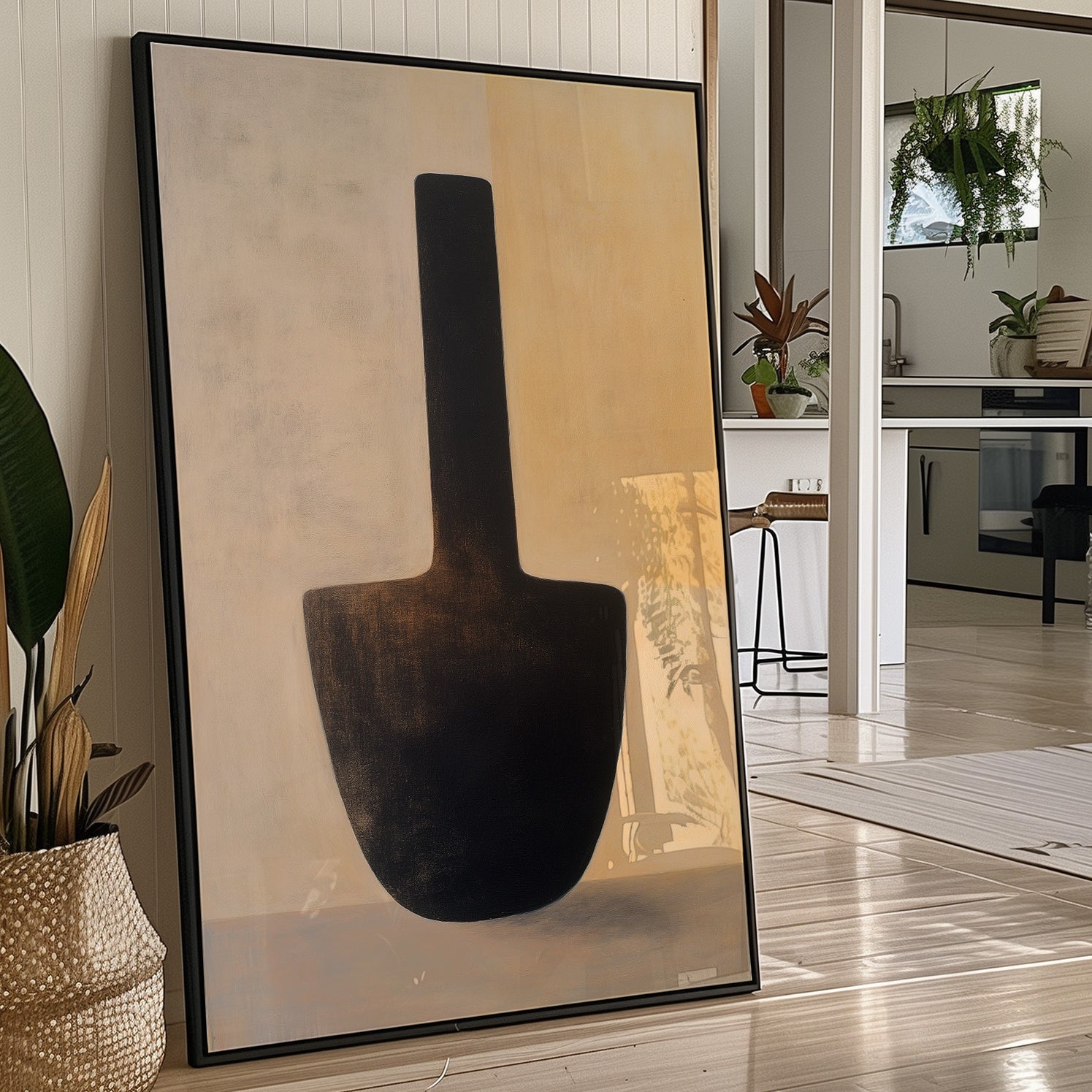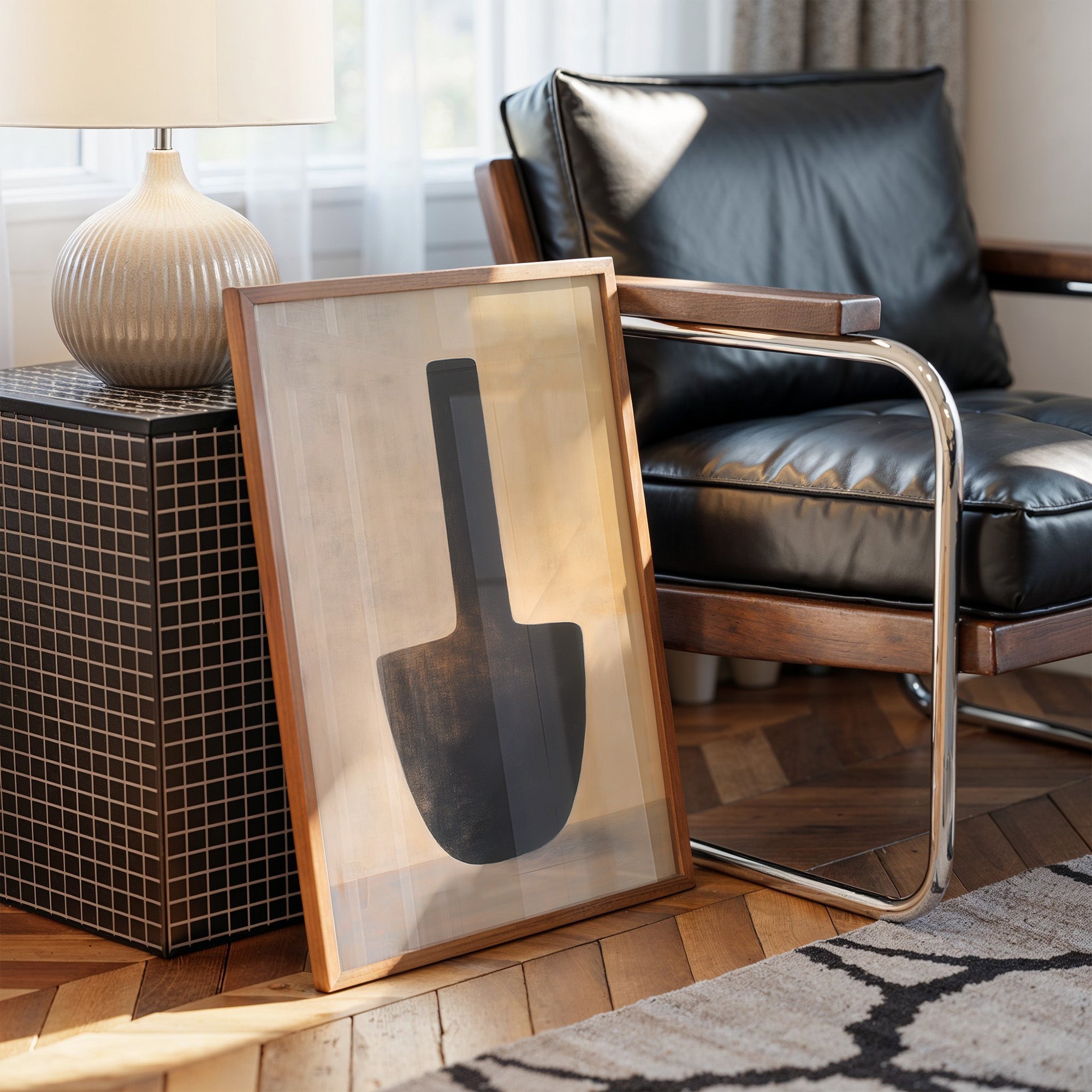 A minimalist composition emerges from gentle shadows and warm light, featuring a bold black form against a neutral backdrop. The stark geometry creates a powerful presence, while delicate paper folds and morning sunlight add layers of organic texture to the scene. The interplay between the modern abstract shape and classic wooden frame speaks to a timeless aesthetic that bridges contemporary and traditional design.