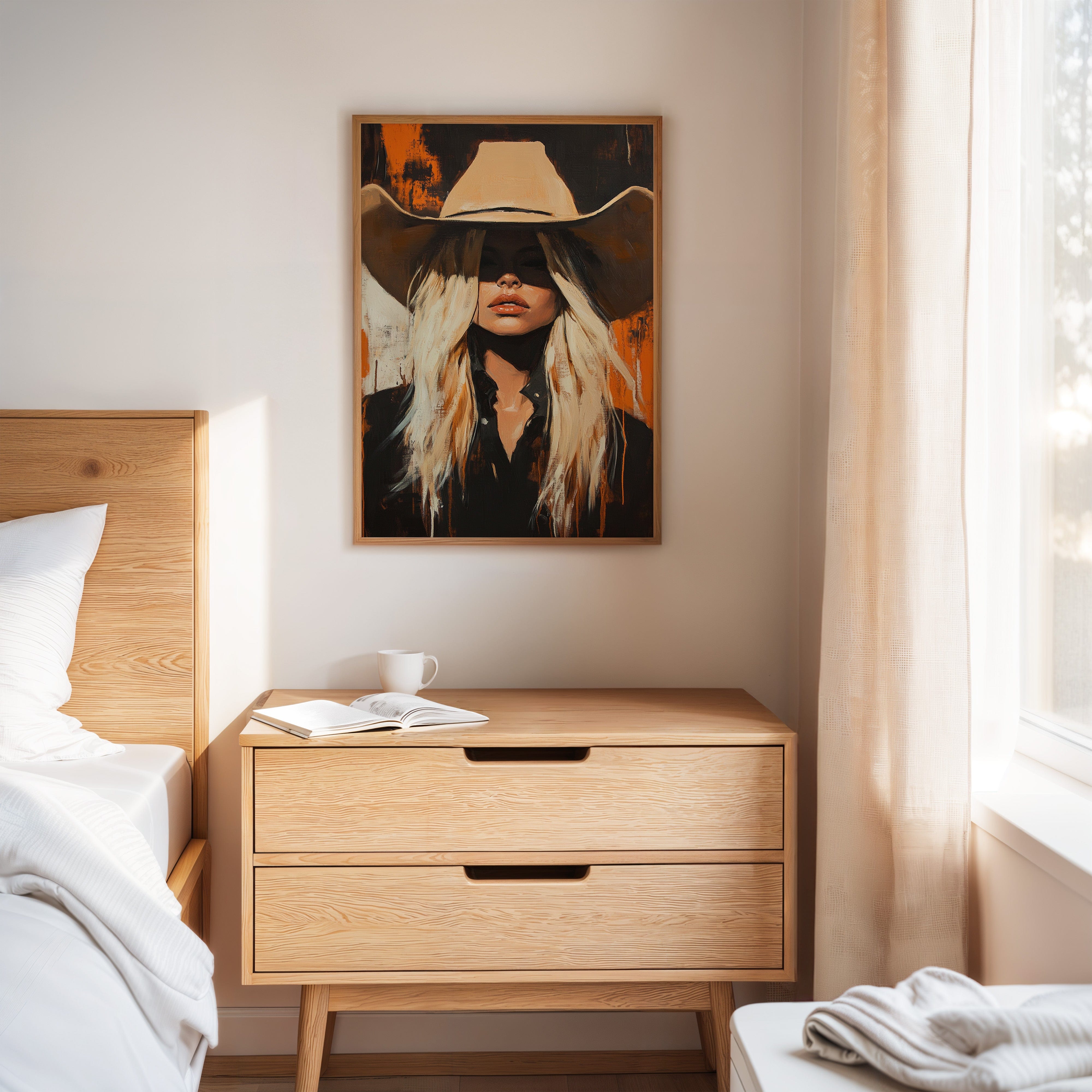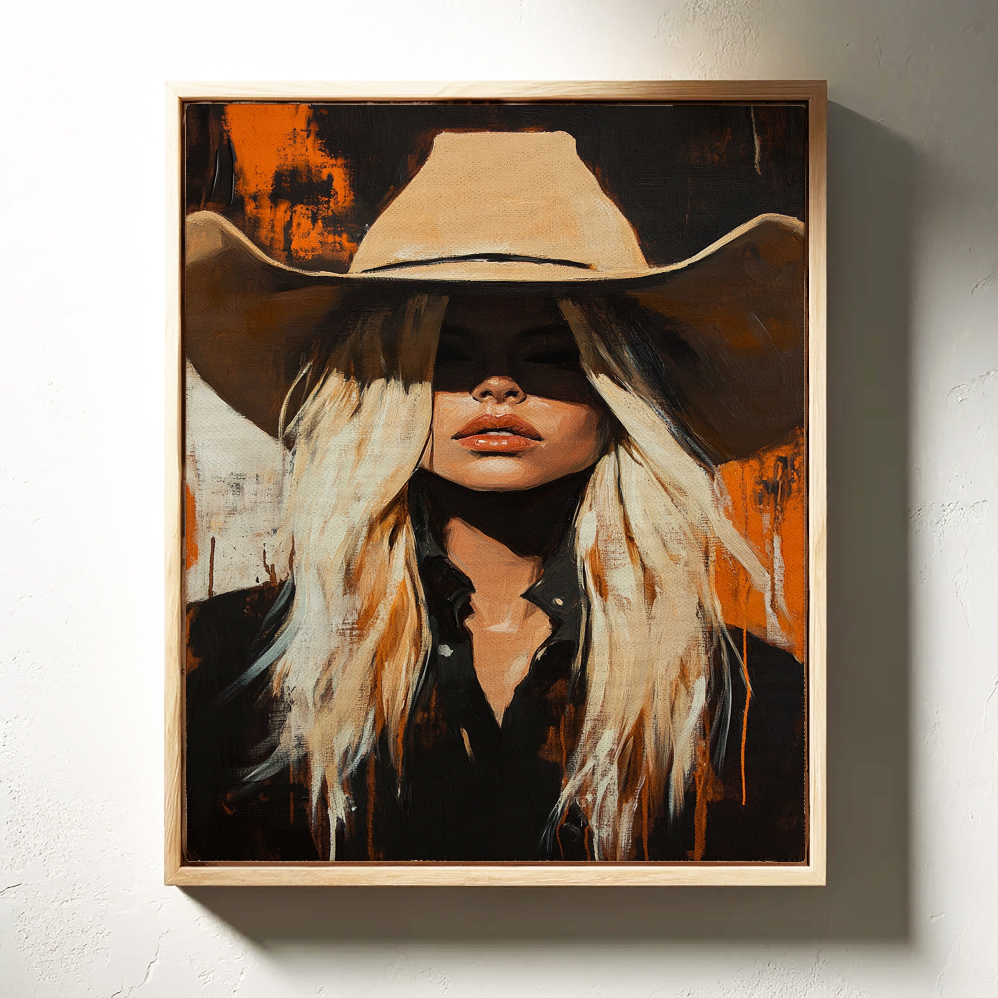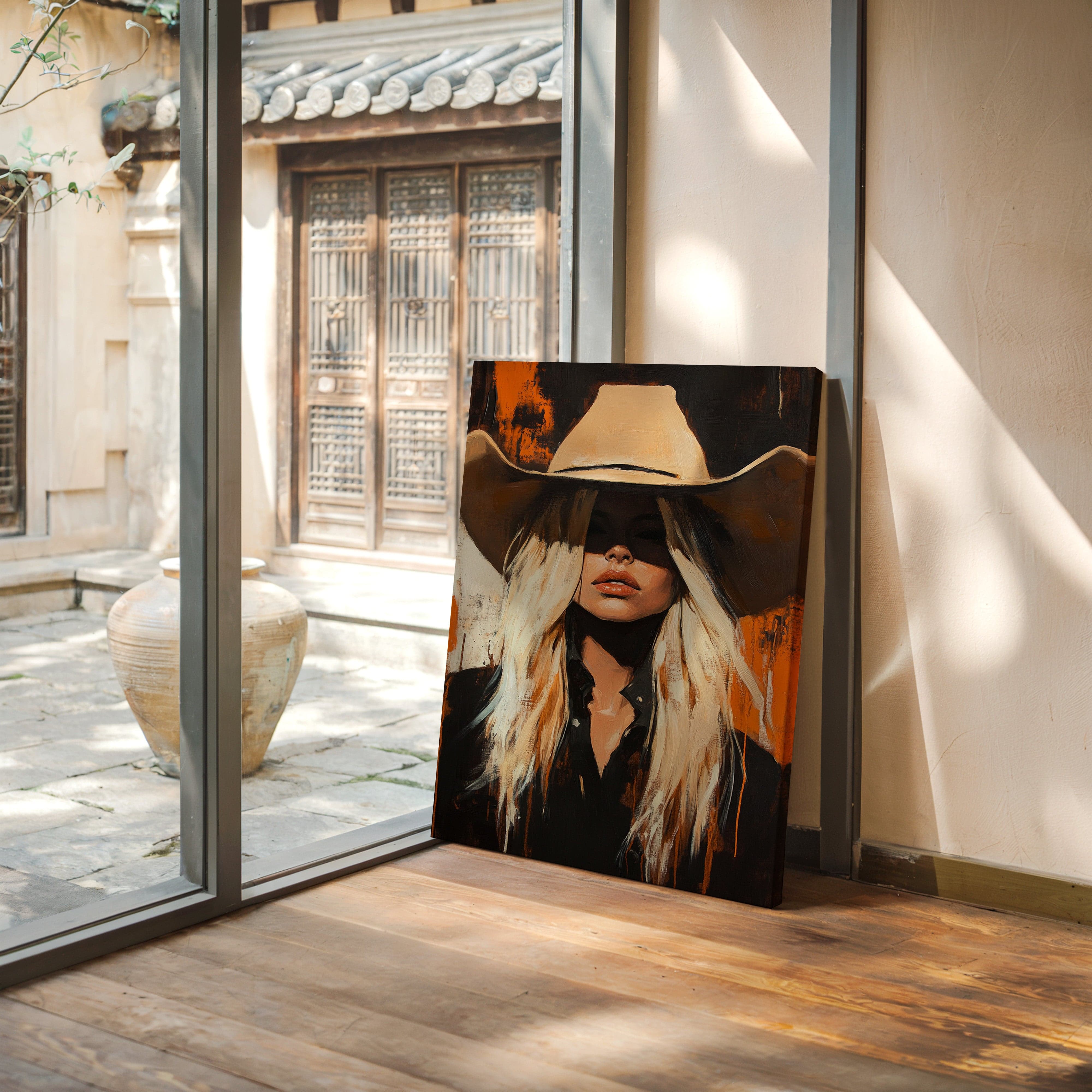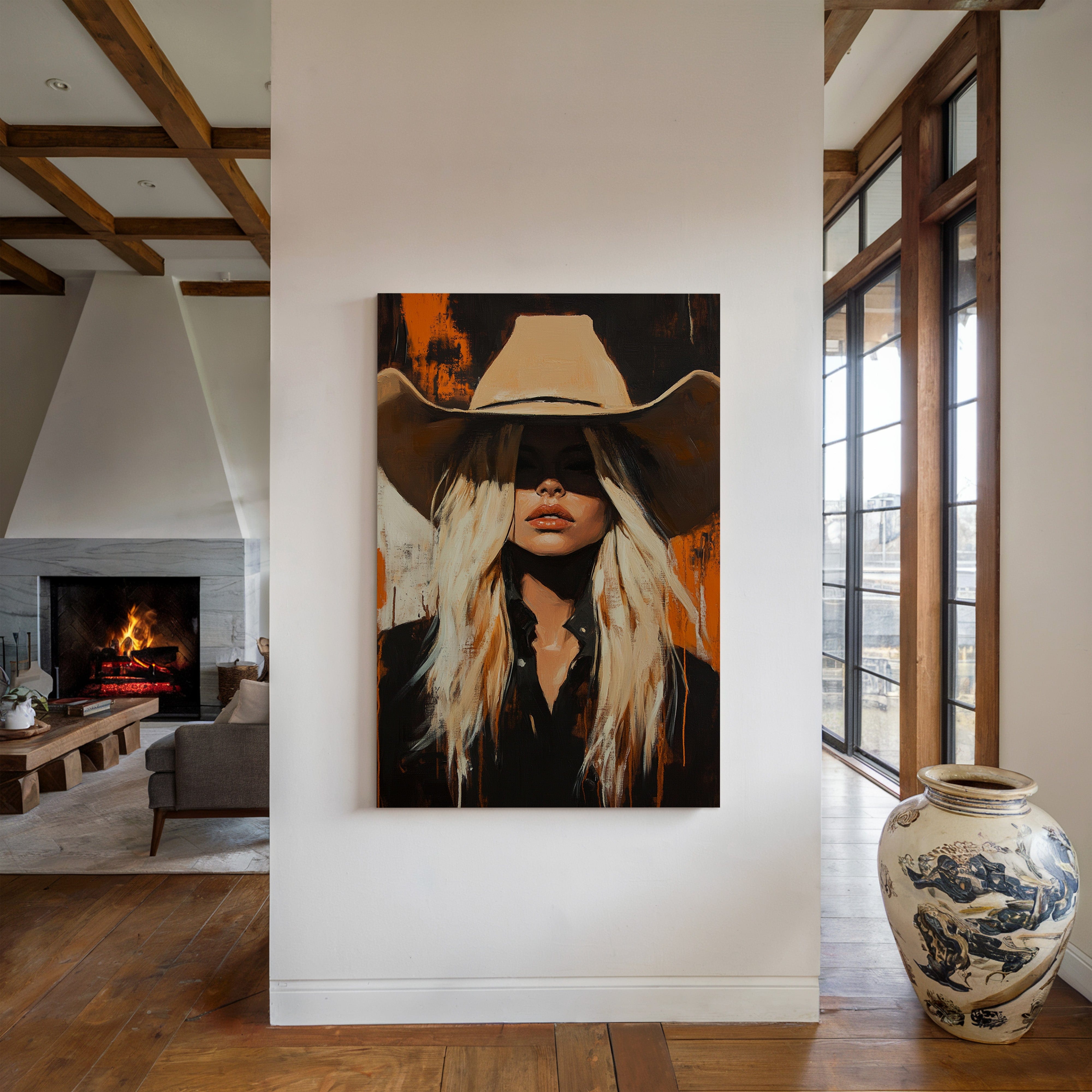 This striking portrait captures the quiet confidence of a woman who doesn’t need the spotlight to command the room. Draped in bold shadows and framed by warm, rugged tones, she wears her hat low and her mystery lower. The contrast of her platinum hair against deep blacks and fiery rust makes this a standout piece for any western-inspired space.
