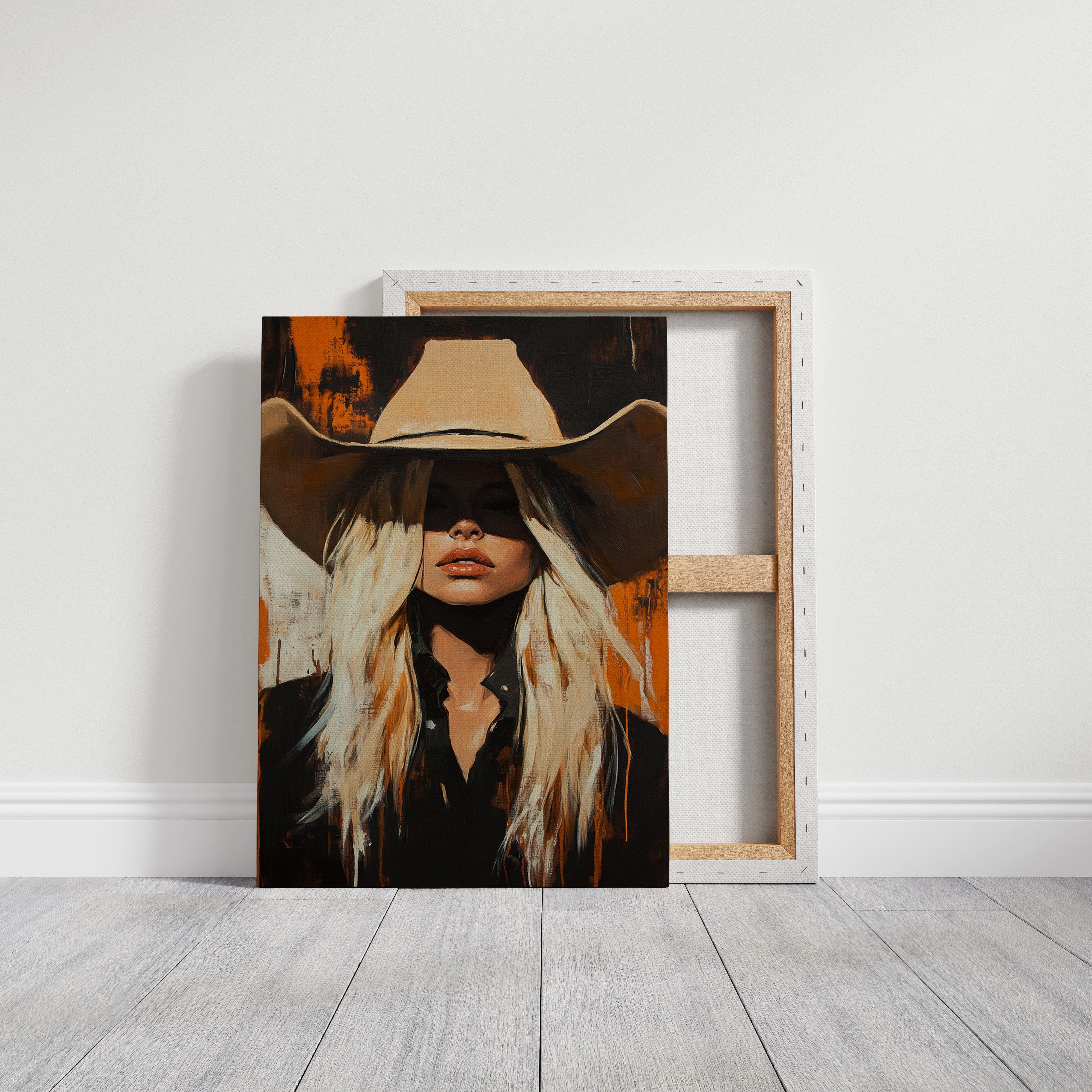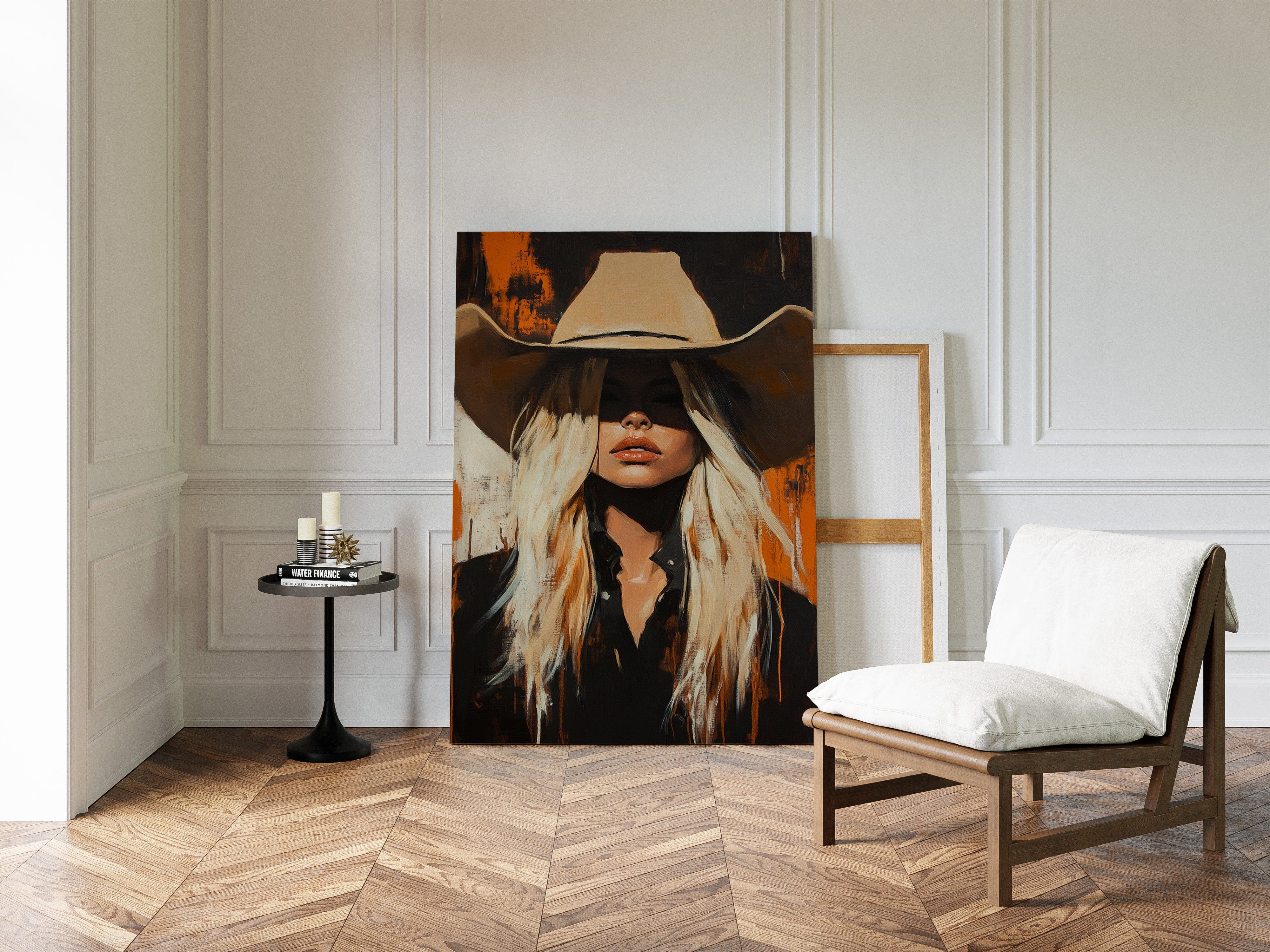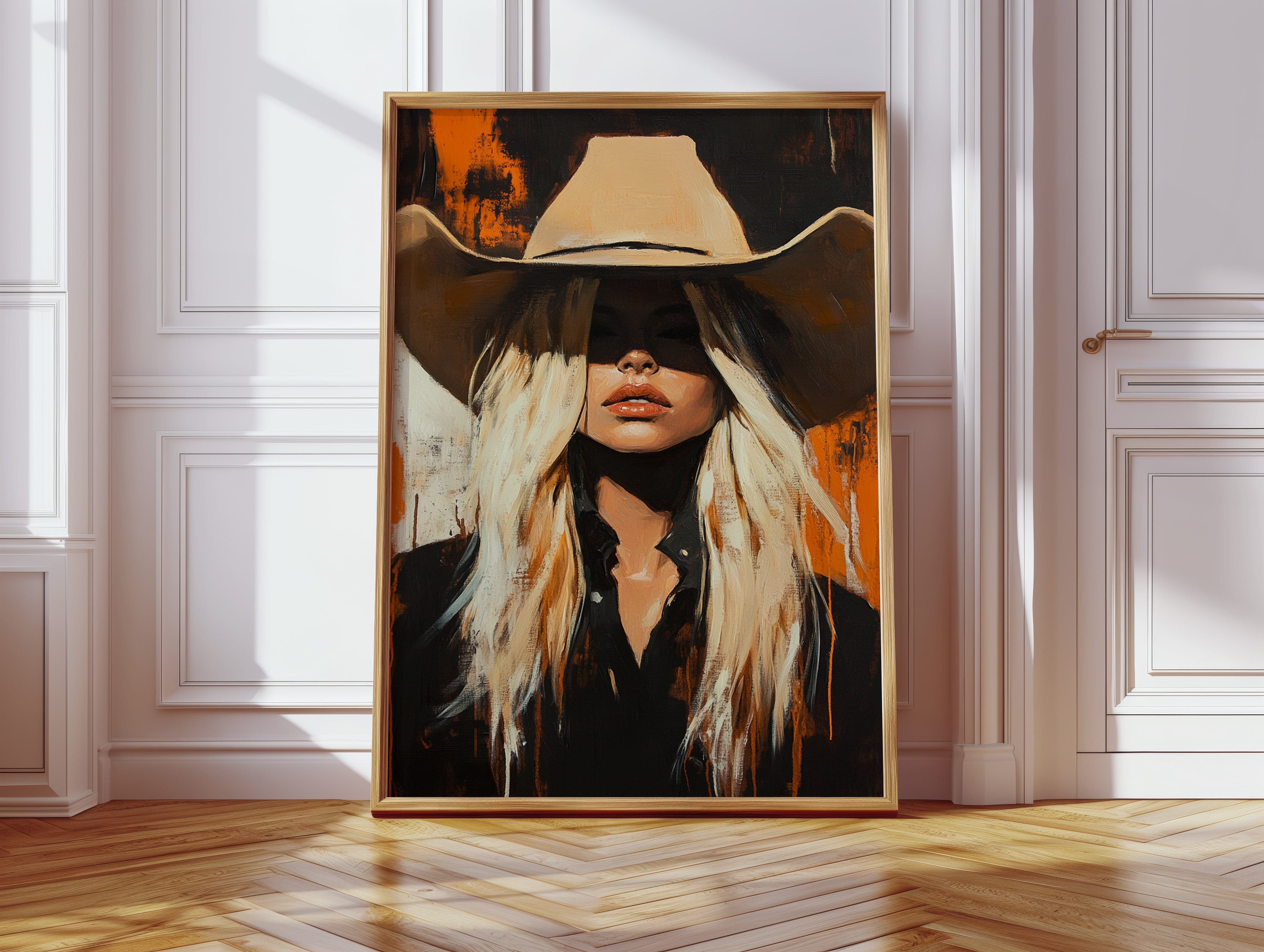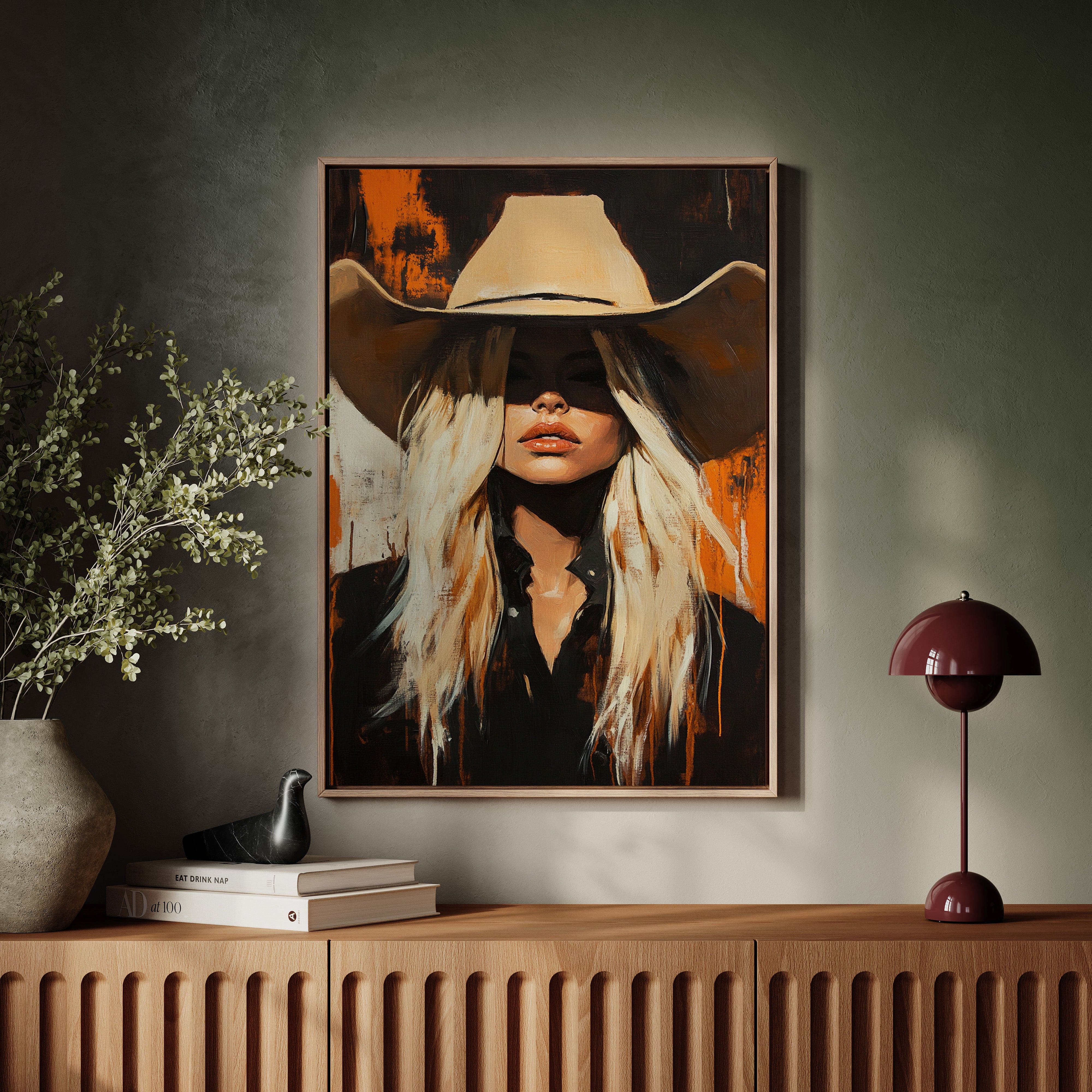 This striking portrait captures the quiet confidence of a woman who doesn’t need the spotlight to command the room. Draped in bold shadows and framed by warm, rugged tones, she wears her hat low and her mystery lower. The contrast of her platinum hair against deep blacks and fiery rust makes this a standout piece for any western-inspired space.