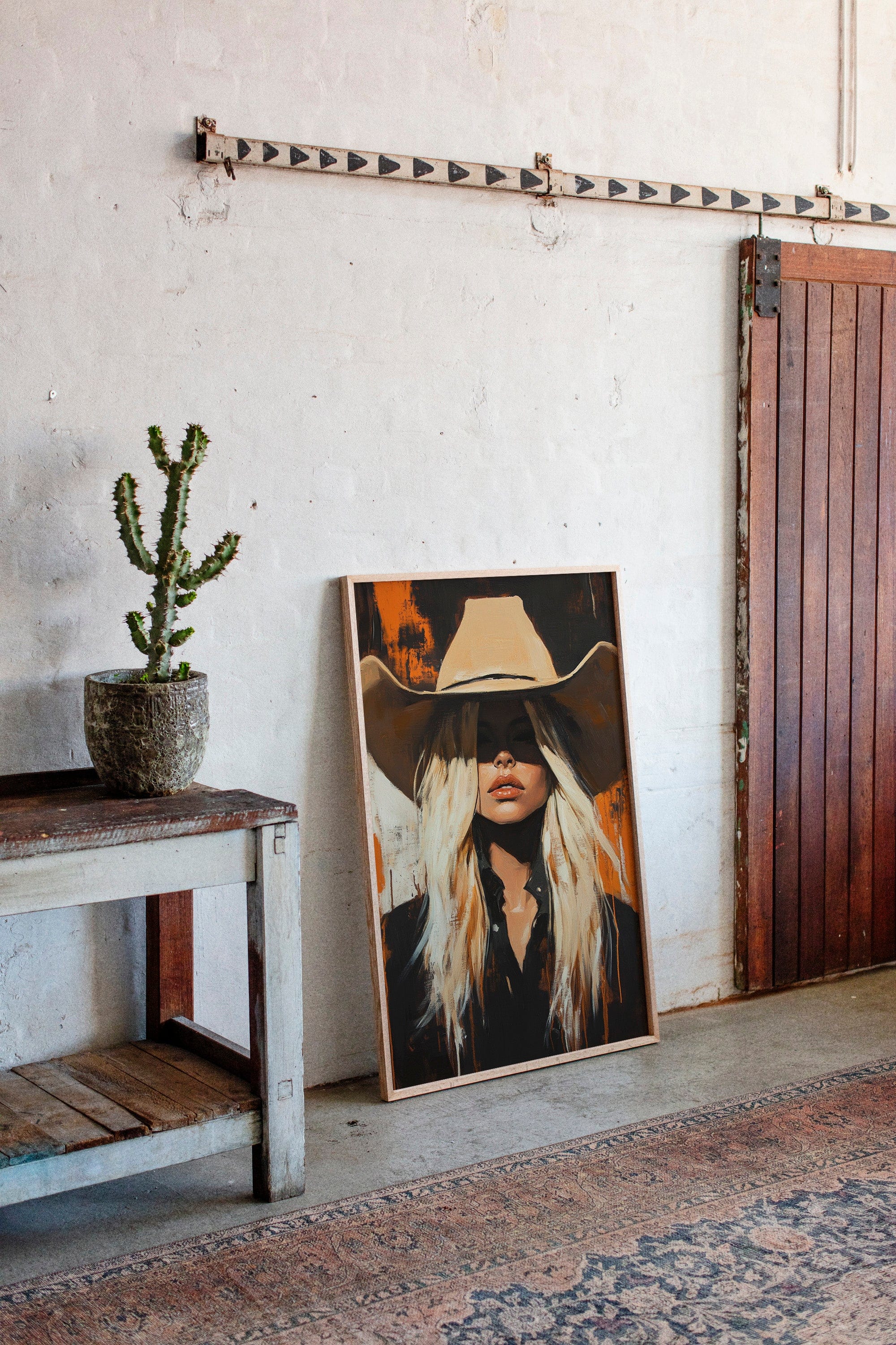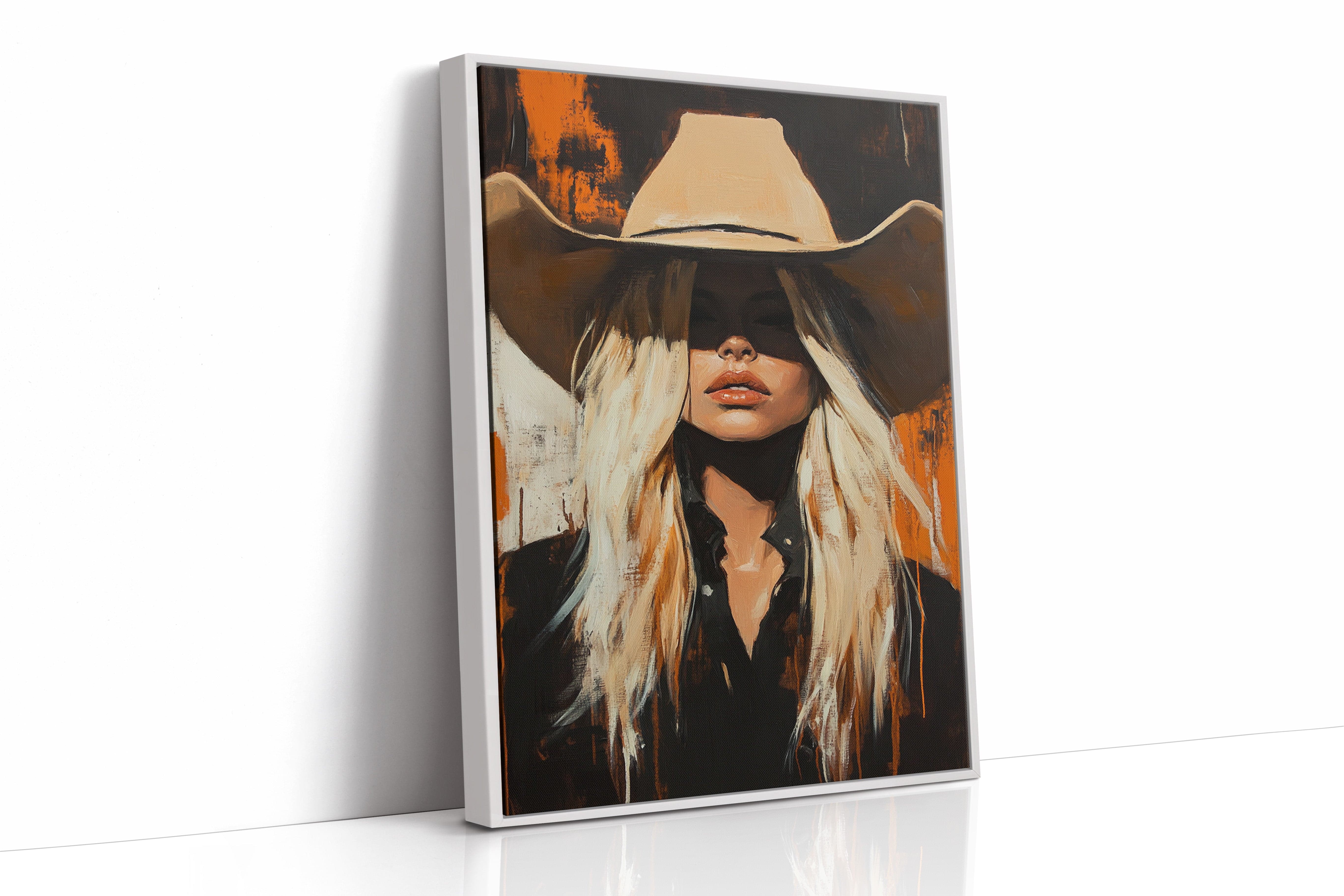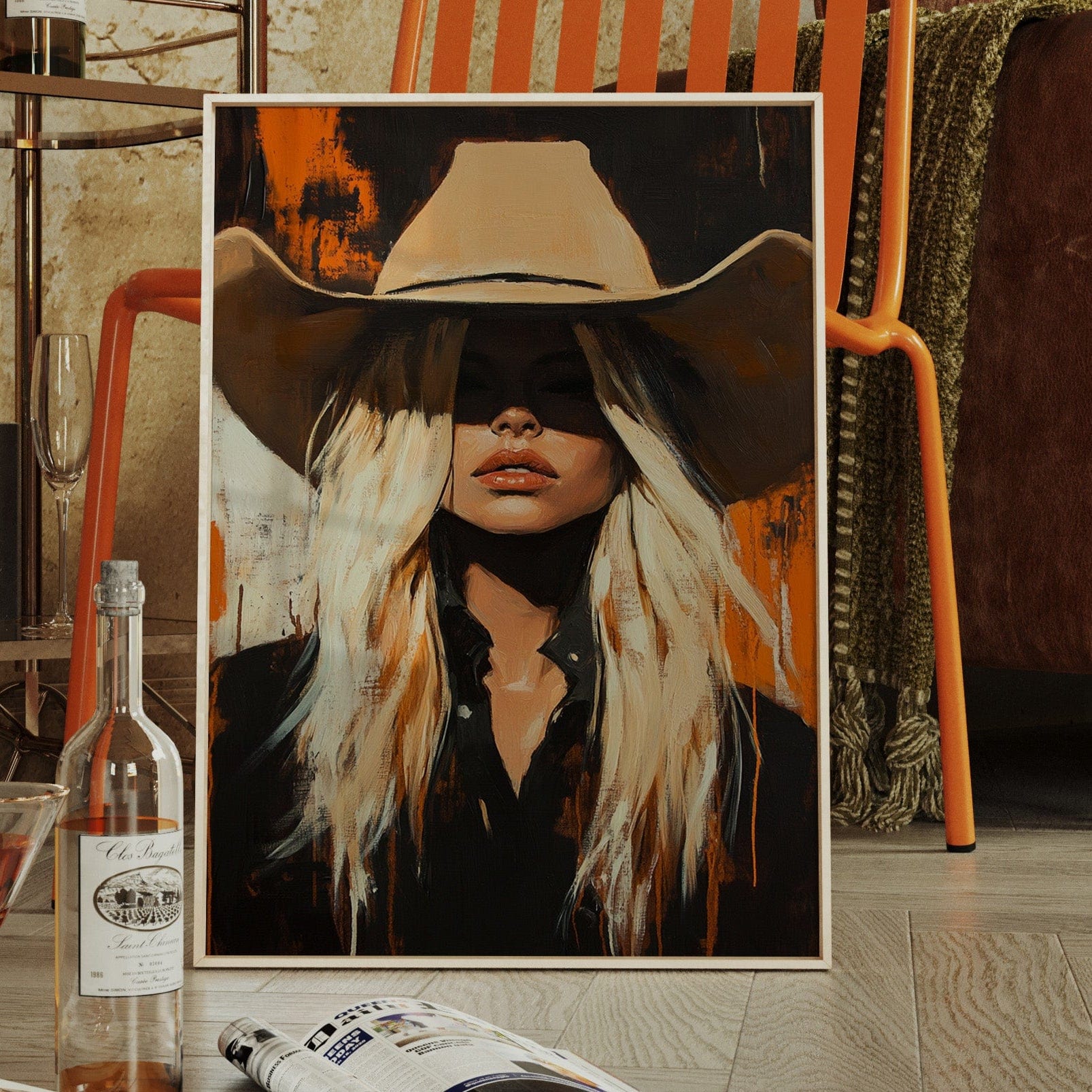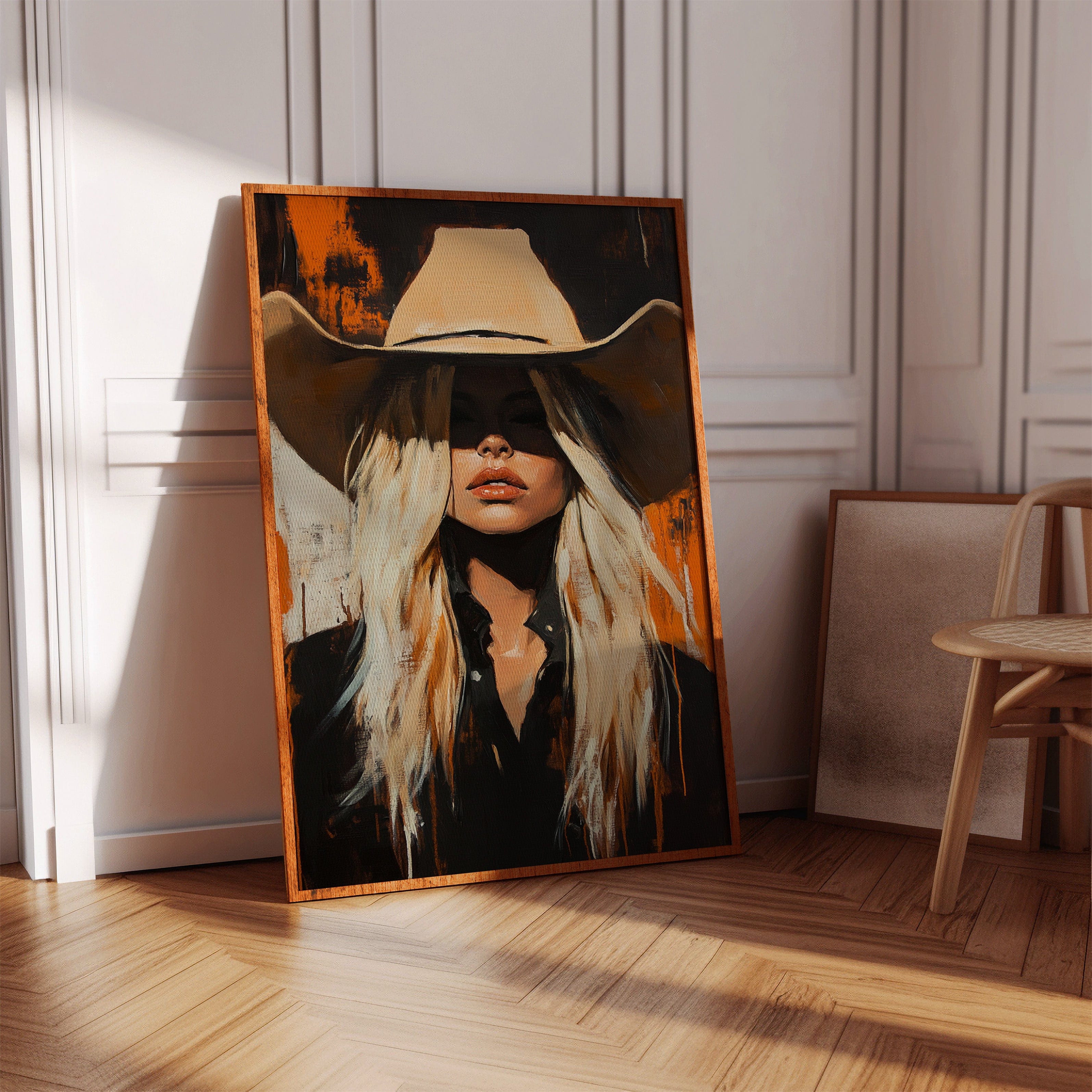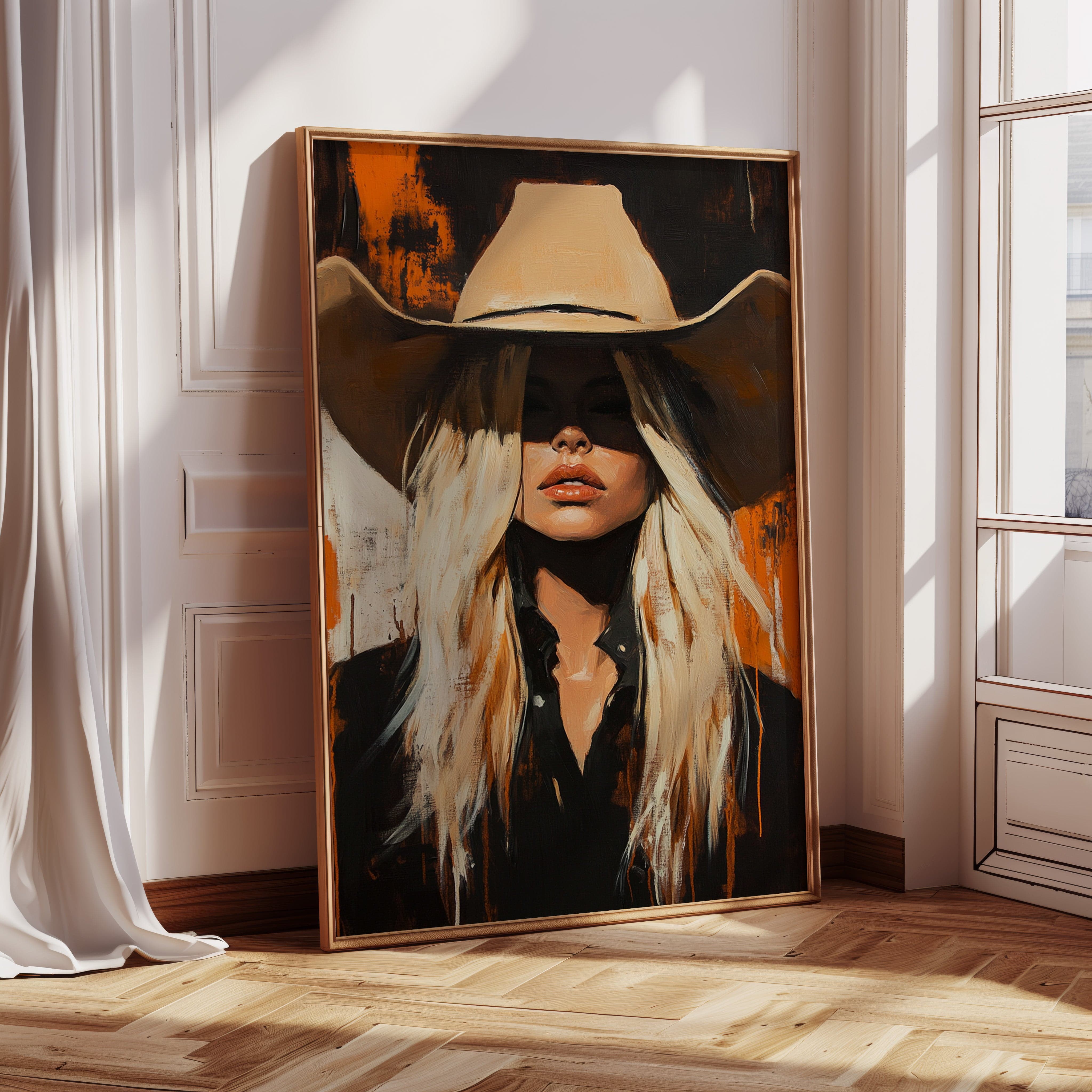This striking portrait captures the quiet confidence of a woman who doesn’t need the spotlight to command the room. Draped in bold shadows and framed by warm, rugged tones, she wears her hat low and her mystery lower. The contrast of her platinum hair against deep blacks and fiery rust makes this a standout piece for any western-inspired space.