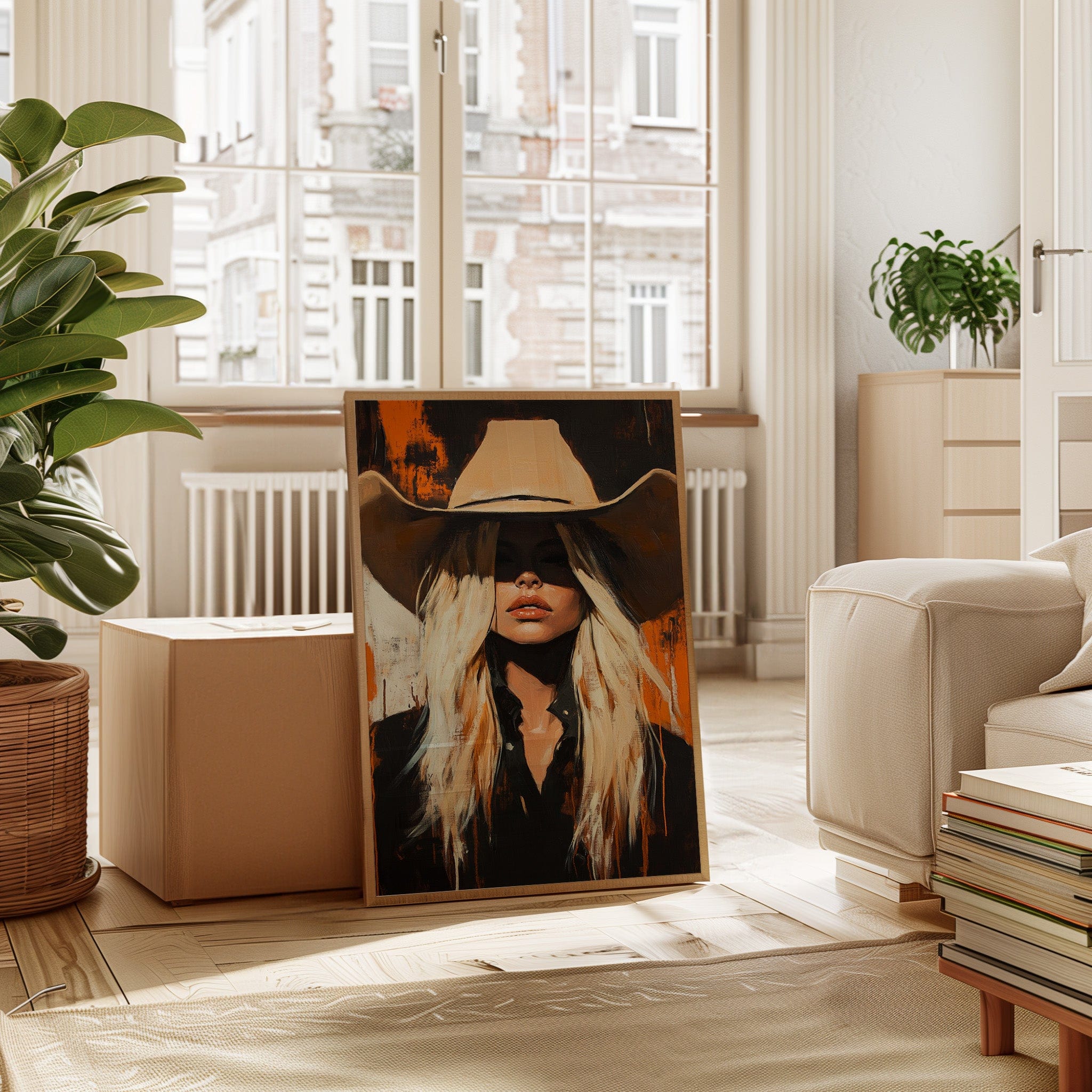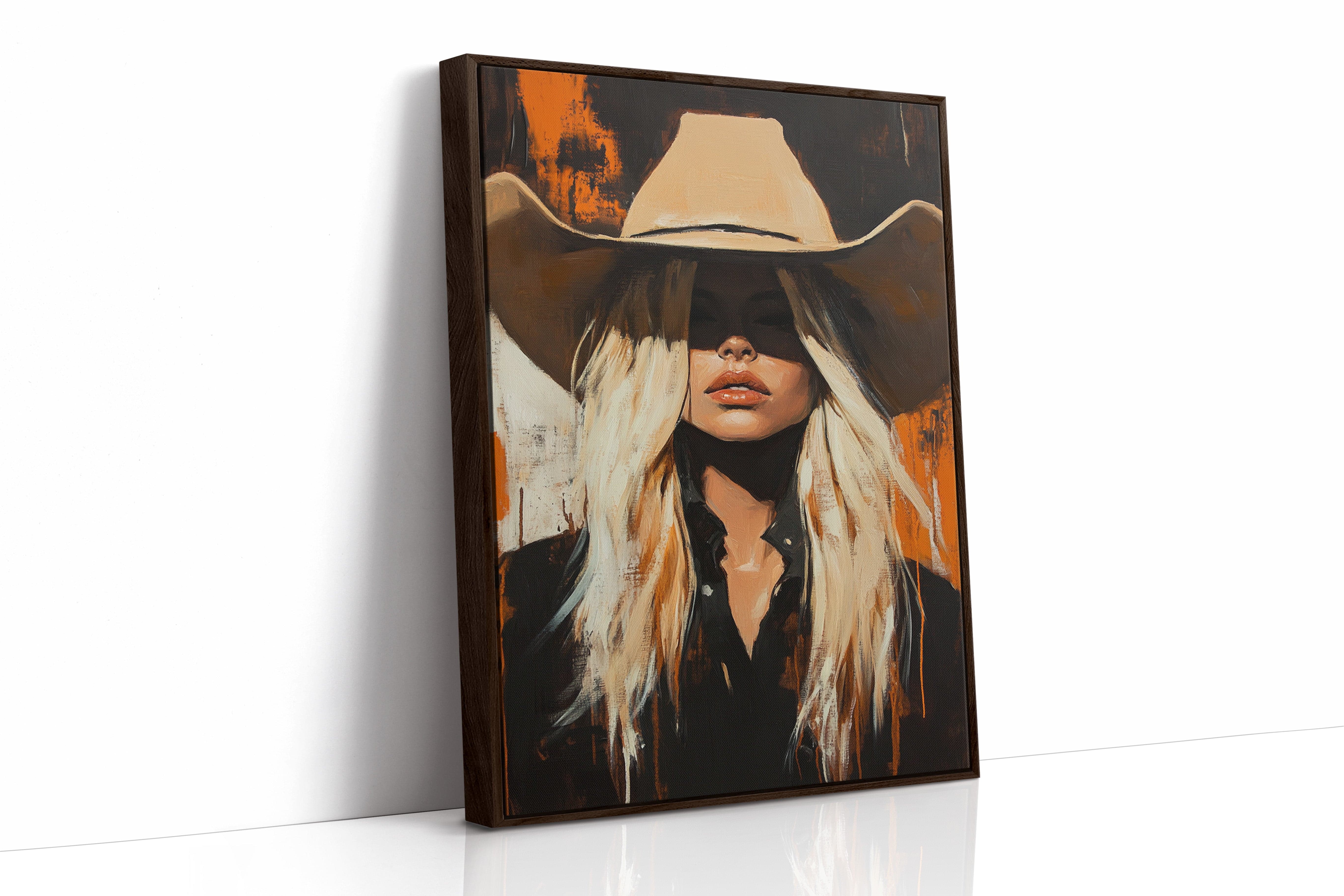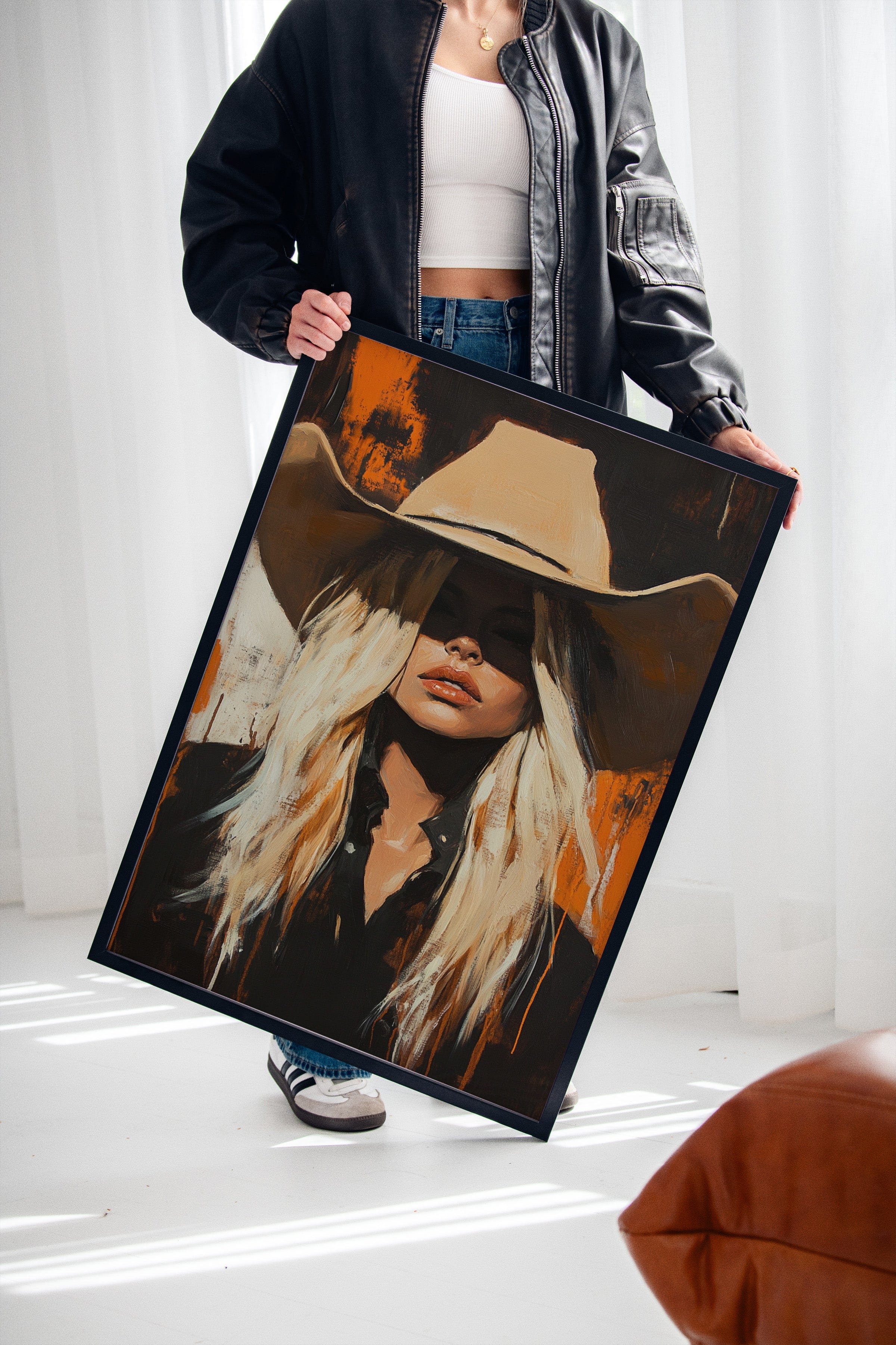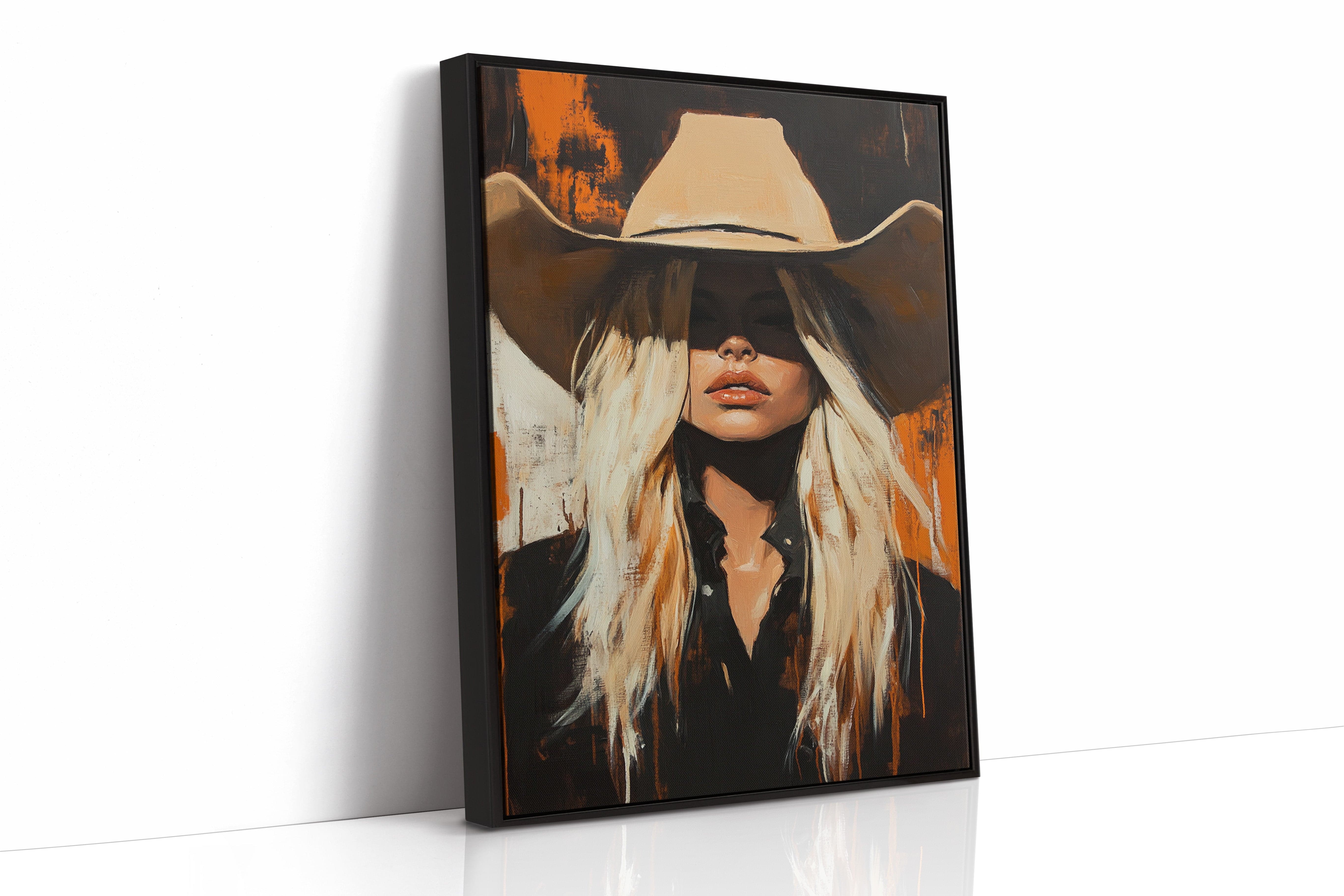 This striking portrait captures the quiet confidence of a woman who doesn’t need the spotlight to command the room. Draped in bold shadows and framed by warm, rugged tones, she wears her hat low and her mystery lower. The contrast of her platinum hair against deep blacks and fiery rust makes this a standout piece for any western-inspired space.