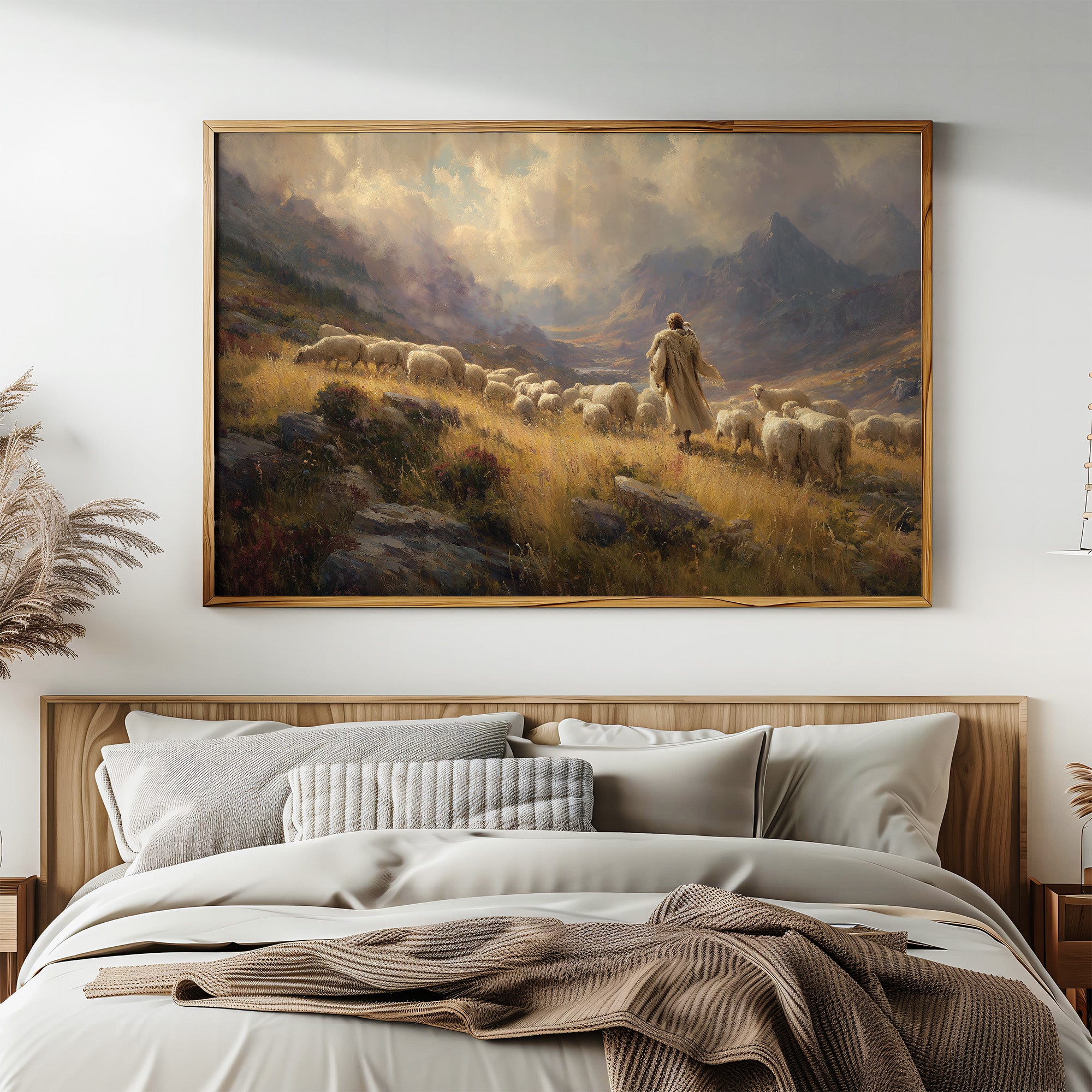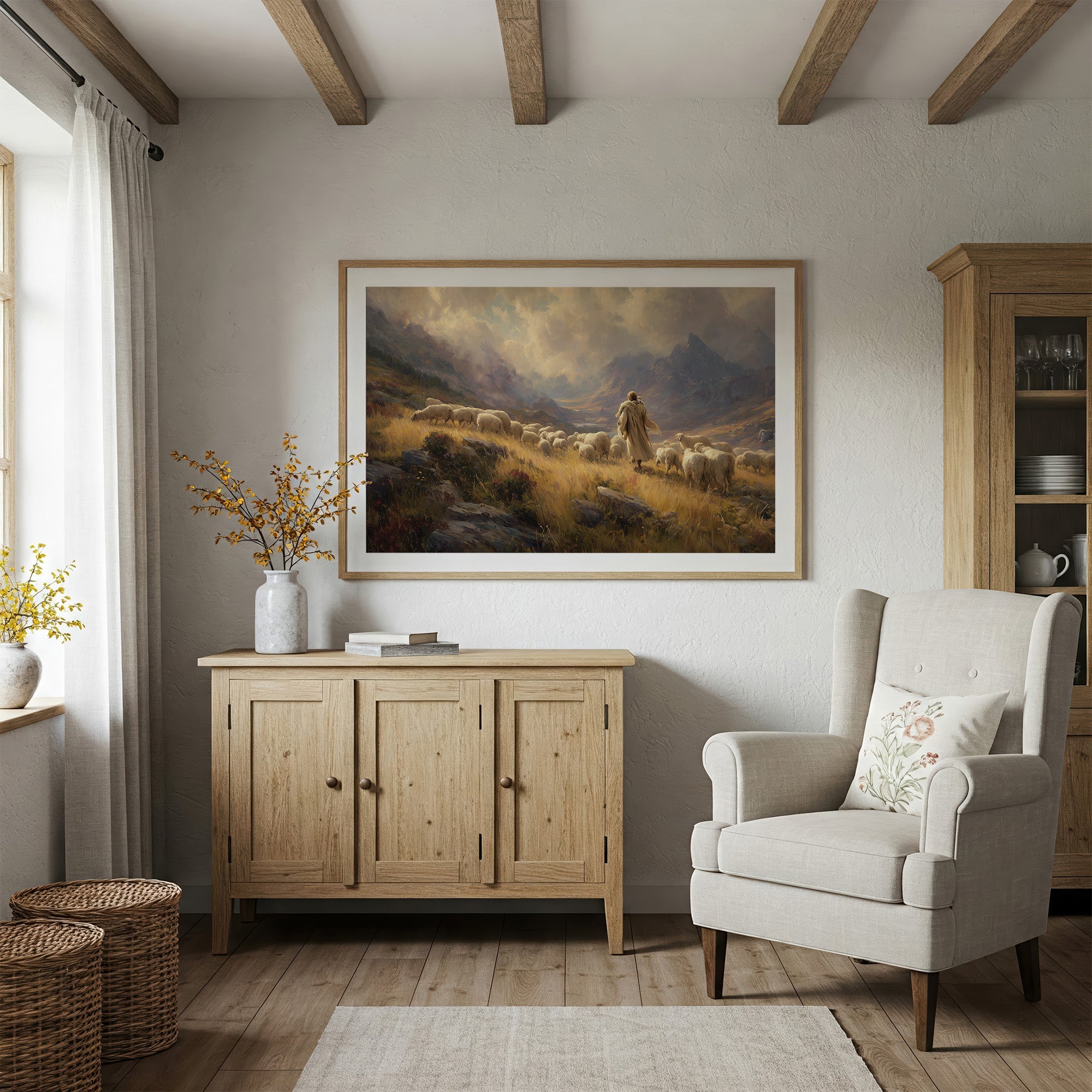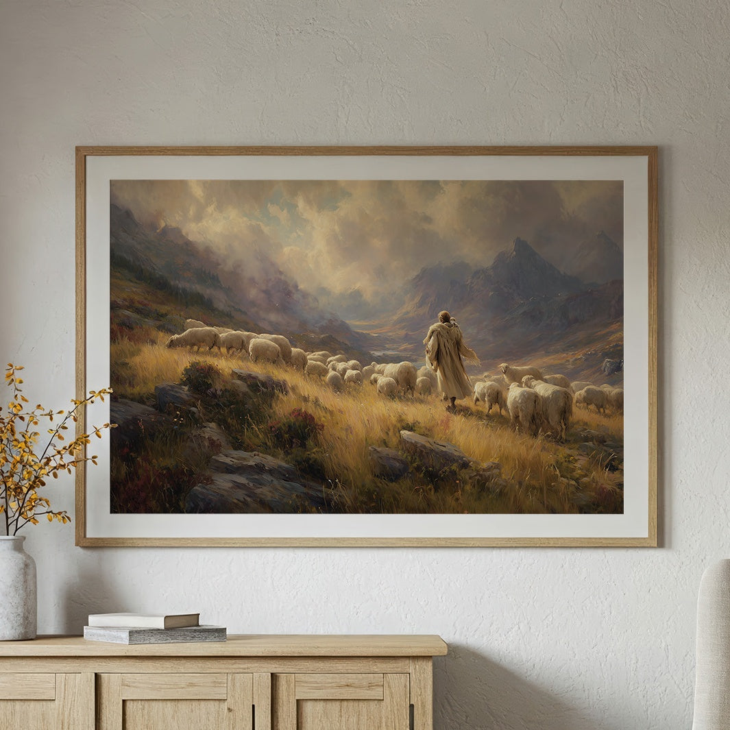 Golden light breaks through storm clouds, casting a warm glow across the windswept grasslands. A solitary shepherd guides his flock along the rugged mountain trail, their wool catching the sun's rays against the dramatic backdrop of misty peaks and shadowed valleys. The painting's rich palette of amber, slate blue, and dusky purple creates a timeless scene of pastoral serenity amid nature's grandeur. This contemplative piece brings a sense of peaceful narrative to a study, reading nook, or anywhere you seek a moment of tranquil reflection.