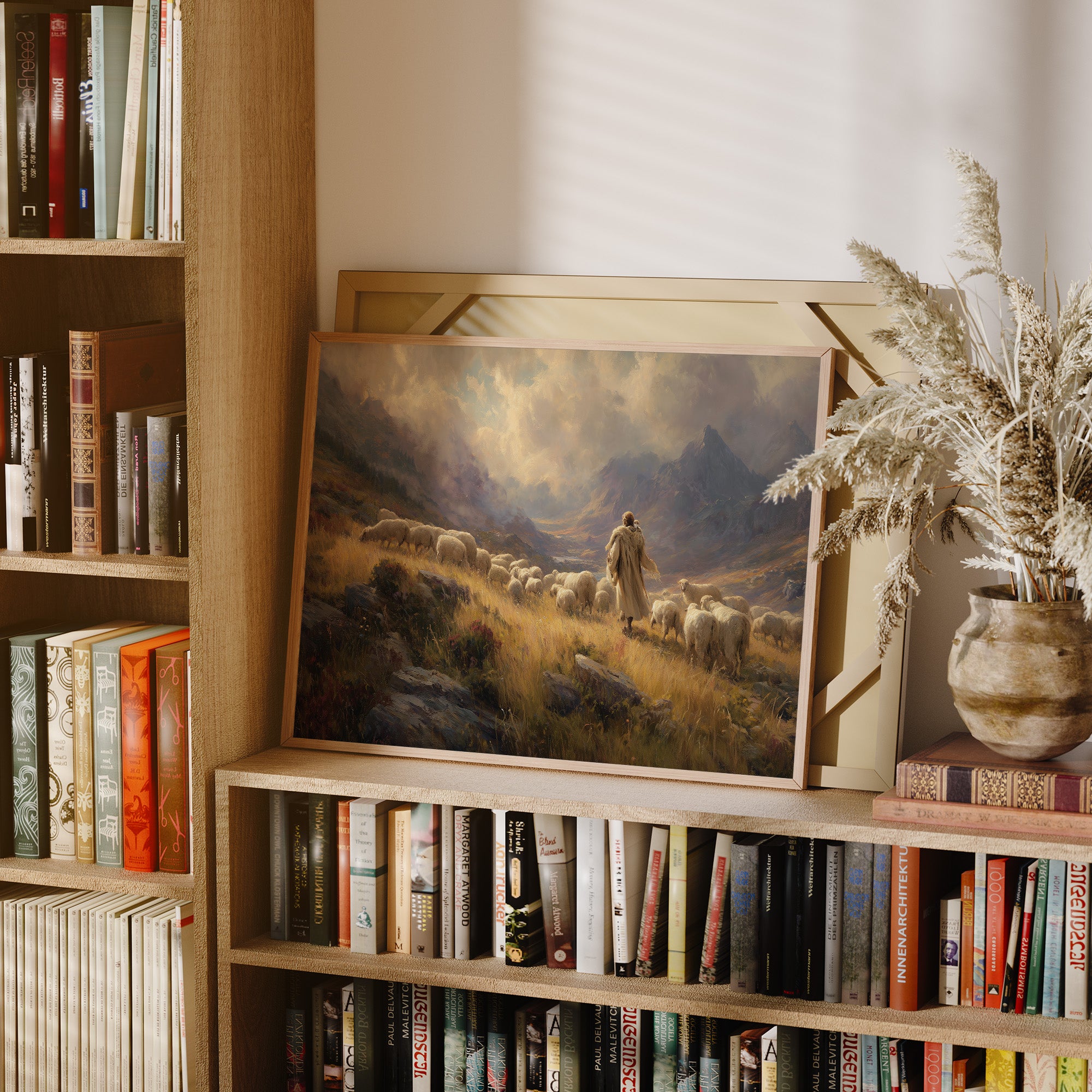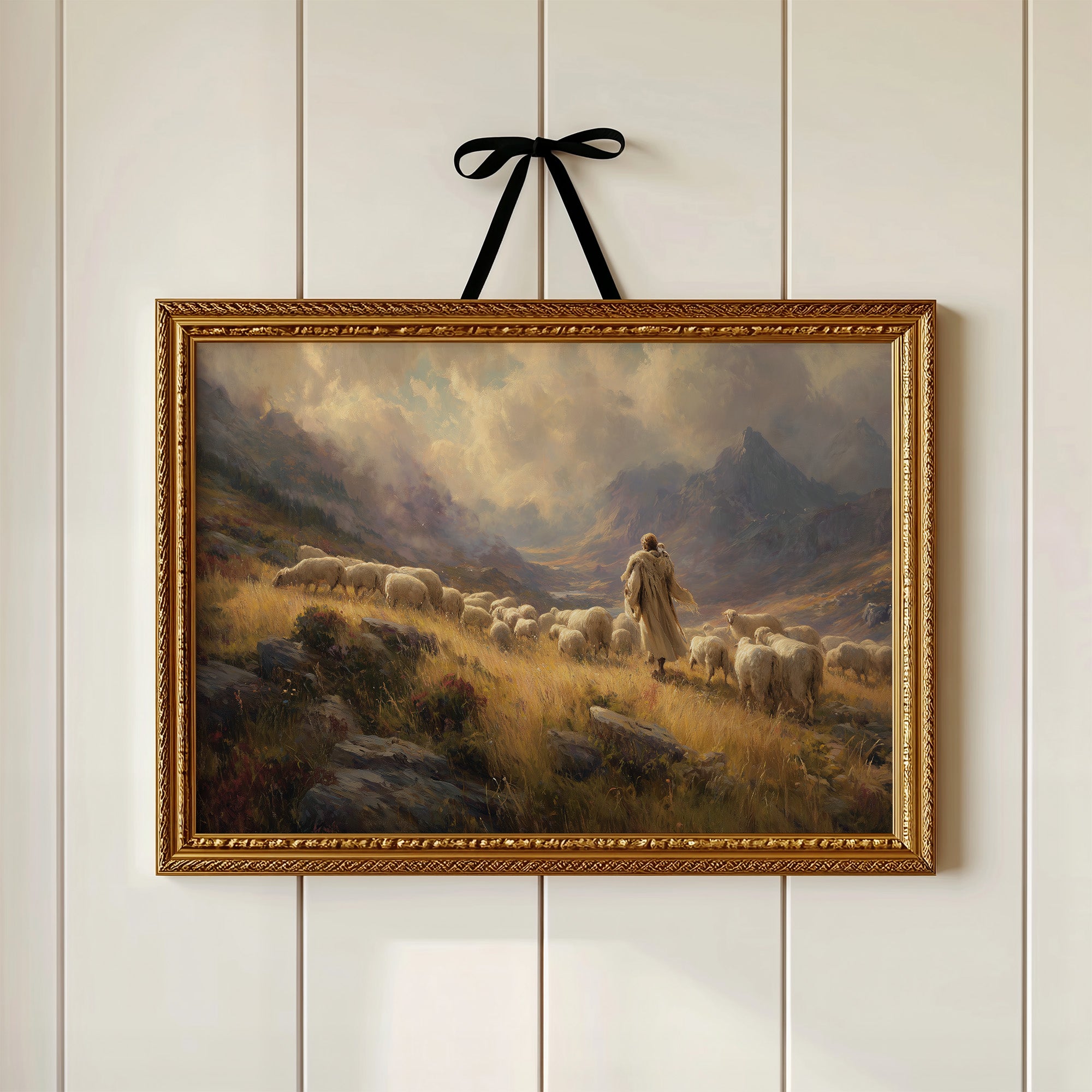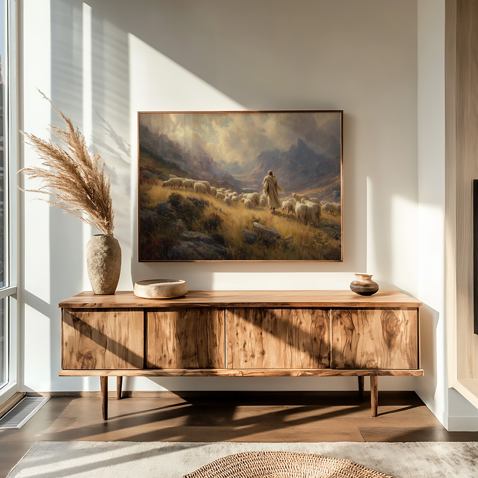 Golden light breaks through storm clouds, casting a warm glow across the windswept grasslands. A solitary shepherd guides his flock along the rugged mountain trail, their wool catching the sun's rays against the dramatic backdrop of misty peaks and shadowed valleys. The painting's rich palette of amber, slate blue, and dusky purple creates a timeless scene of pastoral serenity amid nature's grandeur. This contemplative piece brings a sense of peaceful narrative to a study, reading nook, or anywhere you seek a moment of tranquil reflection.