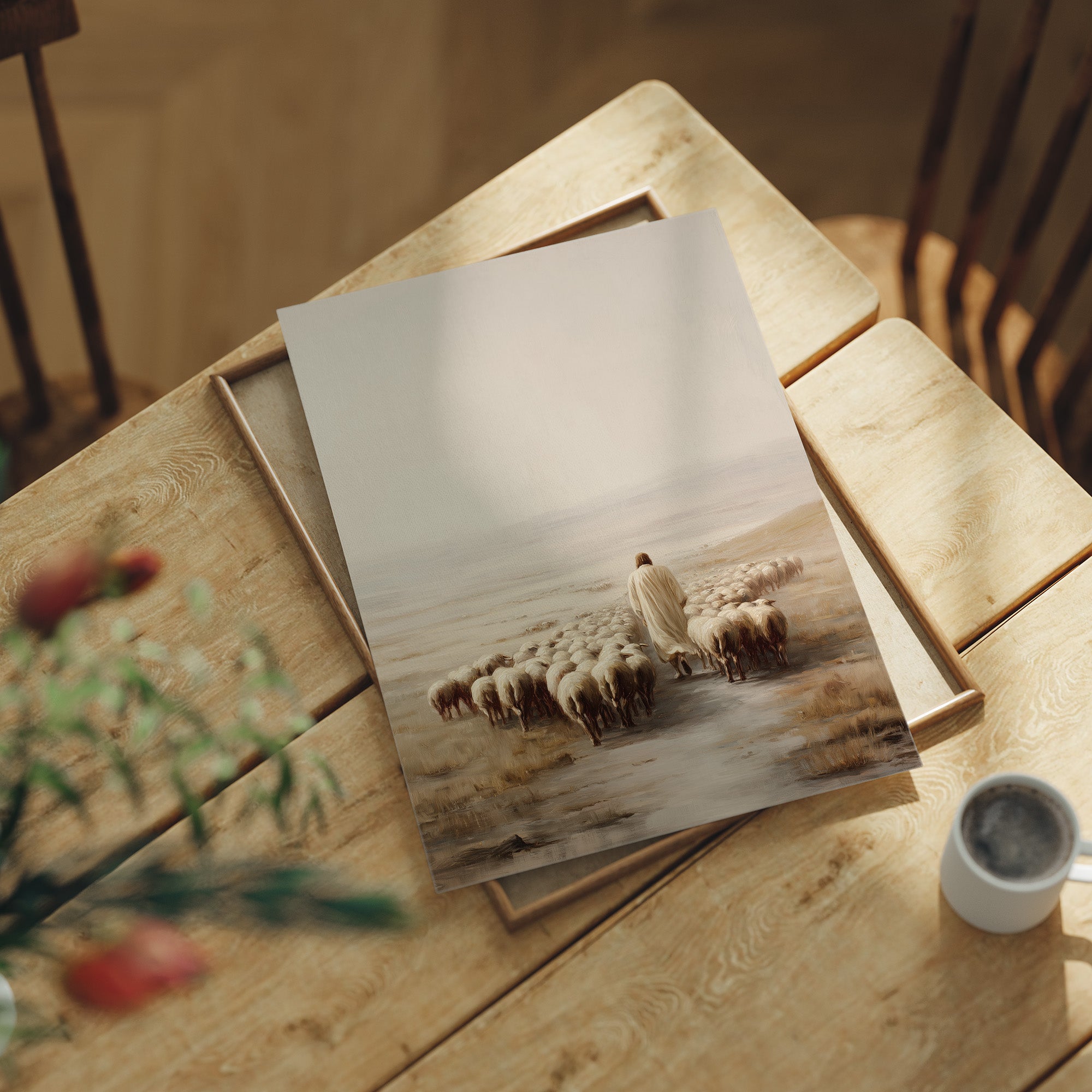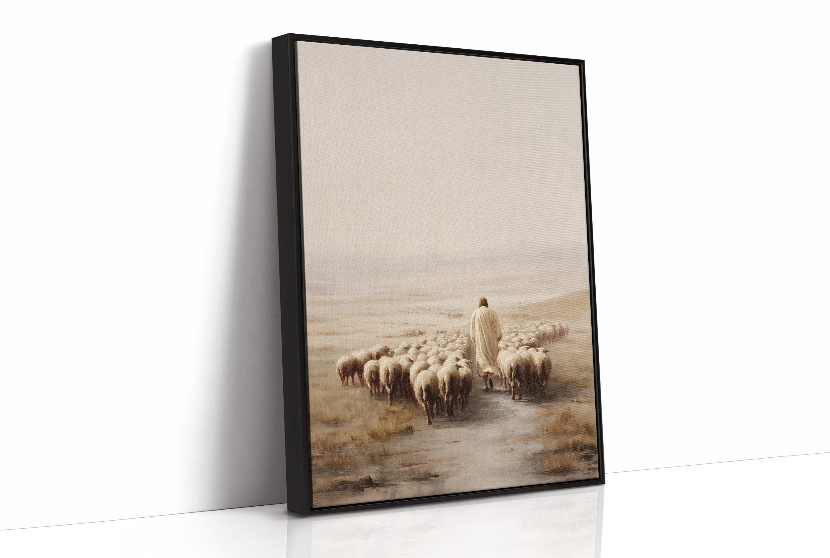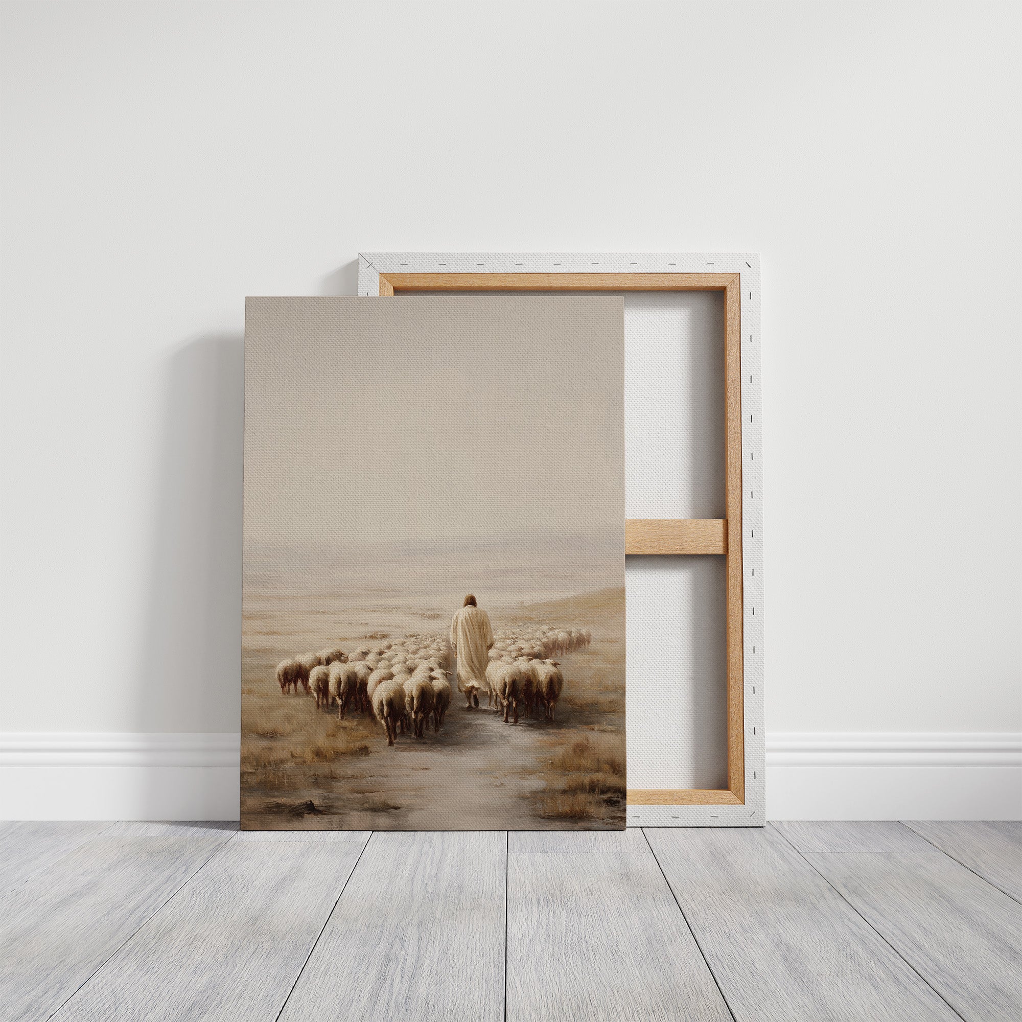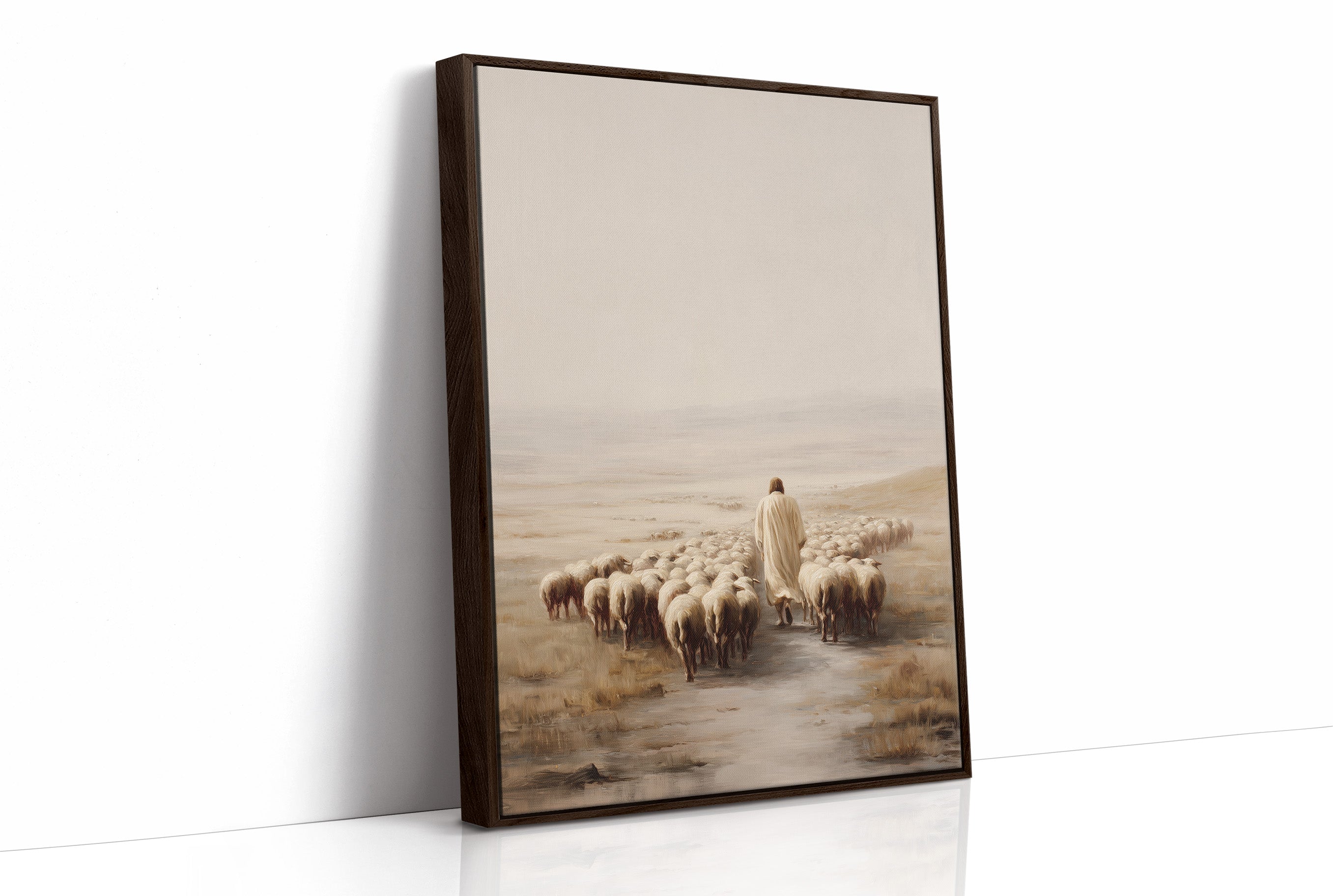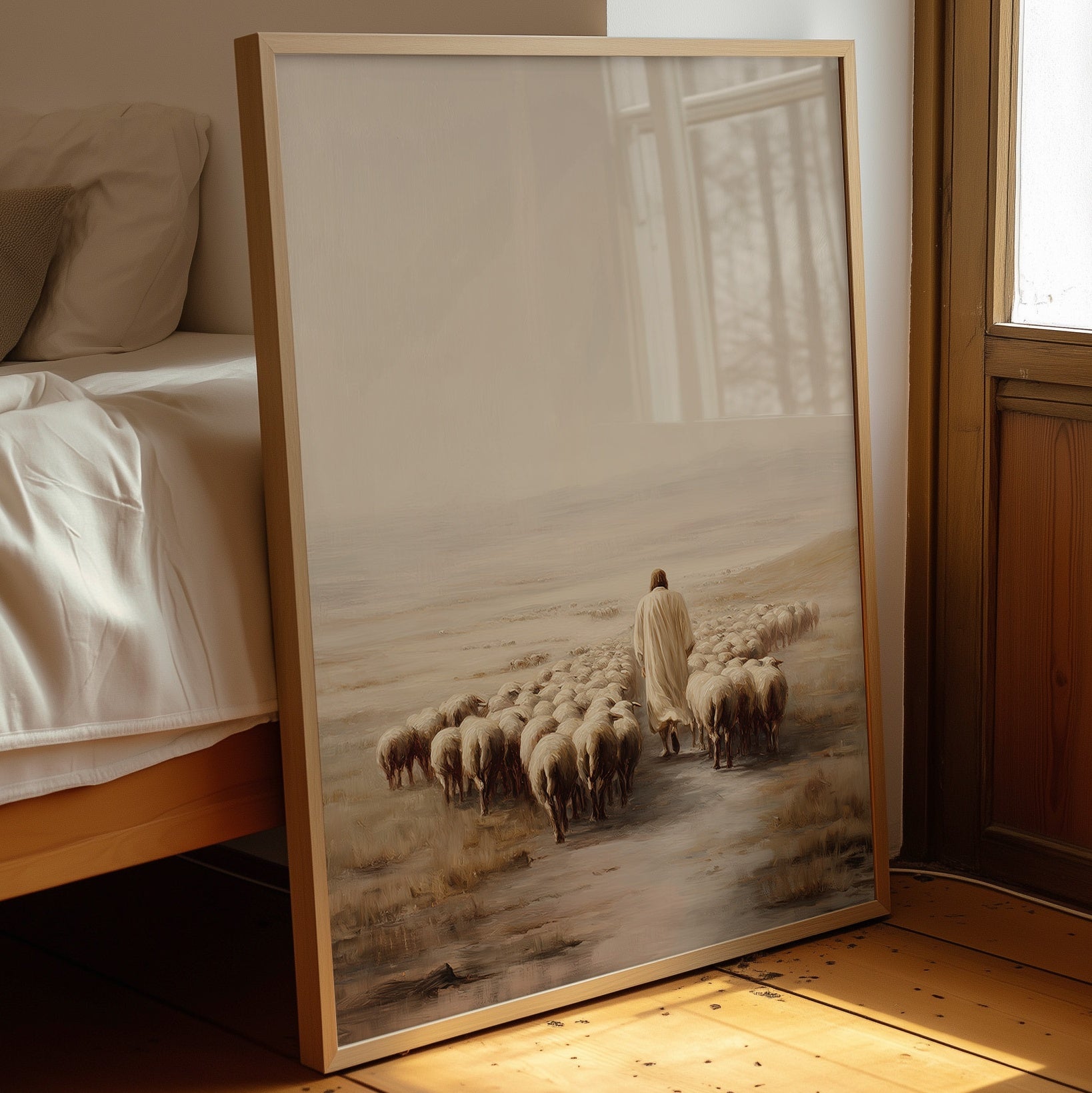 A moment suspended in time, where mist meets earth in a palette of gentle neutrals. The shepherd guides their flock across an ethereal landscape, footprints dissolving into the hazy distance as wool-laden silhouettes follow faithfully. The painting's soft brushwork creates a dreamlike quality, evoking nostalgia for simpler times and the ancient relationship between humans and the land they tend. This contemplative piece brings pastoral serenity to a reading nook, home office, or any space where you seek calm reflection.